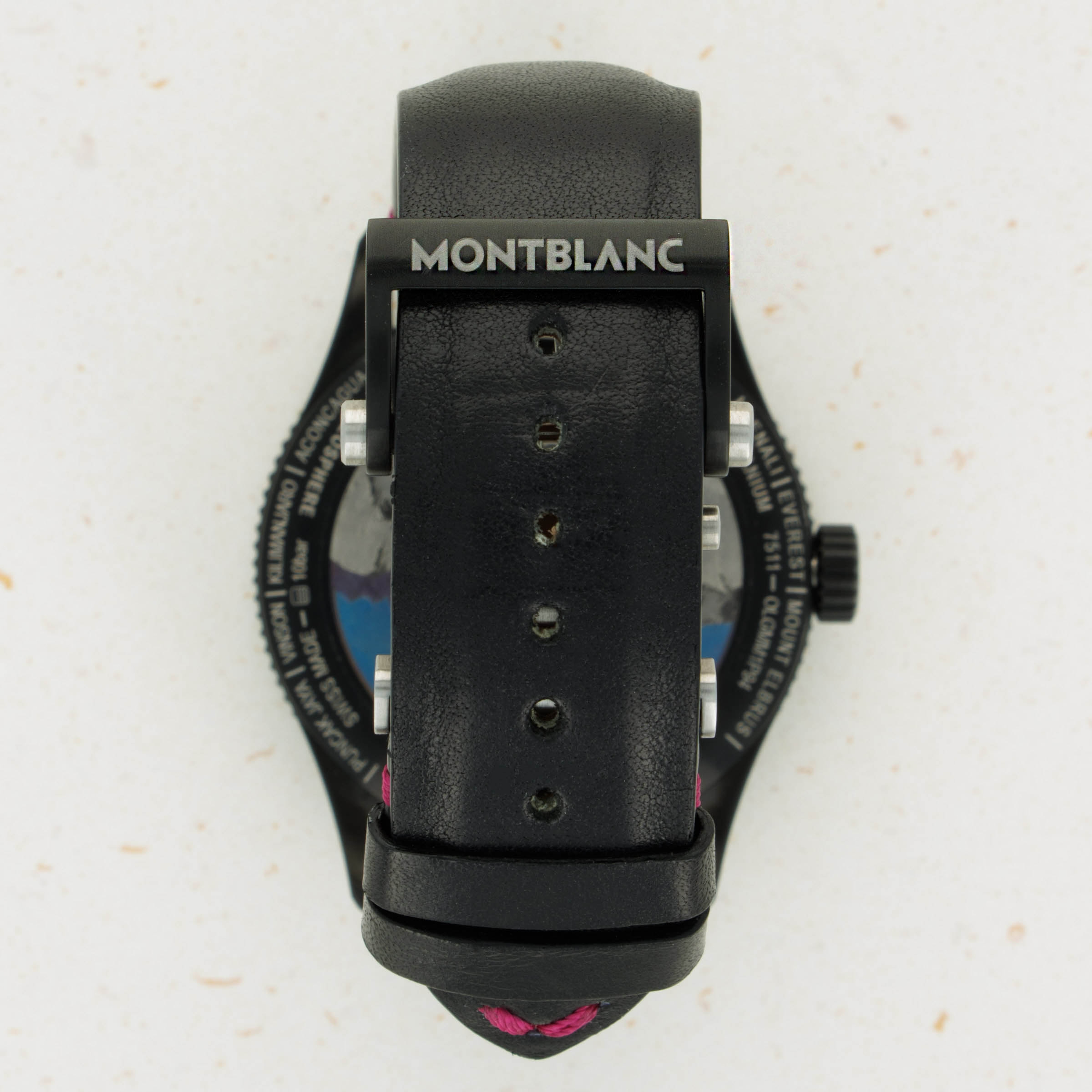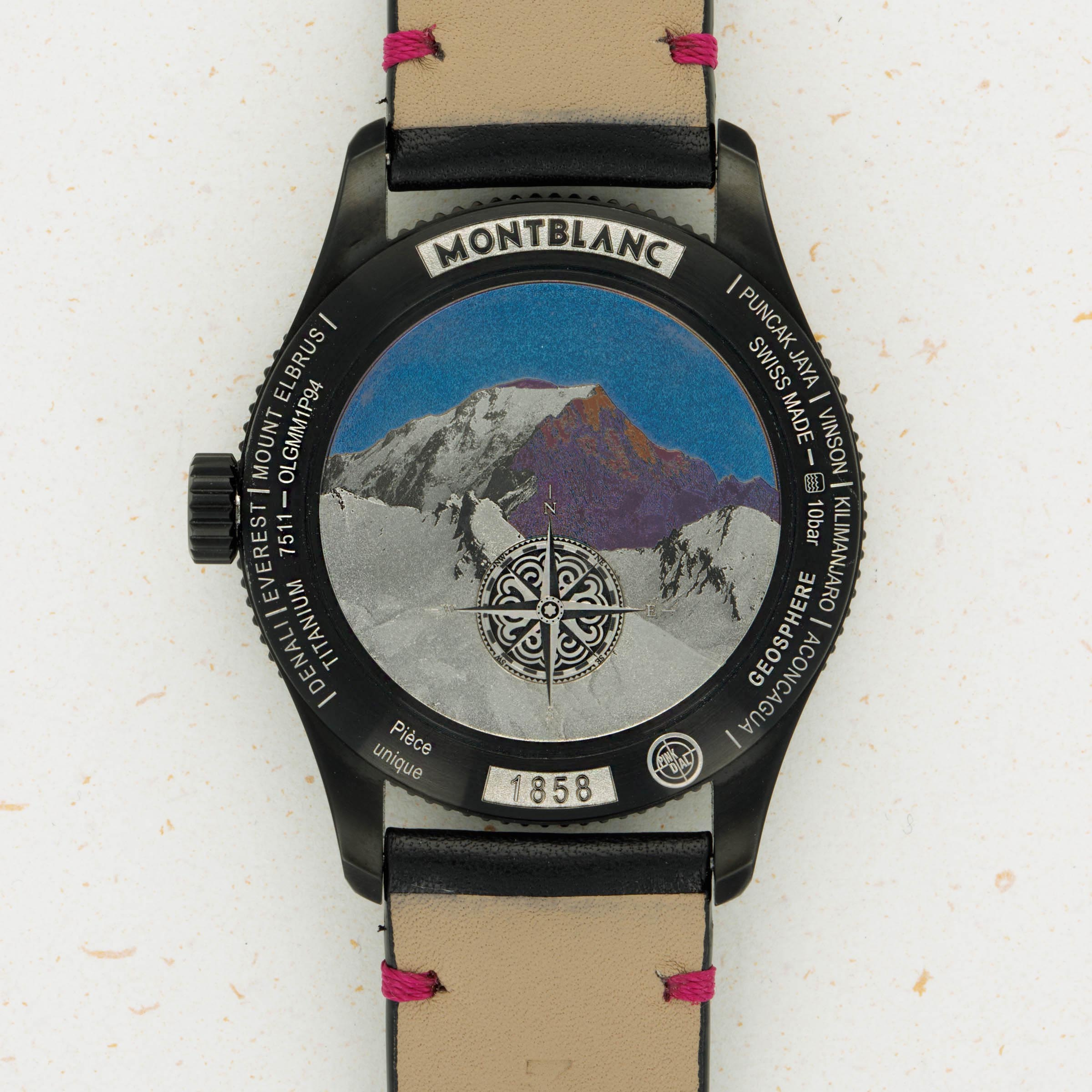 The caseback shows Montblanc with a shadow in pink, as well as the Pink Dial Project logo engraved along the edge.