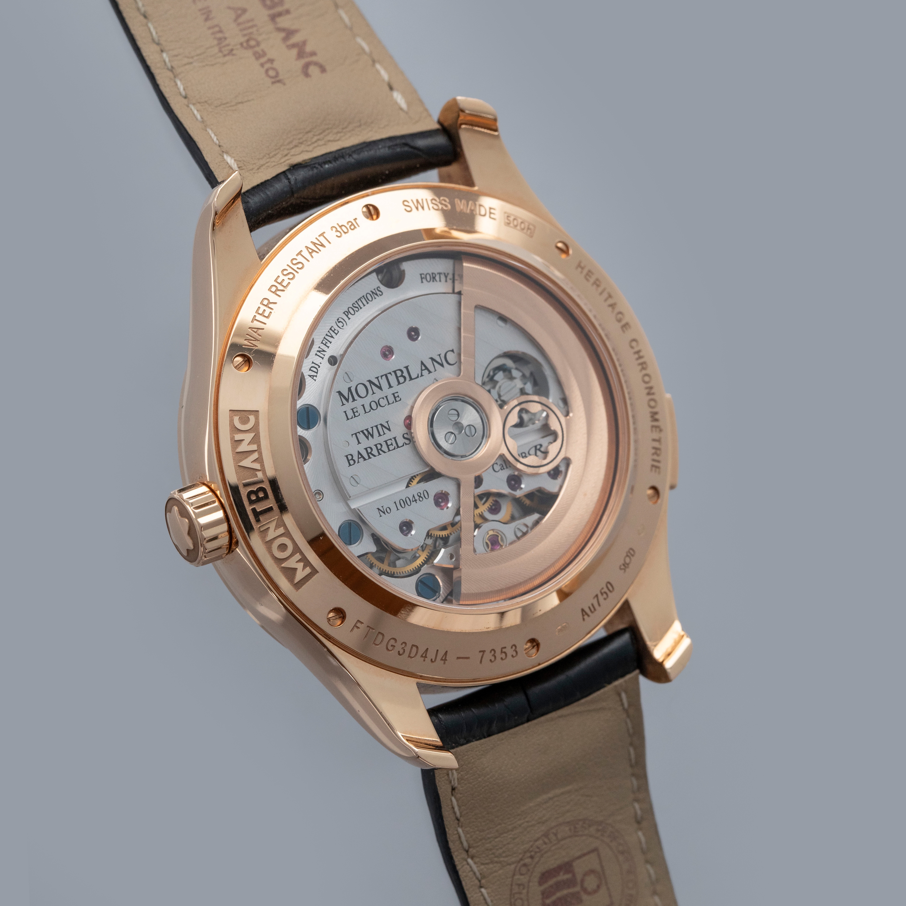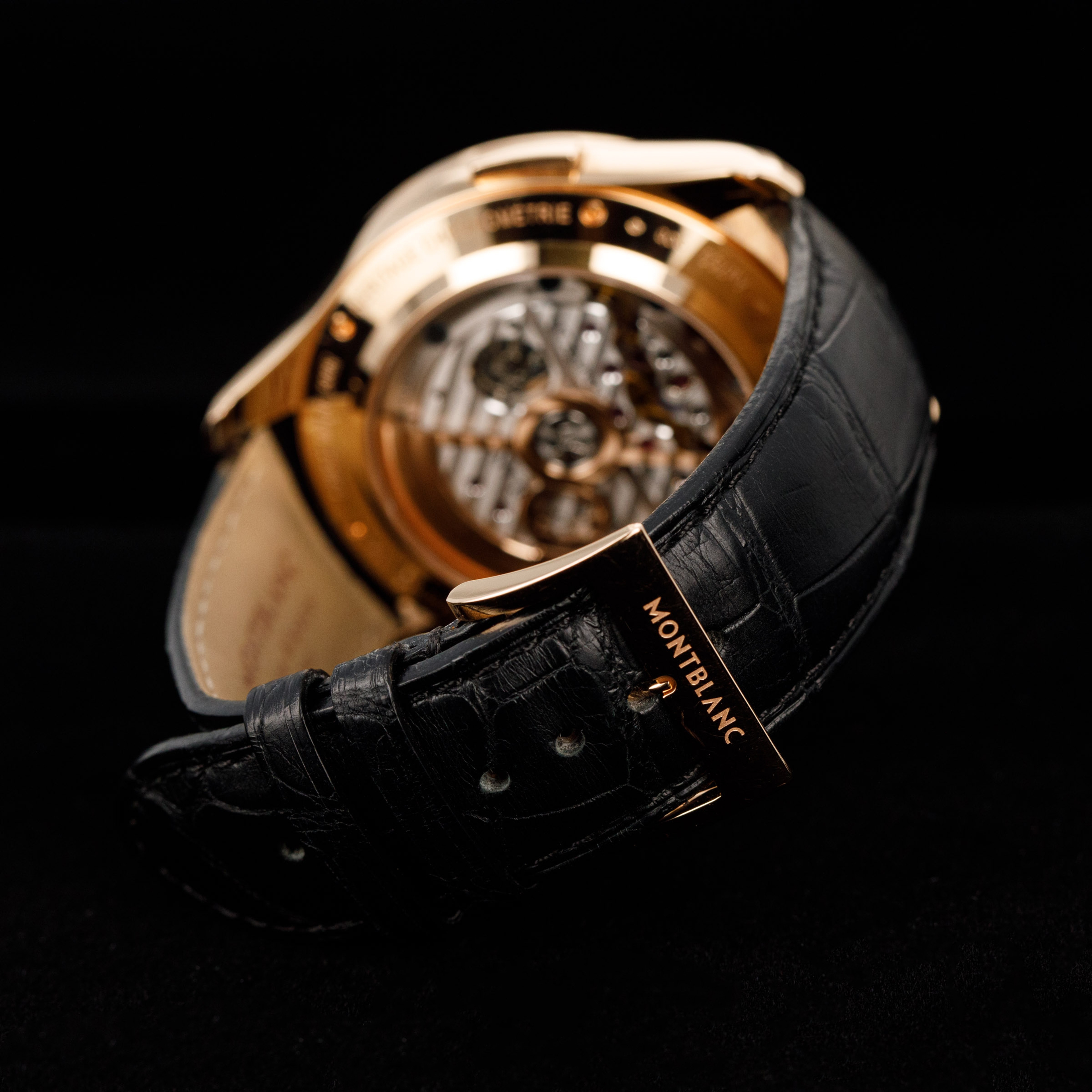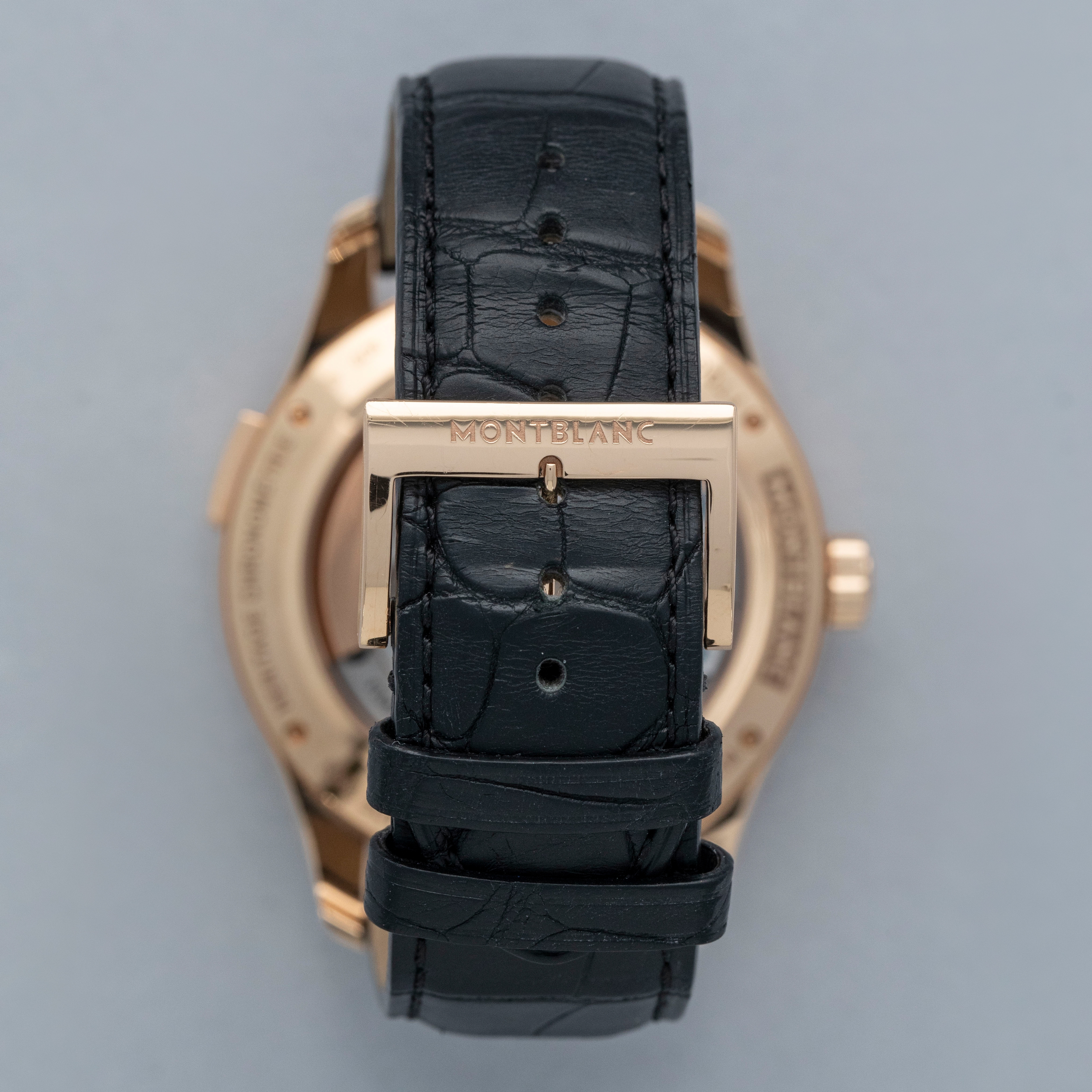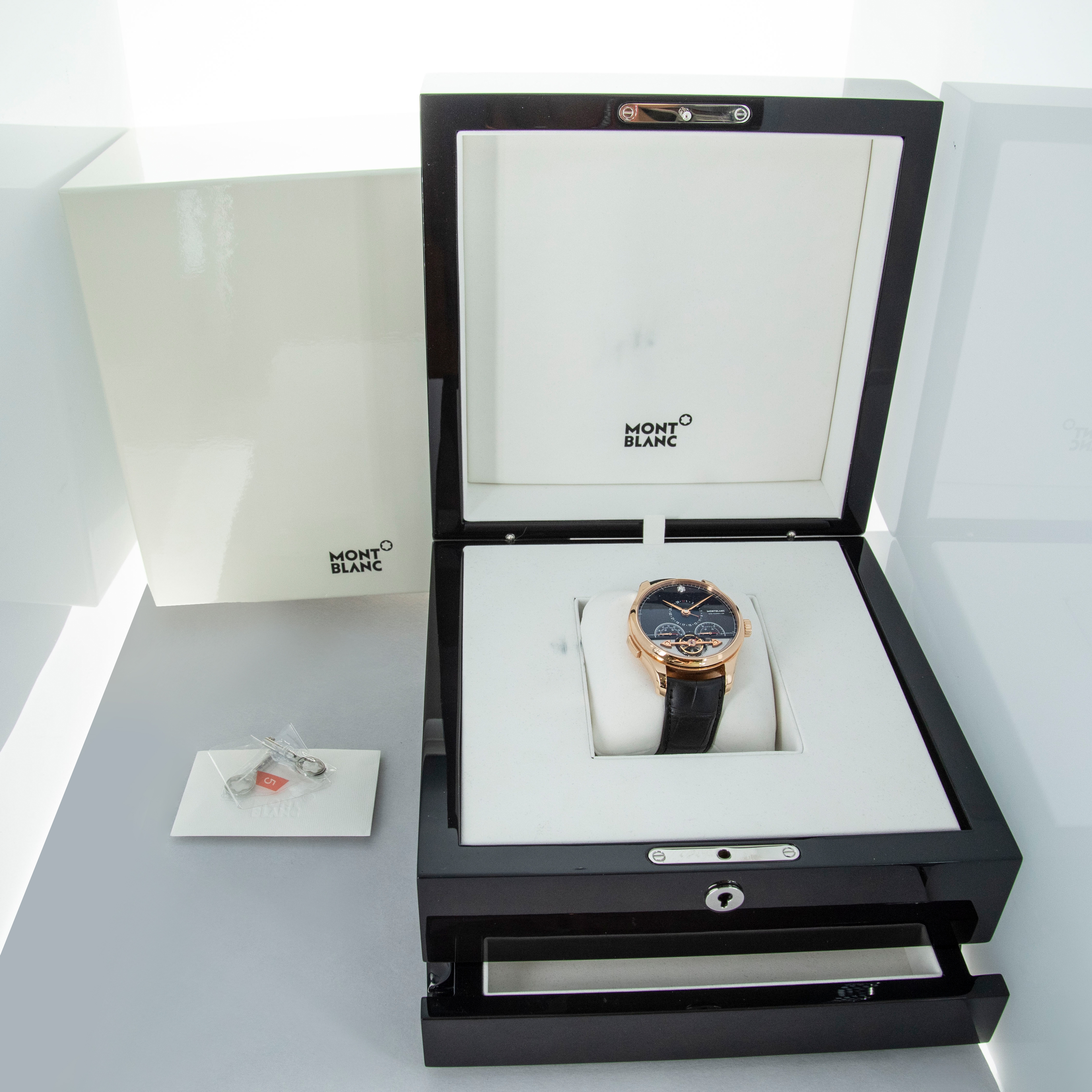 The watch is in overall near mint condition. The rose gold case has some very light surface marks, with a small nick on the lower right lug edge. The display case back has crisp engravings and hallmarks around the edge, with a couple of light marks. The dial and hands are like new. The watch is fitted with a black alligator strap with a rose gold Montblanc pin buckle showing light marks. Comes with inner and outer boxes and two keys for the box lock.