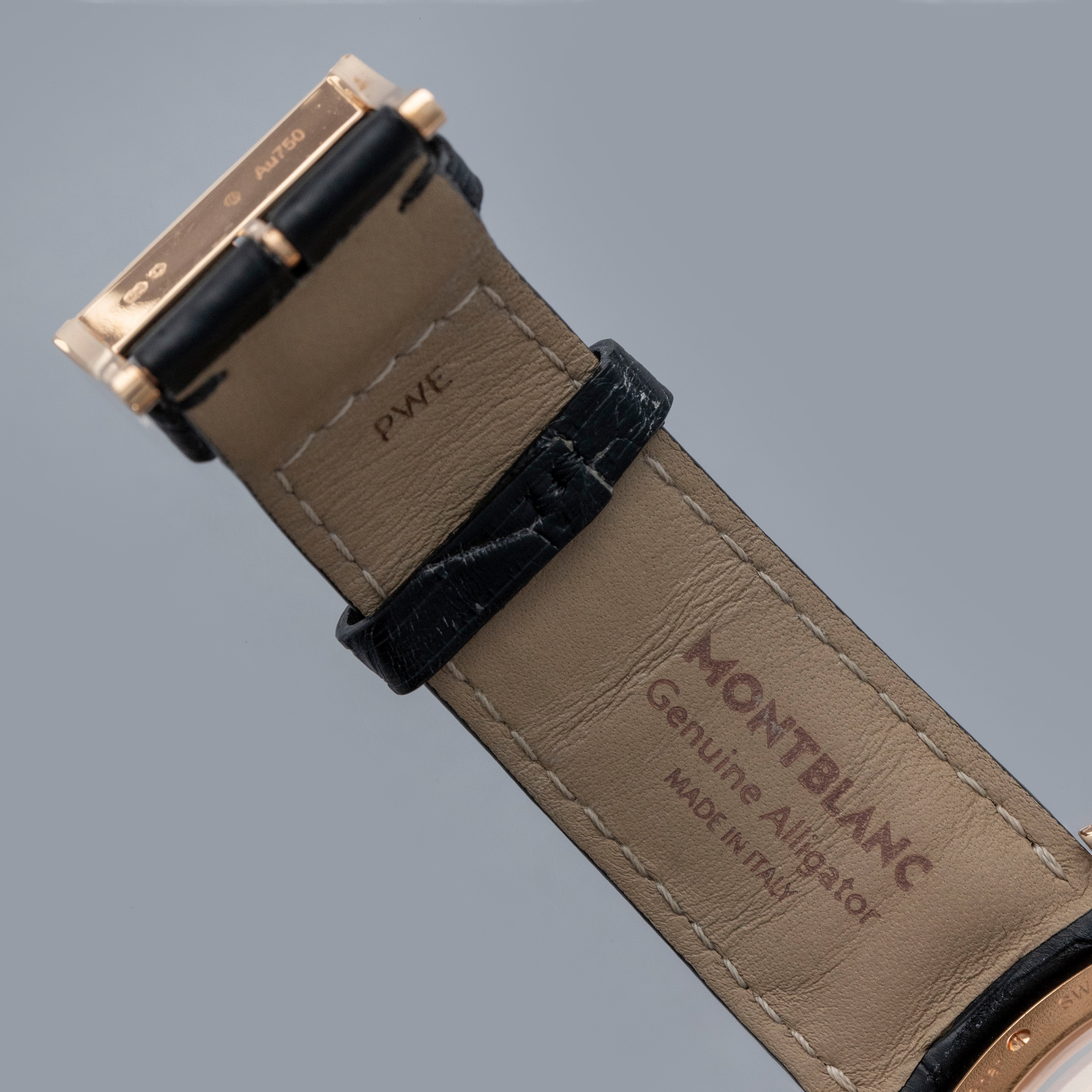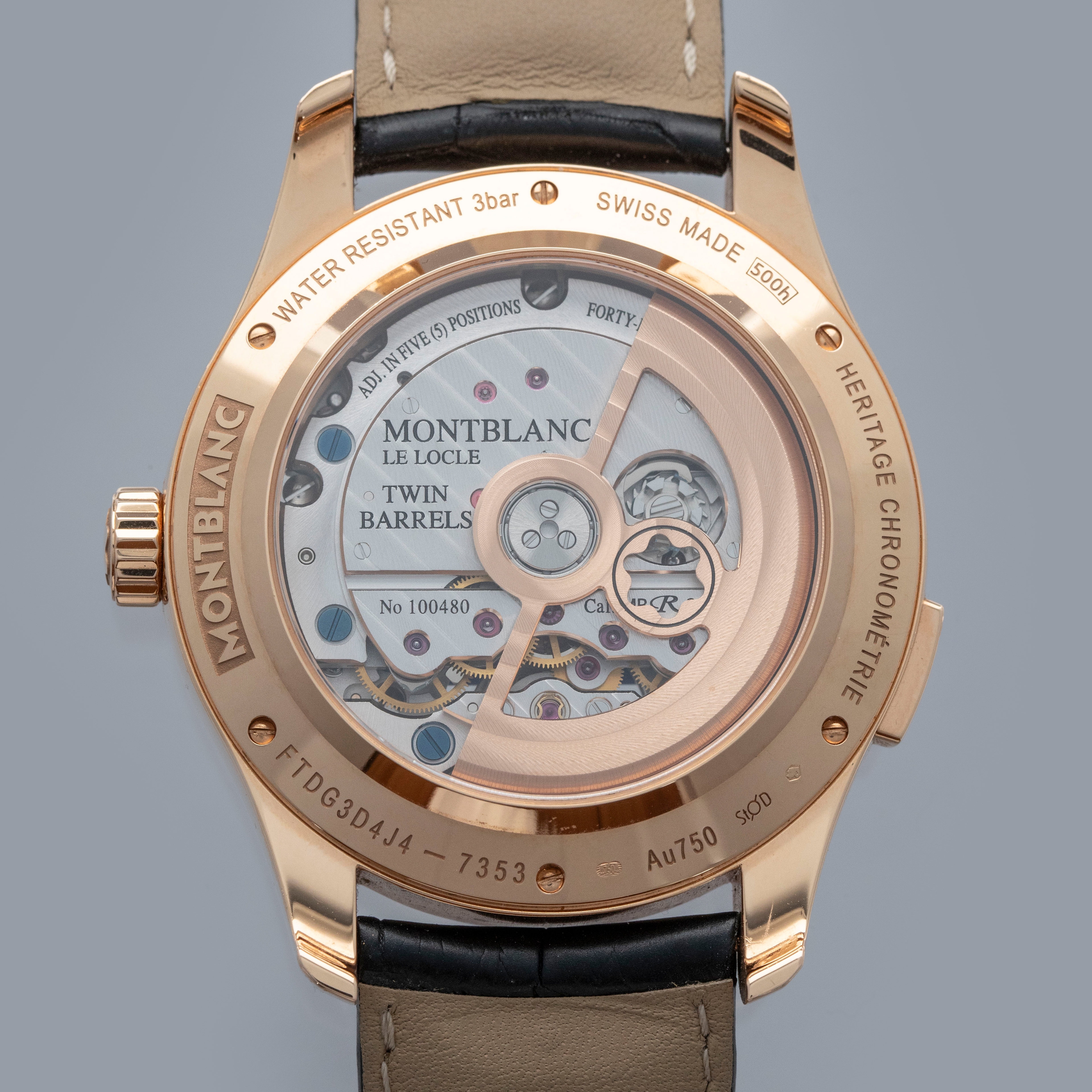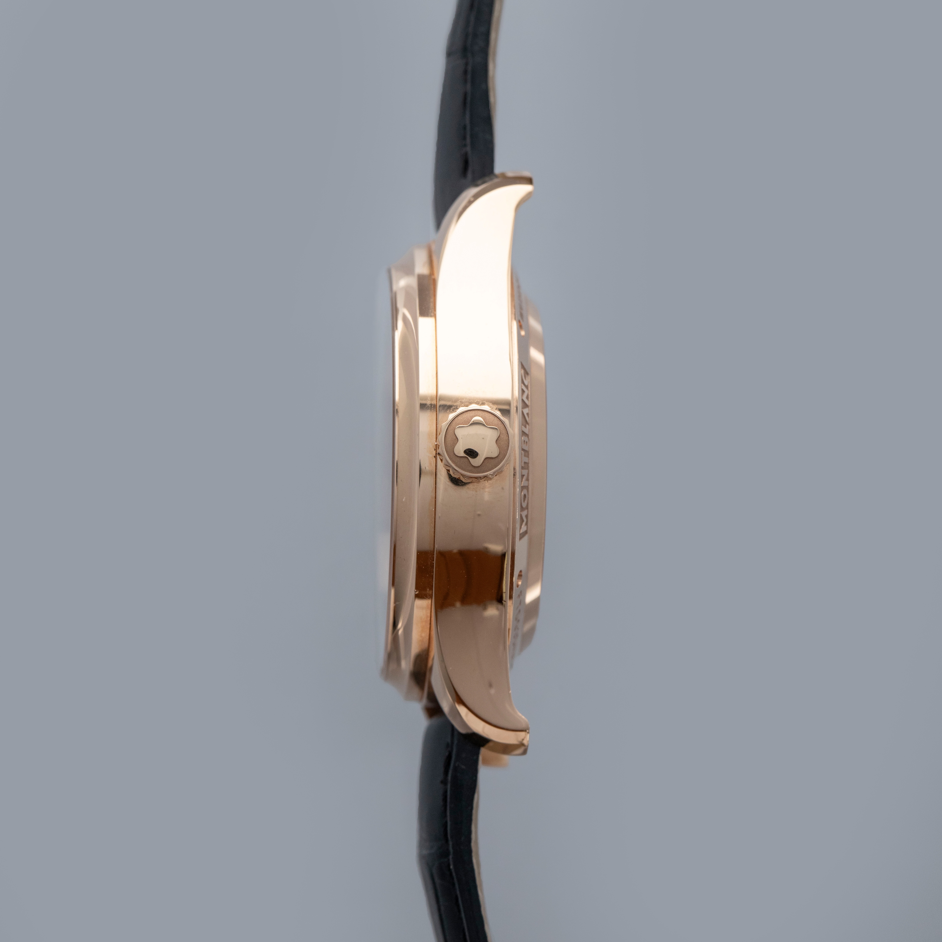 The watch is in overall near mint condition. The rose gold case has some very light surface marks, with a small nick on the lower right lug edge. The display case back has crisp engravings and hallmarks around the edge, with a couple of light marks. The dial and hands are like new. The watch is fitted with a black alligator strap with a rose gold Montblanc pin buckle showing light marks. Comes with inner and outer boxes and two keys for the box lock.