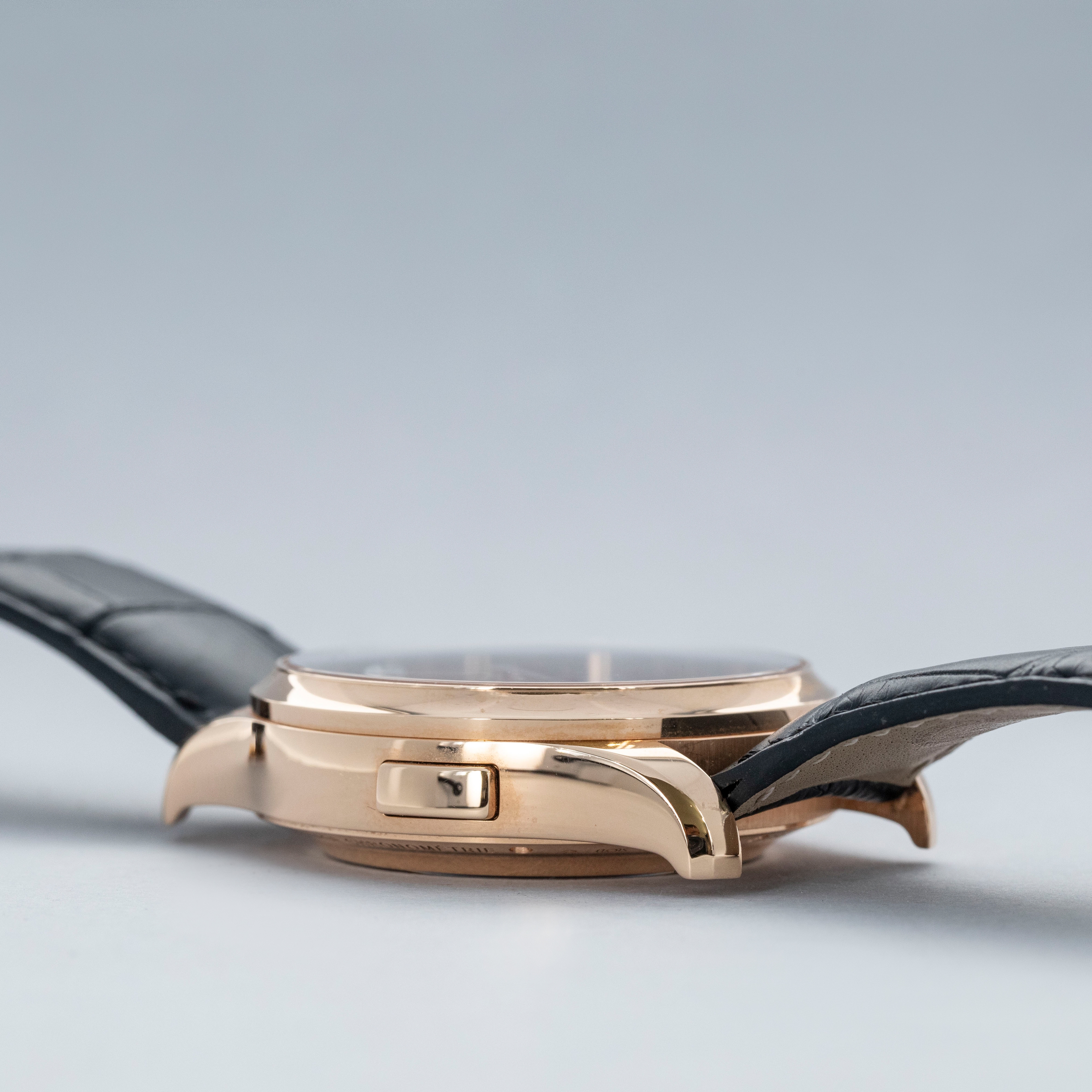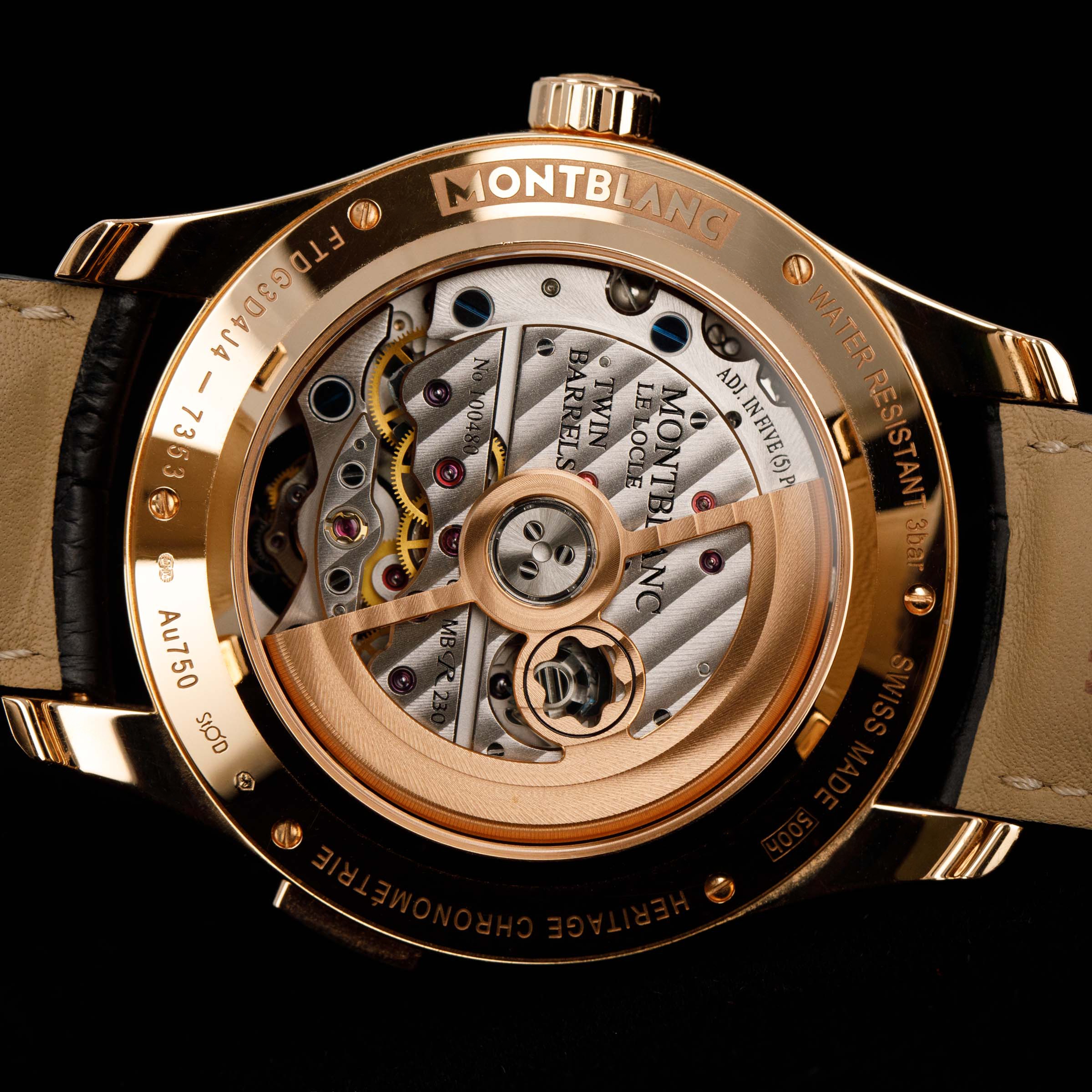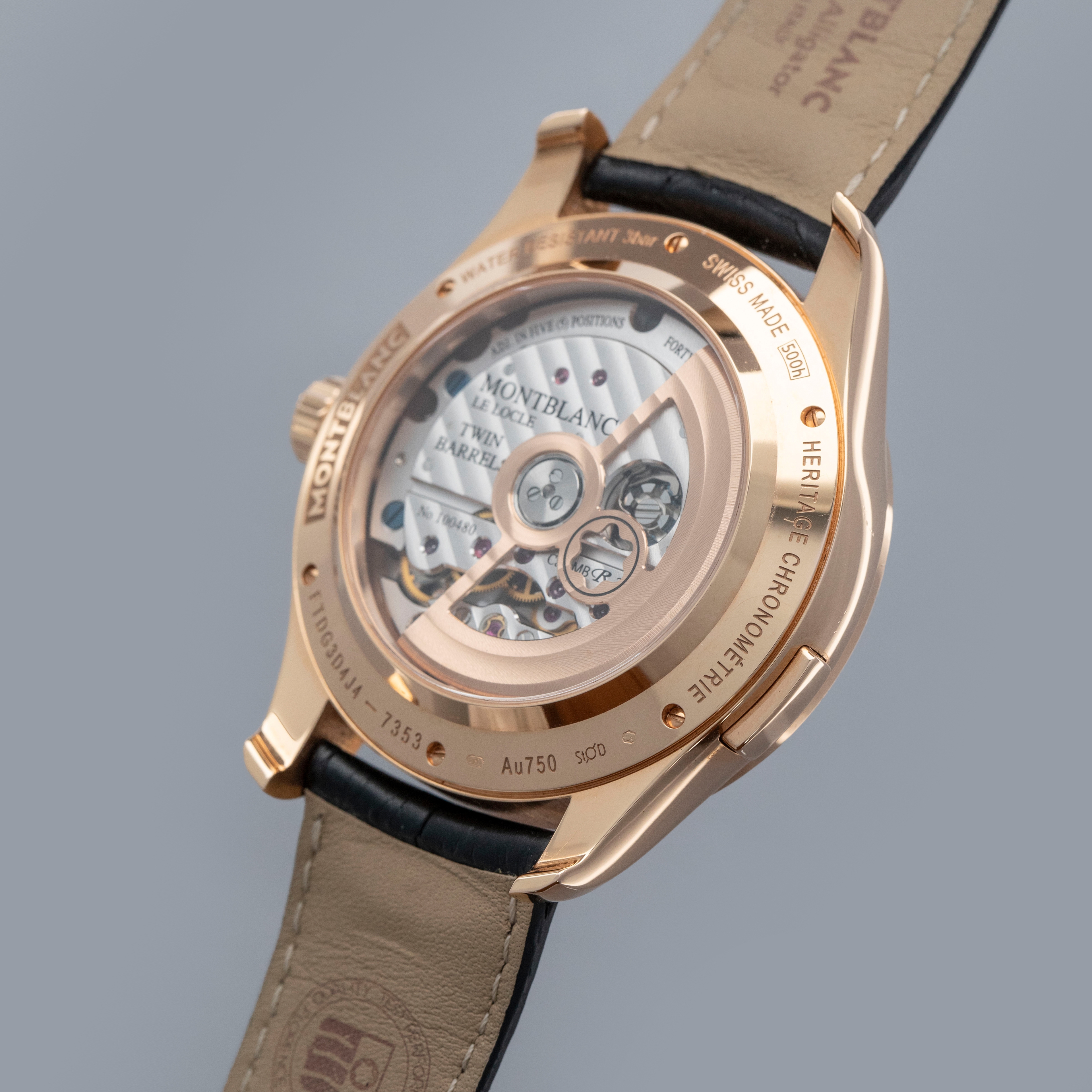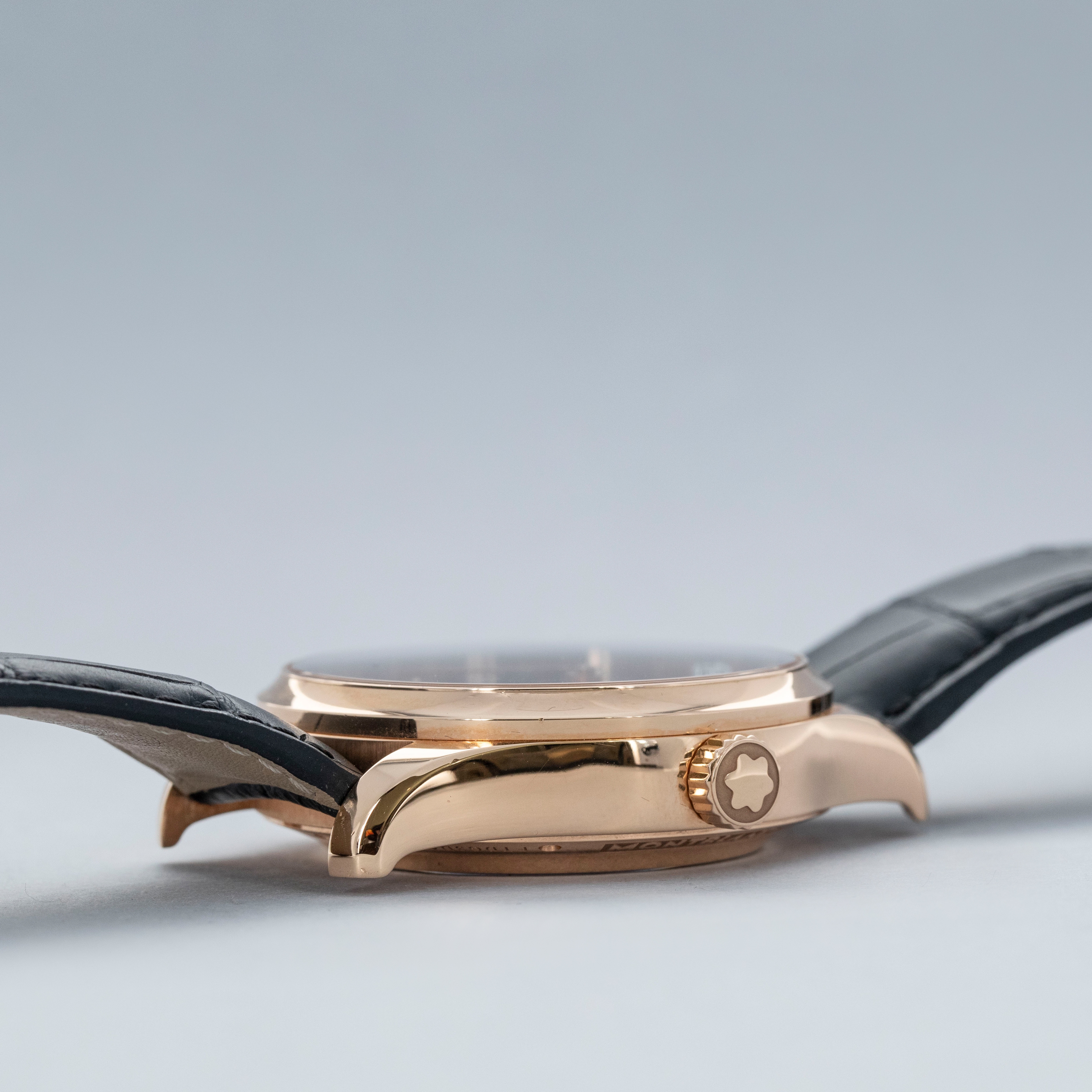 The watch is in overall near mint condition. The rose gold case has some very light surface marks, with a small nick on the lower right lug edge. The display case back has crisp engravings and hallmarks around the edge, with a couple of light marks. The dial and hands are like new. The watch is fitted with a black alligator strap with a rose gold Montblanc pin buckle showing light marks. Comes with inner and outer boxes and two keys for the box lock.