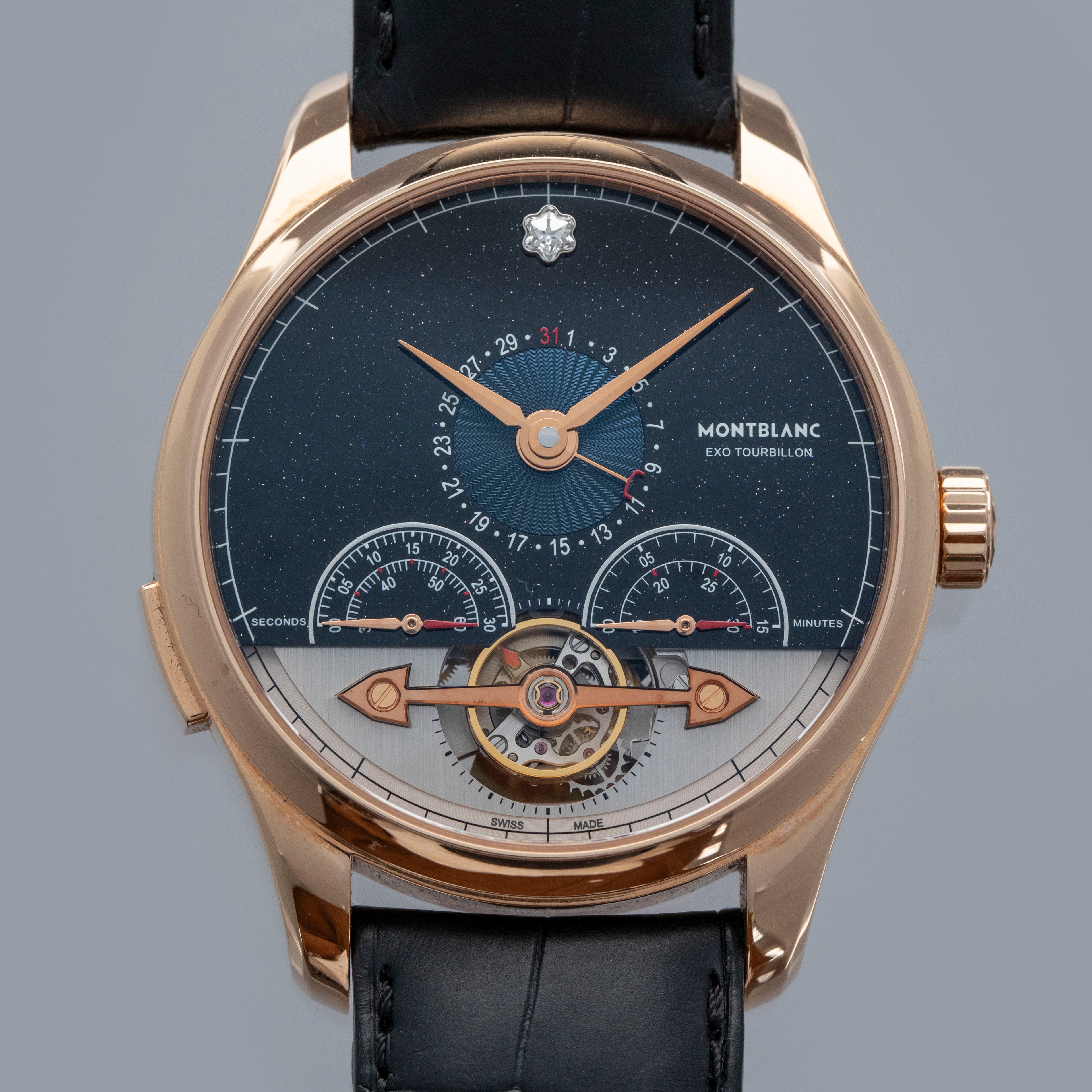 While best known for their impressive reputation in the arena of making luxurious accessories such as various leather goods, keychains, and most importantly writing instruments such as pens, Montblanc have also competed in the world of watchmaking. However, since their acquisition of Minerva in 2006, their experience in watchmaking isn’t limited to what they learned themselves. Indeed, by acquiring Minerva they took control of one of watchmaking’s most historic movement manufacturers. Founded in 1858, Minerva are one of the few manufactures who made chronograph movements, amongst other types of movements. Indeed, offered here we have the Montblanc Heritage Chronométrie ExoTourbillon Minute Chronograph. Limited to only 88 pieces, this 18kt rose gold variant boasts a stunning two-part dial with a large piece of black aventurine with a diamond-set 12 o’clock hour marker, and a smaller sunken portion at 6 o’clock that houses its tourbillon. A 44mm diameter watch that stands 14.79mm tall, the ExoTourbillon is certainly not a small watch, but considering everything it has going on under the hood it is rather dense. Powered by the automatic cal. MB R230, the ExoTourbillon boasts an impressive list of complications, such as a day and night indication, minutes, jumping hours, a pointer dat subdial, monopoussoir chronograph with retrograde subdials, and a tourbillon escapement as proudly displayed at 6 o’clock.