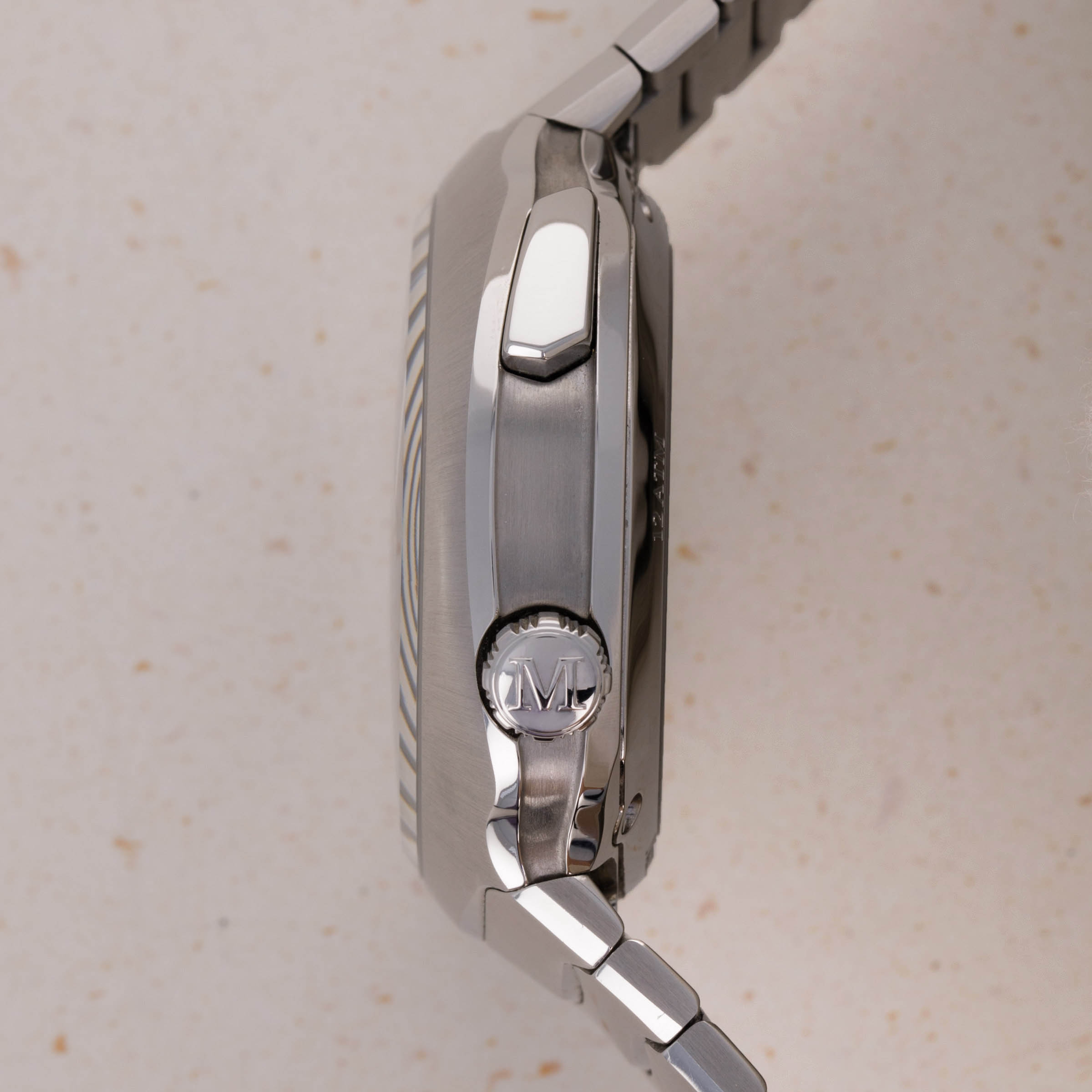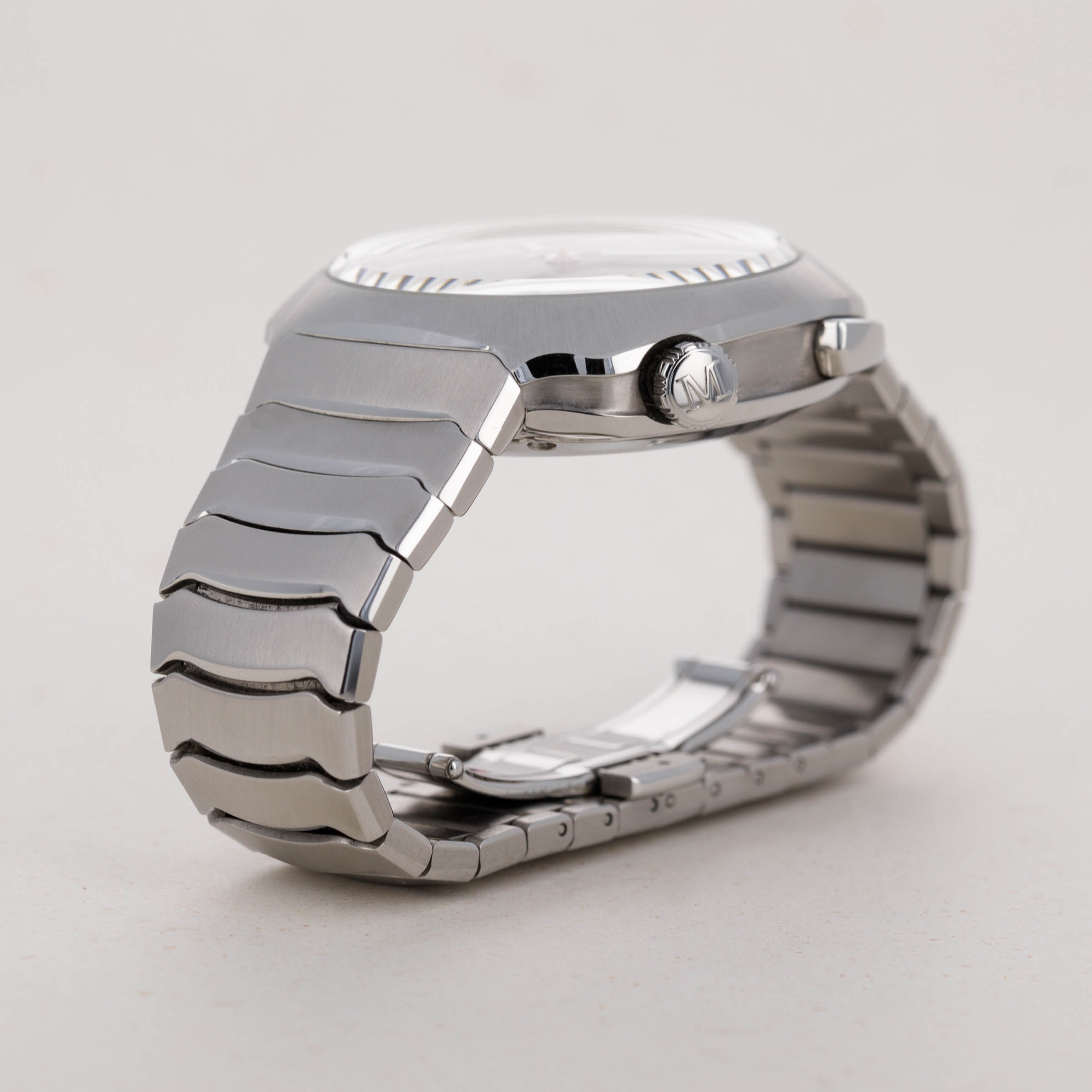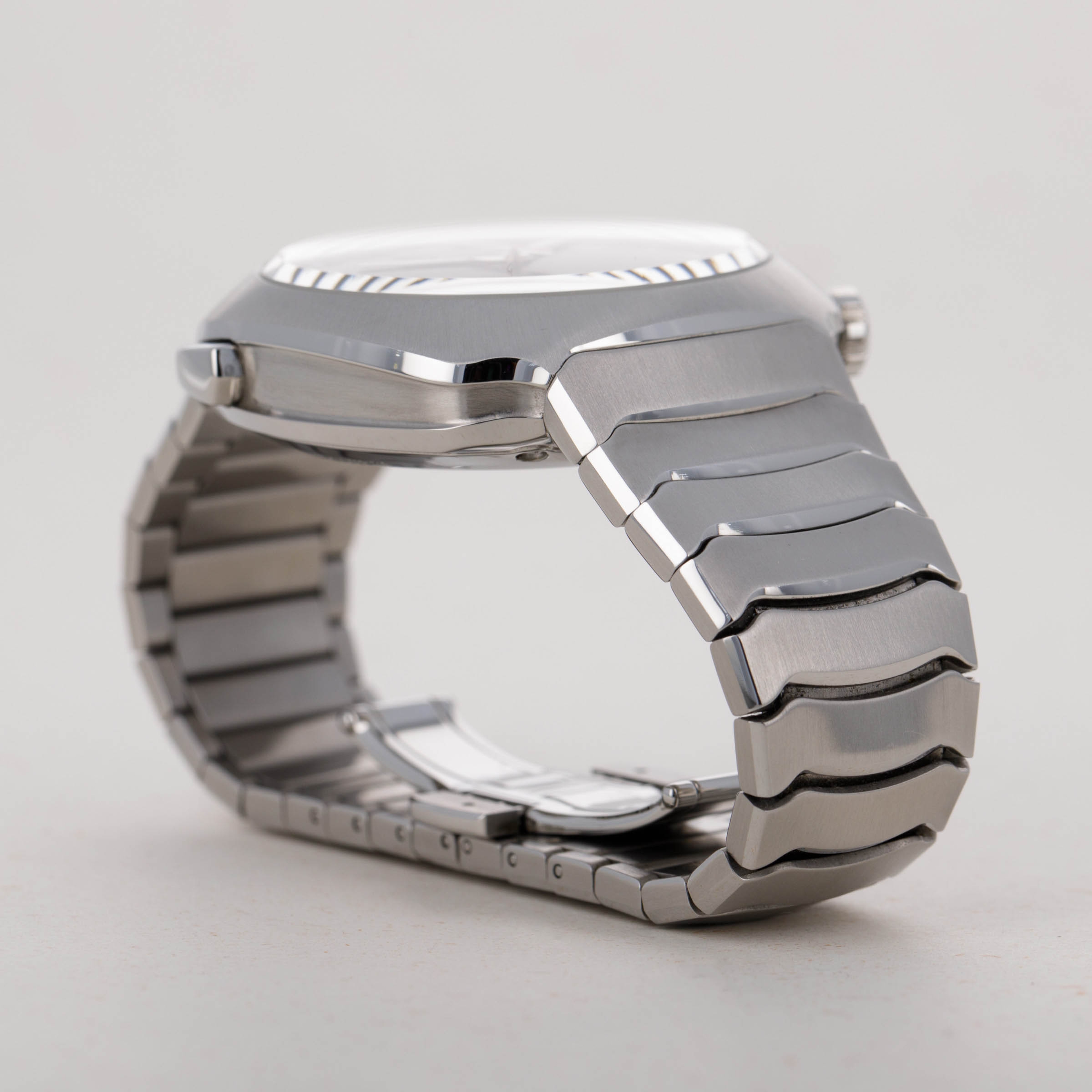 Fitted with a rare single-link bracelet design and a squared-off round case, the Streamliner wears on the wrist with a unique presence. Indeed, its stainless steel construction brings a sense of familiarity, but its profile is certainly not like anything else on the market.