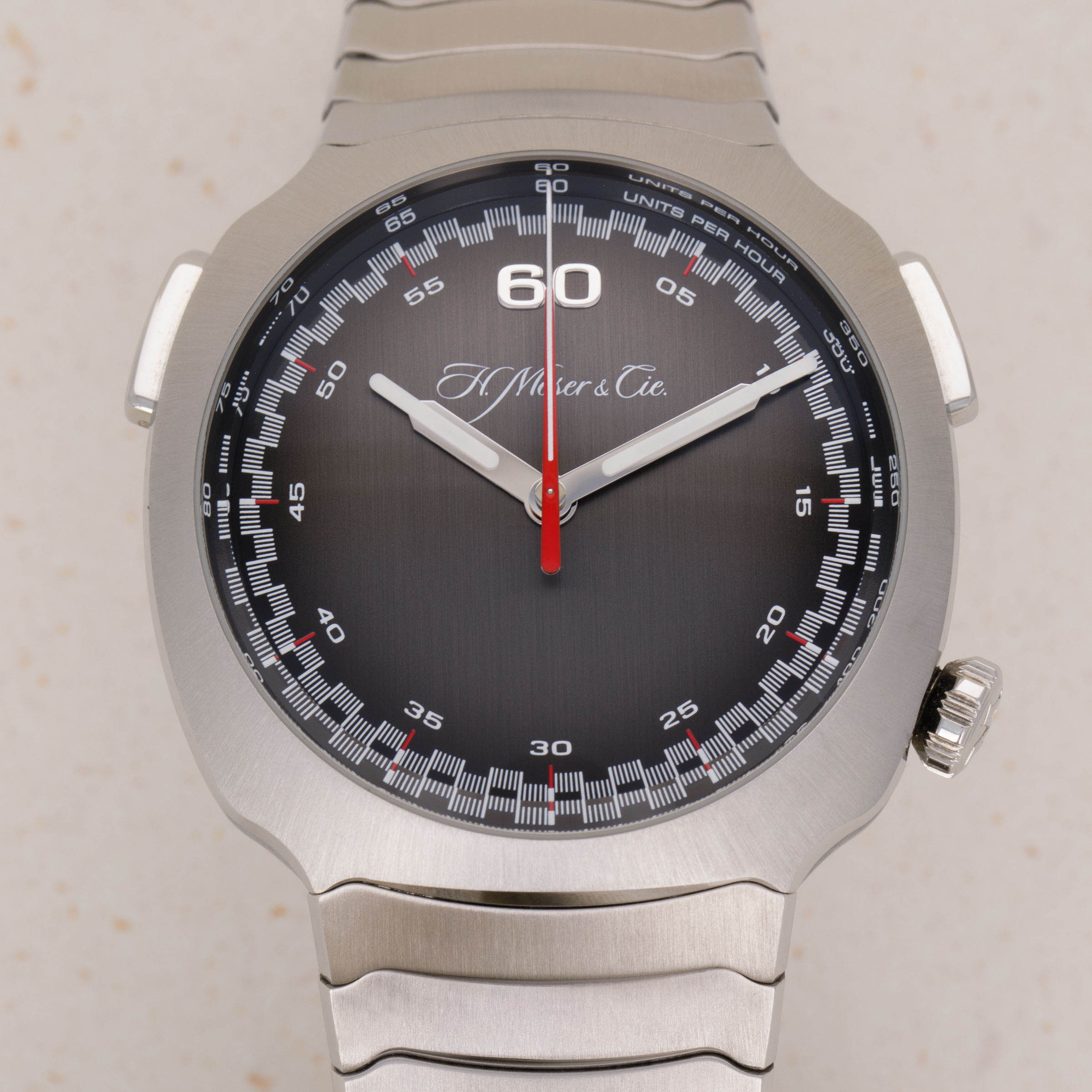 Sporting a stunning grey dial with Moser's signature fumé effect, the Streamliner continues Moser's minimalist styling, whereby its red central hand is the only suggestion of its flyback function. This hand, when activated, then reveals the other central flyback hand underneath it, which counts the minutes.