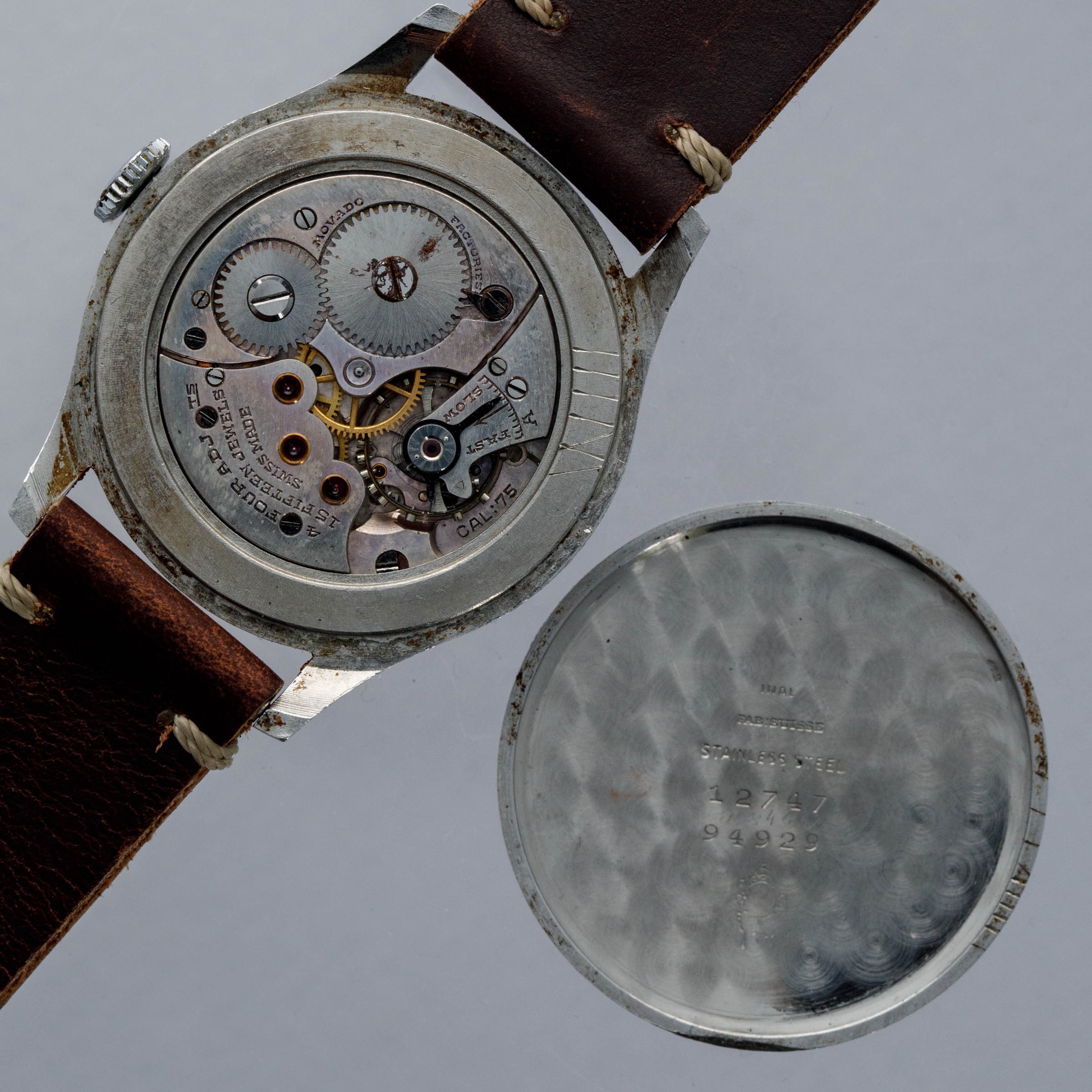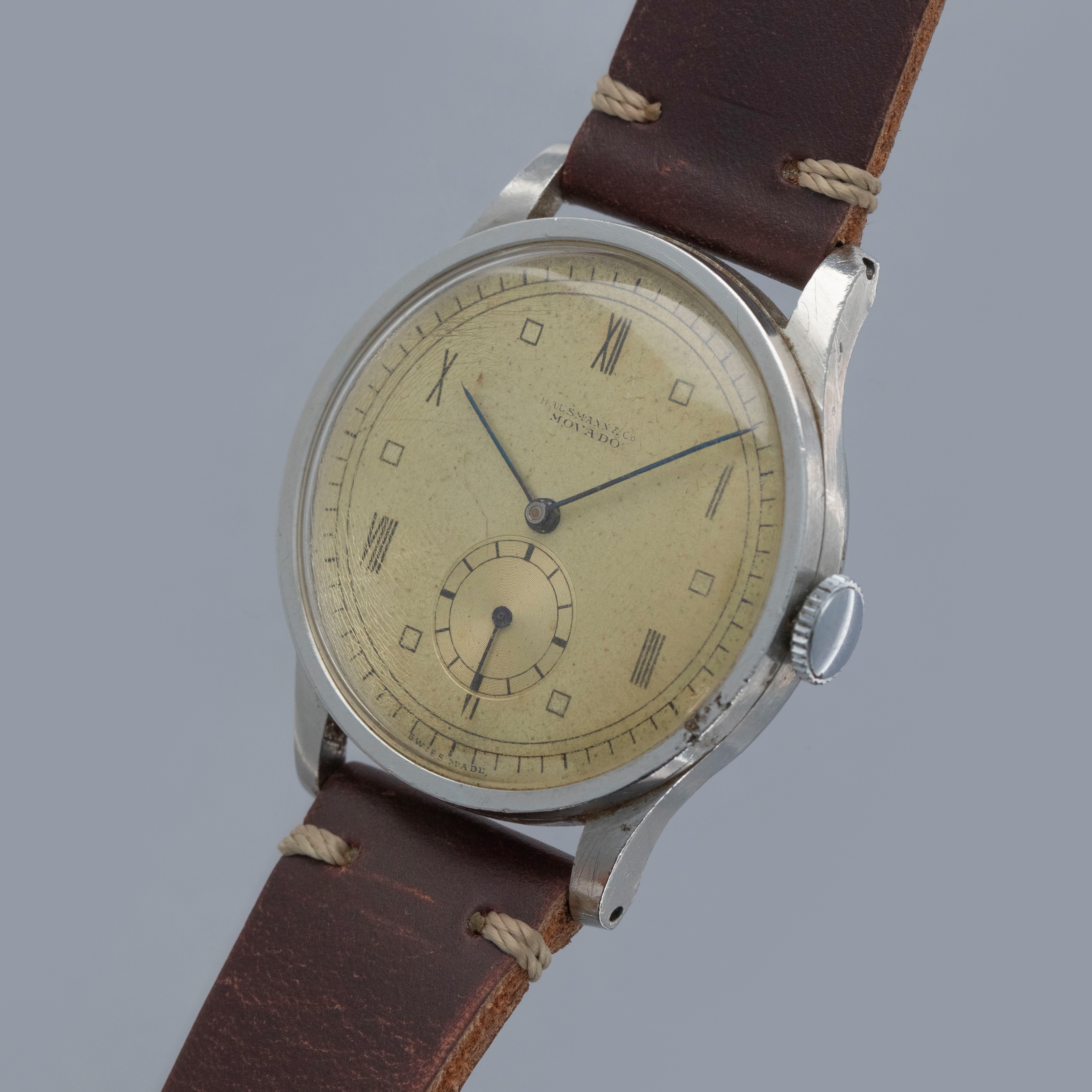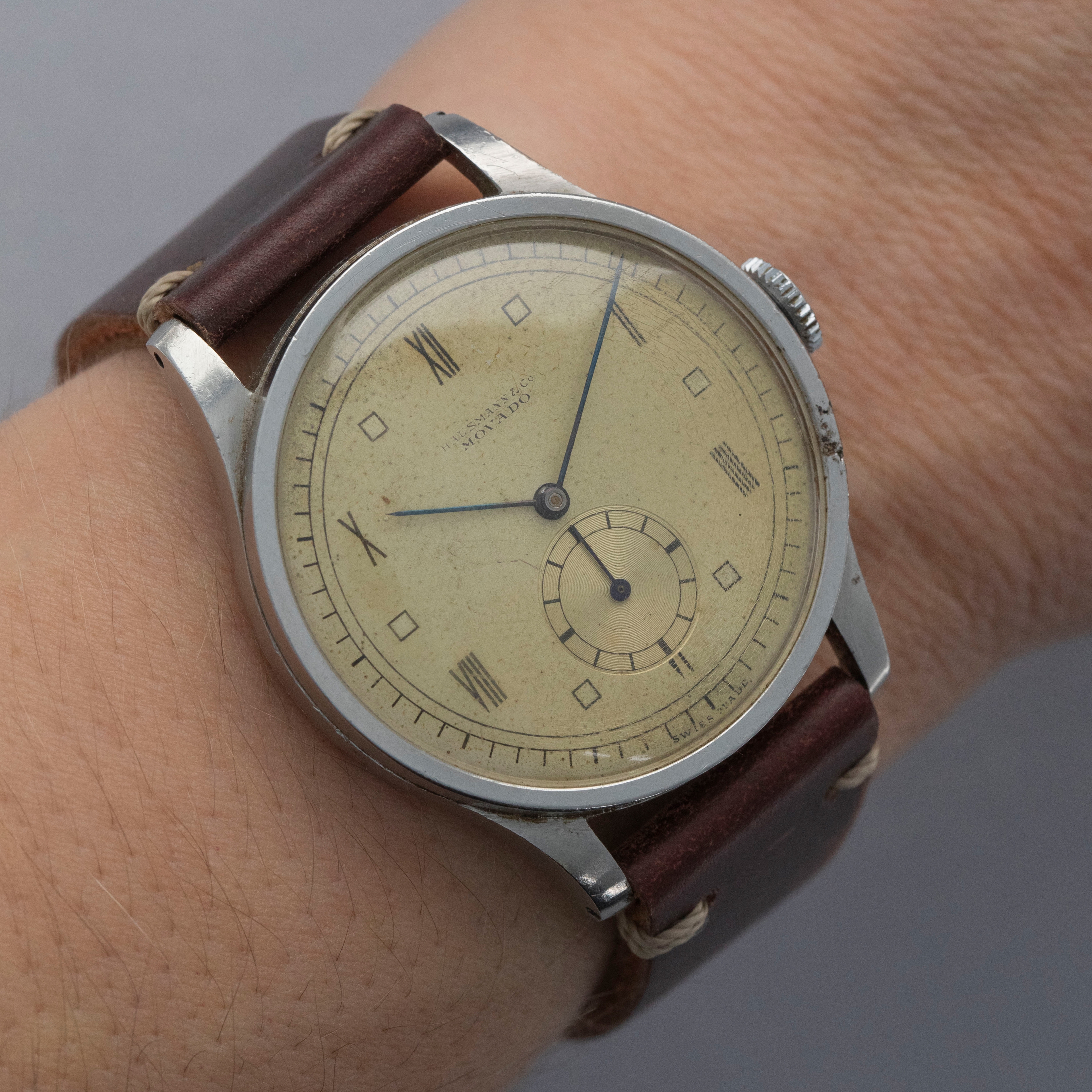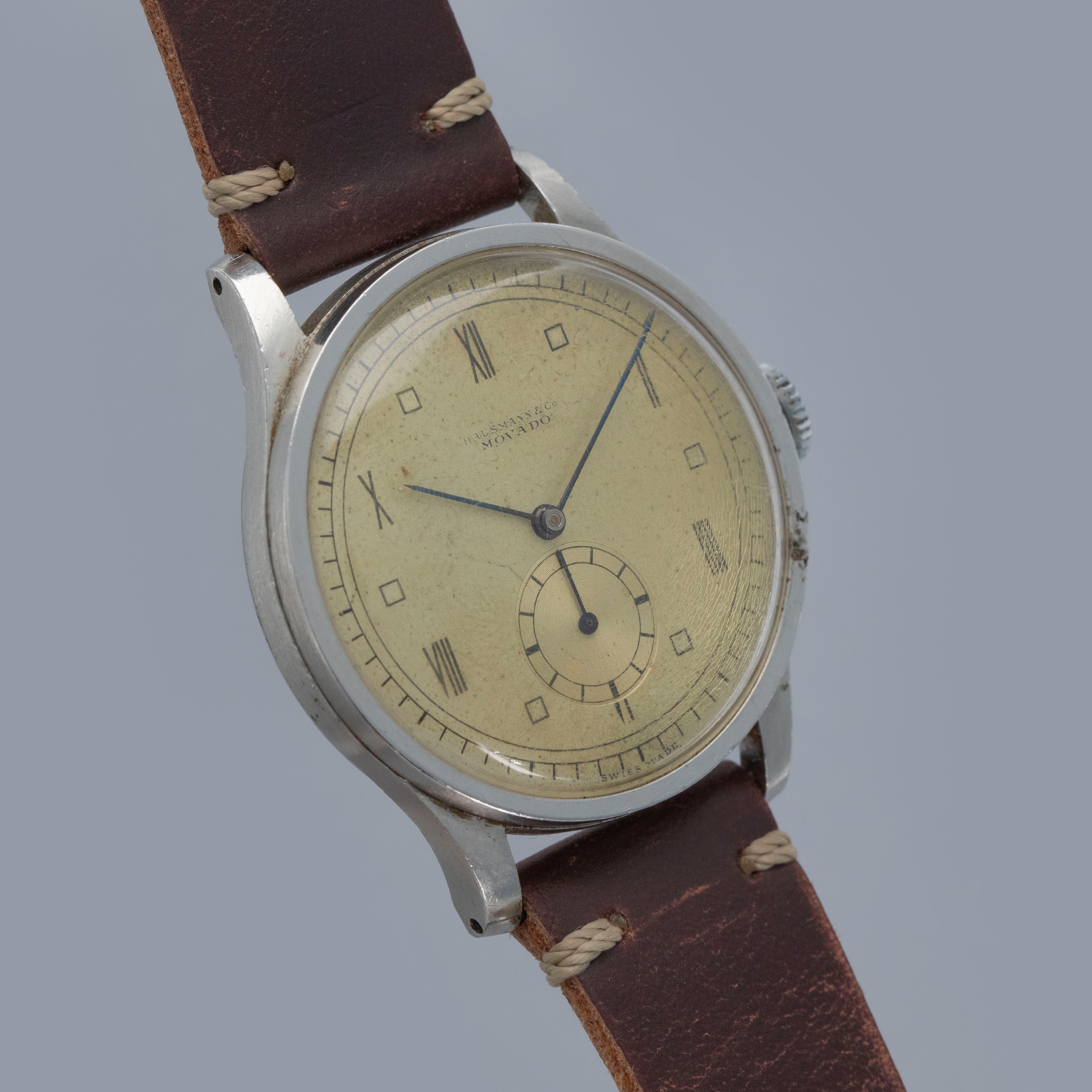 Founded in 1881, Movado has become one of the most interesting watchmakers around with a longstanding history of making some incredible timepieces. While the modern watchmaker Movado that we know of today is certainly not typically associated with high-end luxury watchmaking, the brand’s earlier years were filled with prestige as they earned a reputation as one of Switzerland’s finest watchmakers. By the 1940s, Movado had grown from relatively humble beginnings to one of the industry’s leading brands. As such, their watches were worn by some of the world’s elite and vintage timepieces like the “Big Calatrava” ref. 12747 that we have here is straight out of Movado's golden age. Debuted in the 1940s, the Big Calatrava, as it is known, is famed for its resemblance to the Patek Philippe Calatrava ref. 570, which was in production around the same time. Made of stainless steel and boasting a 35mm diameter, the ref. 12747 is a wonderfully dynamic dress watch that has become a vintage Movado collector’s dream. Retailed by Hausman & Co. as stamped on its dial at 12 o’clock, this example’s dial has aged to include a rich creamy yellow patina that gives it a wonderfully vintage aesthetic. With a thin bezel, long lugs, and a large winding crown, the ref. 12747 was way ahead of it time, and would perfectly slot into a modern watch collection, especially with its esteemed cal. 75 movement and large case for the time.
