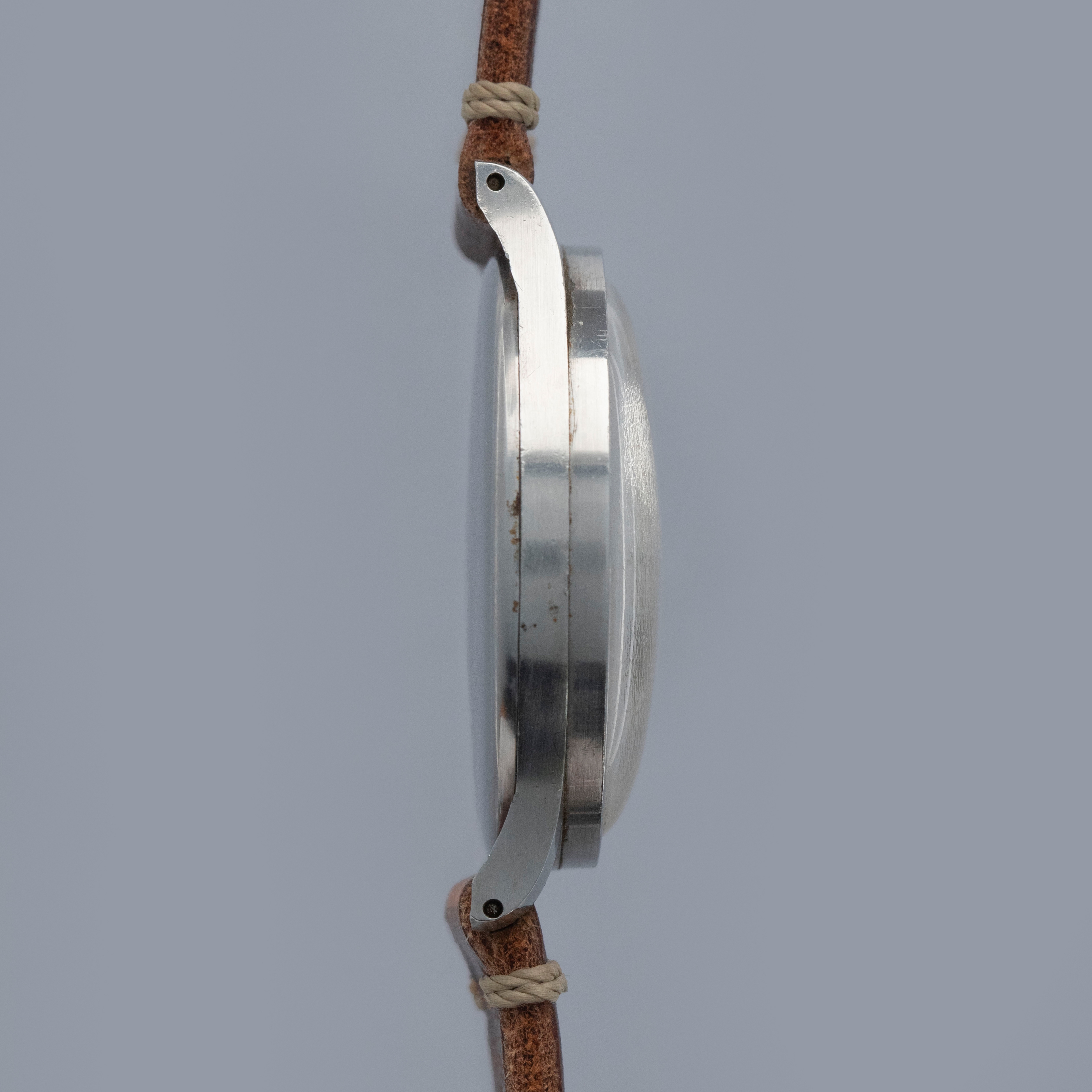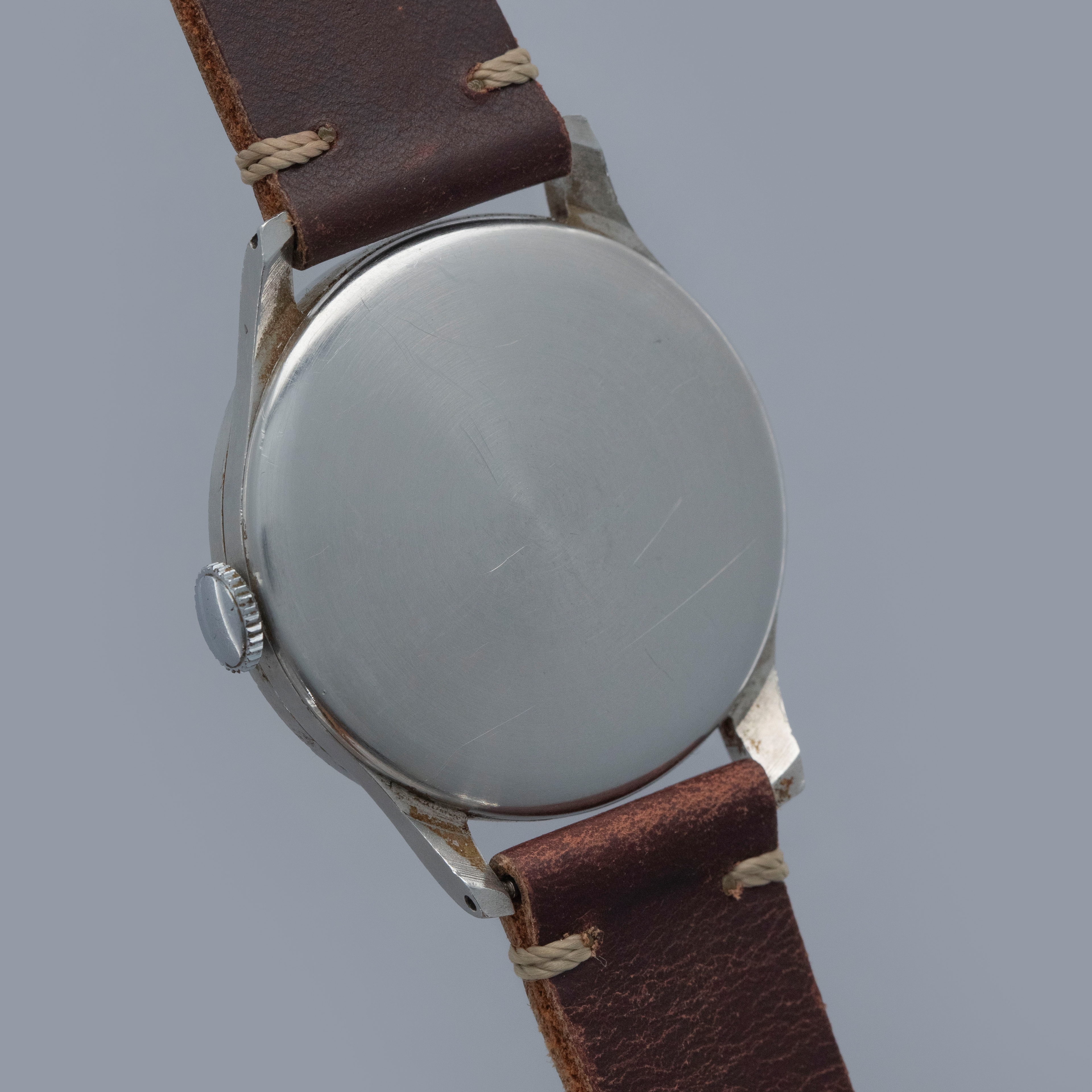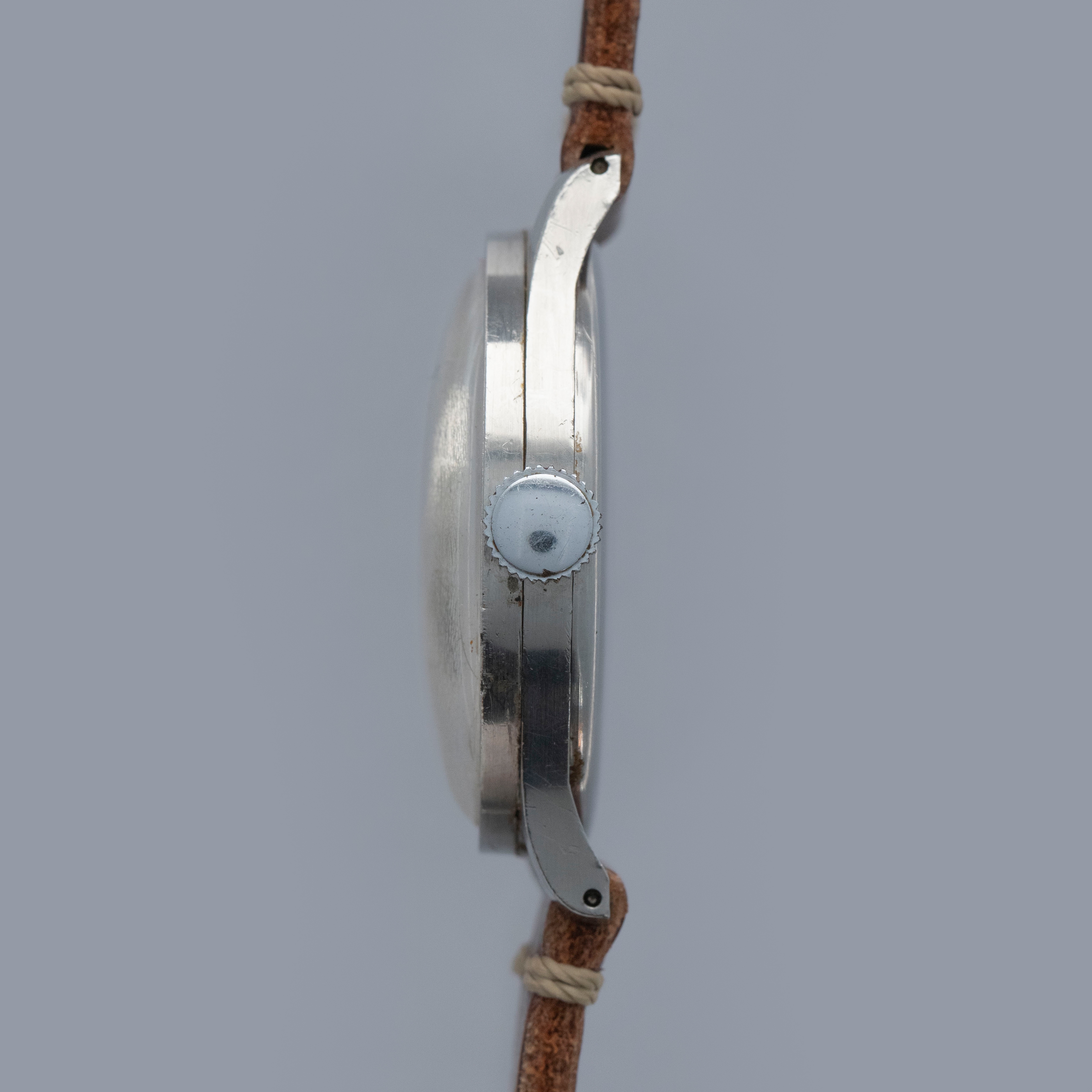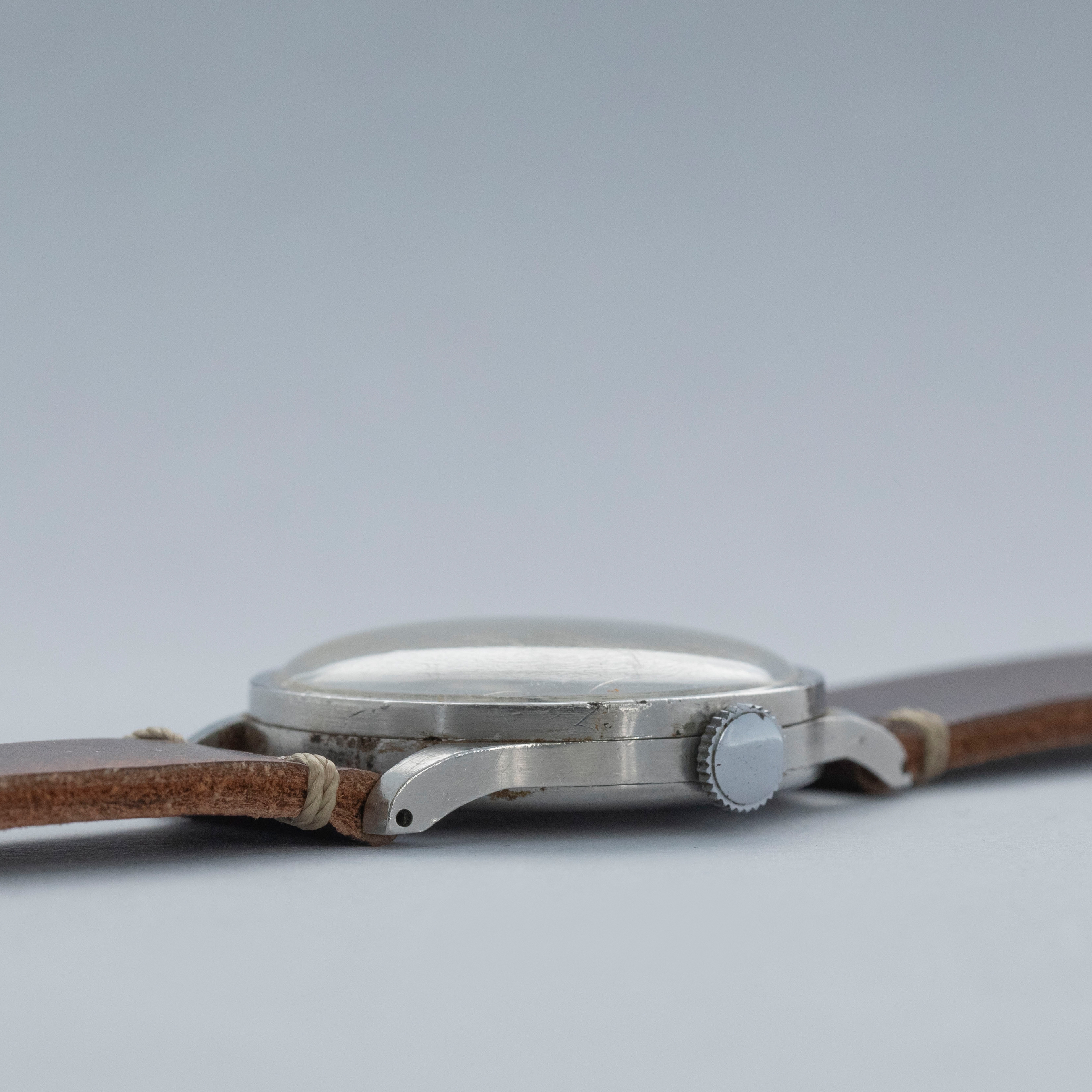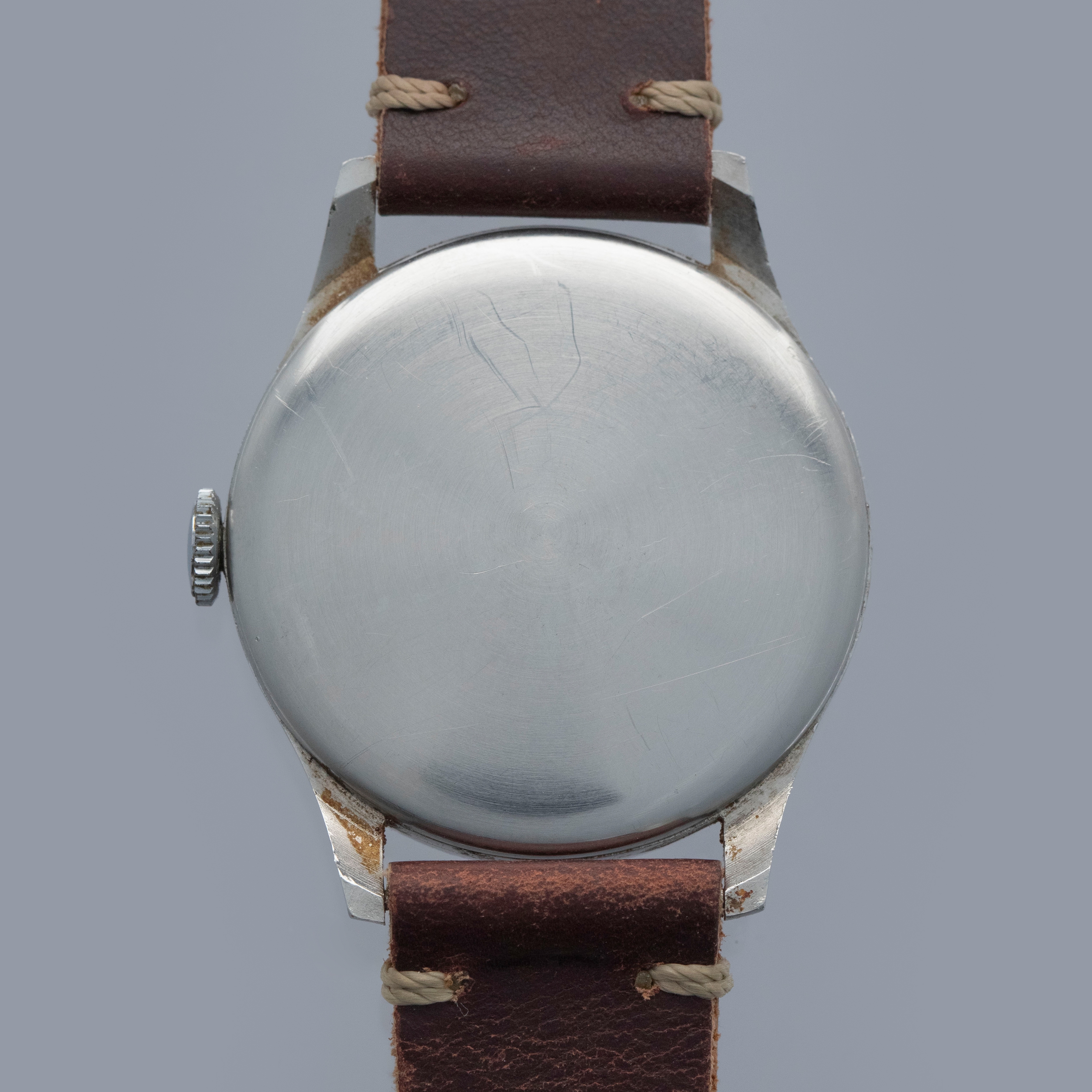 Watch is in good overall condition. Case lugs show nice definition, with light surface corrosion visible in some areas and along some of the seams. The original bezel has a noticeable amount of pitting visible around the 4 o’clock area. The original dial has aged, with some patina and crazing visible on the surface, along with a few minor marks. The retailer and manufacture signatures on the dial are slightly faded. Movement shows light oxidation on the surface, and some rusting is visible on the ratchet wheel. Blued hands are clean showing little degradation. Watch comes on a generic strap and buckle. Please note: Watch is ticking at time of cataloging, but it does not keep time, and a service is needed.