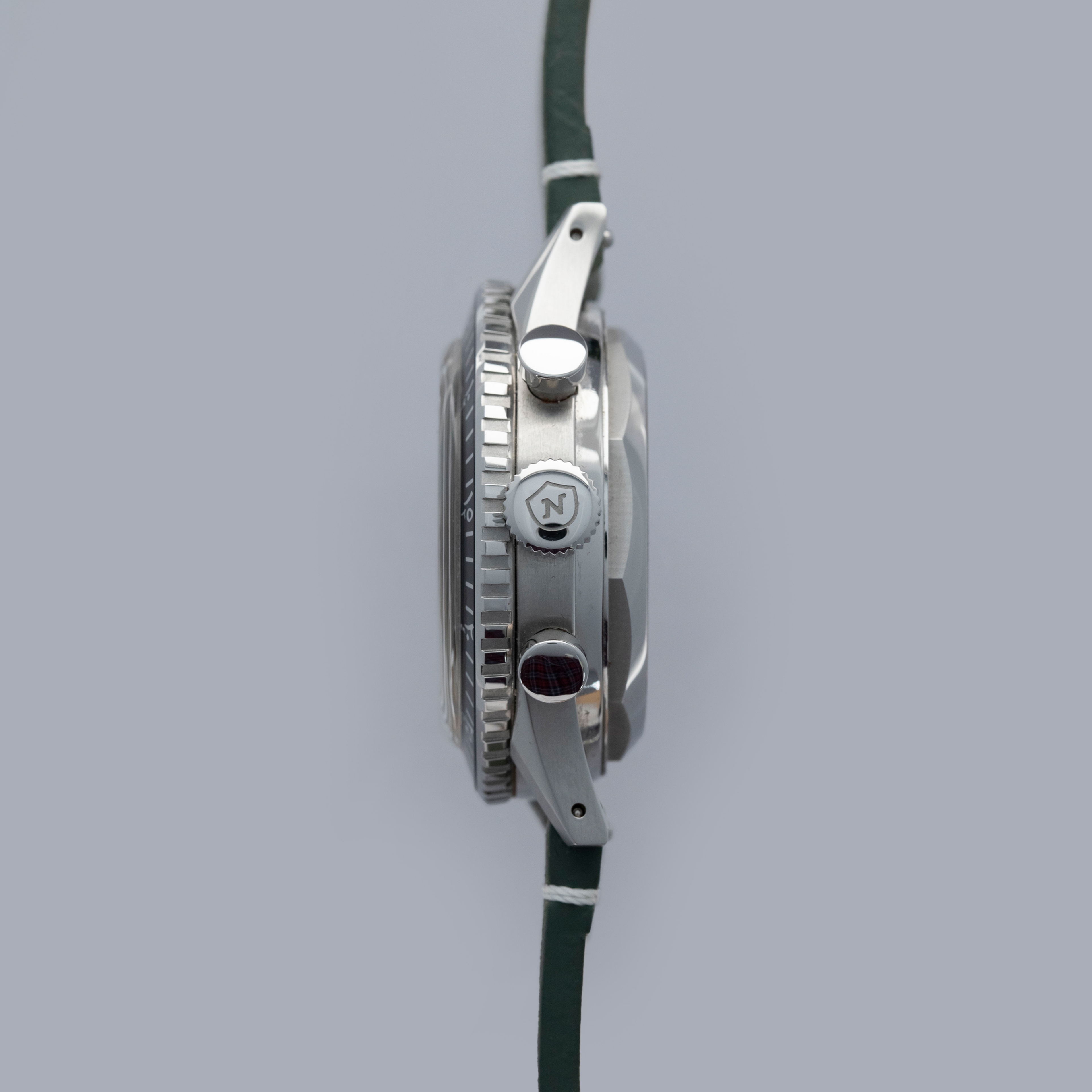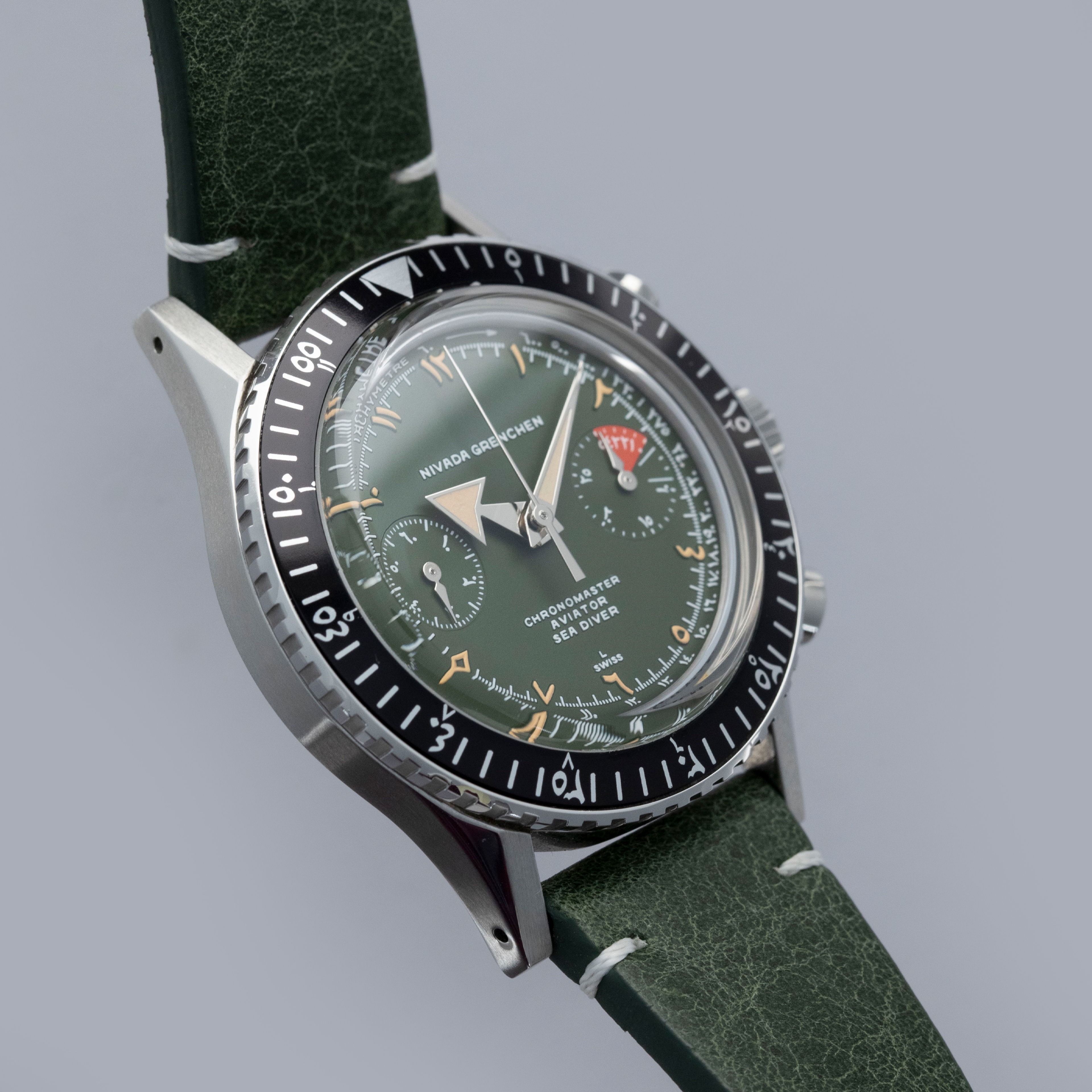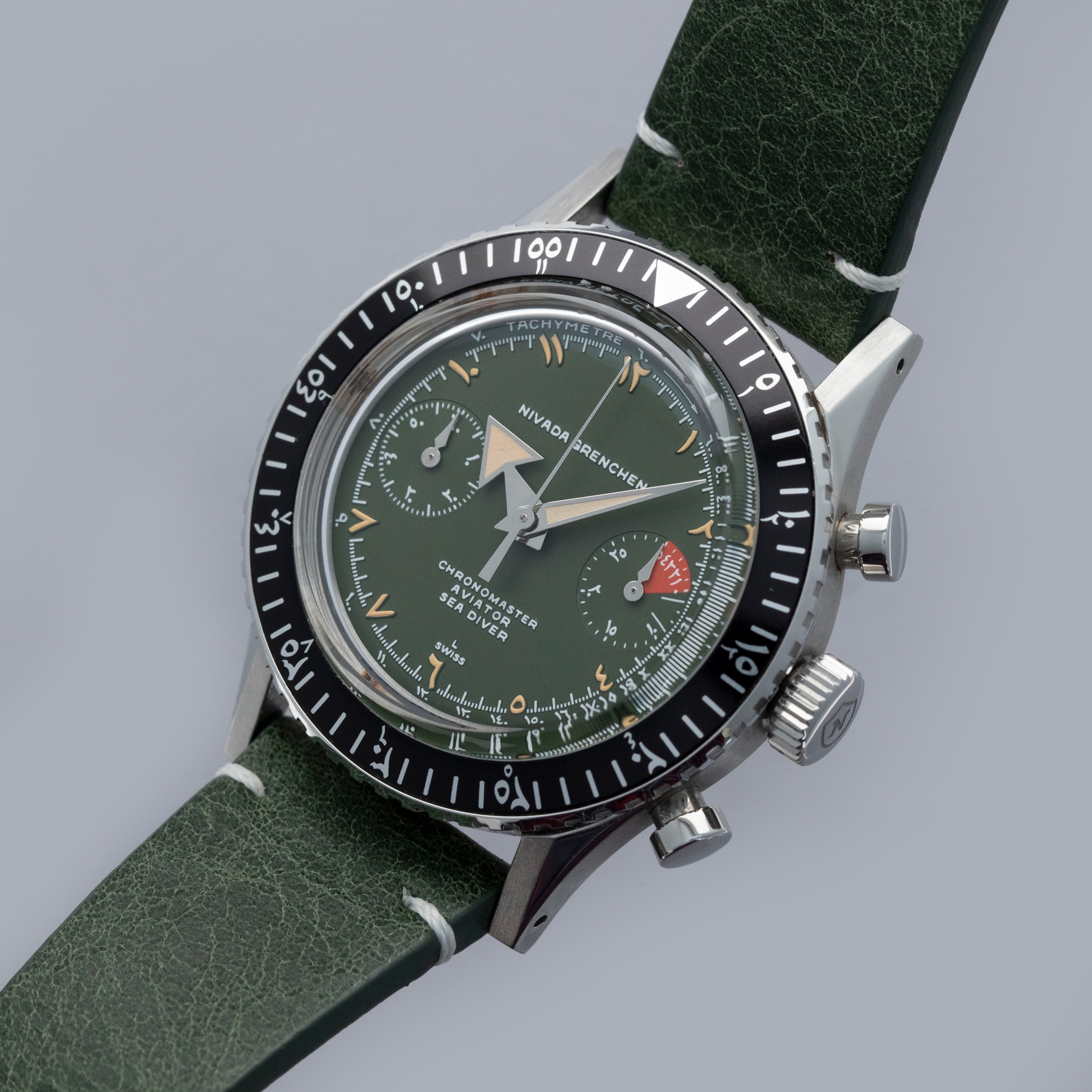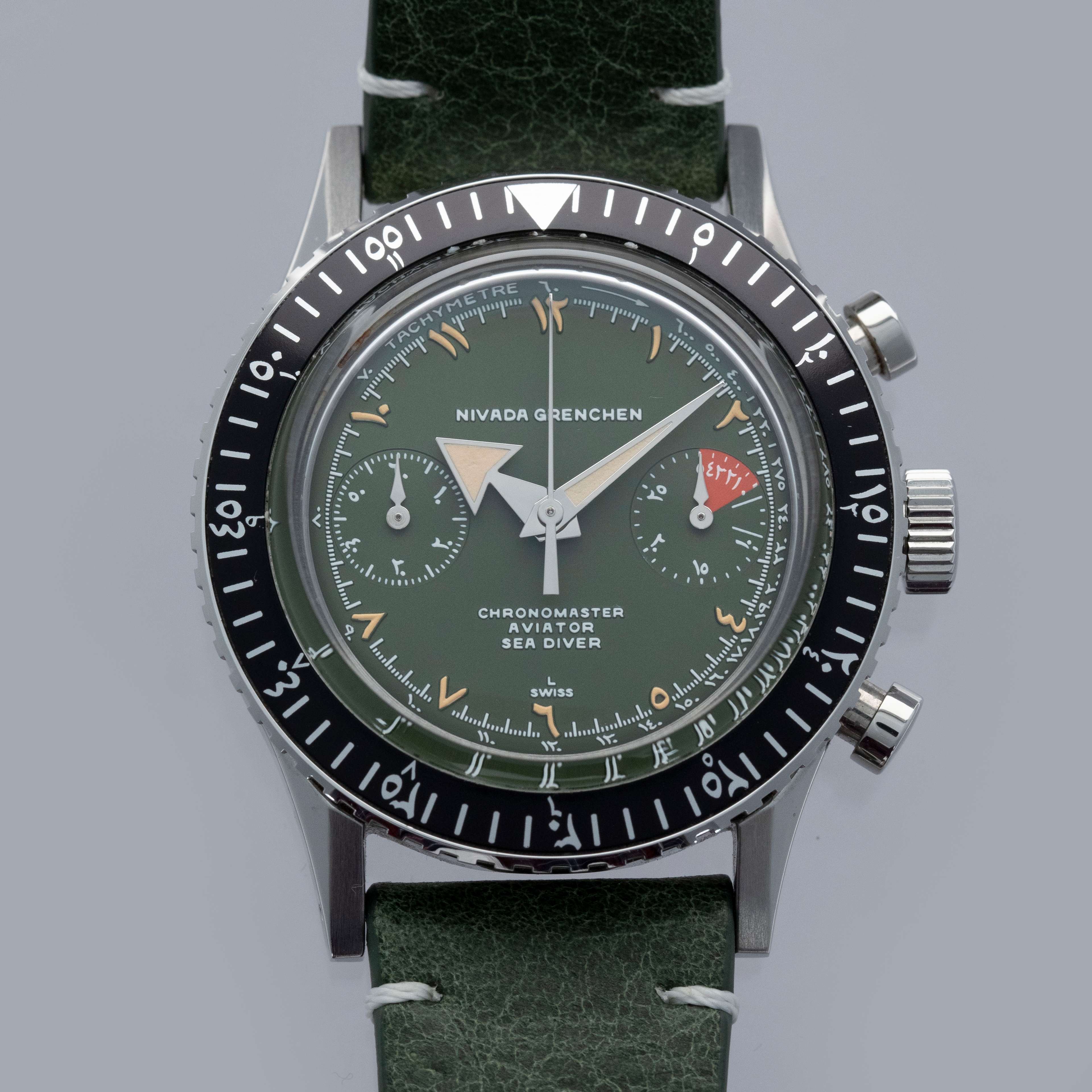 Amongst the plethora of modern watchmakers that we all love and enjoy, there lies an enormous number of dormant or extinct watchmakers that have been lost to the sands of times thanks to industry shifts, poor business acumen or a combination of both mixed with the onslaught that the Quartz Crisis brought along in the 1970s and ‘80s. Within that large group of brands lies one watchmaker that has recently been revived, Nivada Grenchen. Founded in 1926, or as far back as 1879 depending on the source you consult, the brand found success in tool watches and robust timepieces capable of carrying out specific tasks like chronographs and dive watches. One such watch was the Chronomaster – a pilots watch and a dive watch rolled into one. When Nivada Grenchen succumbed to the Quartz Crisis however, it was no more. Revived in 2018, Nivada Grenchen has come back with like a phoenix rising from their ashes and brought along several of their iconic vintage designs just like the 38mm stainless steel Chronomaster Aviator Sea Diver that we have here. With its multi-functional bezel and legible bi-compax dial arrangement, the Chronomaster has come back with a vengeance and proven to be quite the hit. Blending the model’s iconic vintage appeal with modern construction quality, the Chronomaster appeals to the modern collector’s creature comforts while also retaining the same stunning good looks that have caused vintage collectors to be lusting after this legendary watch for decades. In an additional twist, however, this example belongs to Nivada Grenchen’s 2022 limited edition collaboration of 50 pieces with UAE-based watch retailer Perpétuel, and so it includes Eastern-Arabic numerals in its olive green dial and bezel that subtly distinguish it from its regular production siblings.