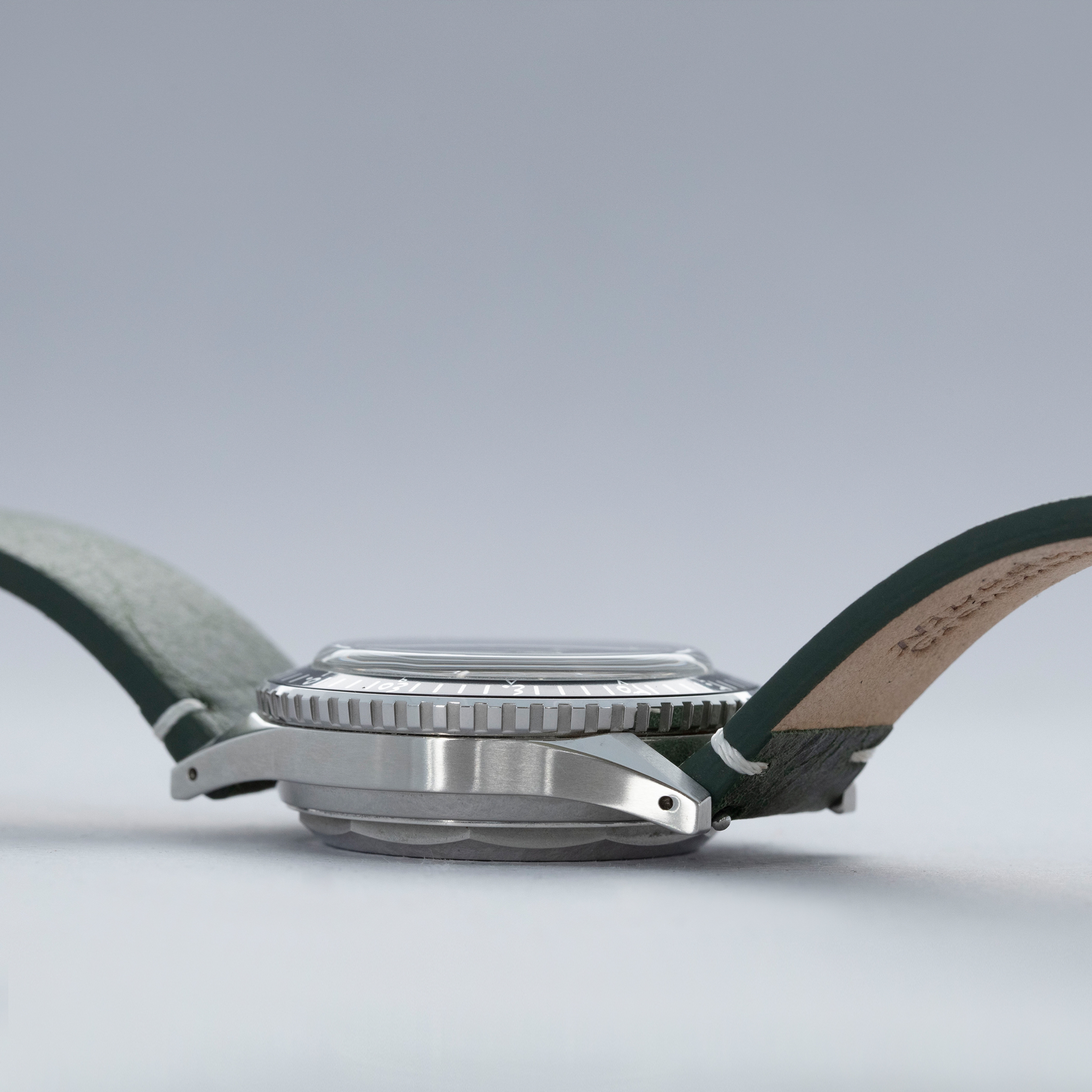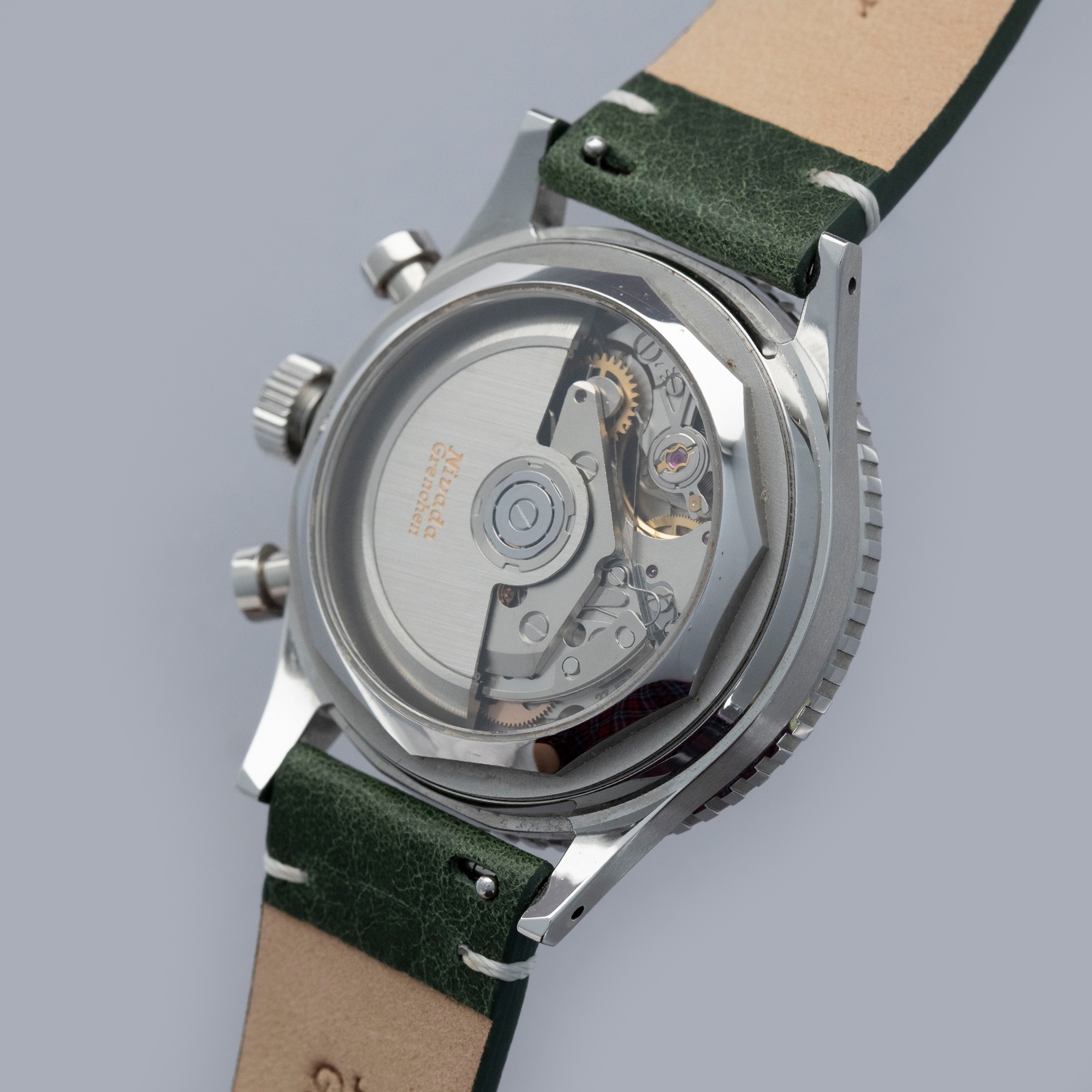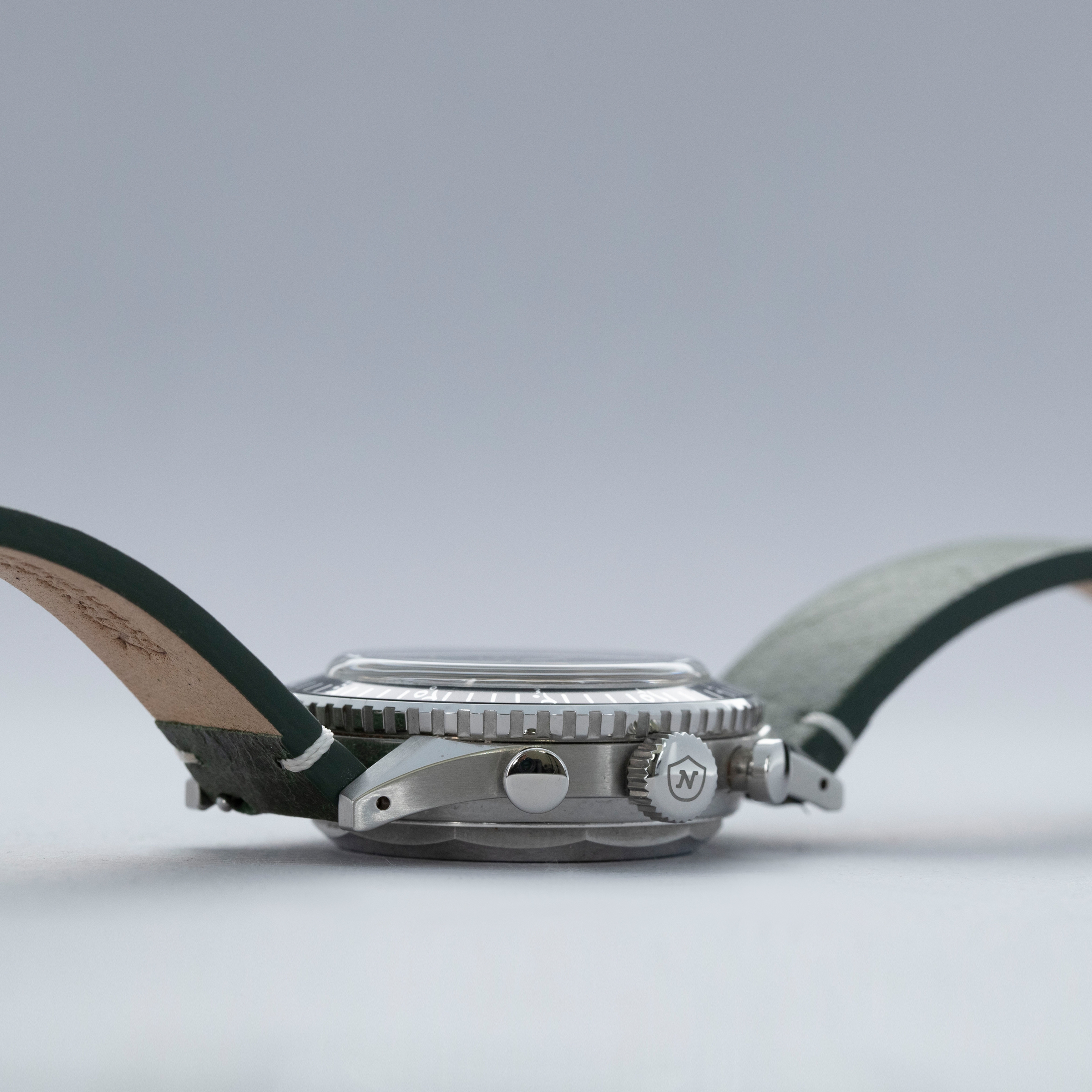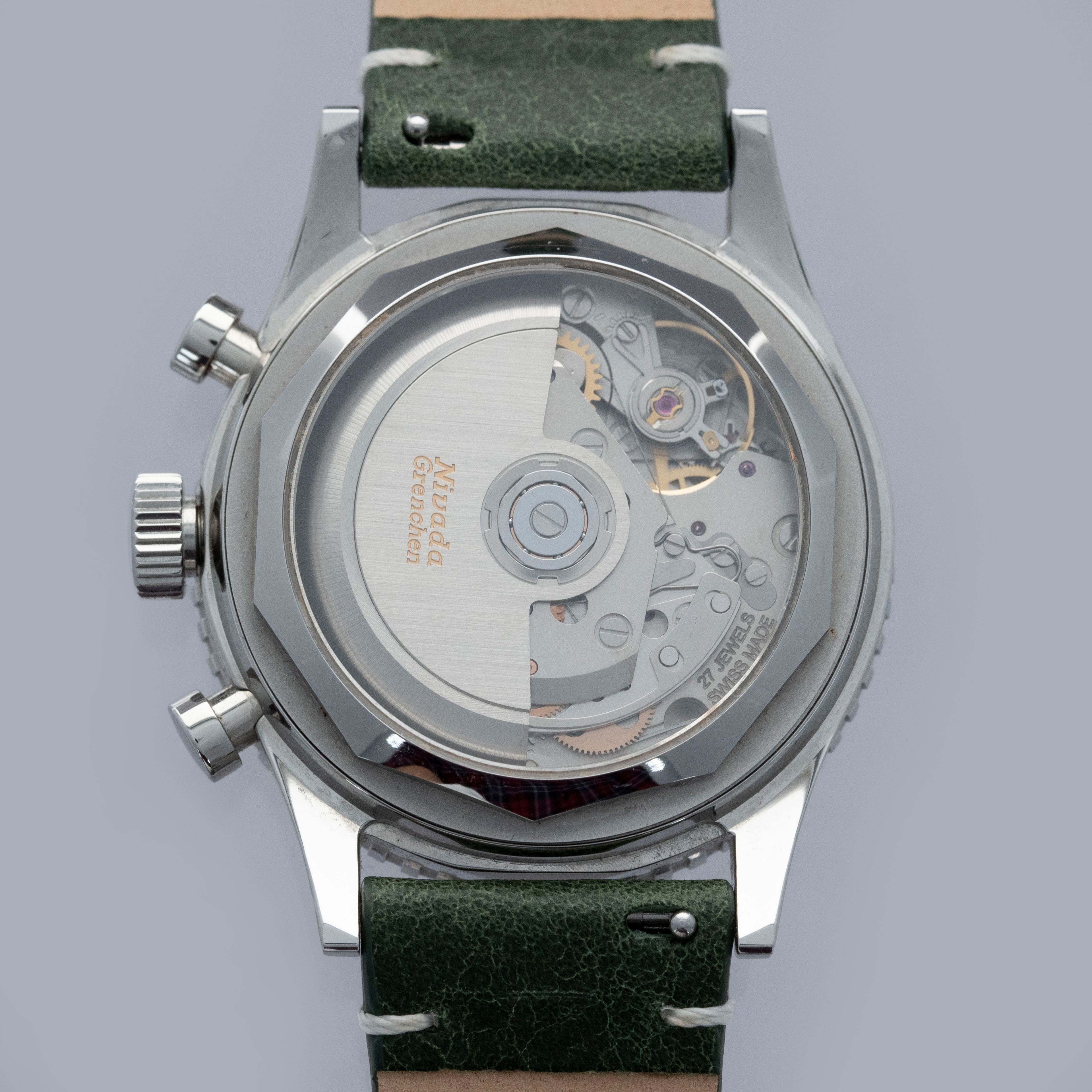Amongst the plethora of modern watchmakers that we all love and enjoy, there lies an enormous number of dormant or extinct watchmakers that have been lost to the sands of times thanks to industry shifts, poor business acumen or a combination of both mixed with the onslaught that the Quartz Crisis brought along in the 1970s and ‘80s. Within that large group of brands lies one watchmaker that has recently been revived, Nivada Grenchen. Founded in 1926, or as far back as 1879 depending on the source you consult, the brand found success in tool watches and robust timepieces capable of carrying out specific tasks like chronographs and dive watches. One such watch was the Chronomaster – a pilots watch and a dive watch rolled into one. When Nivada Grenchen succumbed to the Quartz Crisis however, it was no more. Revived in 2018, Nivada Grenchen has come back with like a phoenix rising from their ashes and brought along several of their iconic vintage designs just like the 38mm stainless steel Chronomaster Aviator Sea Diver that we have here. With its multi-functional bezel and legible bi-compax dial arrangement, the Chronomaster has come back with a vengeance and proven to be quite the hit. Blending the model’s iconic vintage appeal with modern construction quality, the Chronomaster appeals to the modern collector’s creature comforts while also retaining the same stunning good looks that have caused vintage collectors to be lusting after this legendary watch for decades. In an additional twist, however, this example belongs to Nivada Grenchen’s 2022 limited edition collaboration of 50 pieces with UAE-based watch retailer Perpétuel, and so it includes Eastern-Arabic numerals in its olive green dial and bezel that subtly distinguish it from its regular production siblings.