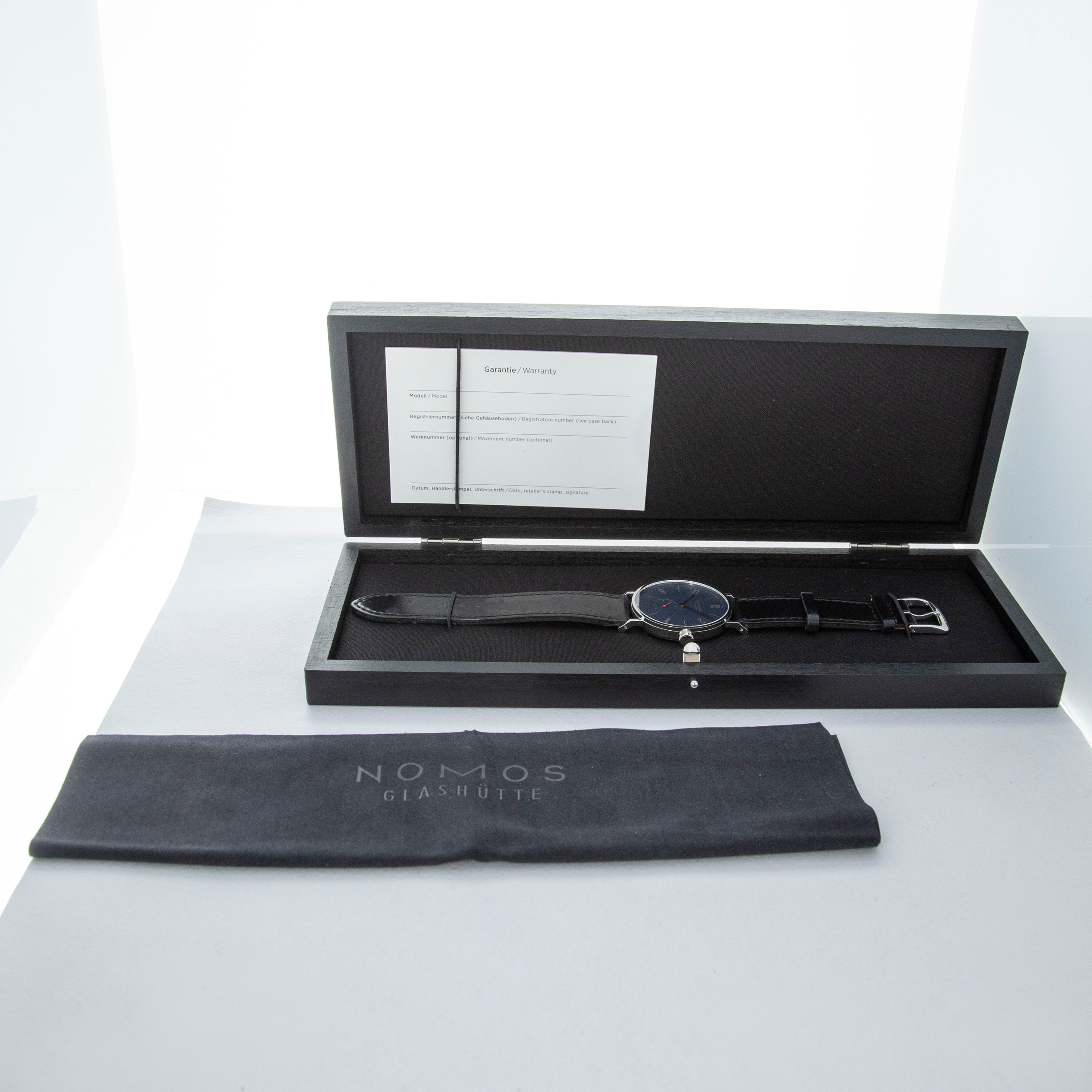 The watch is in overall near-mint condition. The steel case has a few light marks from wear, and the case back is very clean with crisp engravings. The dial and hands are like new. It is fitted with a leather strap and steel buckle, which shows light scratches. The watch comes complete with its box and papers. Watch is a very lucky serial number- 88.