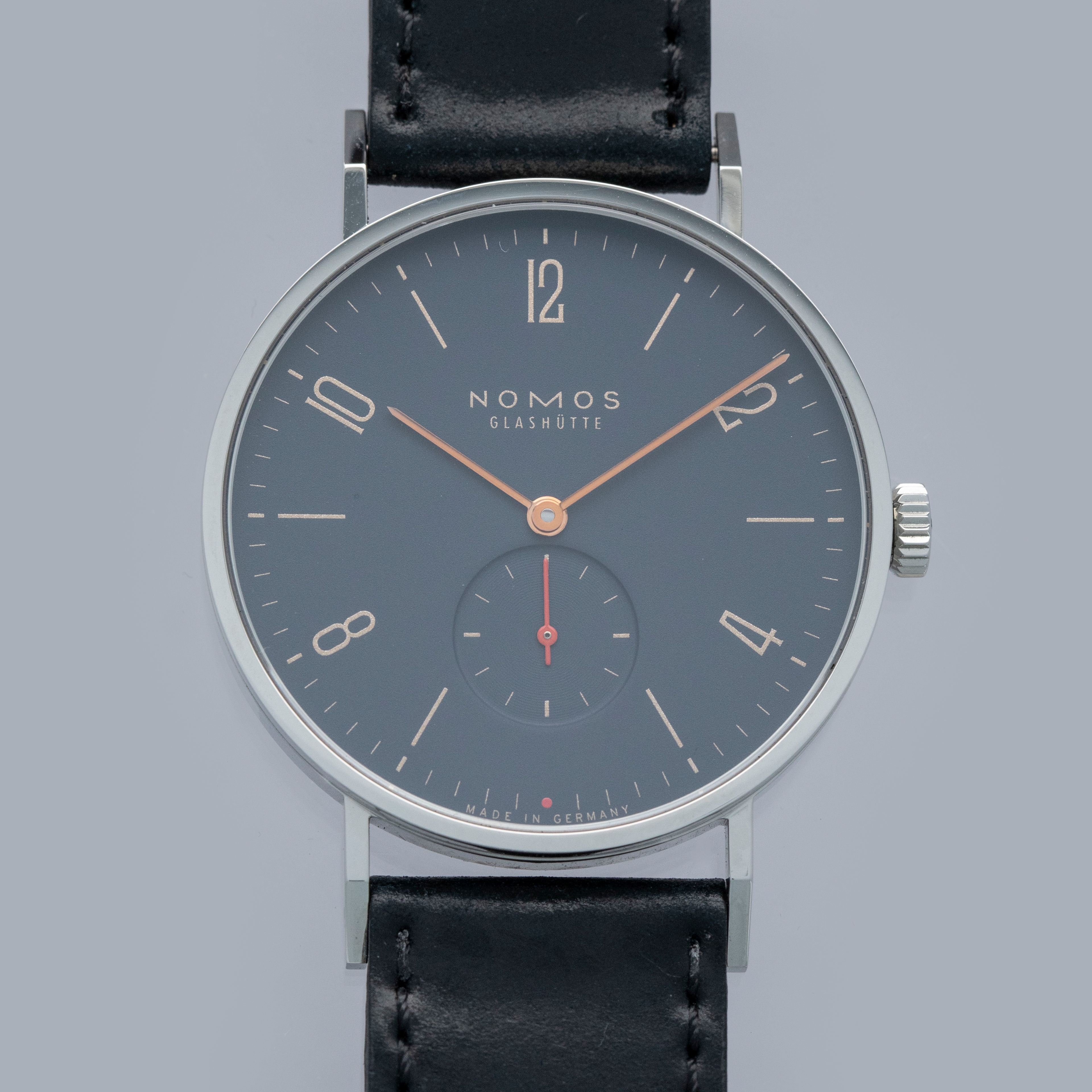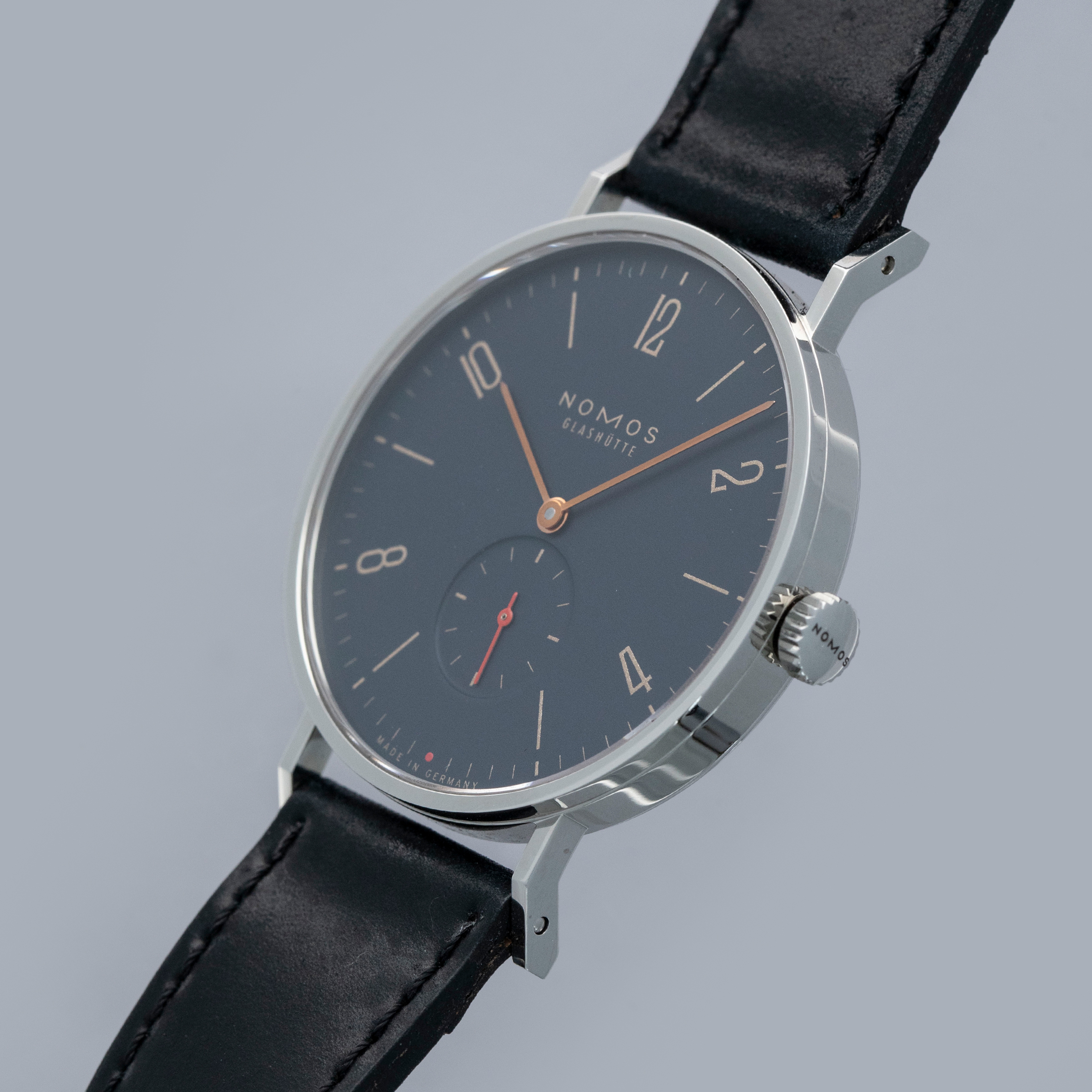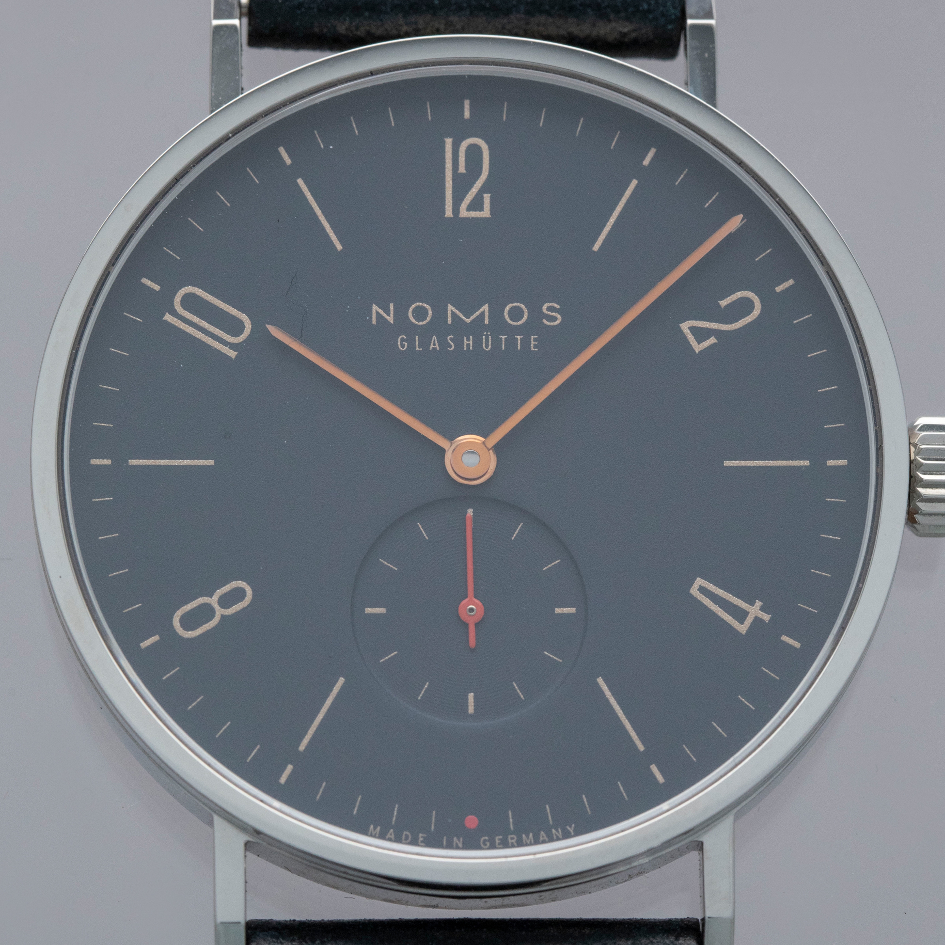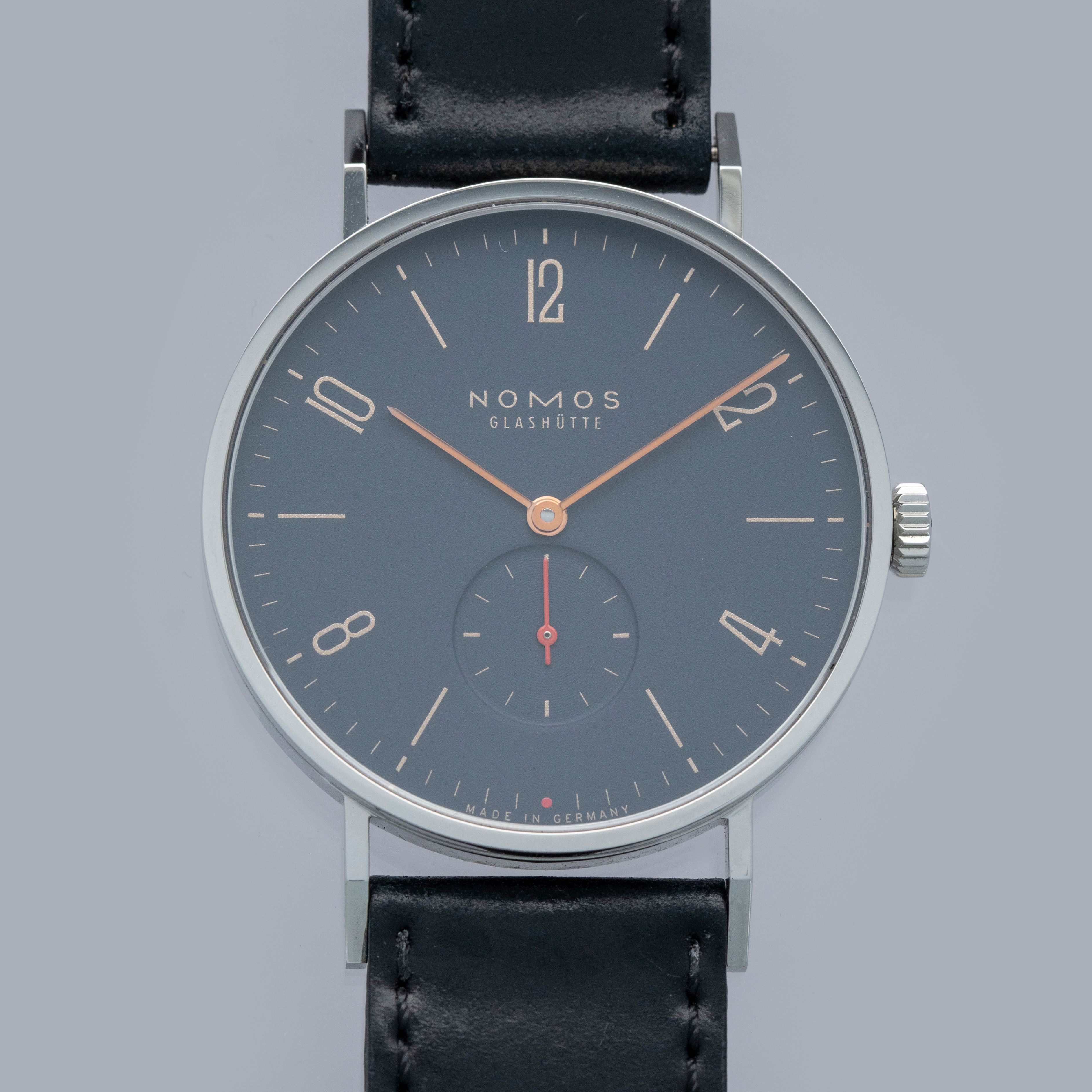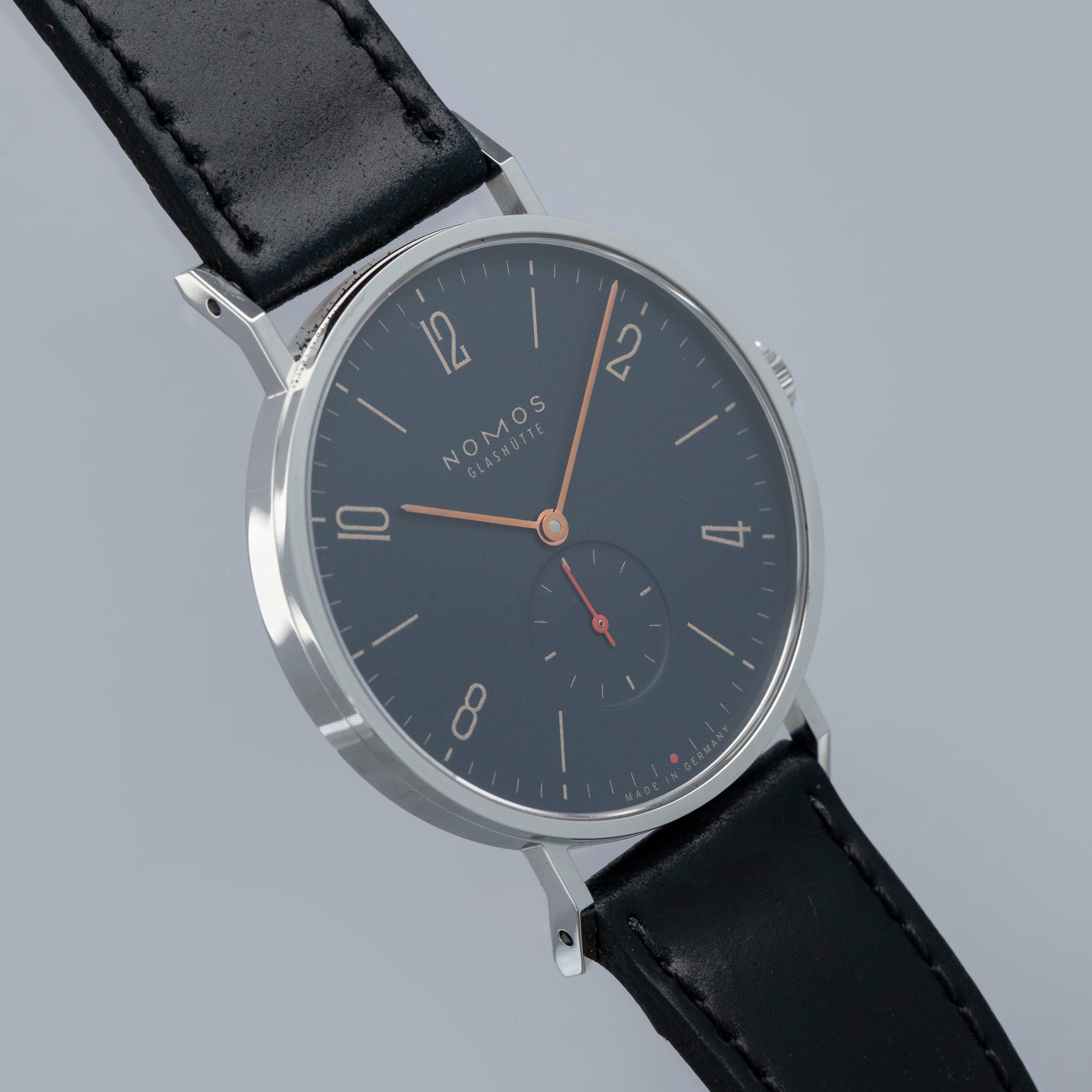 Founded in 1990 following the collapse of the Berlin wall, like a handful of other German watchmakers, Nomos Glashutte has quickly grown into one of the most highly respected watchmakers in the world thanks to their exceptional value for money, eye for detail and steadfast dedication to the Bauhaus school of design. Combining all of those tenets into one watch, like so many of their other models, is the Tangente that we have here. Offered in 2018 as a collaboration with Singapore-based watch retailer The Hour Glass, the “Red Dot” was limited to just 200 pieces split equally across two variants (this midnight blue and a salmon). Made of stainless steel and boasting a perfectly circular case, the Tangente’s 37.5’s diameter is incredibly sleek and wearable. Just 6.75mm tall thanks to its cal. NOMOS Alpha movement, the Tangente emphasises everything Nomos is about, with its understated midnight blue dial lacking any exuberant details that could otherwise detract from its ability to tell the time, besides its beautiful gilt inscriptions. Featuring a single flourish thanks to its bright orange running seconds hand and golden hour and minute hands, the Tangente is a carefully crafted watch whose understated looks deceive the lengthy design process that goes into making a watch appear so effortless.