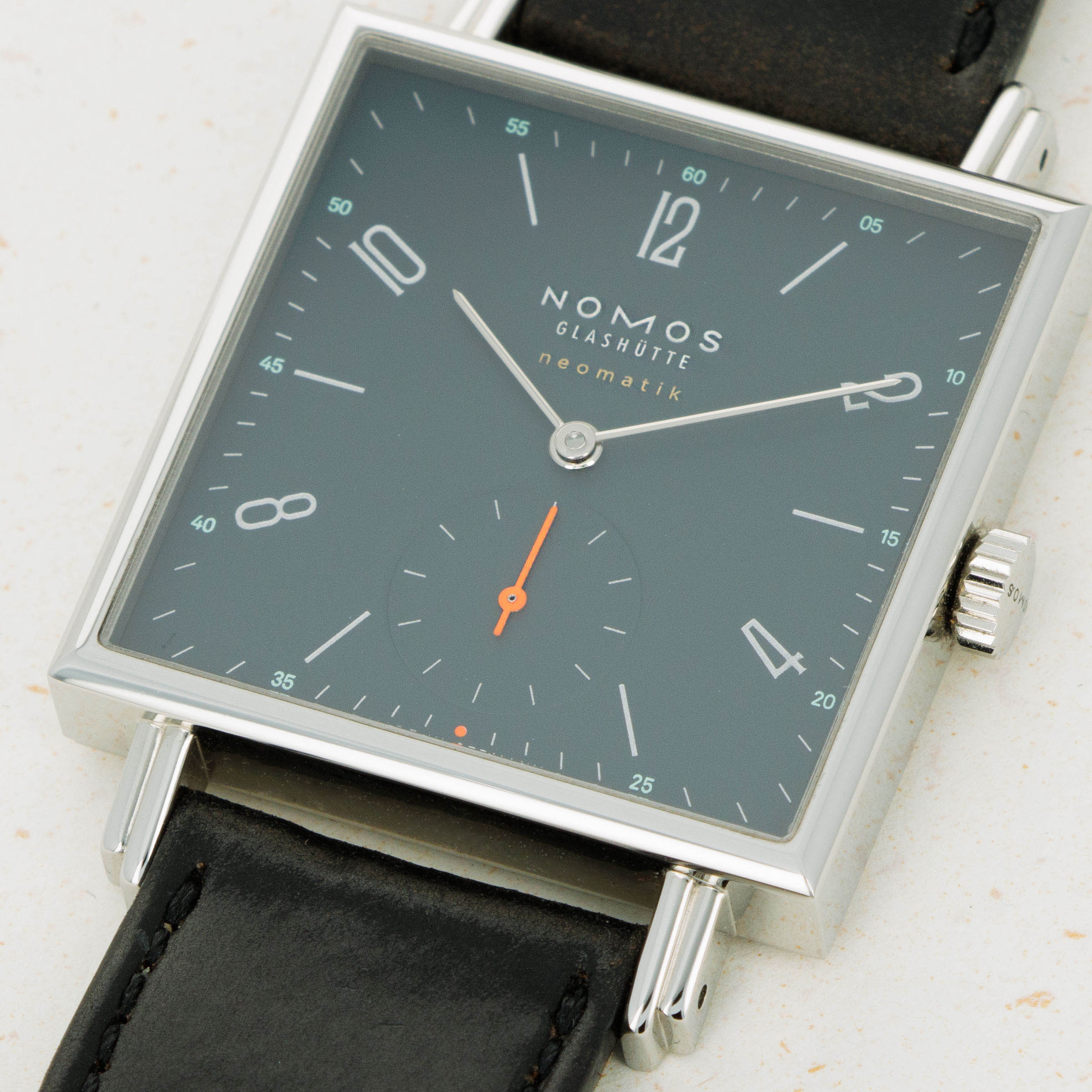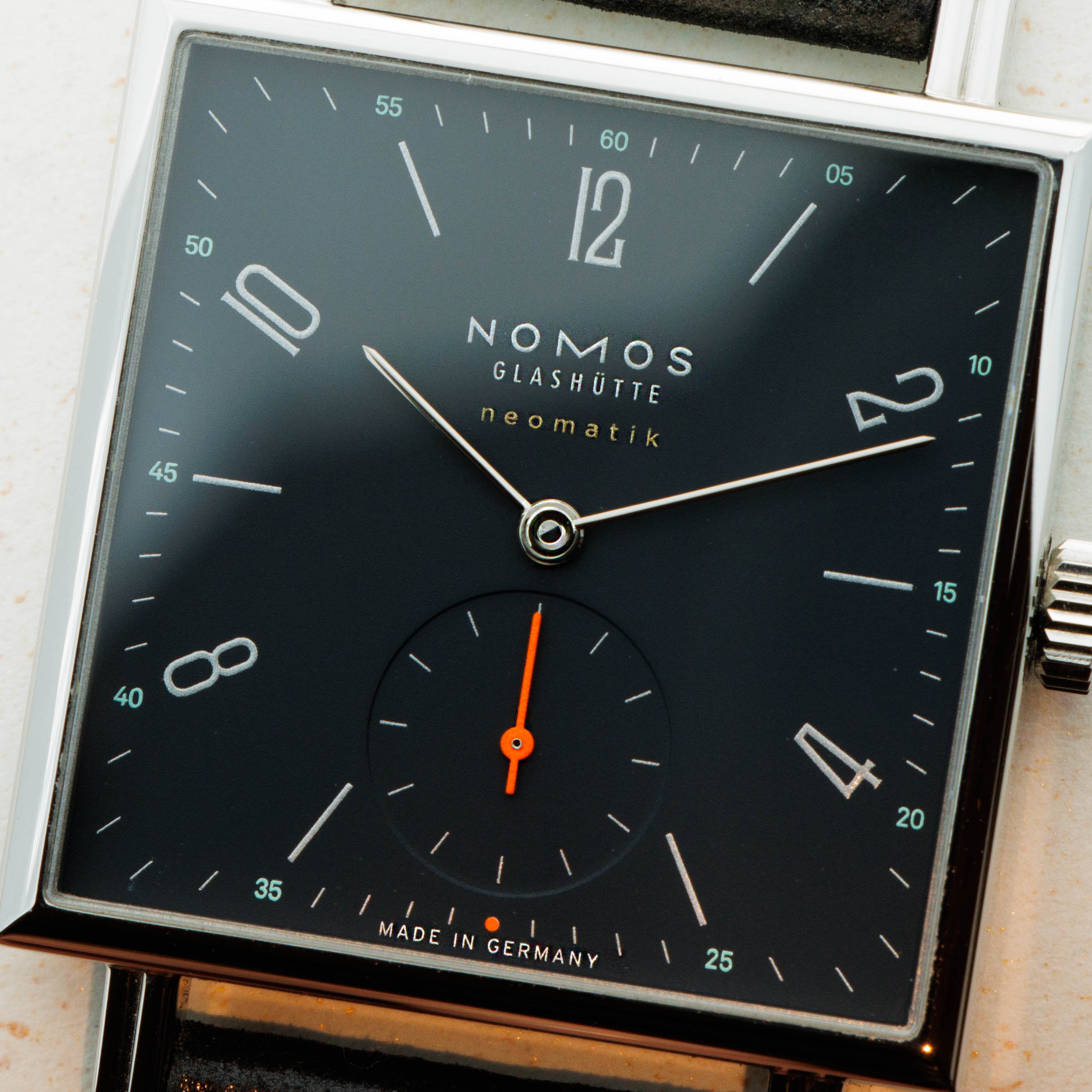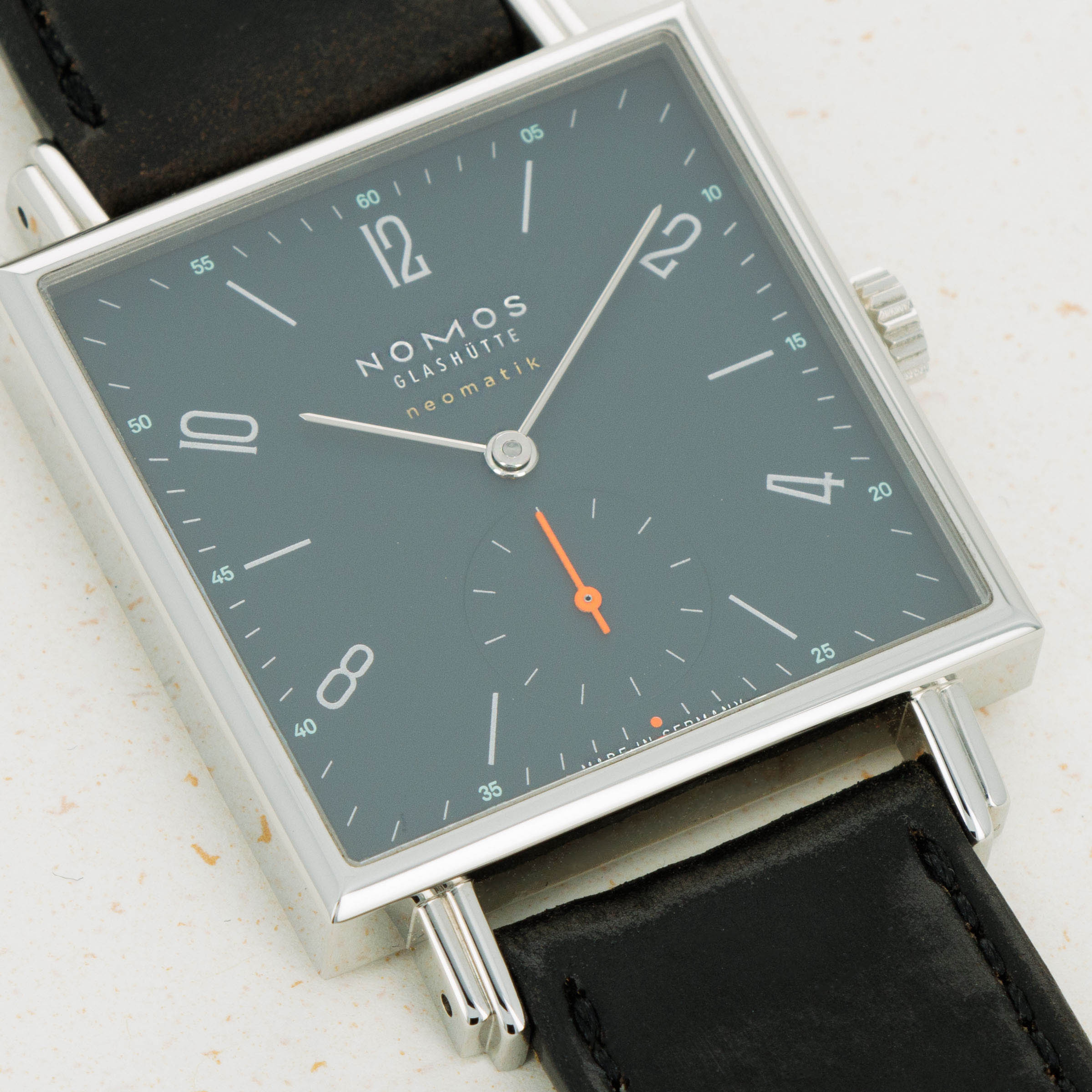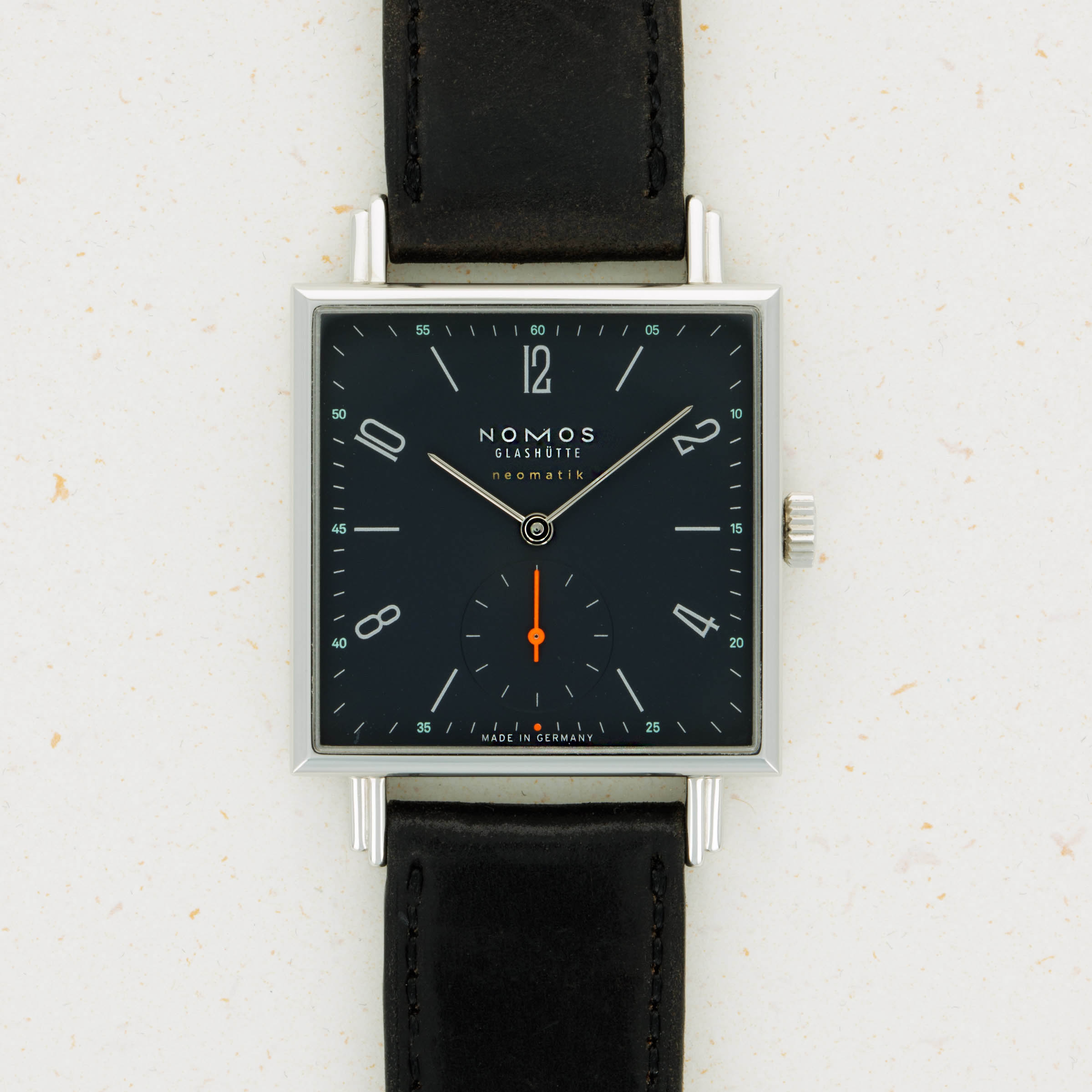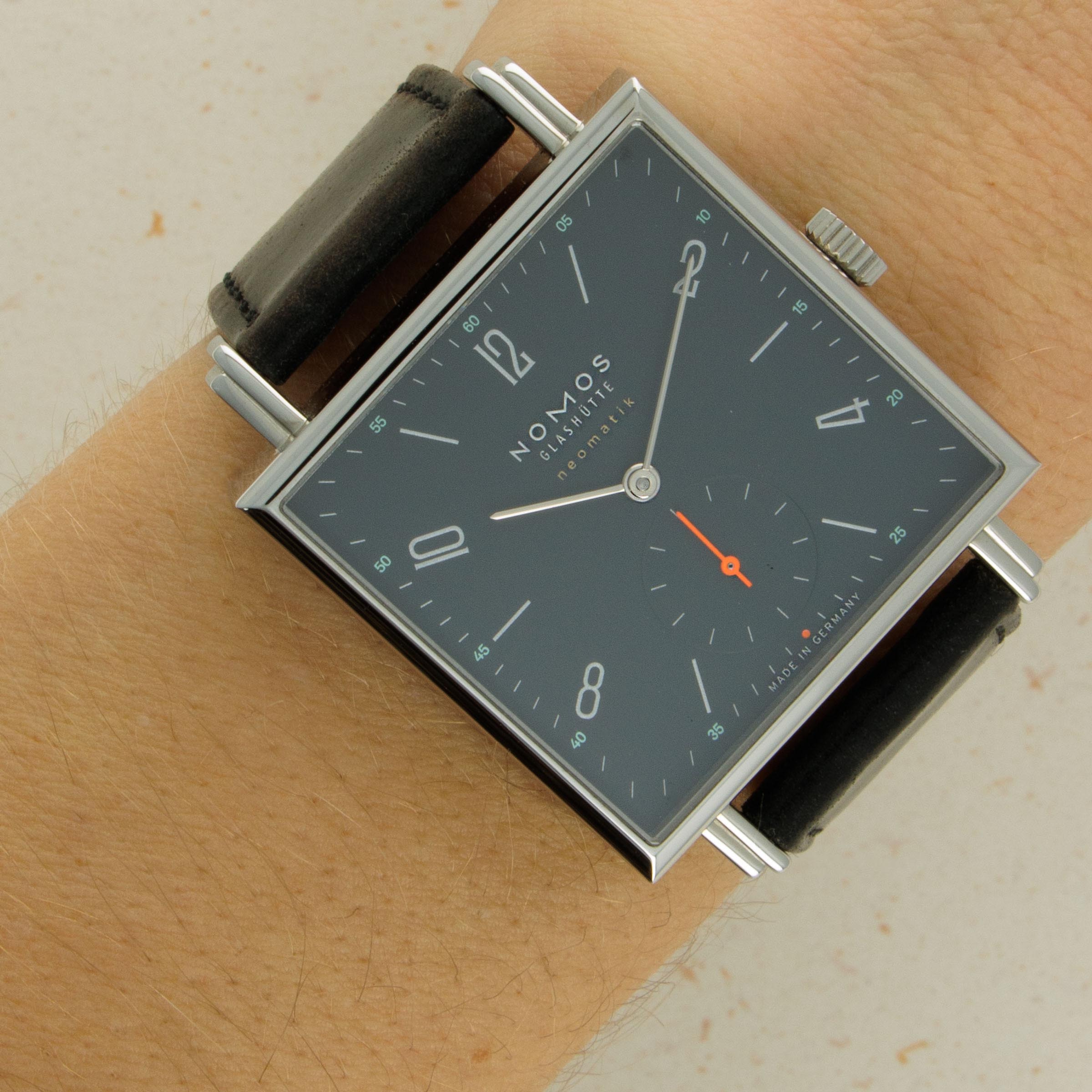 Founded in 1990 following the collapse of the Berlin wall, like a handful of other German watchmakers, Nomos Glashutte has quickly grown into one of the most highly respected watchmakers in the world thanks to their exceptional value for money, eye for detail and steadfast dedication to the Bauhaus school of design. Combining all of those tenets into one watch, like so many of their other models, is the Tetra Neomatik 39 that we have here. Made of stainless steel and boasting a perfectly square case, the Tetra Neomatik 39’s diameter is instead 33mm, making it far more wearable than its name suggests. Just 7.3mm tall thanks to its cal. DUW 3001 movement, the Tetra Neomatik 39 emphasises everything Nomos is about, with its understated midnight blue dial lacking any exuberant details that could otherwise detract from its ability to tell the time. Featuring a single flourish thanks to its bright orange running seconds hand, the Tetra Neomatik 39 is a carefully crafted watch whose understated looks deceive the lengthy design process that goes into making a watch appear so effortless.