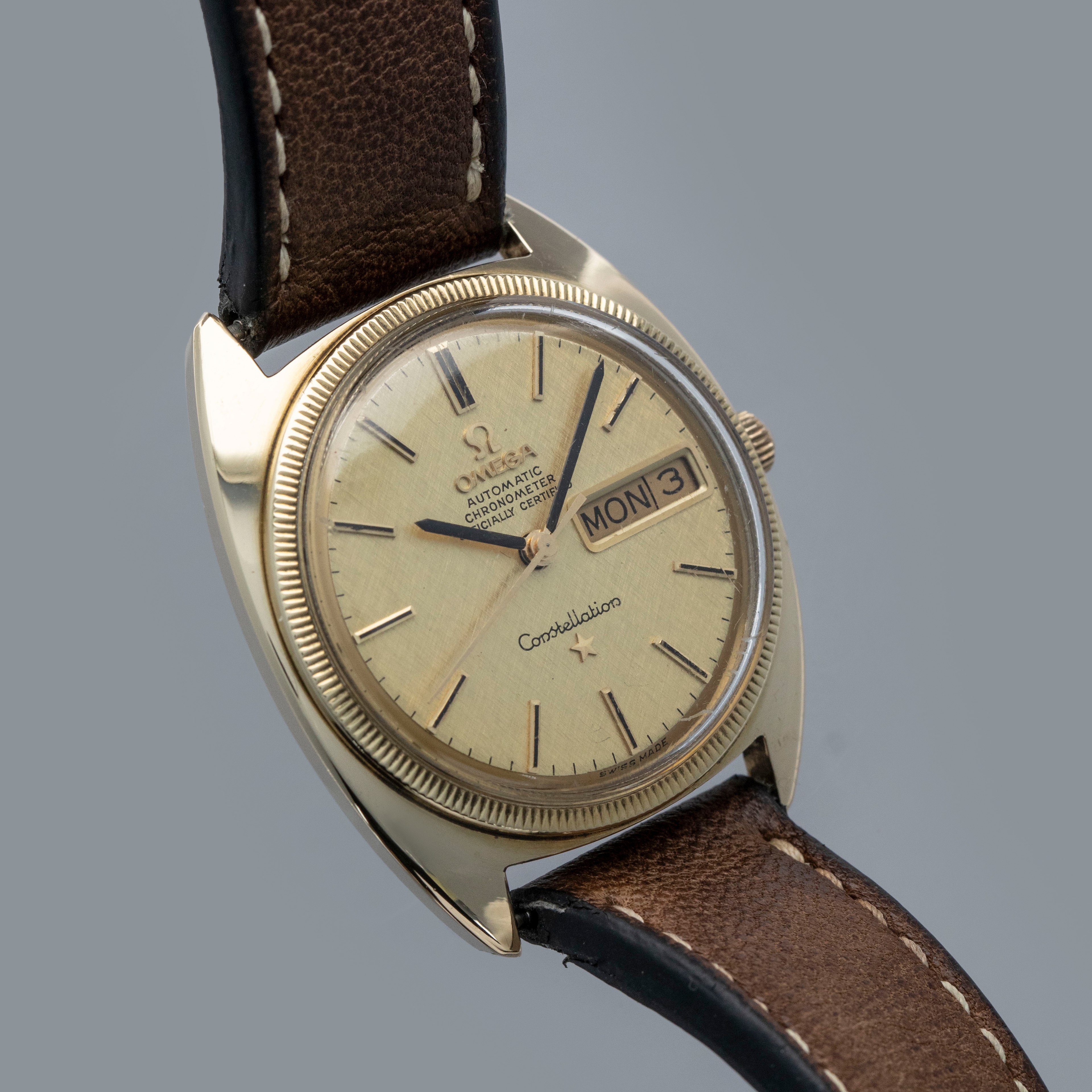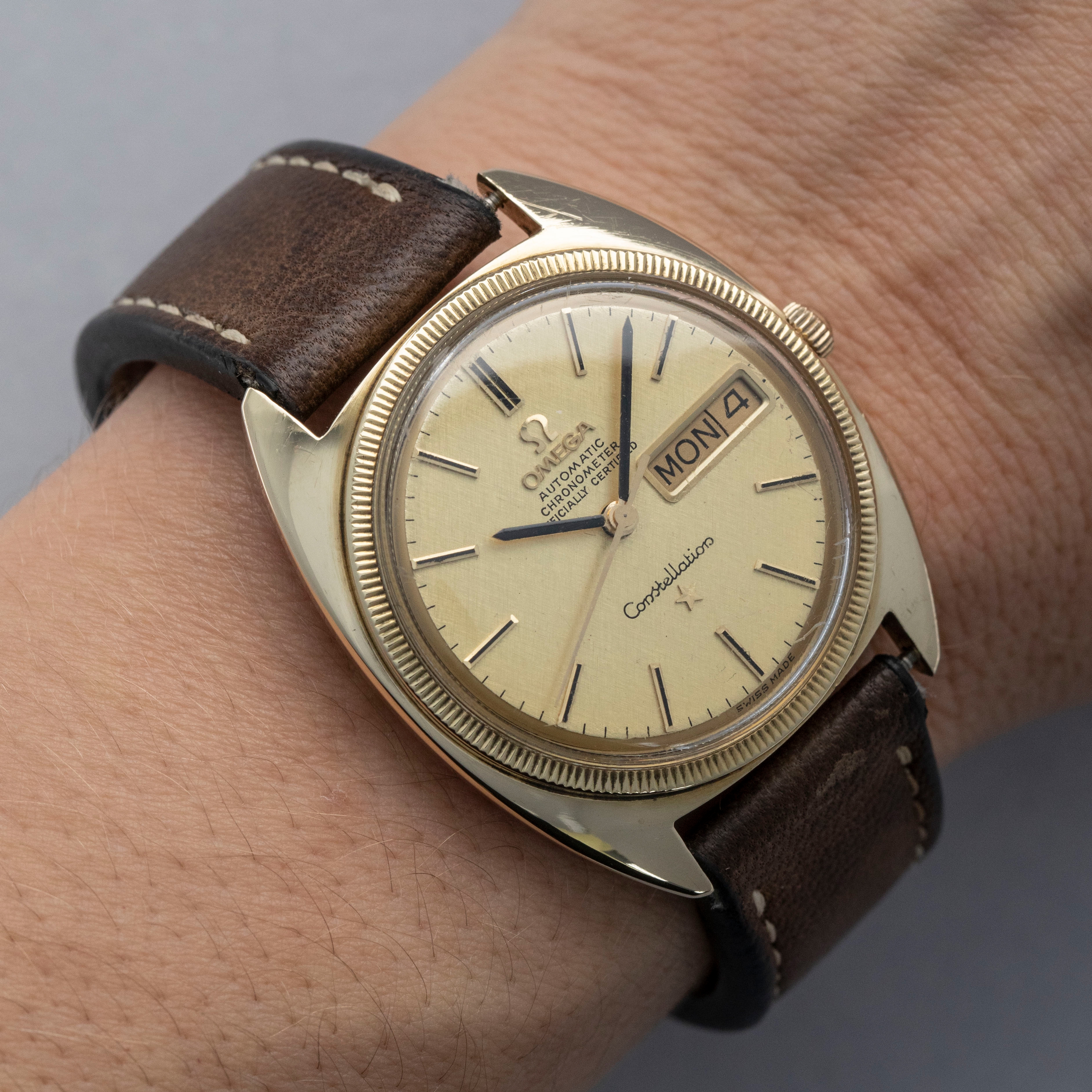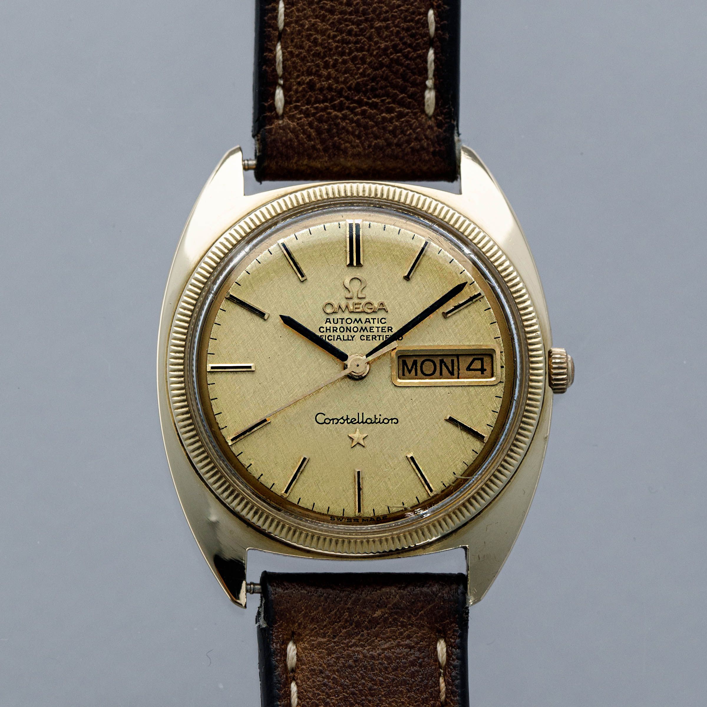 Released in 1948 to celebrate Omega's 100th anniversary, the Omega Constellation has evolved from a flagship model to a relatively obscure offering in its modern context. Put forth initially as the limited production "Centenary Chronometer," it saw so much demand that in 1952 Omega decided to keep producing the watch and name it the Constellation. During the 1950s and 1960s, a gold Constellation was seen as an equal to the Rolex Day-Date due to their similar expense. Constellations were chronometer certified and were thus prized by their owners as not only being prestigious due to their 18kt gold construction but their high-precision movements. Powered by automatic movements, the Constellation was typically powered by a bumper movement whereby its oscillation weight would bump from side to side, rather than all the way around the movement like an ordinary automatic movement. While the Constellation has undergone several changes over the decades, examples from the 1950s and ‘60s, like this one here, are what collectors seek out. Offered here we have a Constellation Day-Date ref. 168.029 that features a stunning champagne dial. With applied blackened hour markers and blackened hands, this example is presented in wonderful condition across its 14kt yellow gold C-Type case, which is famed for its tonneau shape and curvy profile.