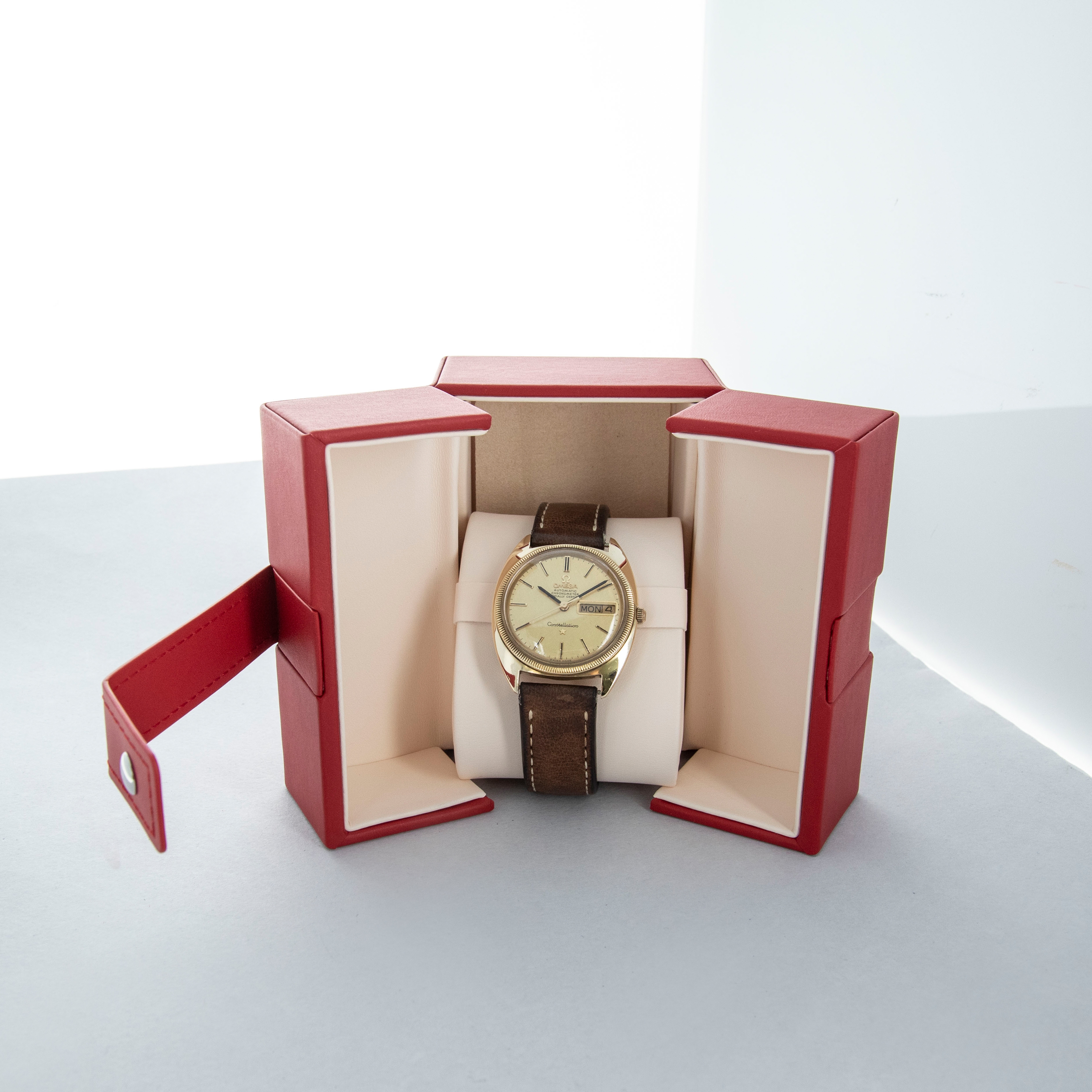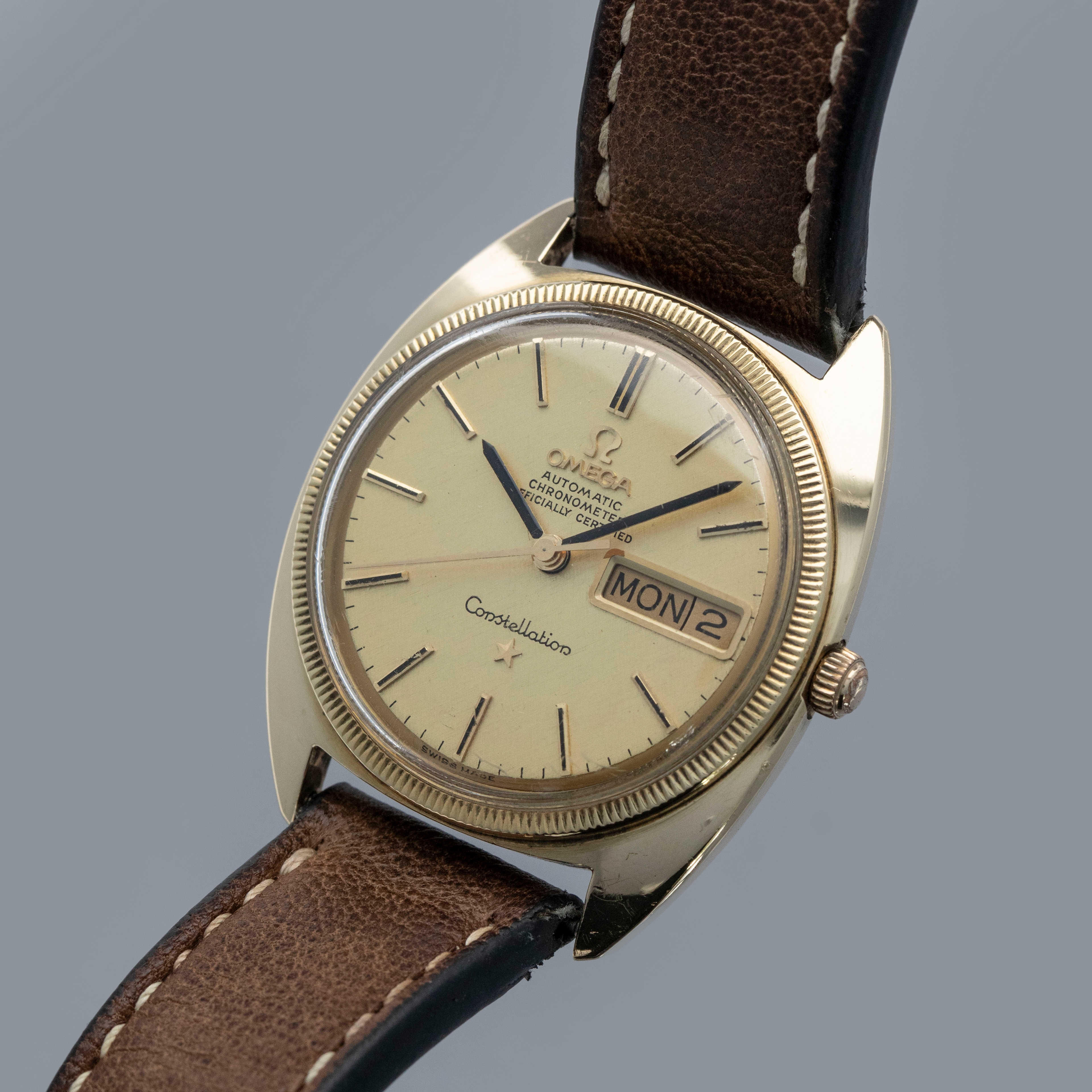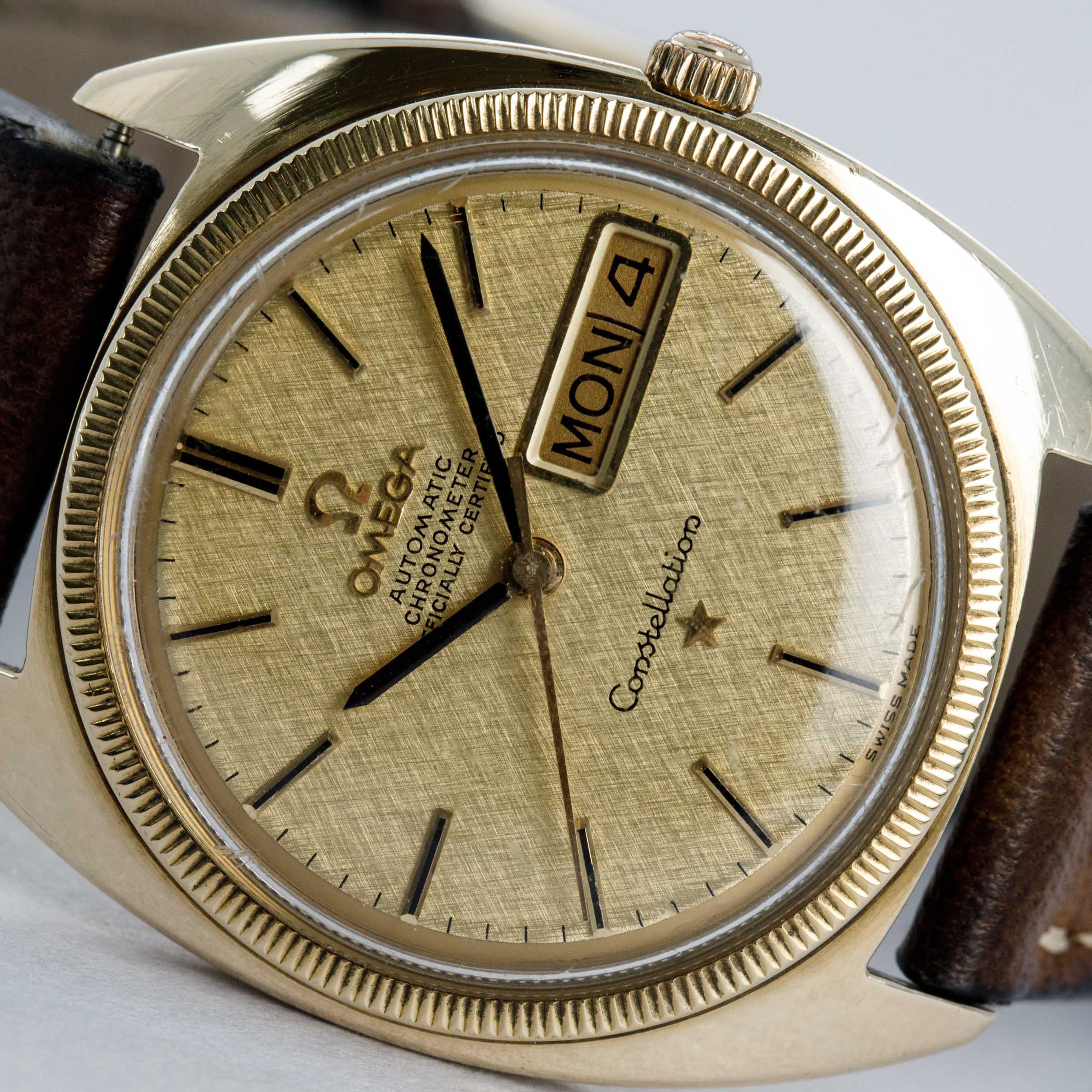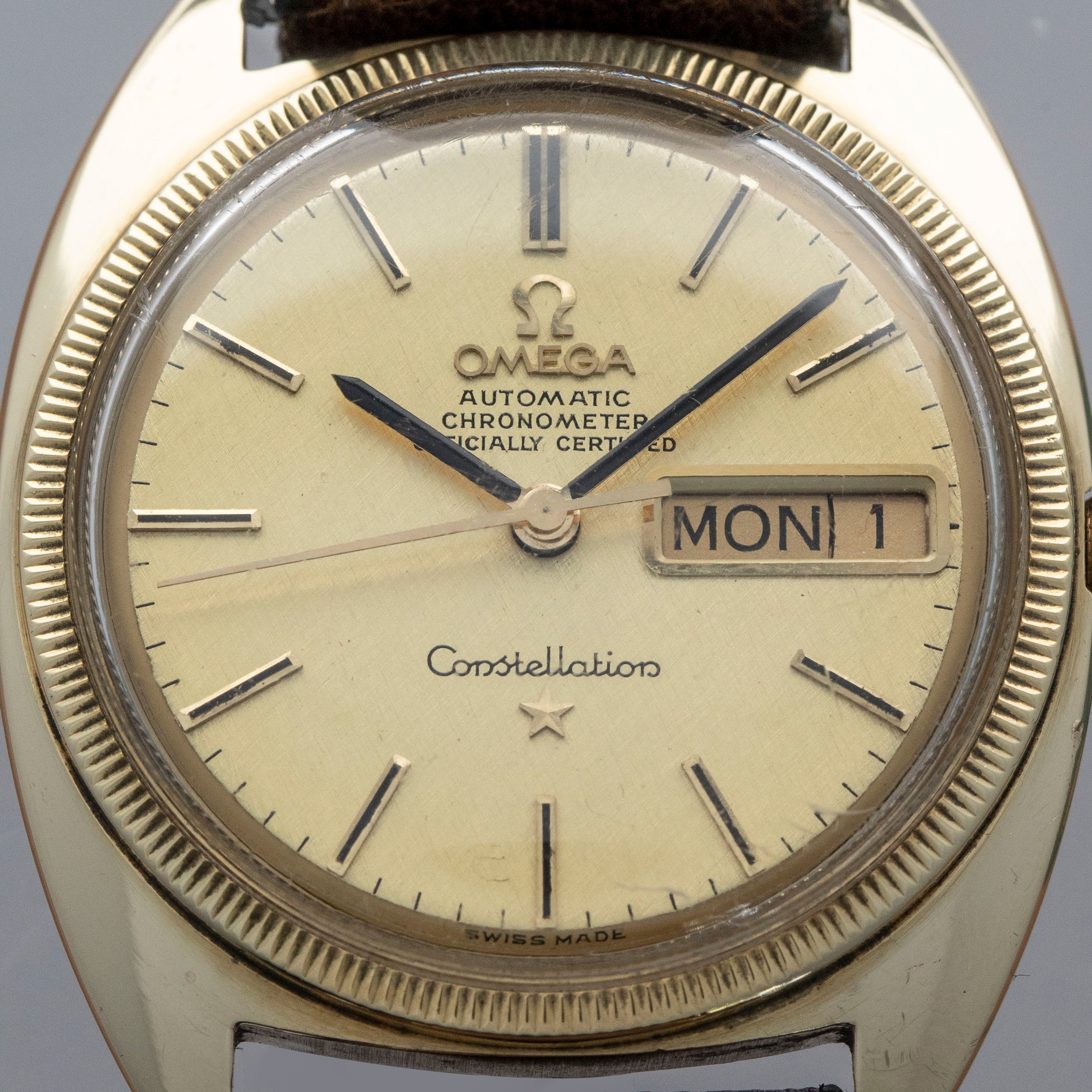 Released in 1948 to celebrate Omega's 100th anniversary, the Omega Constellation has evolved from a flagship model to a relatively obscure offering in its modern context. Put forth initially as the limited production "Centenary Chronometer," it saw so much demand that in 1952 Omega decided to keep producing the watch and name it the Constellation. During the 1950s and 1960s, a gold Constellation was seen as an equal to the Rolex Day-Date due to their similar expense. Constellations were chronometer certified and were thus prized by their owners as not only being prestigious due to their 18kt gold construction but their high-precision movements. Powered by automatic movements, the Constellation was typically powered by a bumper movement whereby its oscillation weight would bump from side to side, rather than all the way around the movement like an ordinary automatic movement. While the Constellation has undergone several changes over the decades, examples from the 1950s and ‘60s, like this one here, are what collectors seek out. Offered here we have a Constellation Day-Date ref. 168.029 that features a stunning champagne dial. With applied blackened hour markers and blackened hands, this example is presented in wonderful condition across its 14kt yellow gold C-Type case, which is famed for its tonneau shape and curvy profile.