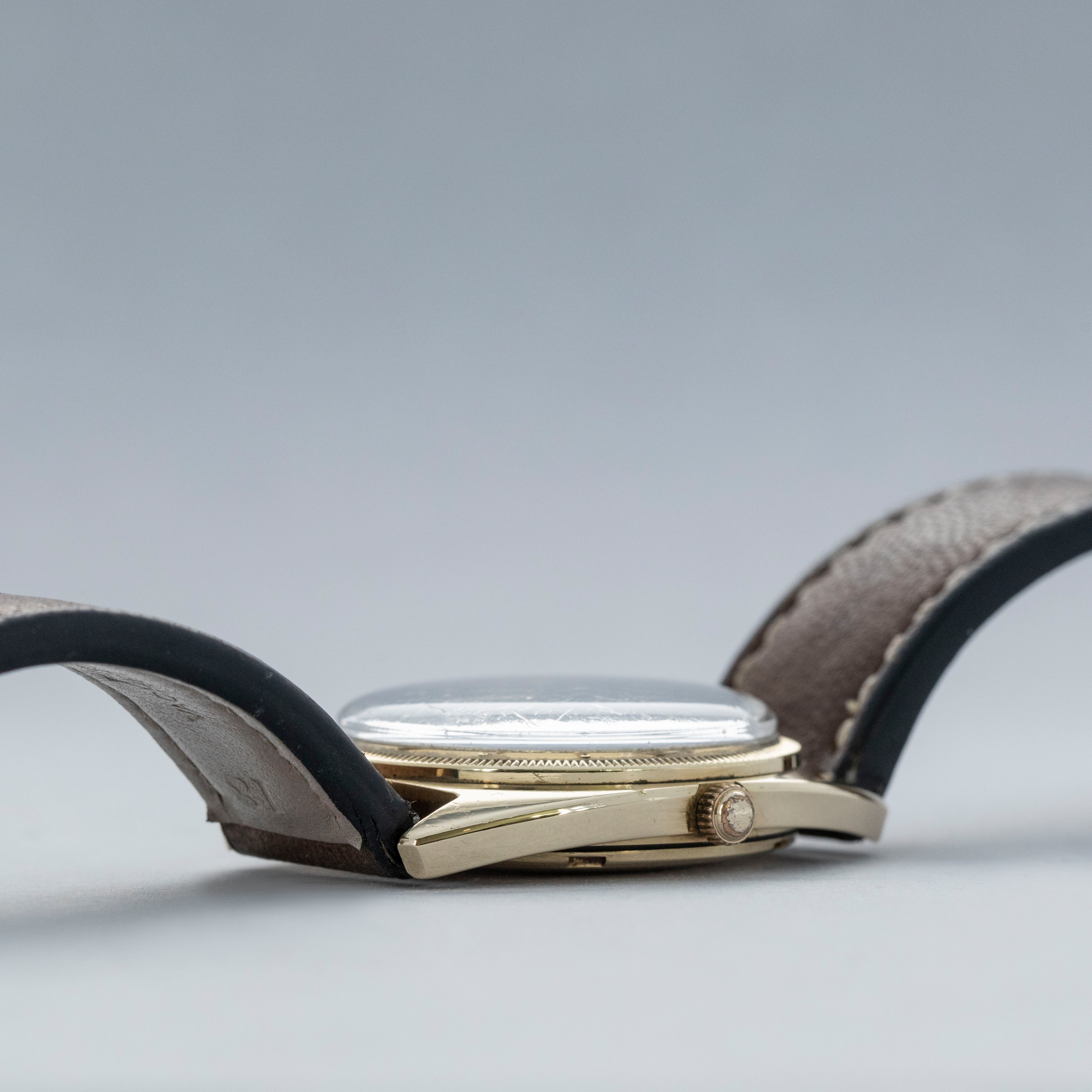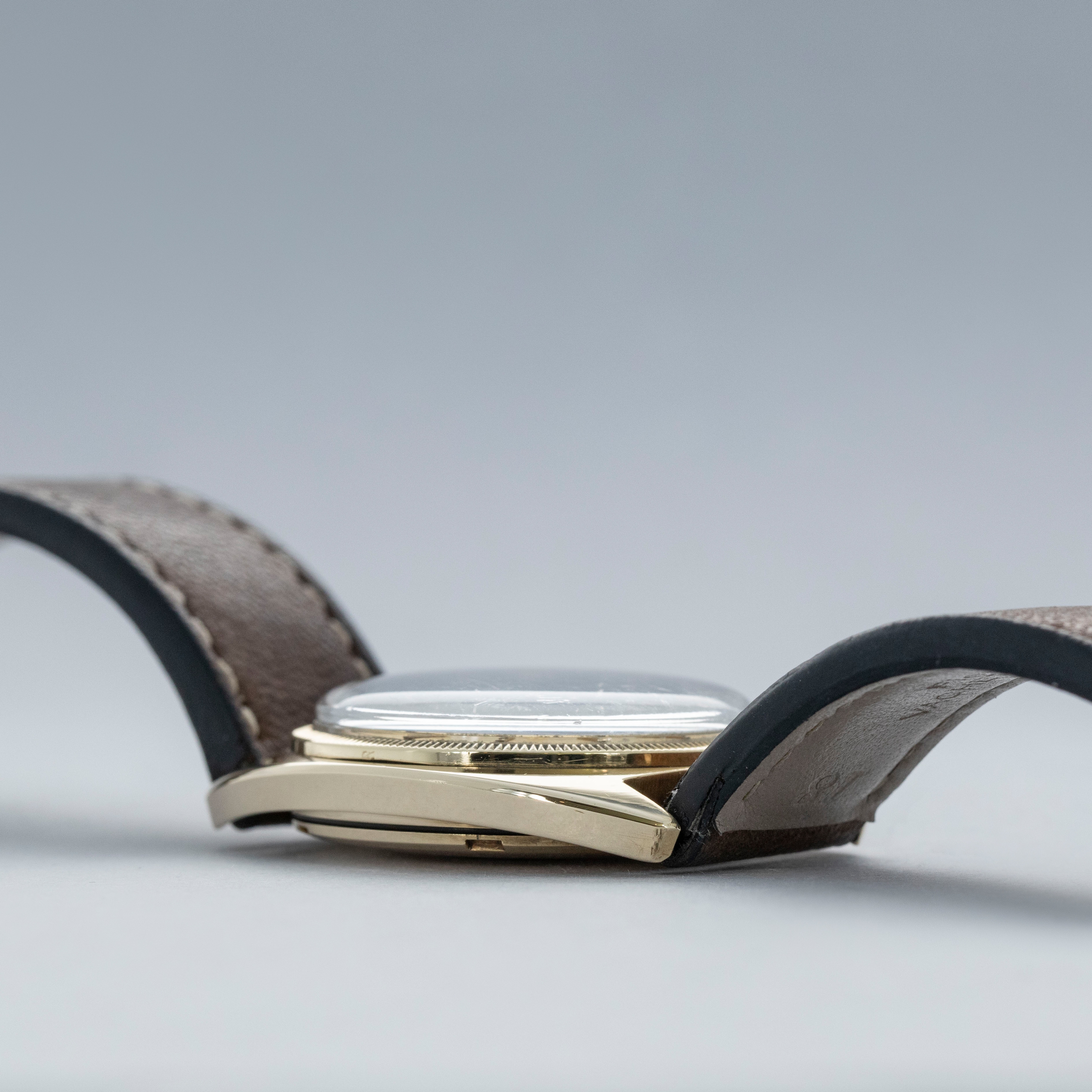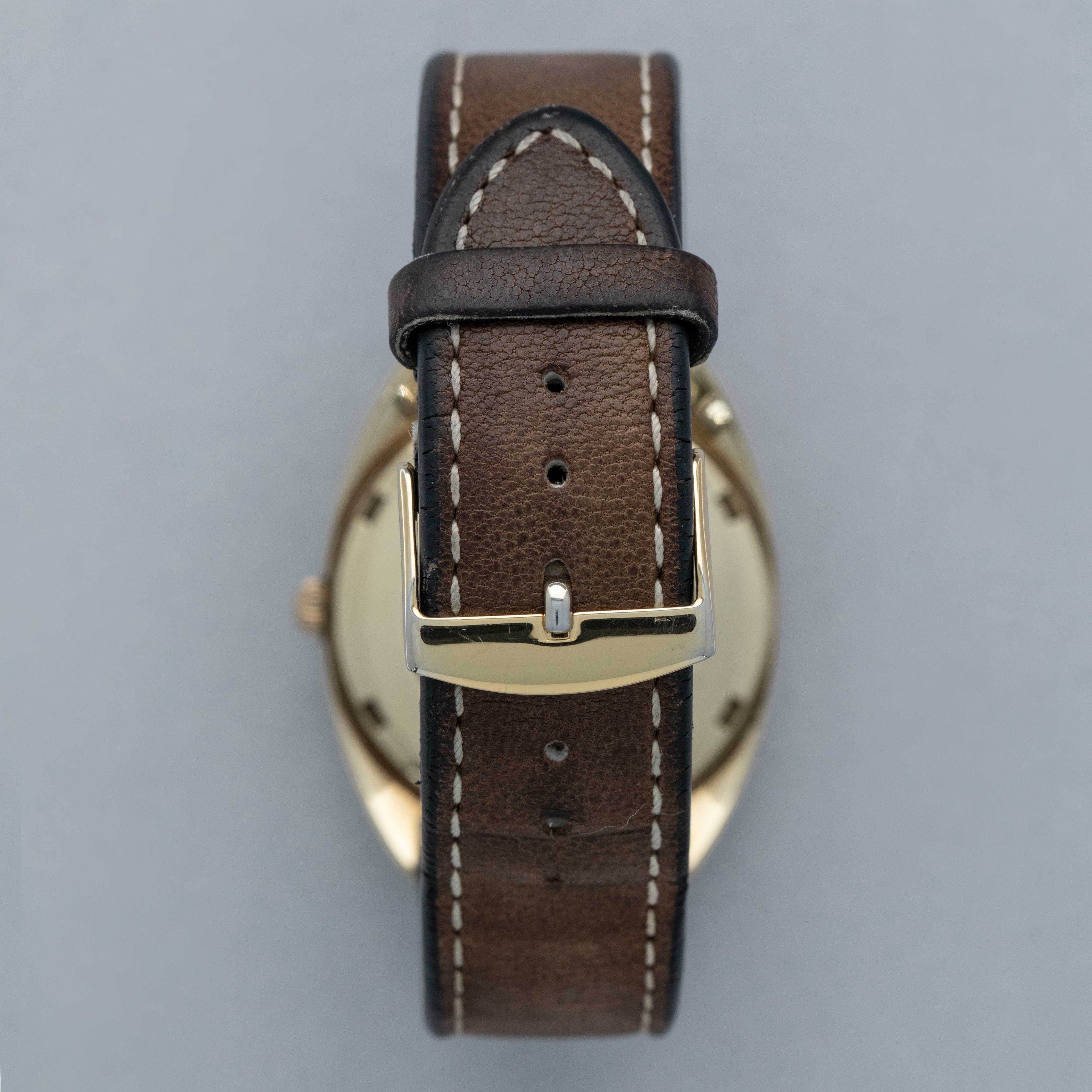 Watch is in overall excellent condition. The yellow gold case and case back show surface scratches and marks consistent with age, with a still-legible hallmark visible on the back of the upper right lug. The reeded bezel remains generally well defined, with some wear visible along the outer edge. The crystal shows a number of surface scratches and scuffs. The textured champagne dial shows light surface marks along with some spots of oxidation on several of the hour markers, while the hands remain very clean. It is fitted with a brown leather strap and a gold-plated buckle, and comes with a vintage-style box. Please note that the watch ticks at time of cataloging, but timekeeping is poor and a service is recommended.
