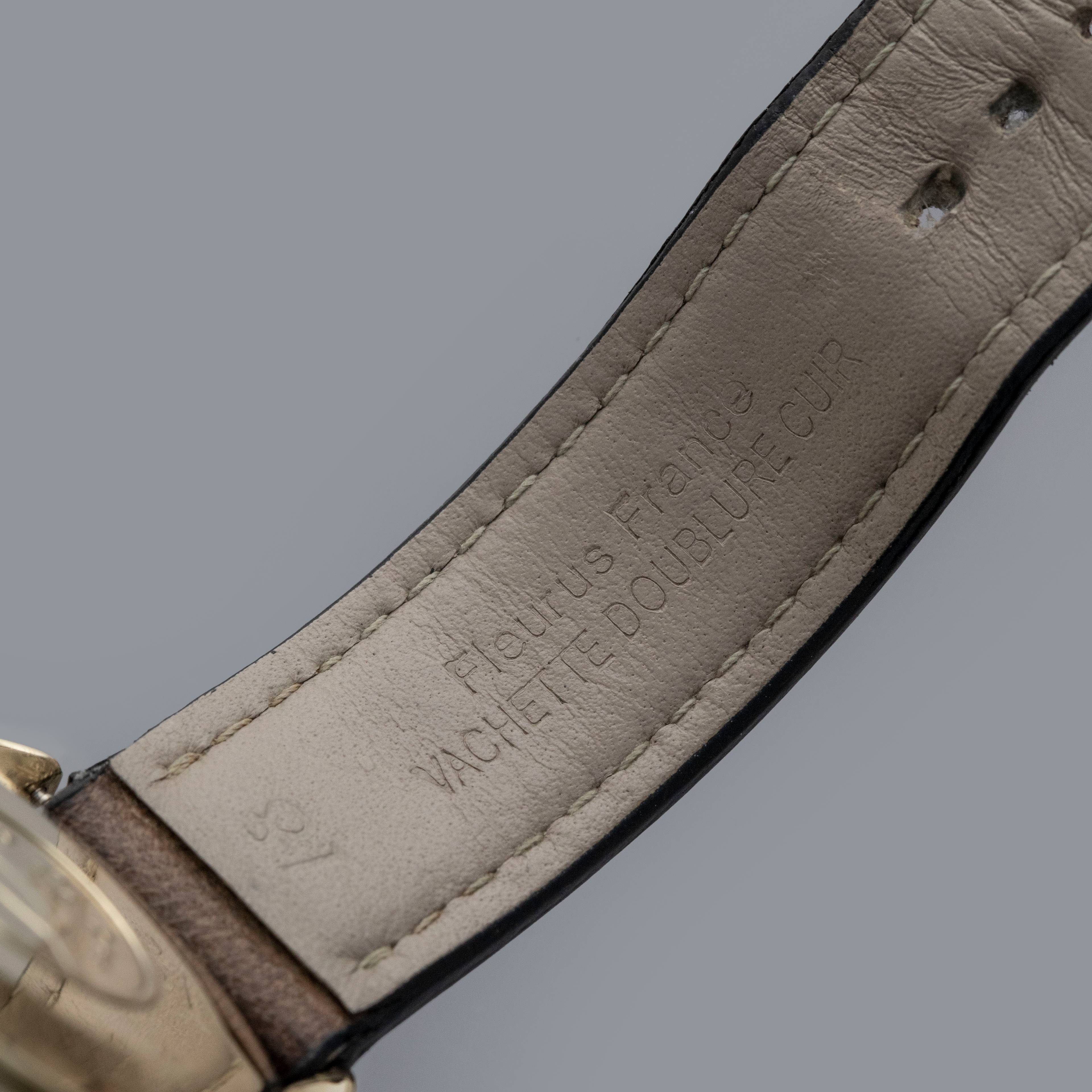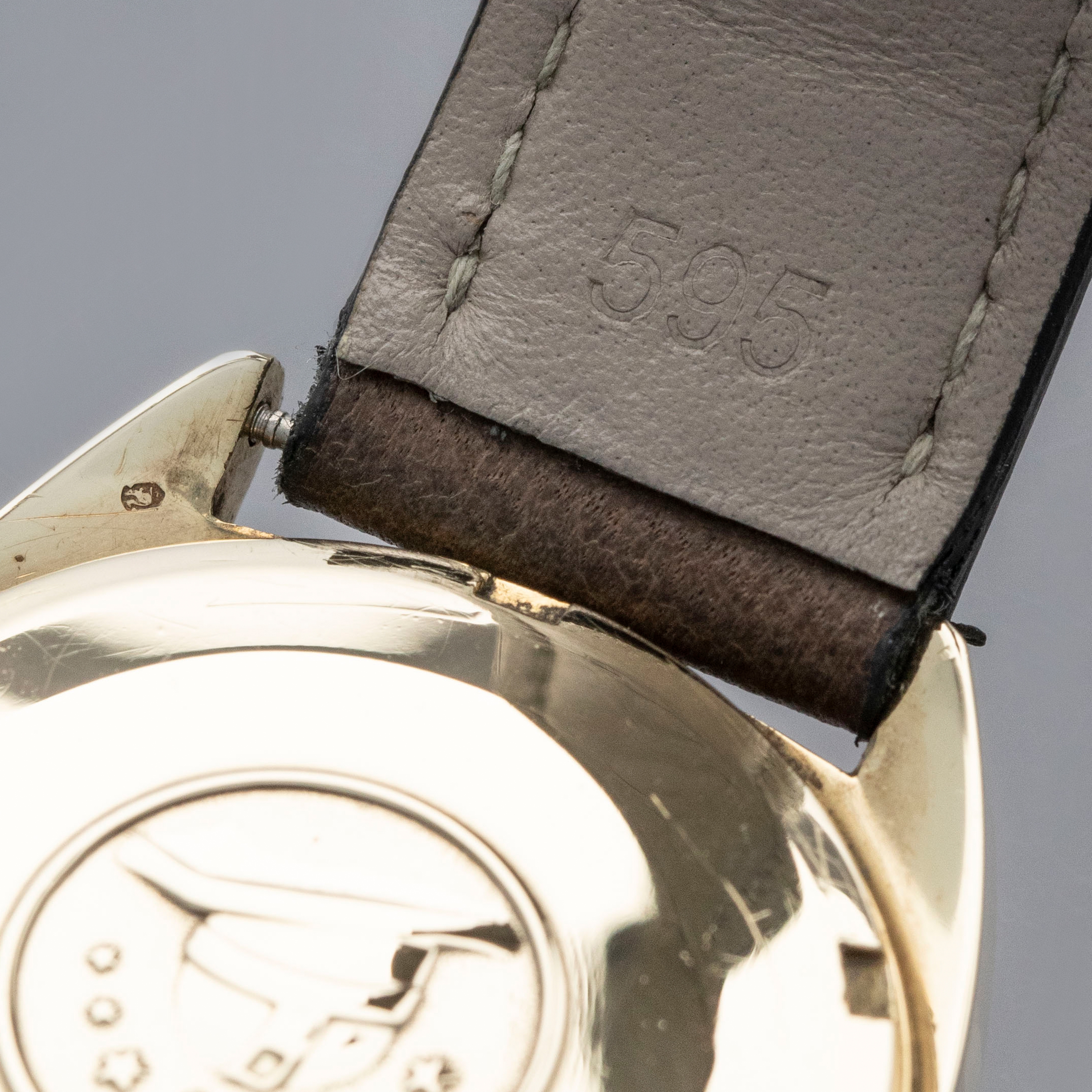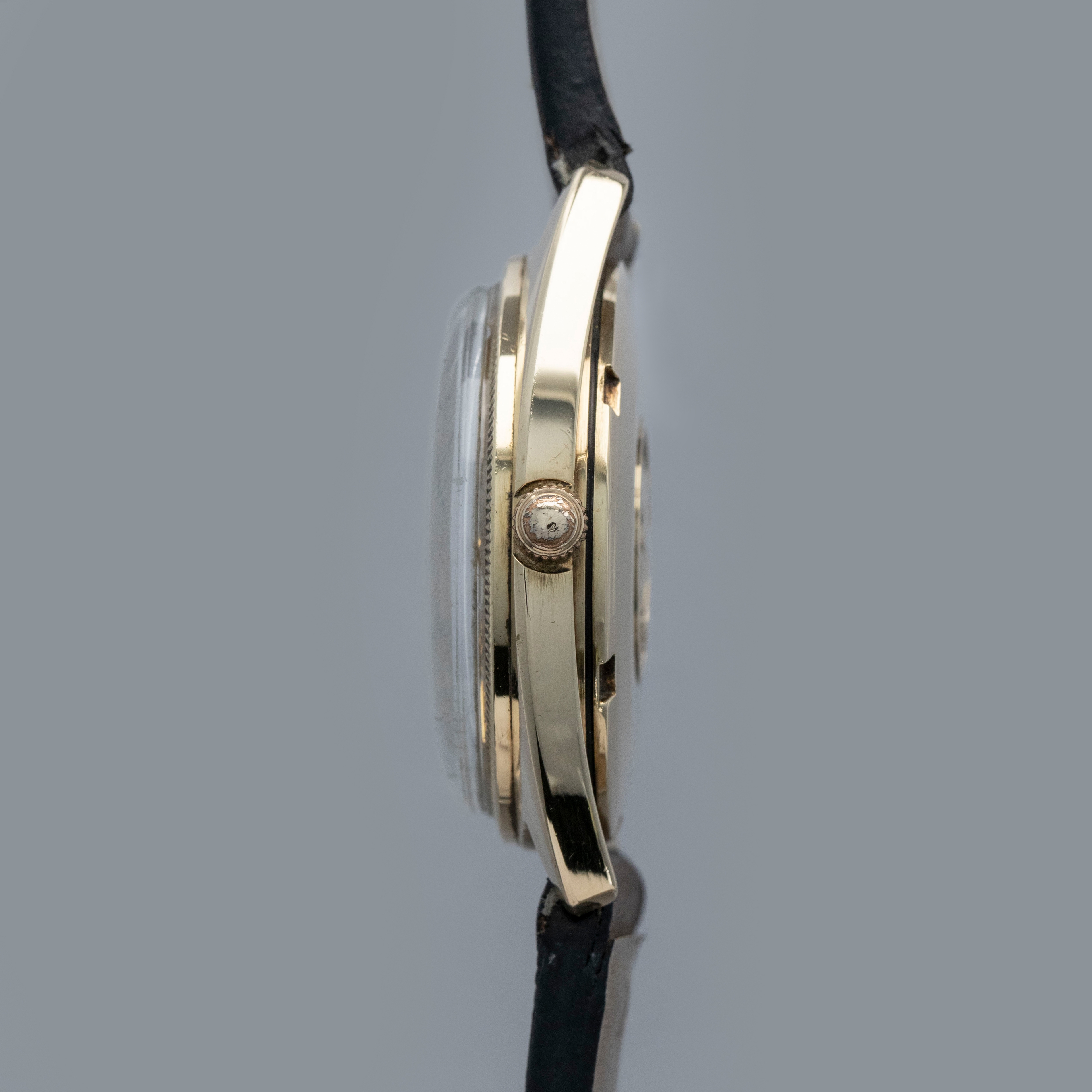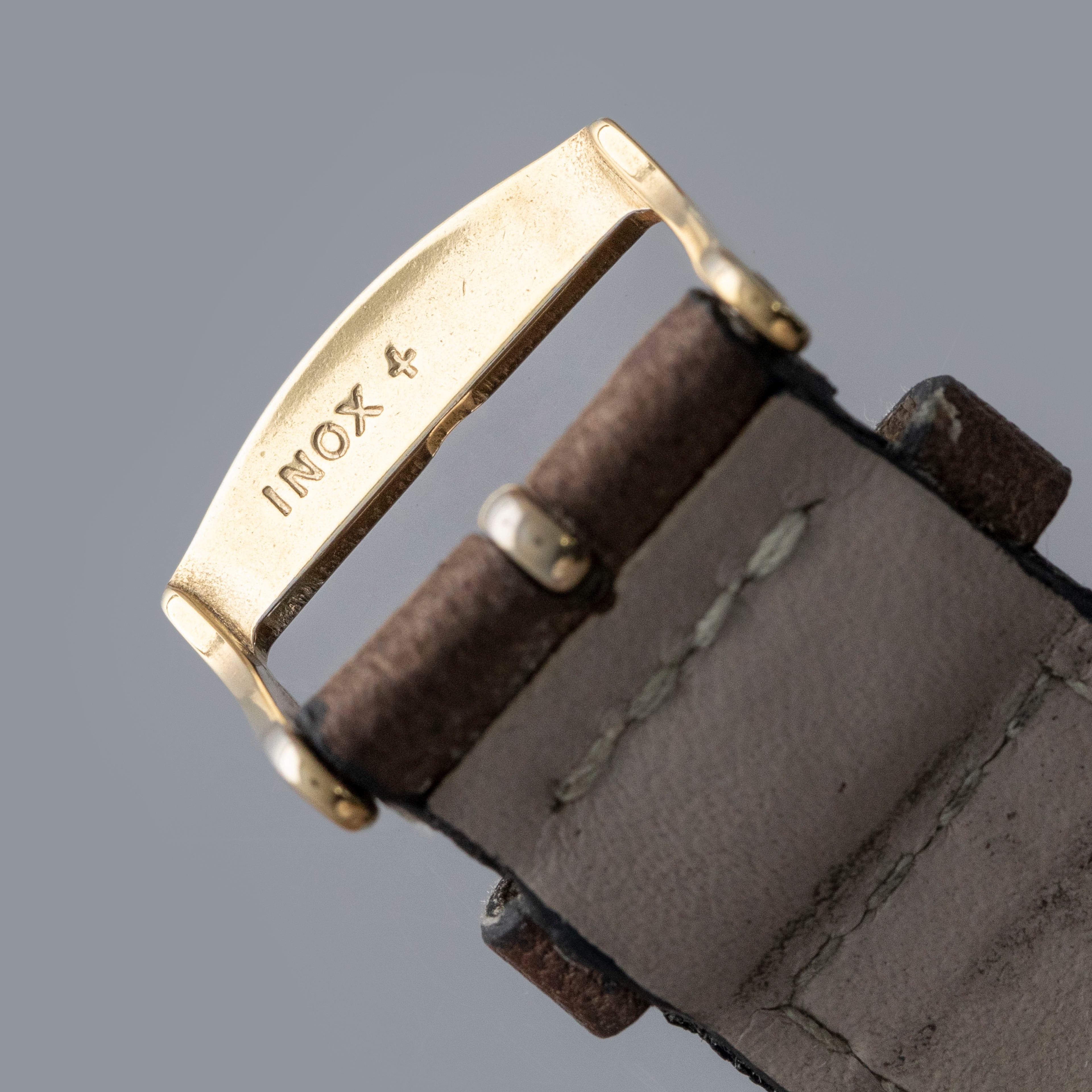 Watch is in overall excellent condition. The yellow gold case and case back show surface scratches and marks consistent with age, with a still-legible hallmark visible on the back of the upper right lug. The reeded bezel remains generally well defined, with some wear visible along the outer edge. The crystal shows a number of surface scratches and scuffs. The textured champagne dial shows light surface marks along with some spots of oxidation on several of the hour markers, while the hands remain very clean. It is fitted with a brown leather strap and a gold-plated buckle, and comes with a vintage-style box. Please note that the watch ticks at time of cataloging, but timekeeping is poor and a service is recommended.