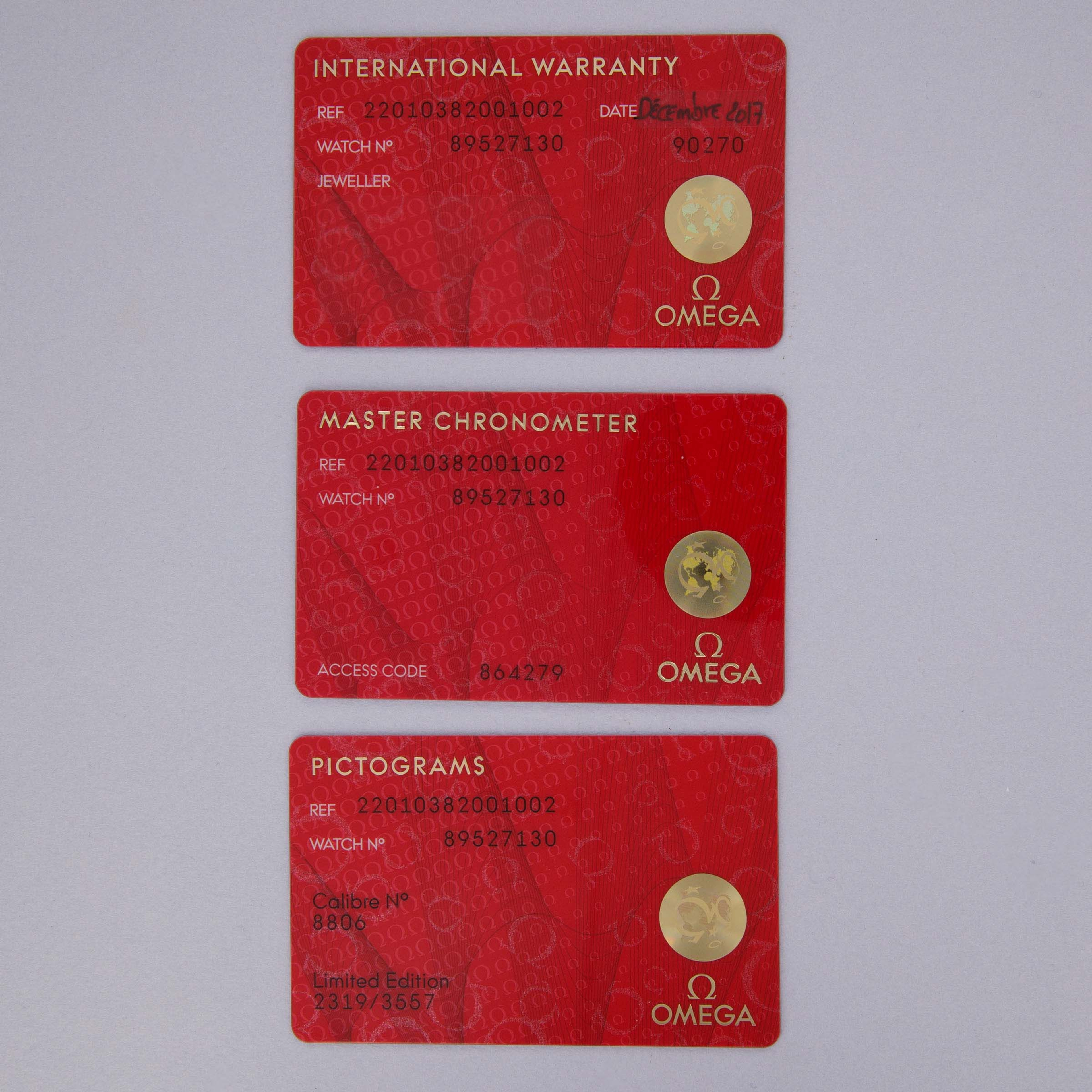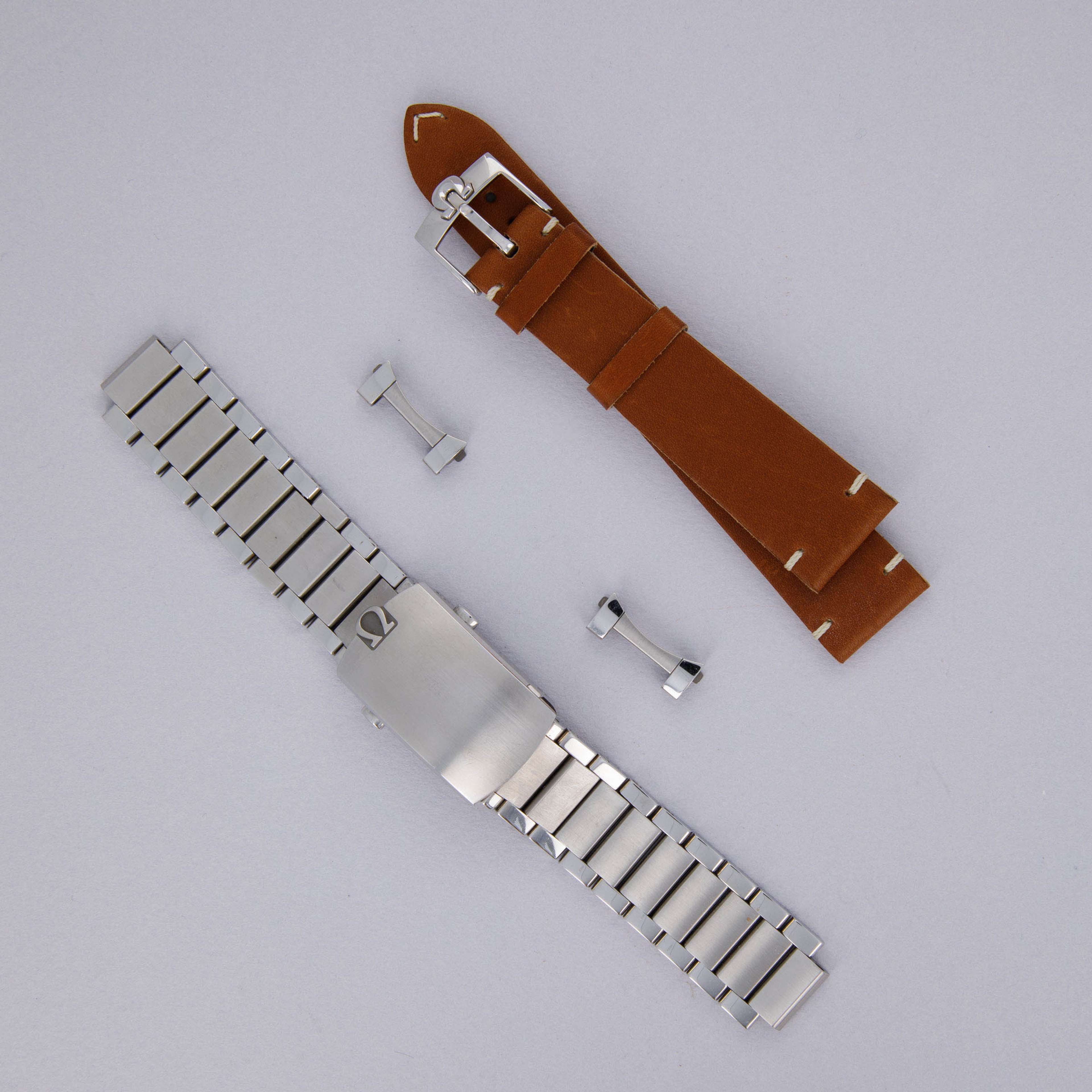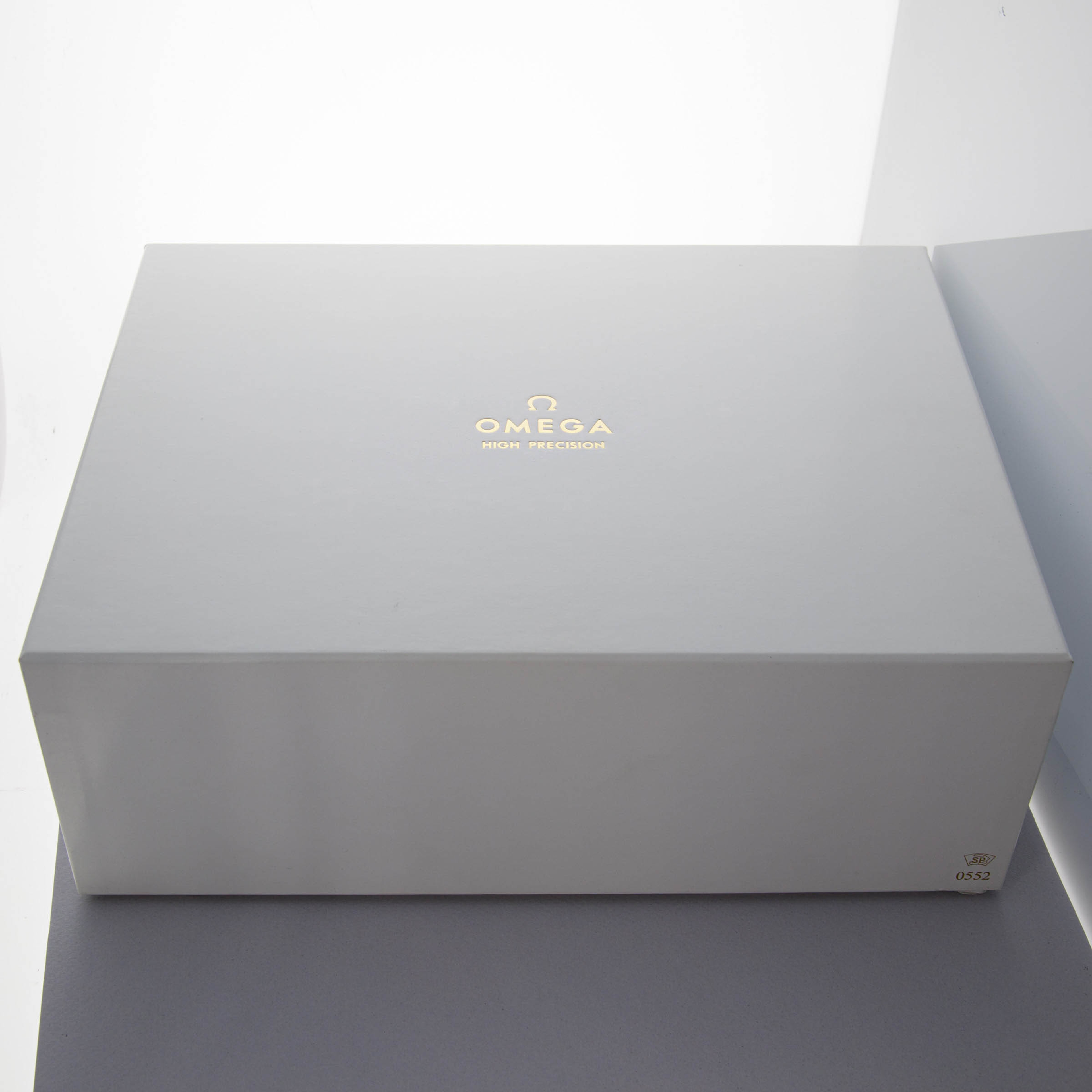 Watch, box, papers, hang tags and original Omega stainless steel bracelet and leather strap