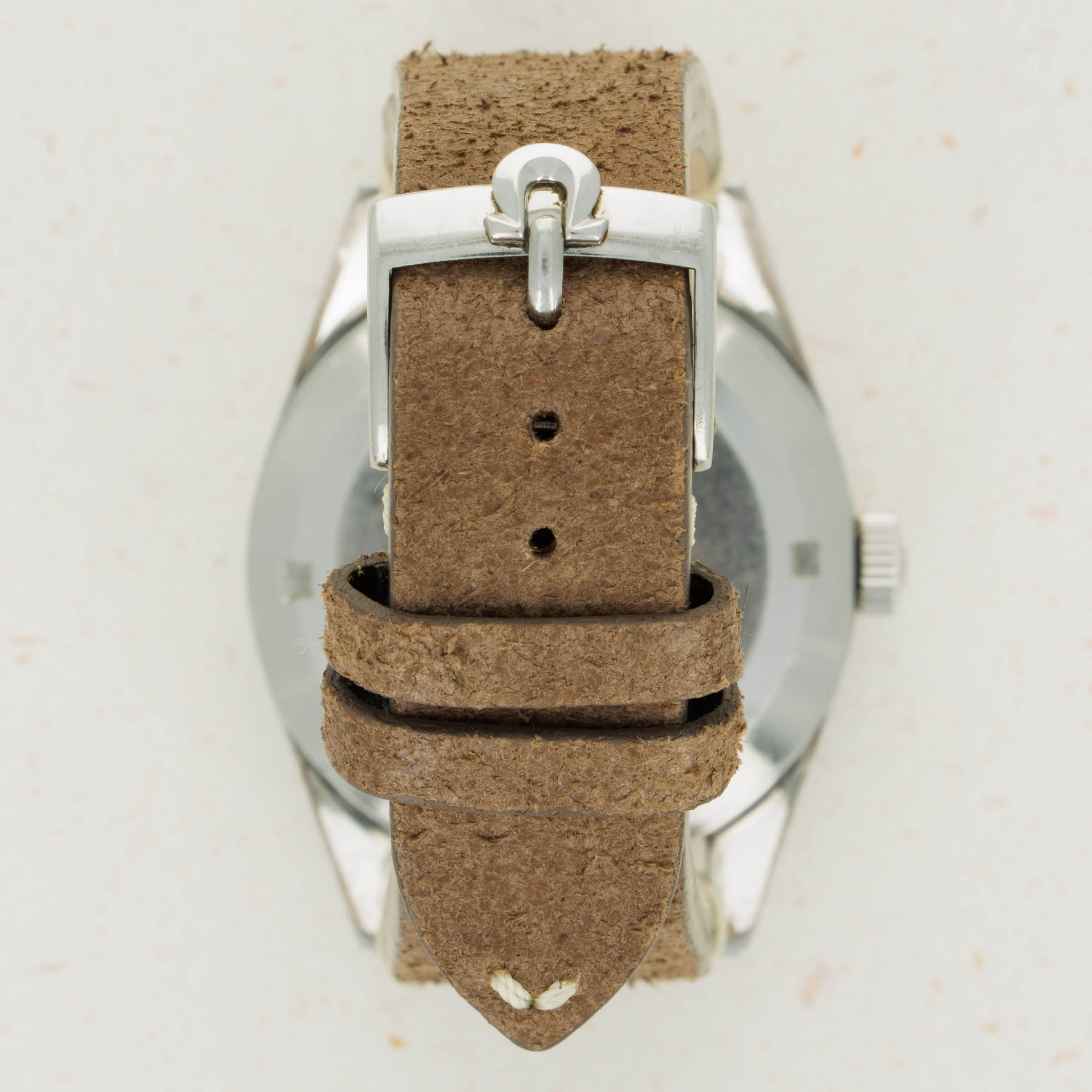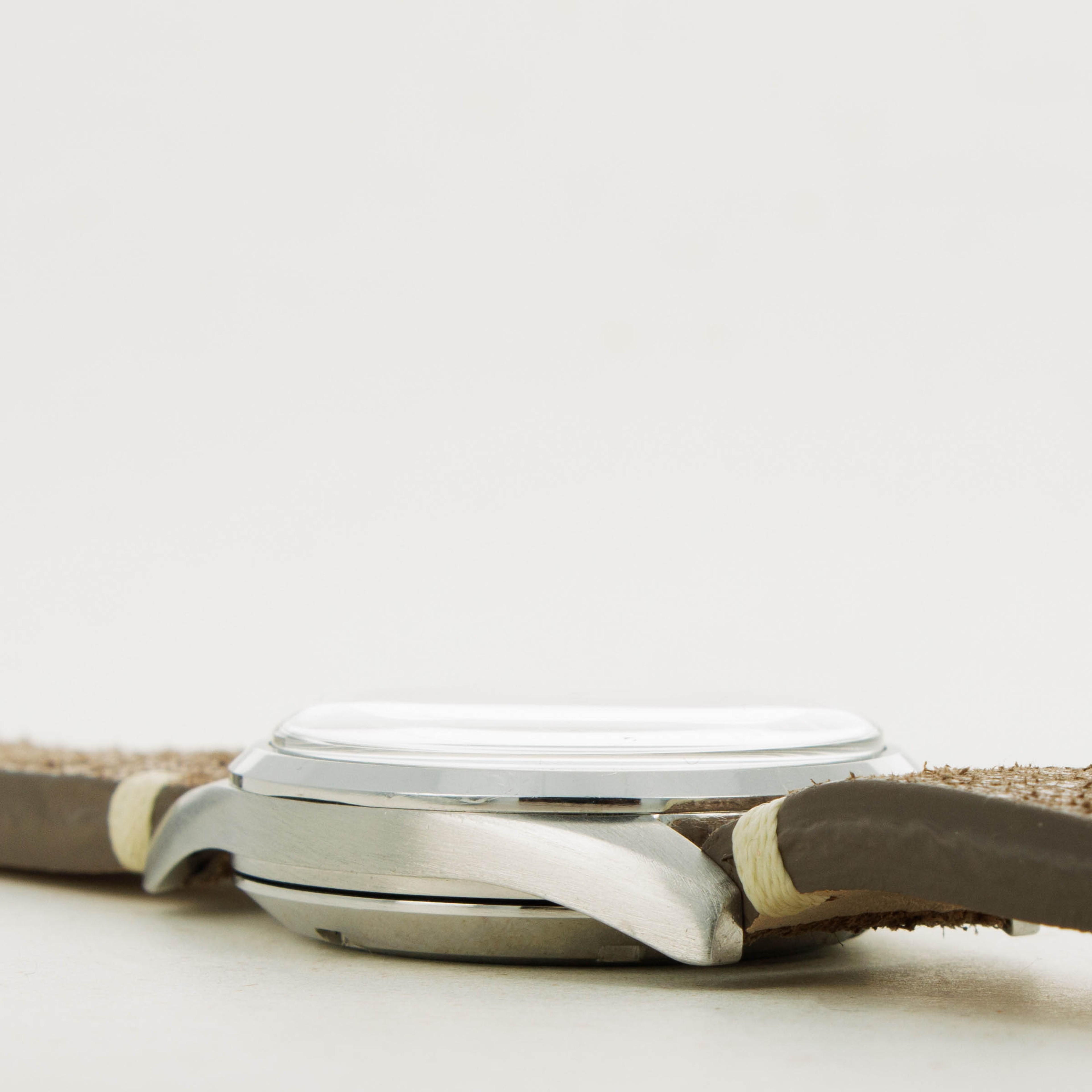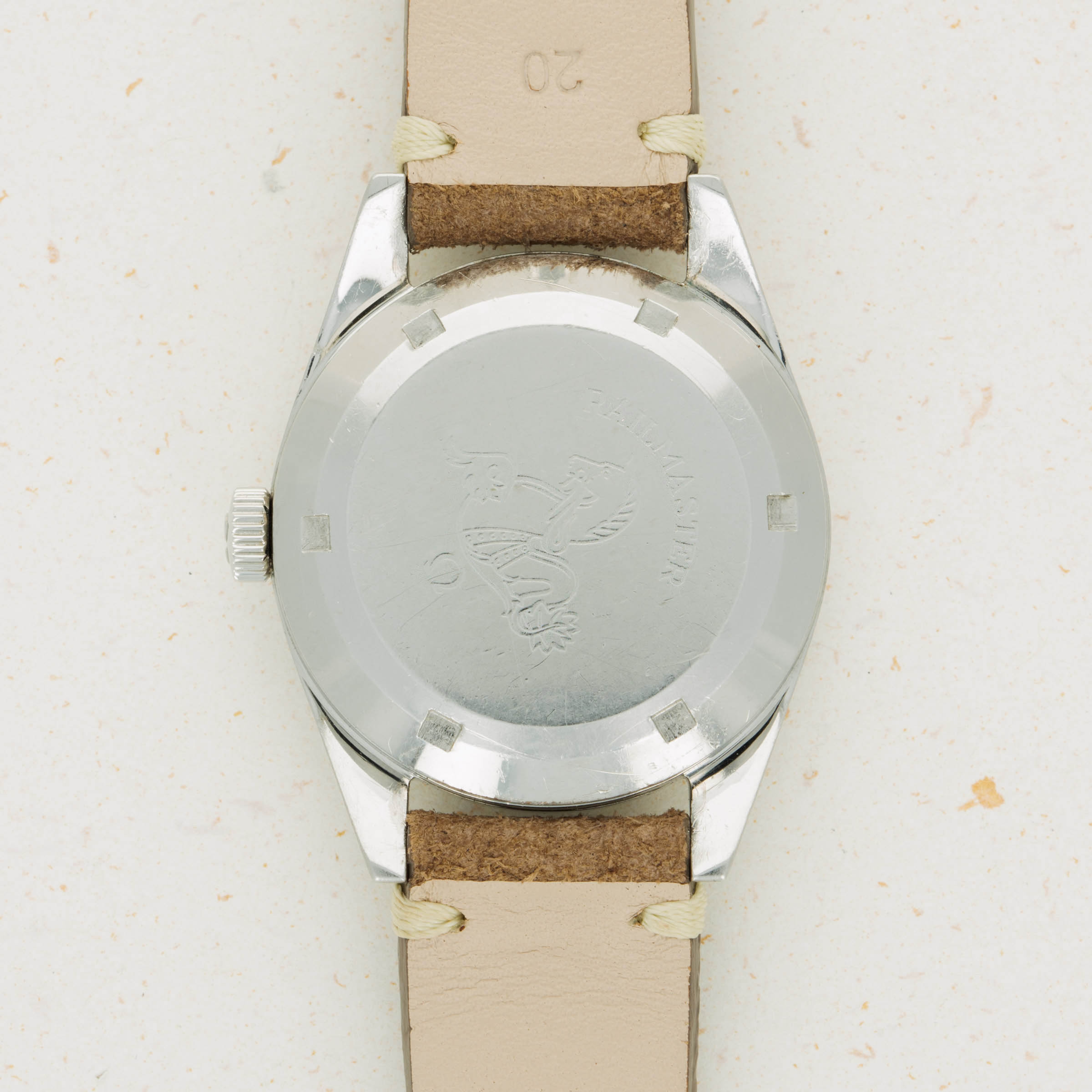 Watch is in very good original conditon overall. Case lugs show wear, consistent with it being well worn over the years. Hour and minute hand luminous appear to fluoresce slightly longer than the rest of the lume, but the tone is all consistent. Dial is in excellent condition, with a bit of a halo around the luminous indexes. Dust cap and retainer ring are included and pictured above. Watch comes with a period box and blank guarantee papers. This lot was previously sold on Loupe This on 10/29/2021.