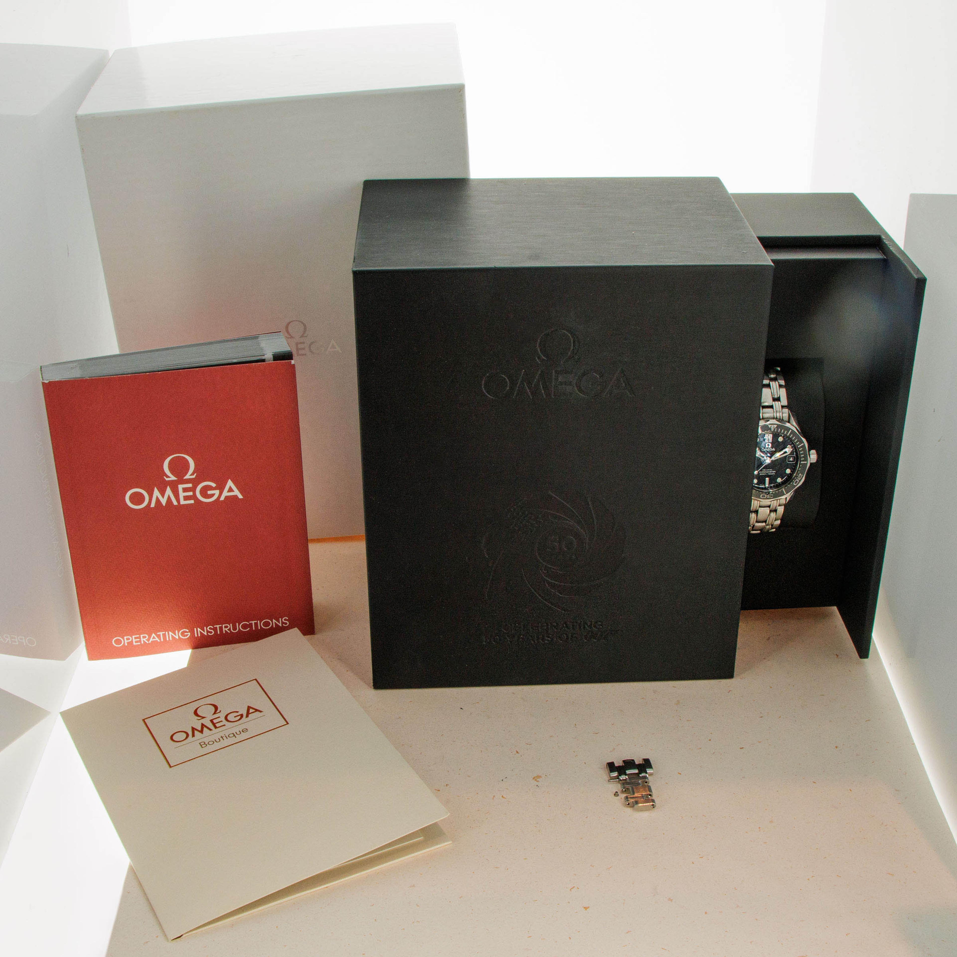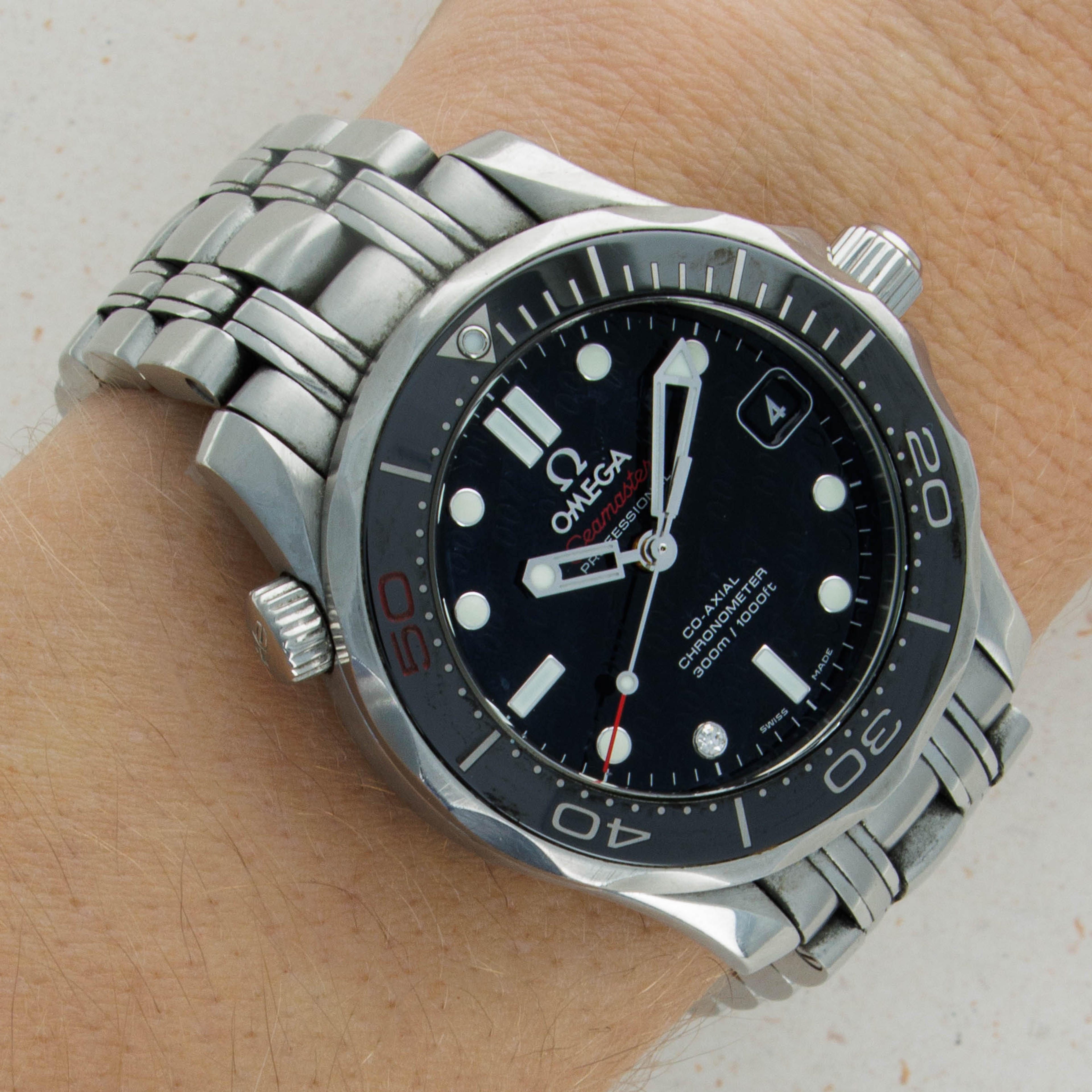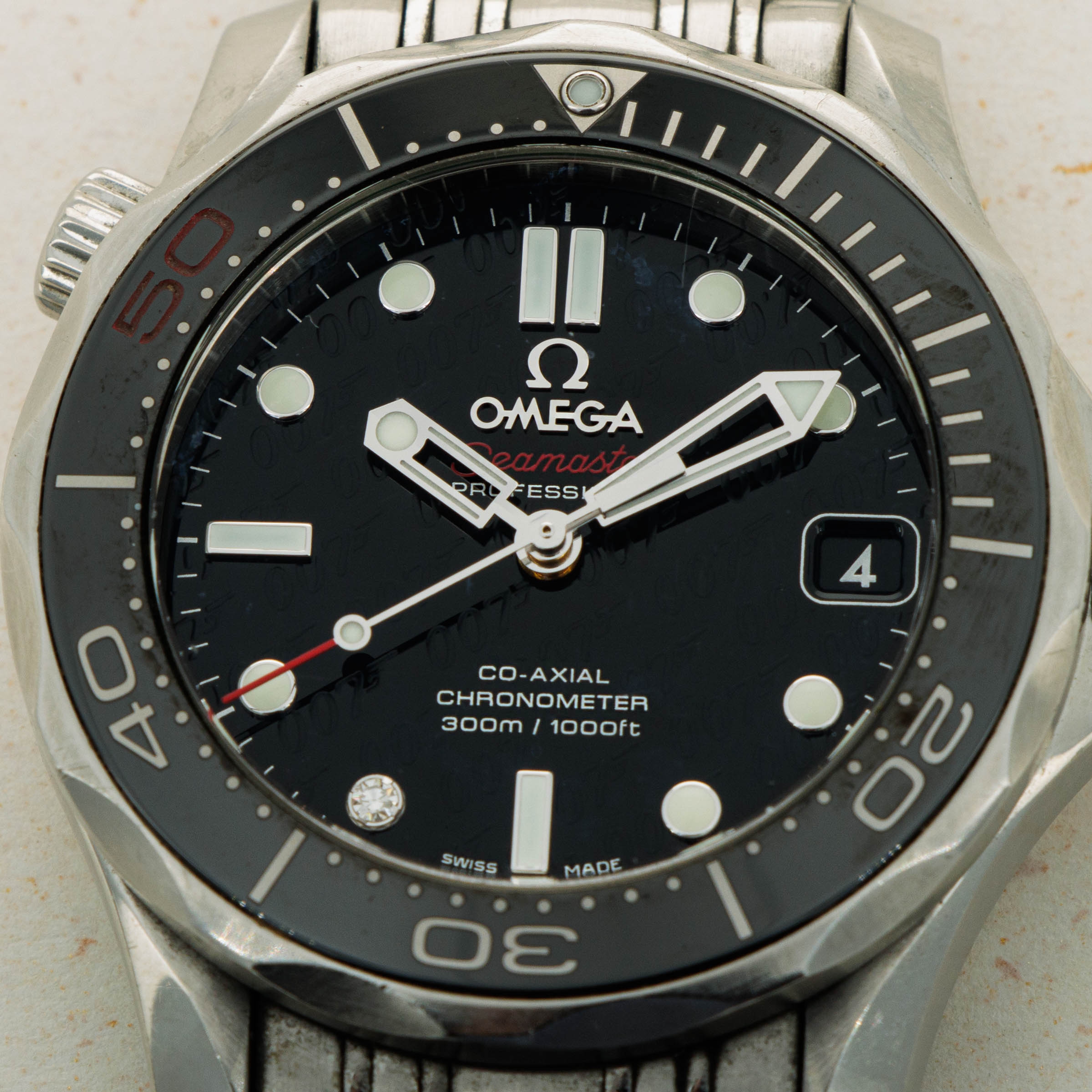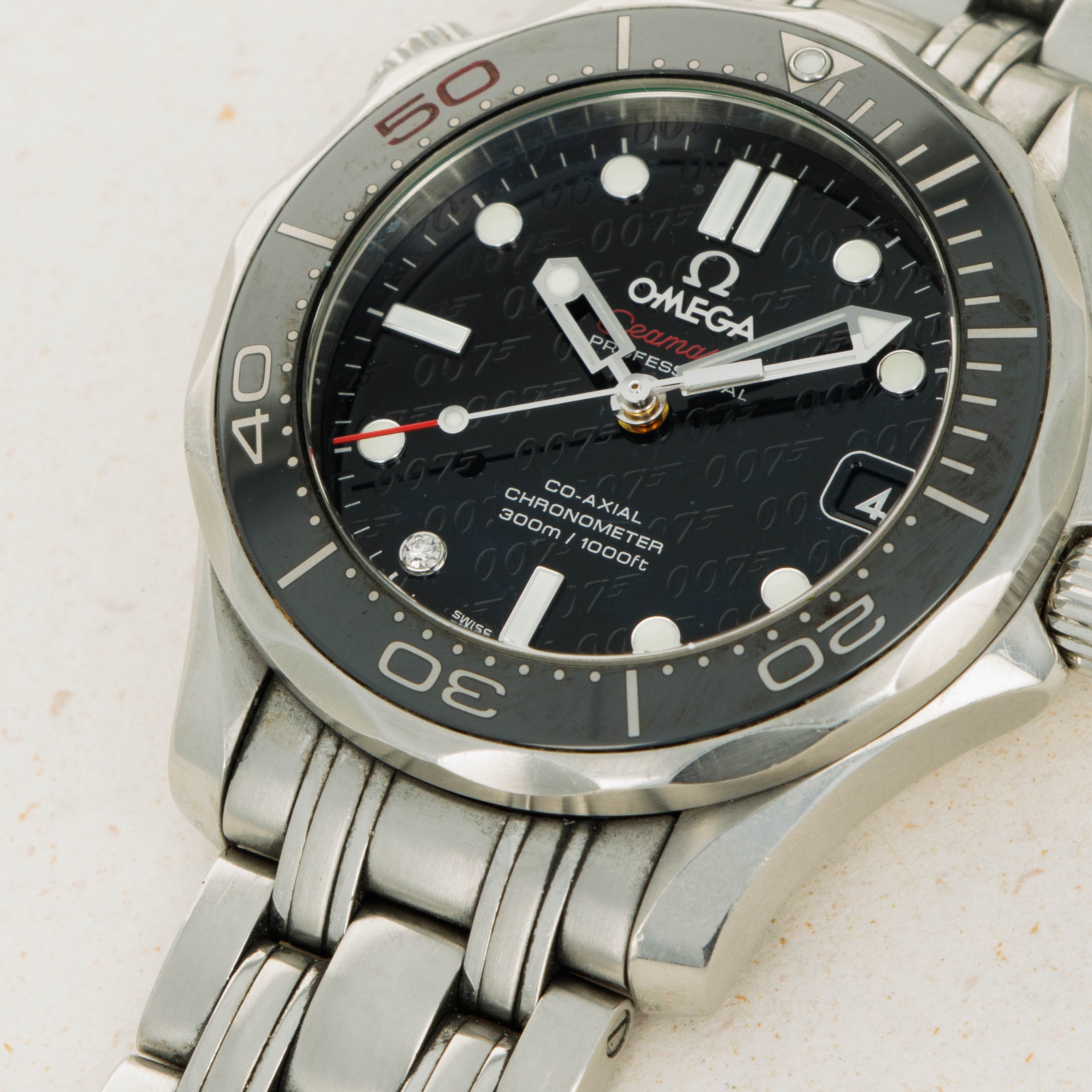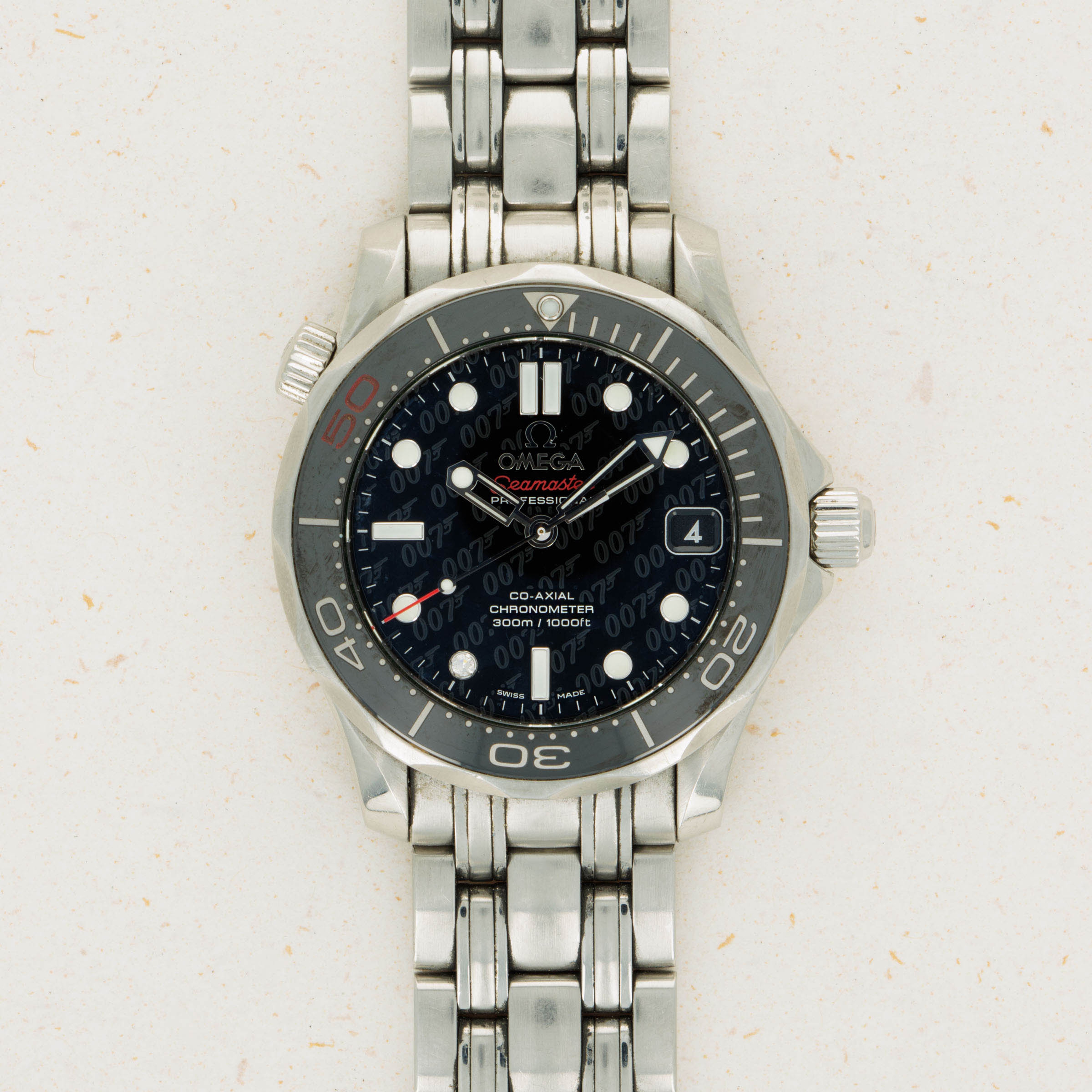 Initially released in 1948 and based on watches used by airmen in WWII, the Omega Seamaster has become one of Omega’s best-known collections. Initially, a dress-style watch with thick lugs, the Seamaster was designed to promote daily wear while remaining functional for use in water with 62.5 meters of water resistance. However, the modern Seamaster that we know and love today was born nine years later, in 1957. This was when the Seamaster 300 was released after Omega was inspired to upgrade the Seamaster after they had 50 Seamaster cases with rubber O-ring gaskets tested in 1955, which led them to work with new materials and push their boundaries. As a result, they created the Seamaster 300, which featured a heavily luminescent dial and handset, a rotating bezel, a thick domed hesalite crystal, and double crown seals. Interestingly, while named the Seamaster 300, the watch was originally only rated for 200m of water resistance, with Omega insisting the watch could outperform the testing equipment. Either way, the Seamaster lives on as James Bond's watch of choice and now enjoys the privileged position in today’s market as one of the most iconic dive watches ever released. Launched in 2012, the Seamaster that we have here is the ref. 212.30.36.20.51.001 – the James Bond 50th Anniversary edition. Launched as a limited edition offering of 3007 pieces, it celebrates James Bond’s 50 years on the silver screen since his debut in Dr. No. Featuring a black dial with James Bond’s famous 007 logo inscribed several times across its surface, and a gun-barrel design encircling the back of a bullet on its caseback, this Seamaster embraces James Bond’s dangerous lifestyle and his iconic position as one of cinema’s best-known spies.