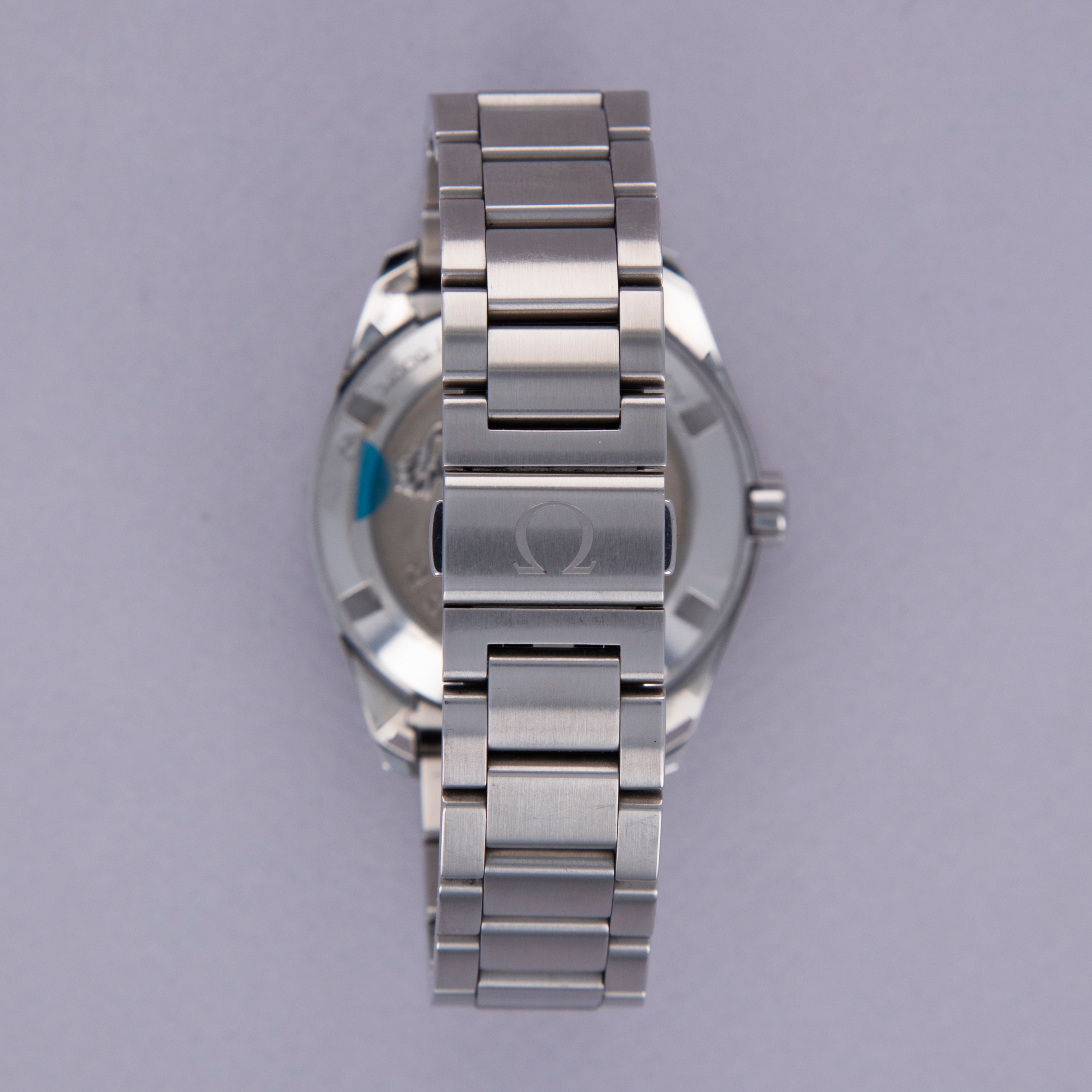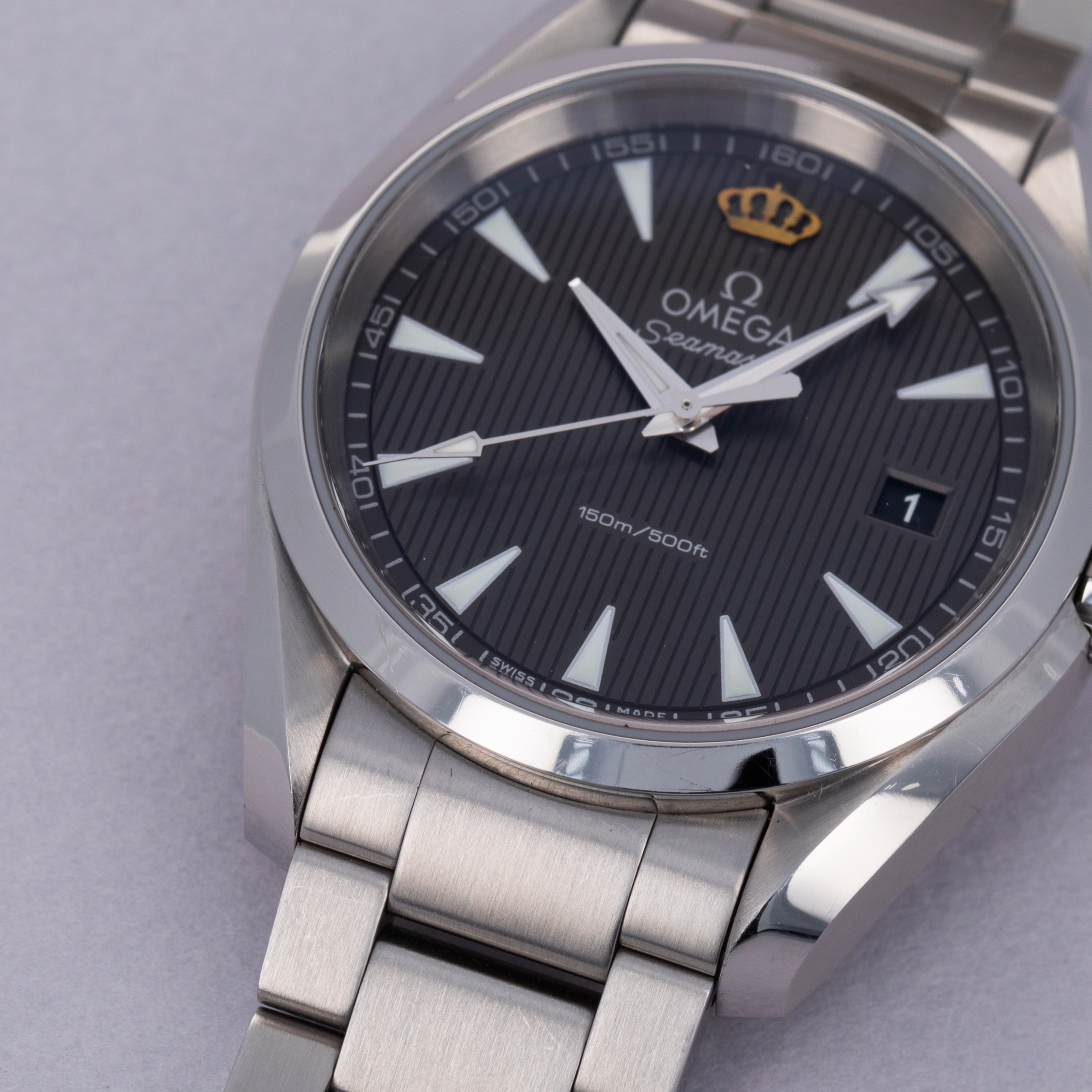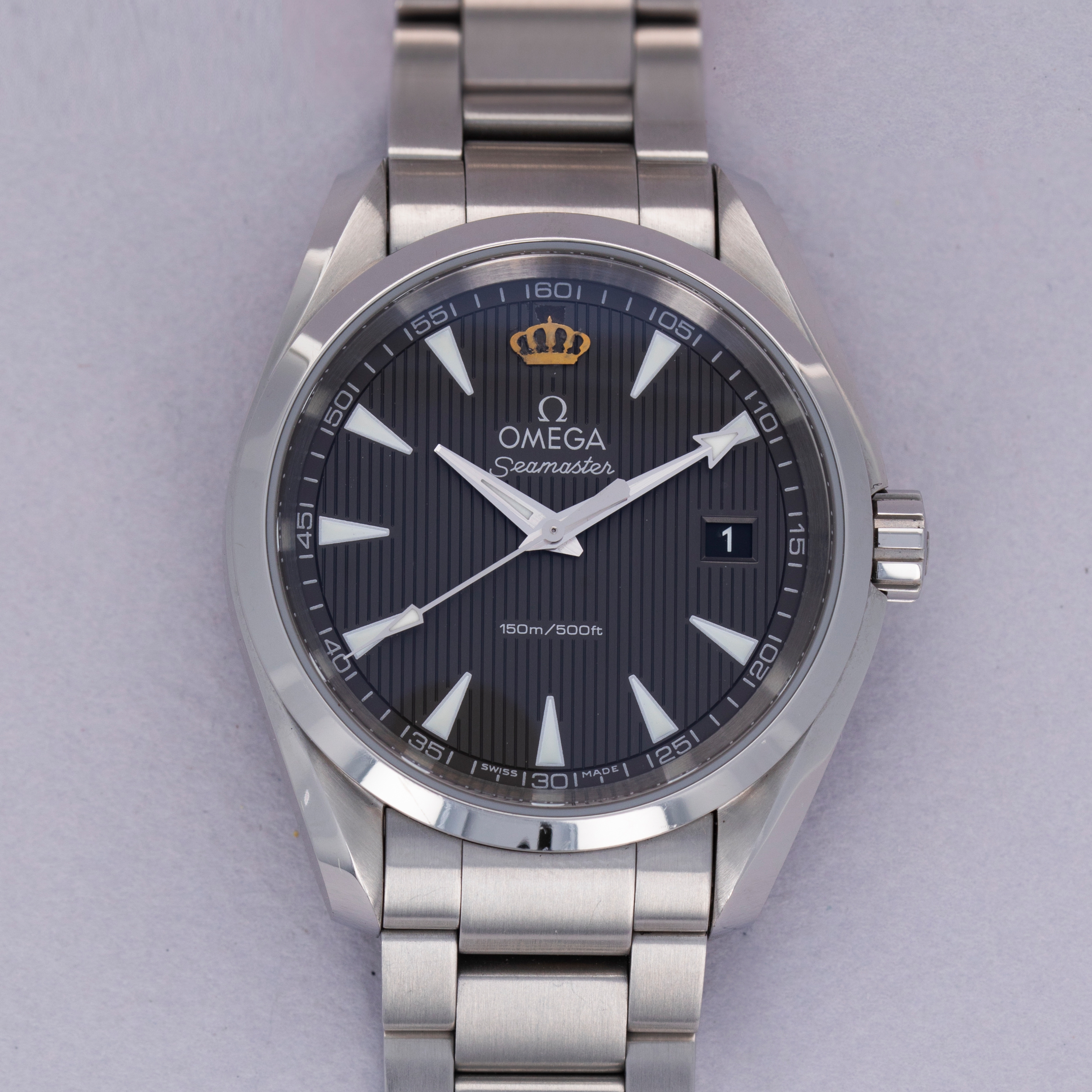 Boasting the Royal Jordanian emblem at 12 o'clock on its black pinstripe dial, this Aqua Terra's status as a royal gift is immediately obvious.
