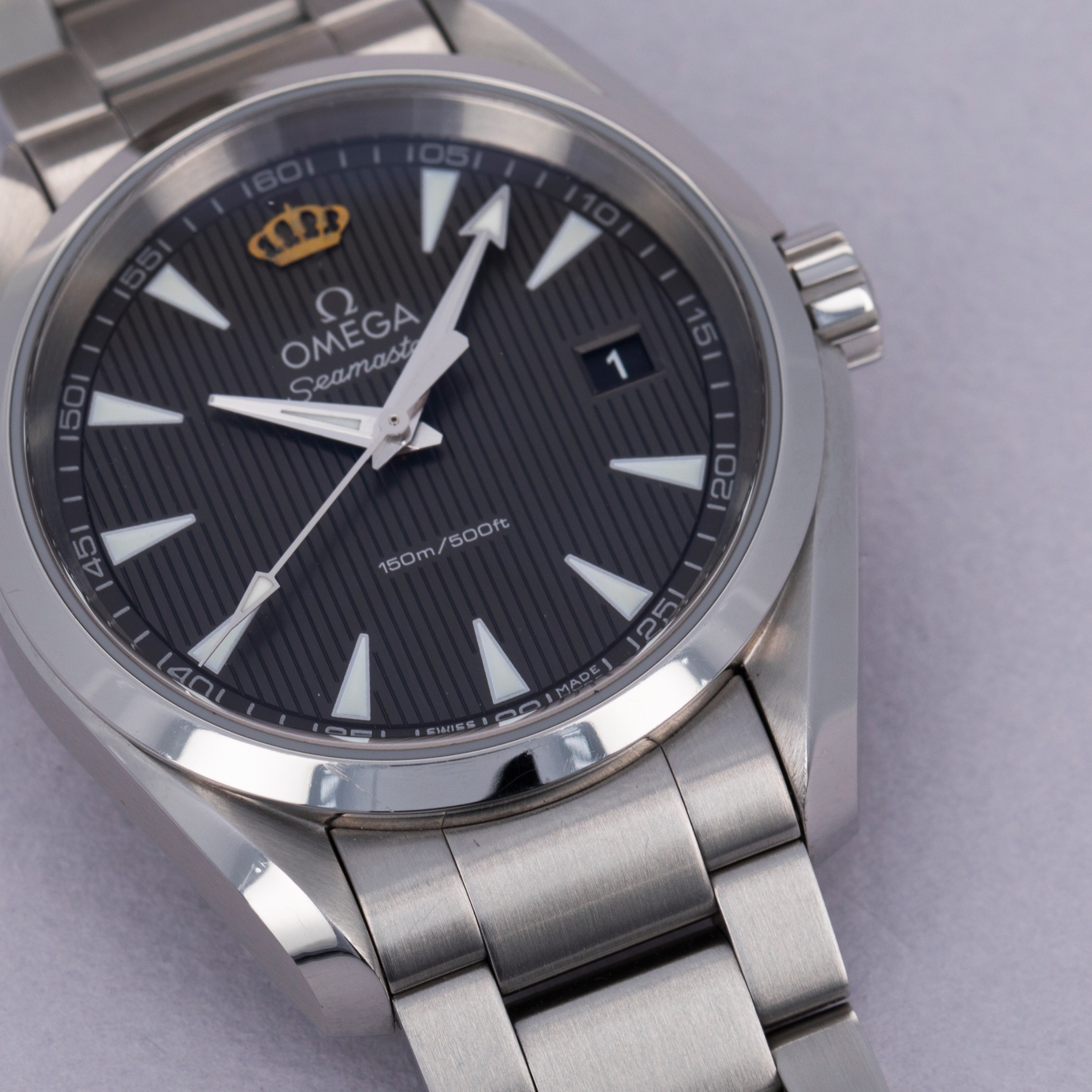 While their dive watches and chronographs are typically the first of Omega’s watches that come to mind, Omega’s history as a watchmaker is incredibly diverse with large ranges of dress watches offered alongside those tool watches. First launched in 2002 as an expansion of Omega’s Seamaster 120 collection, the Seamaster Aqua Terra collection was created as a means to speak to the brand’s classical DNA while appealing to the Seamaster’s rugged dive watch design. As a result, the Aqua Terra features a hybrid design that is incredibly versatile. Often cased in stainless steel, the Aqua Terra features a slightly more traditional design language with fixed smooth bezels, decorated dials, and a date function. However, in a bid to speak to the Seamaster’s heritage, the Aqua Terra also features 150m of water resistance, much like the ref. 231.10.39.60.06.001 that we have here. Added to the collection in 2013, the ref. 231.10.39.60.06.001 is powered by a quartz movement, which gives it a practical sense of utility as a modern tool watch. With its crisp black vertical pinstripe dial and applied hour markers, this ref. 231.10.39.60.06.001 is a visually striking watch deserving of the flourish that it has been given by Omega at the request of the Kingdom of Jordan, the Royal Jordanian emblem, a golden crown, on its dial at 12 o’clock, marking this as a watch that was either gifted to a foreign dignitary by the King of Jordan.