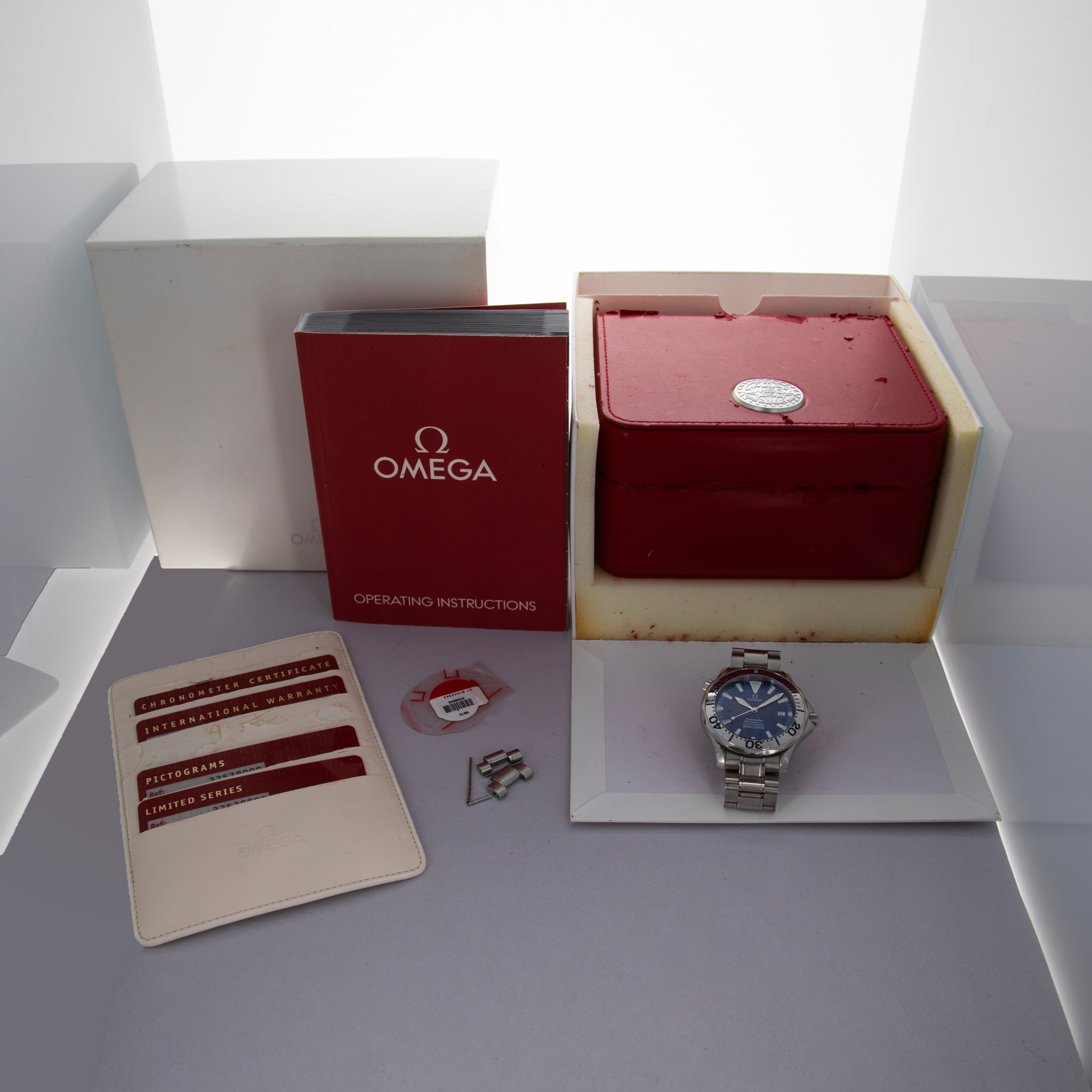 Watch is in very good overall condition. Case shows moderate surface wear, with visble scratches and marks. The bezel edge has some scratches and scuffs, most visible along the 6 o'clock side of the bezel. Bracelet shows similar wear, and has 5 removable links currently fitted. It is sized for a 7 3/4" wrist and there are two additional links included with the watch. Watch comes with original boxes and paperwork. Please note that the watch runs at time of cataloging, but the timekeeping is poor and a service is recommended.