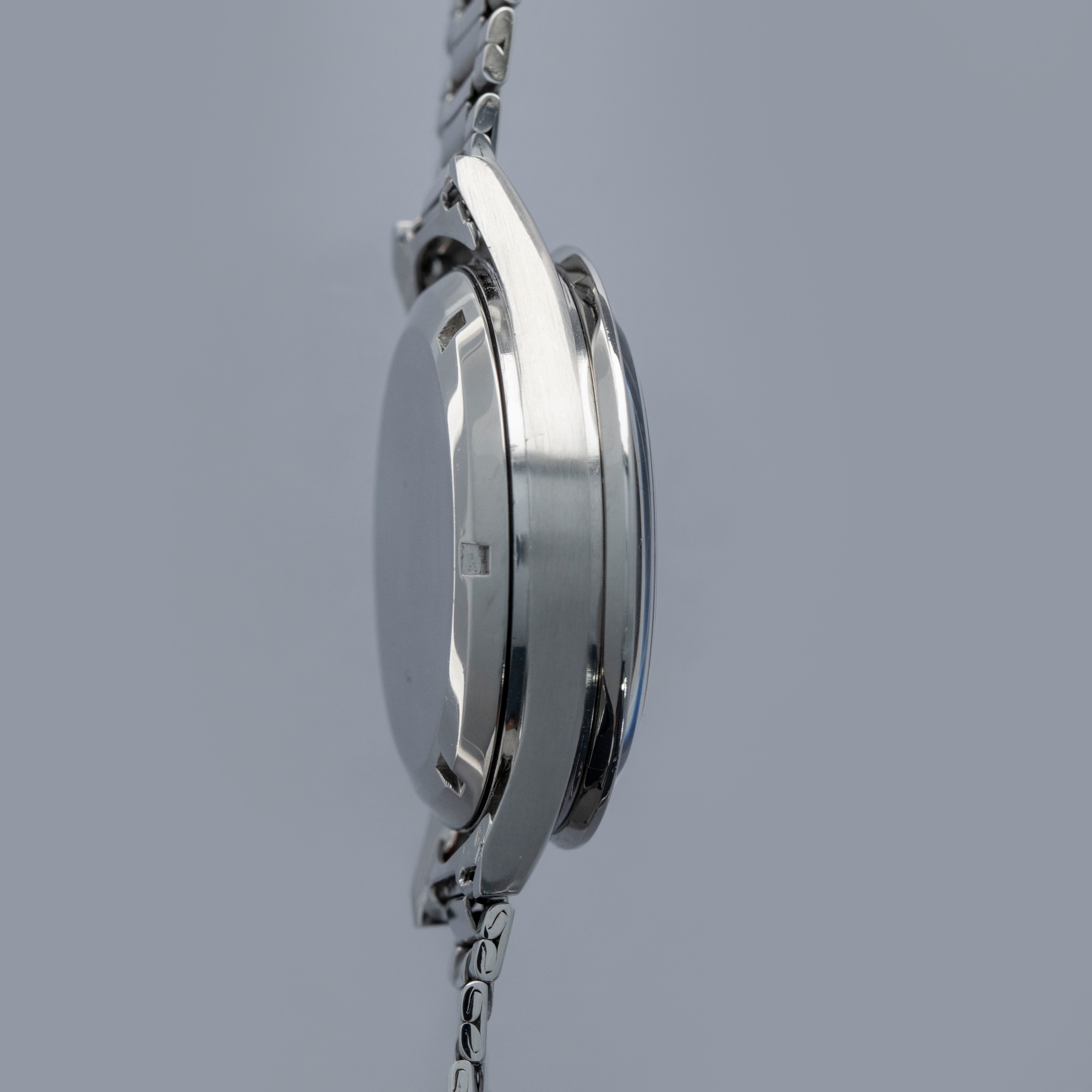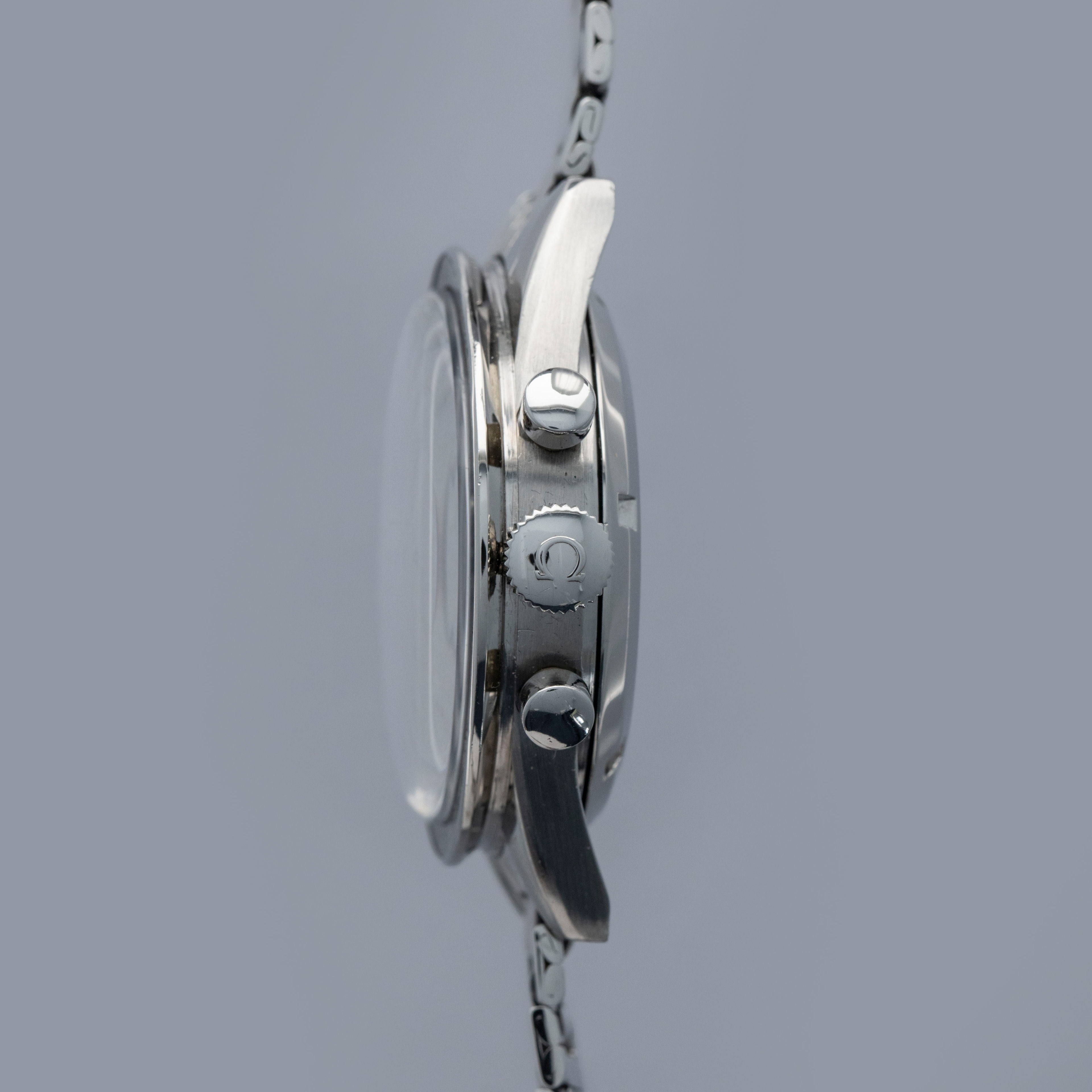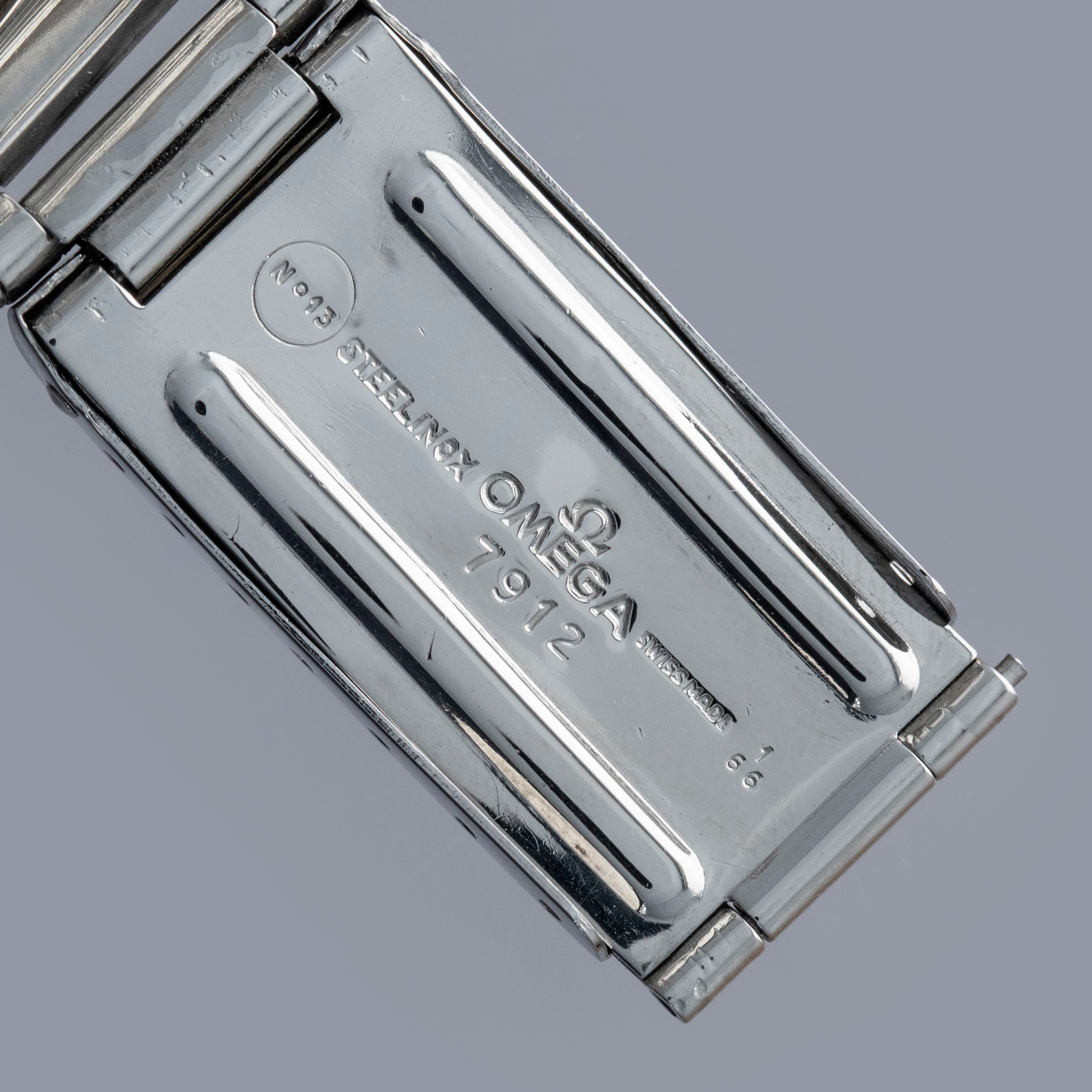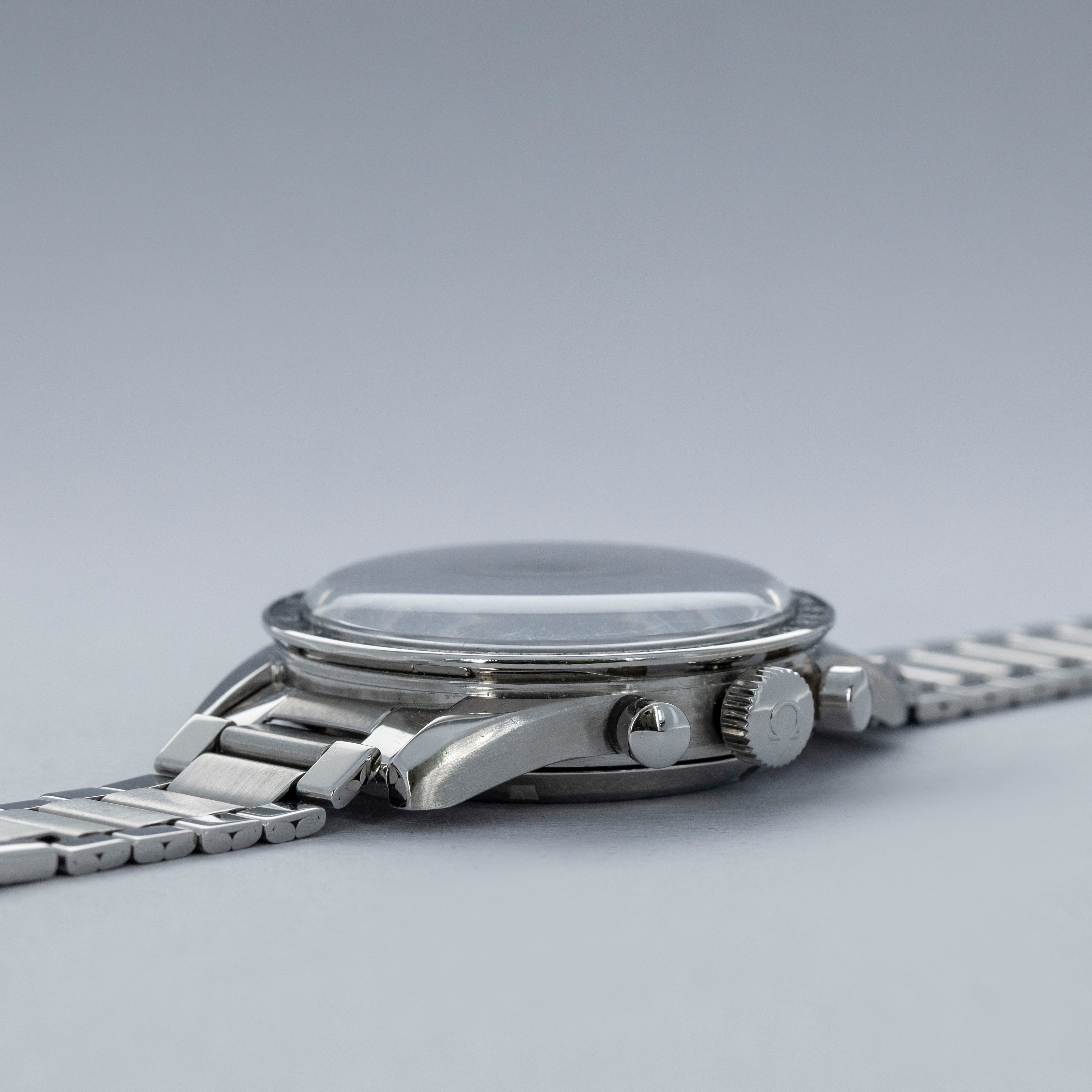 As with all "Ed White" Speedmasters, this example lacks crown guards and the Speedmaster's famed twisted "lyre" lugs and features flat bracelet links and rather typical flat lugs.
