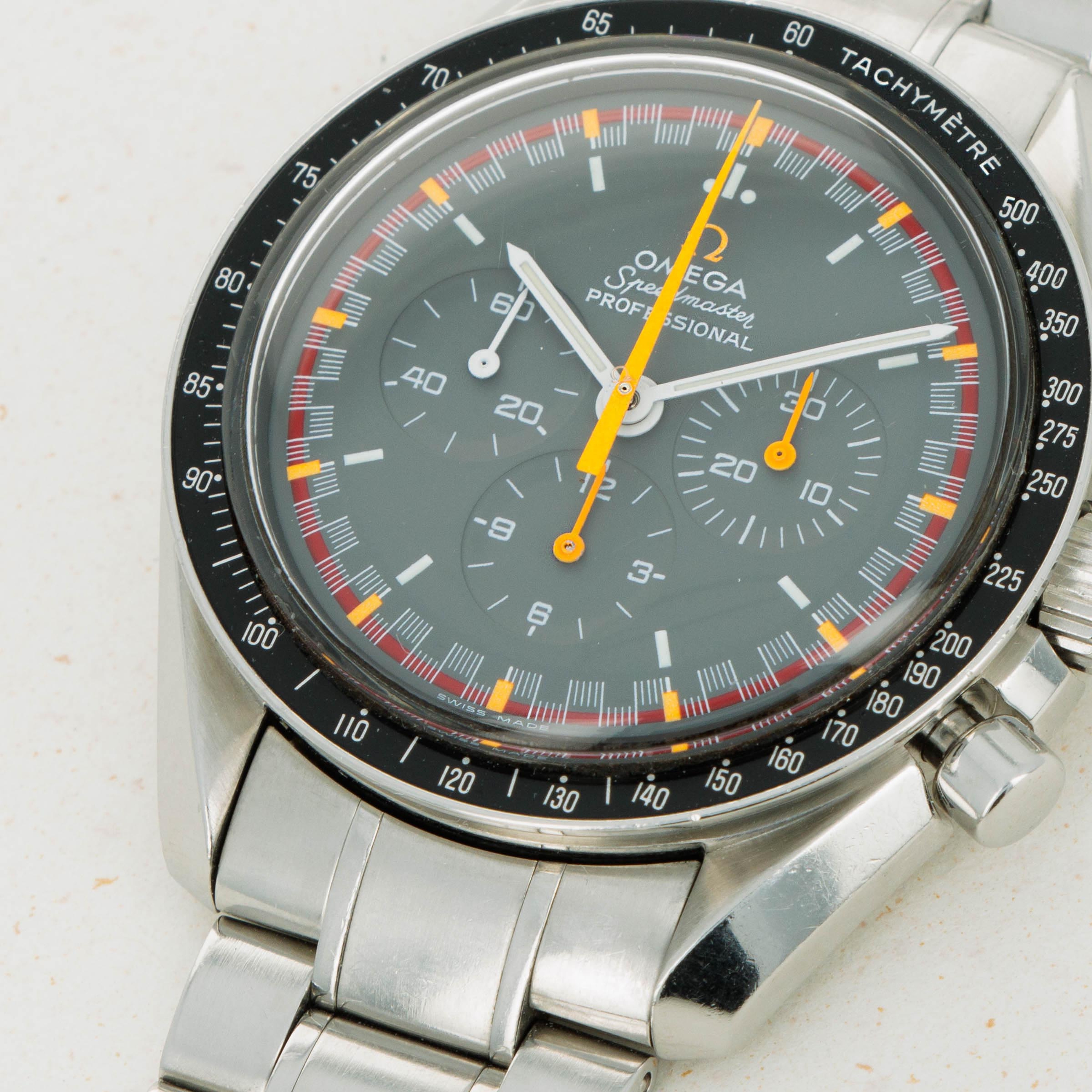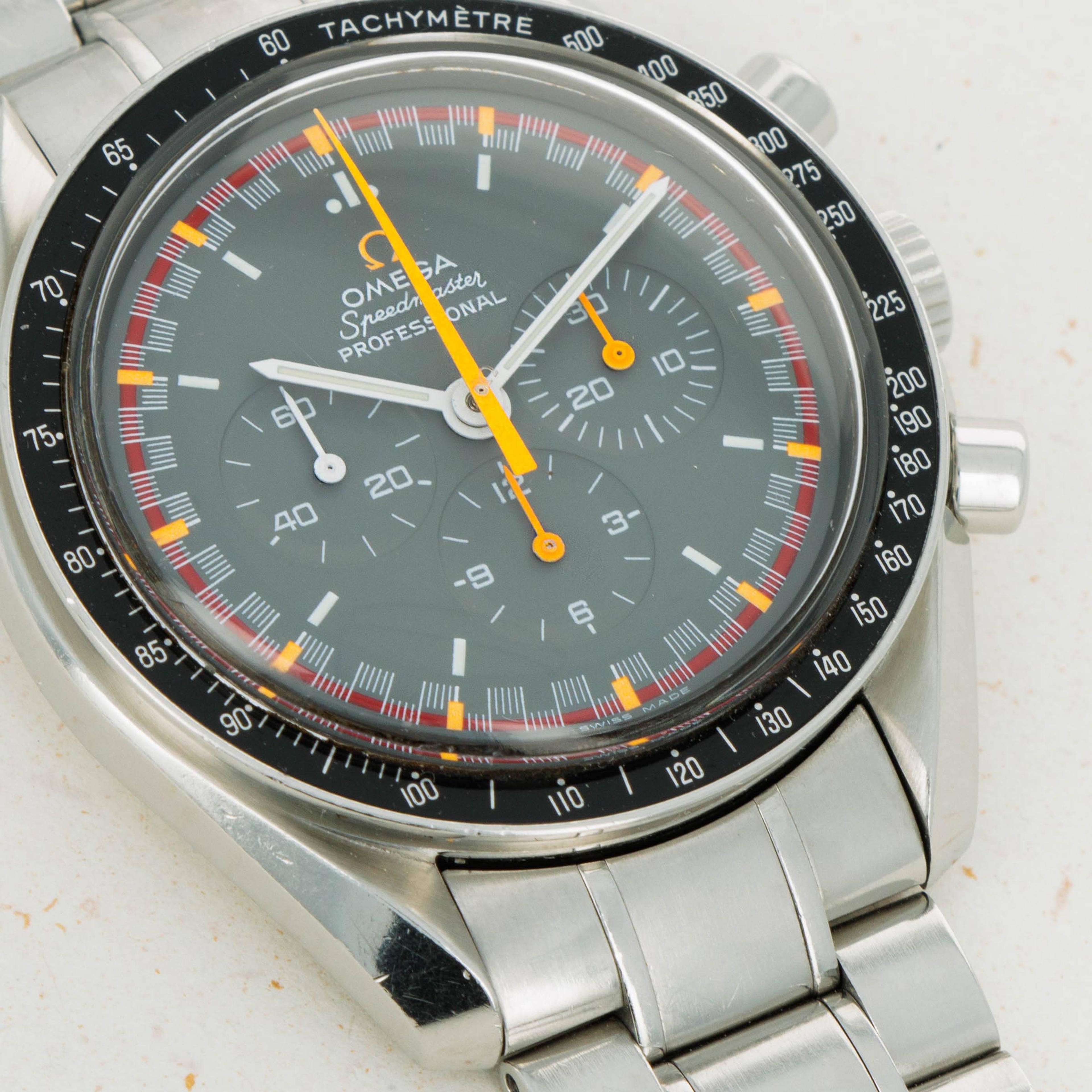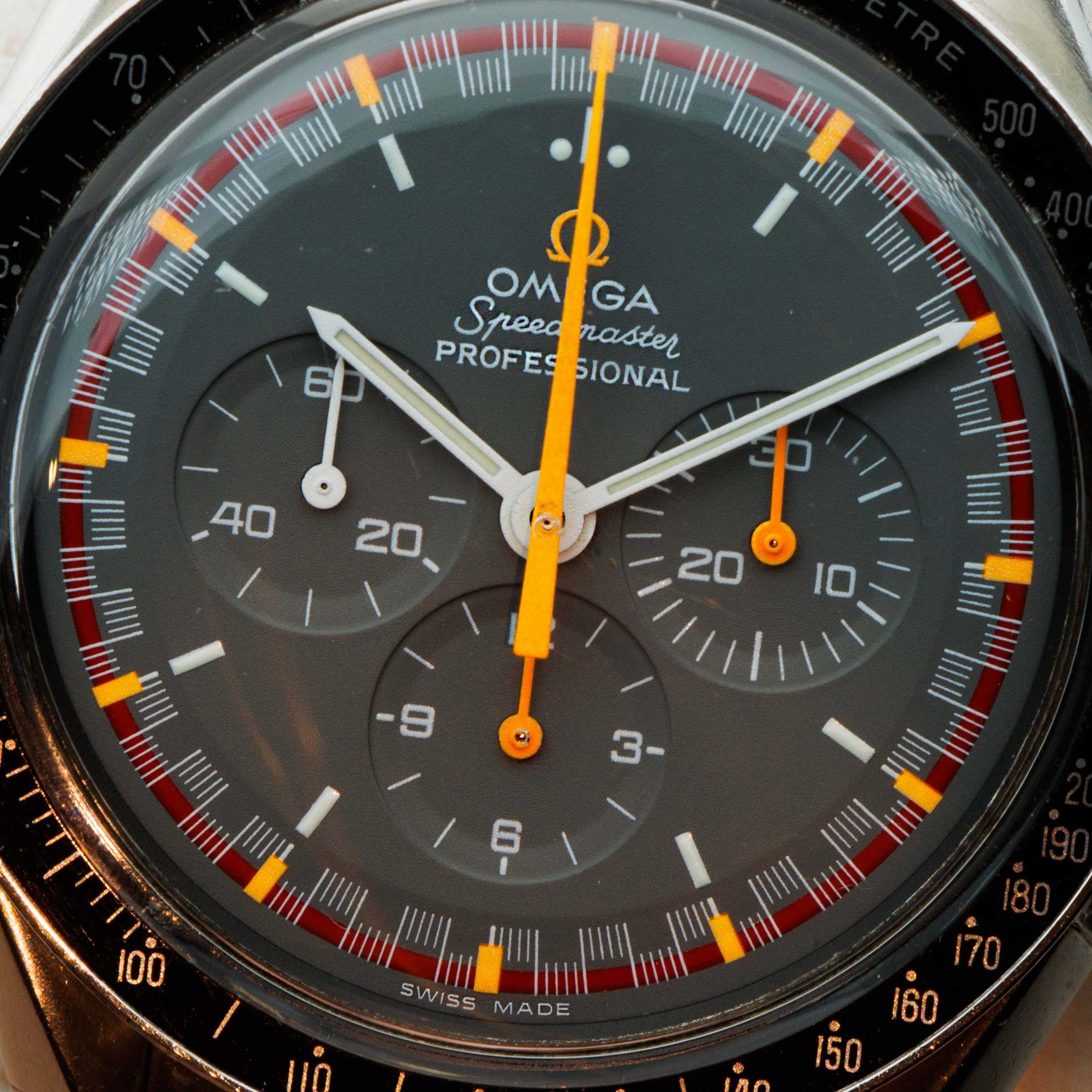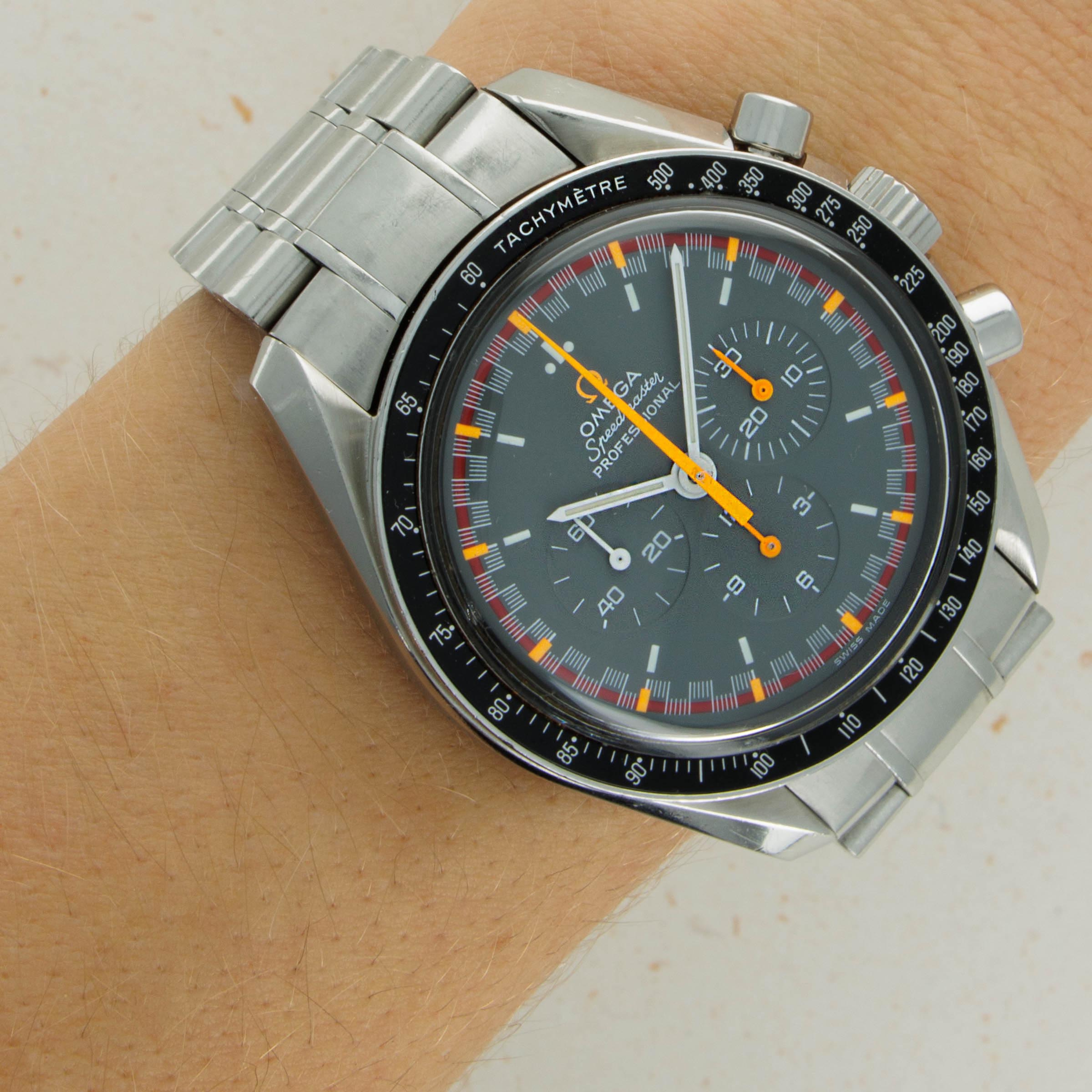 Featuring a typical Speedmaster black dial, the ref. 3570.40 features a rather unique red ring along its periphery with orange markers punctuating every five-minute mark and bright orange chronograph hands for optimum legibility.