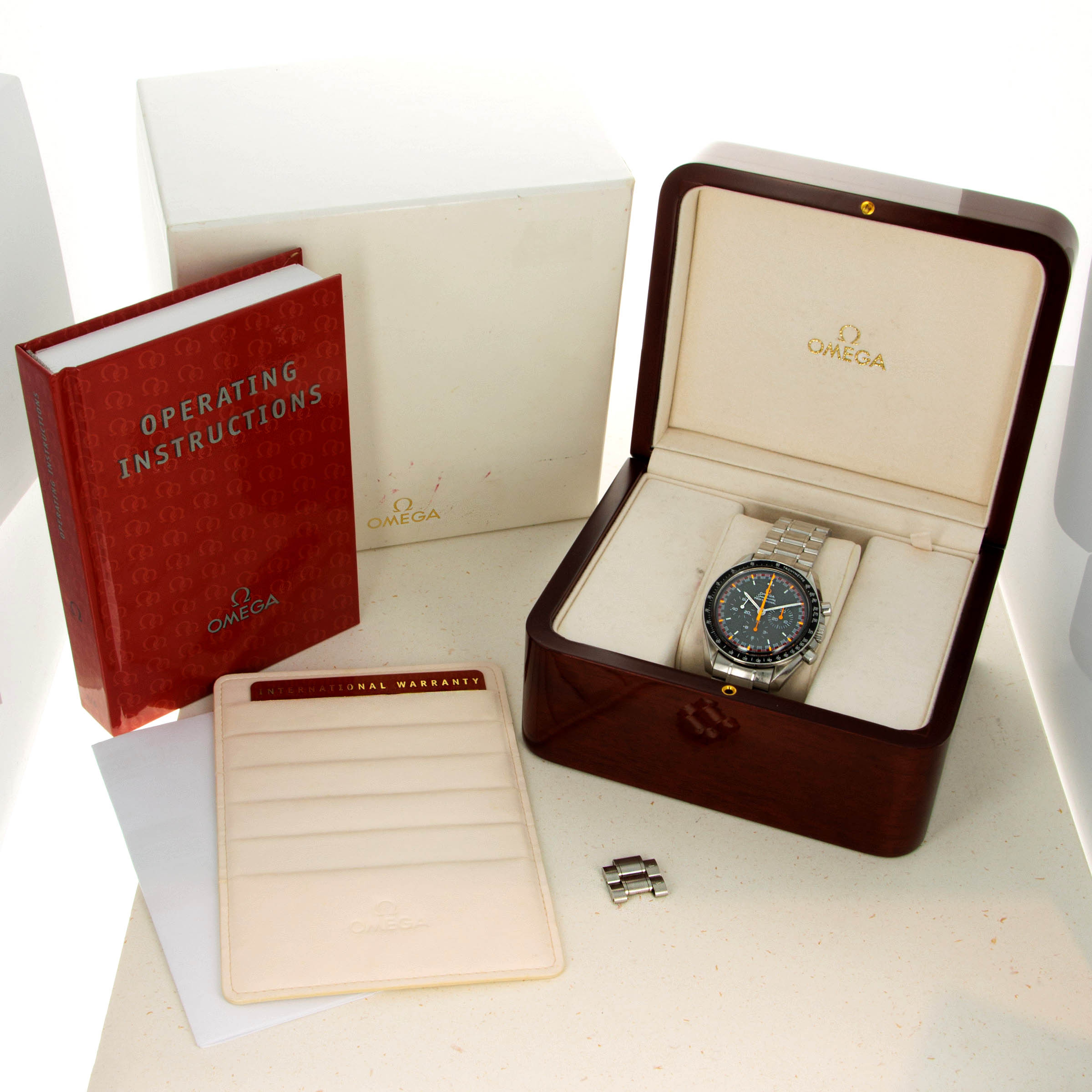 A wonderfully unusual watch that was only released in Japan, this is the perfect opportunity to grab a highly desirable and rare variant of the Speedmaster that plays on the timepiece's original design, inspiration and use case; car racing. Many examples typically seen on the market are dial swaps or conversions, and it is quite unusual to be able to find an original one as born with its box and papers in this condition.