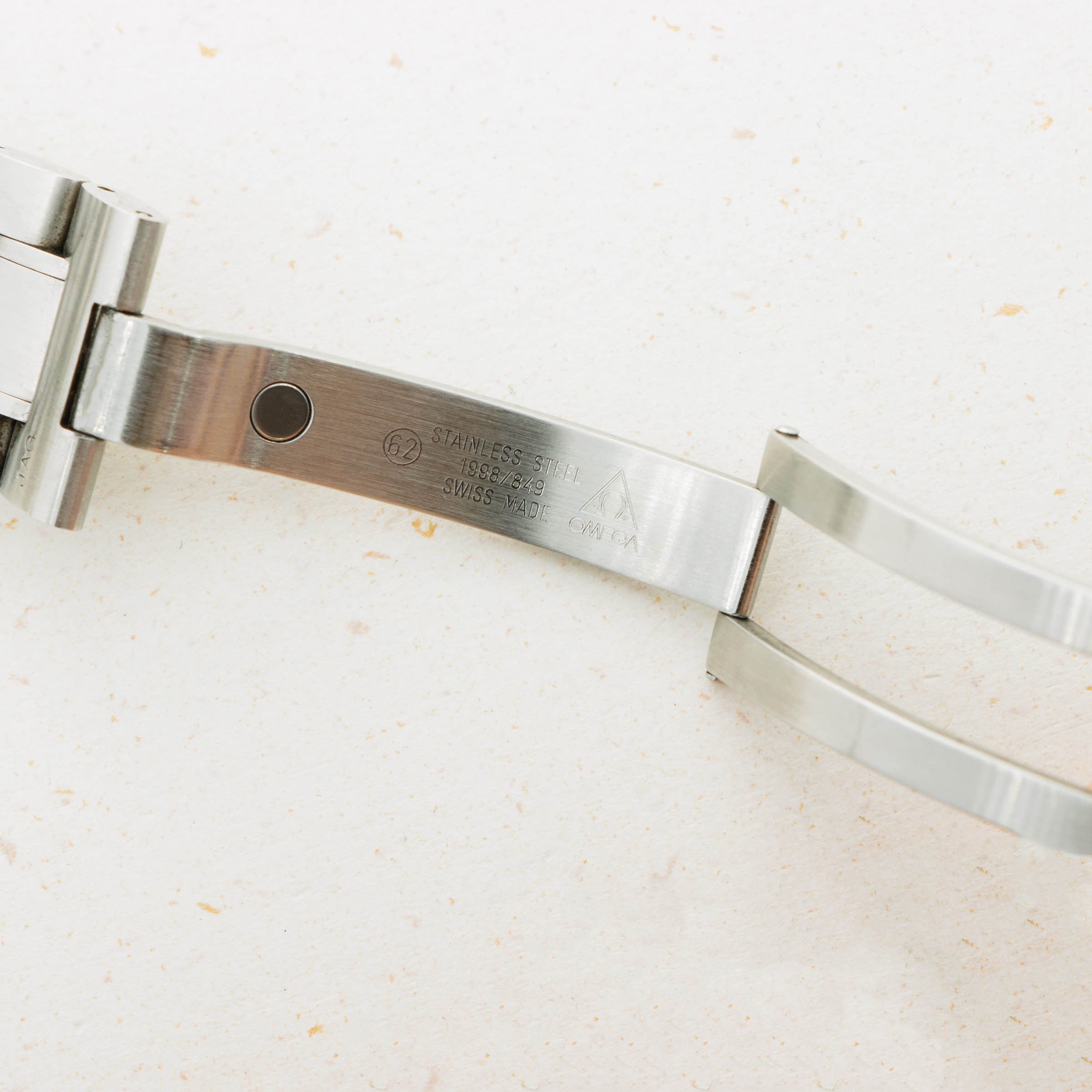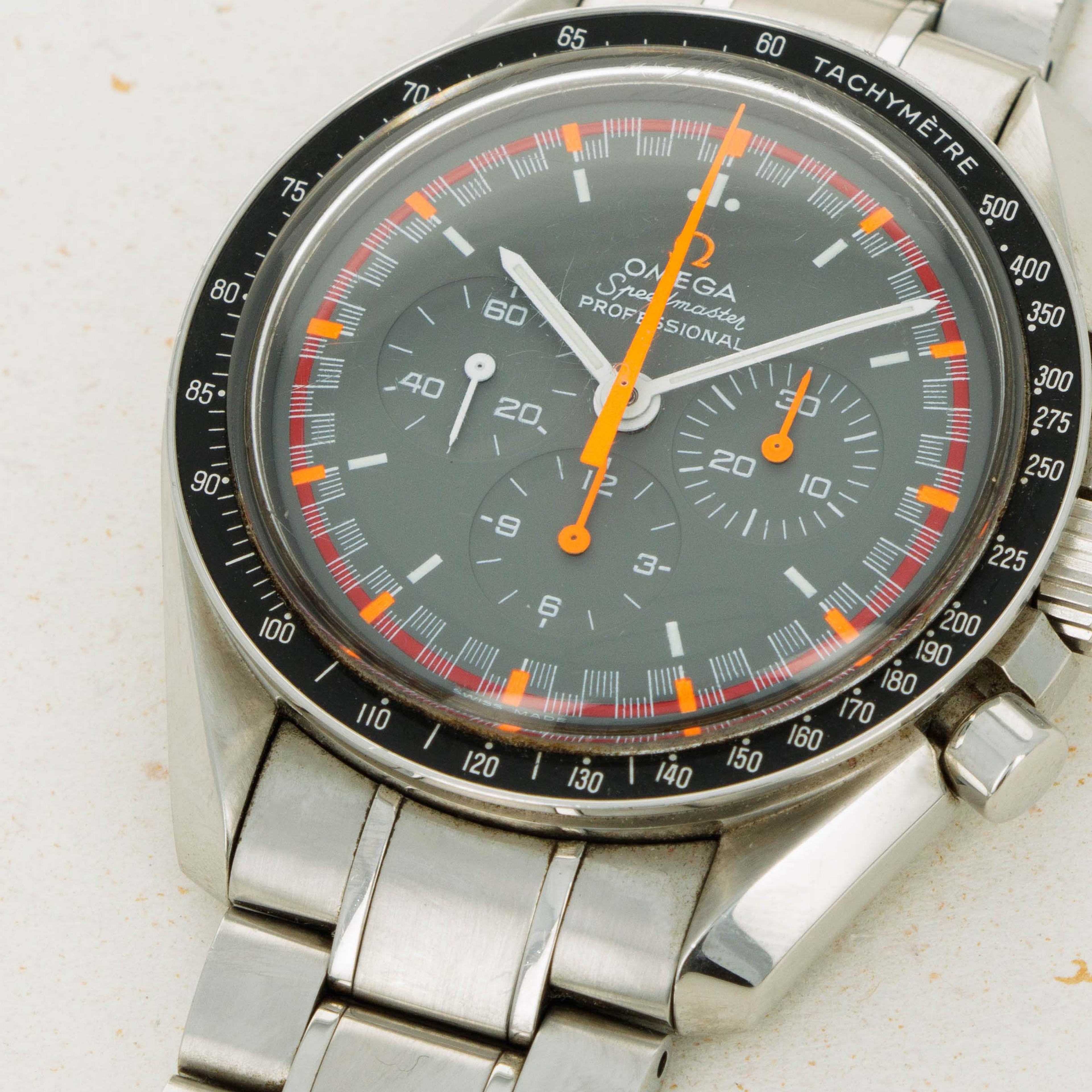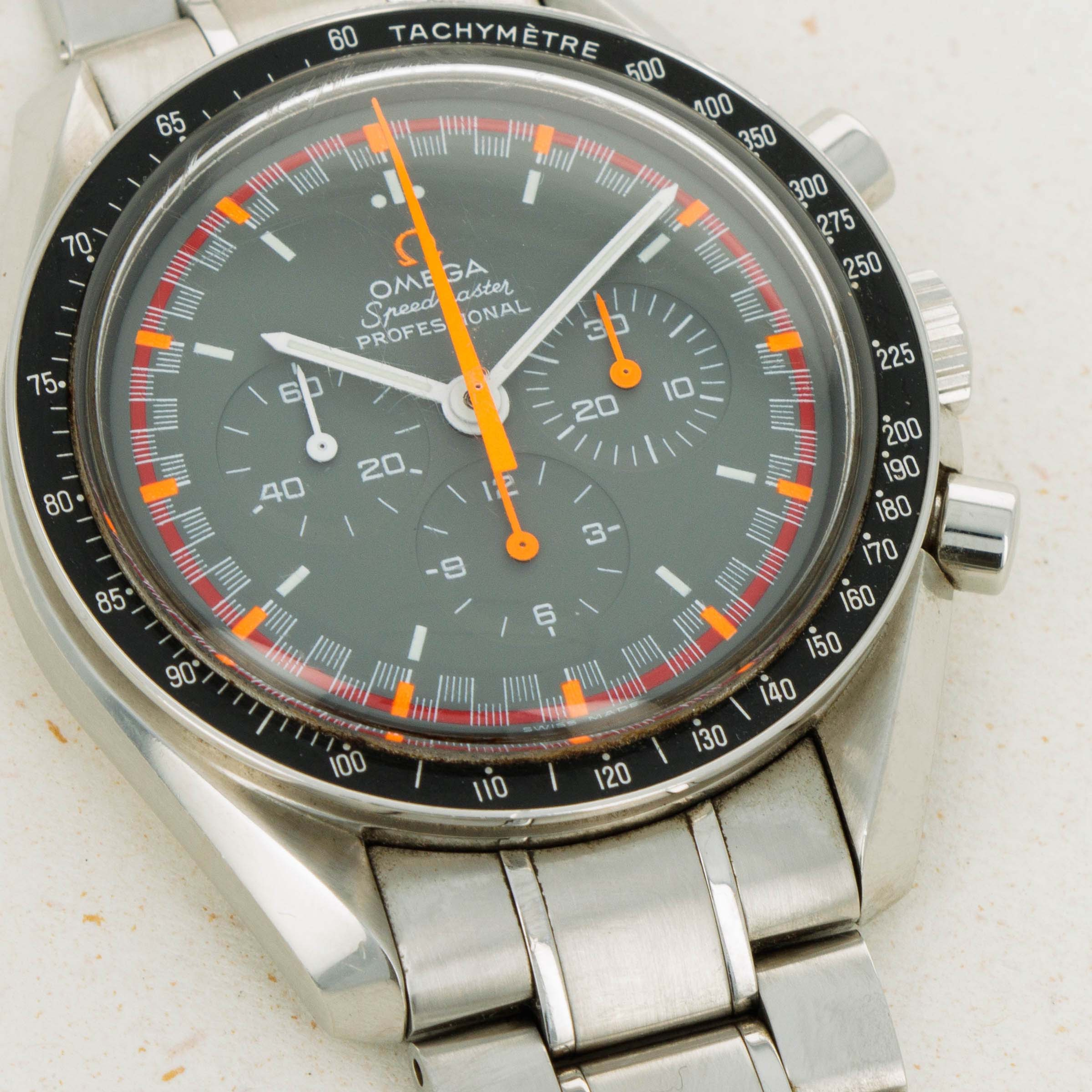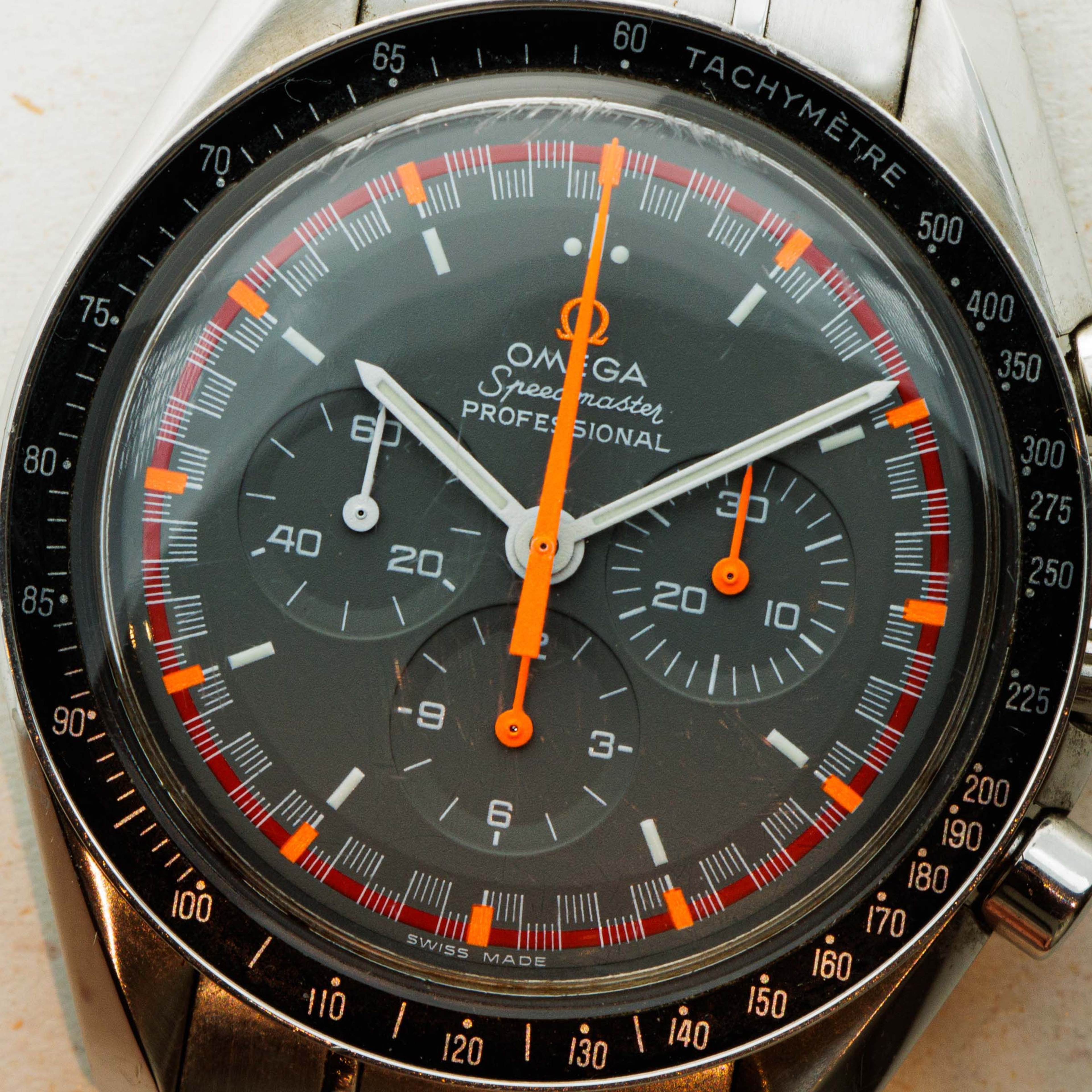 Featuring a typical Speedmaster black dial the ref. 3570.40 features a rather unique red ring along its periphery with orange markers punctuating every five-minute mark and bright orange chronograph hands for optimum legibility.