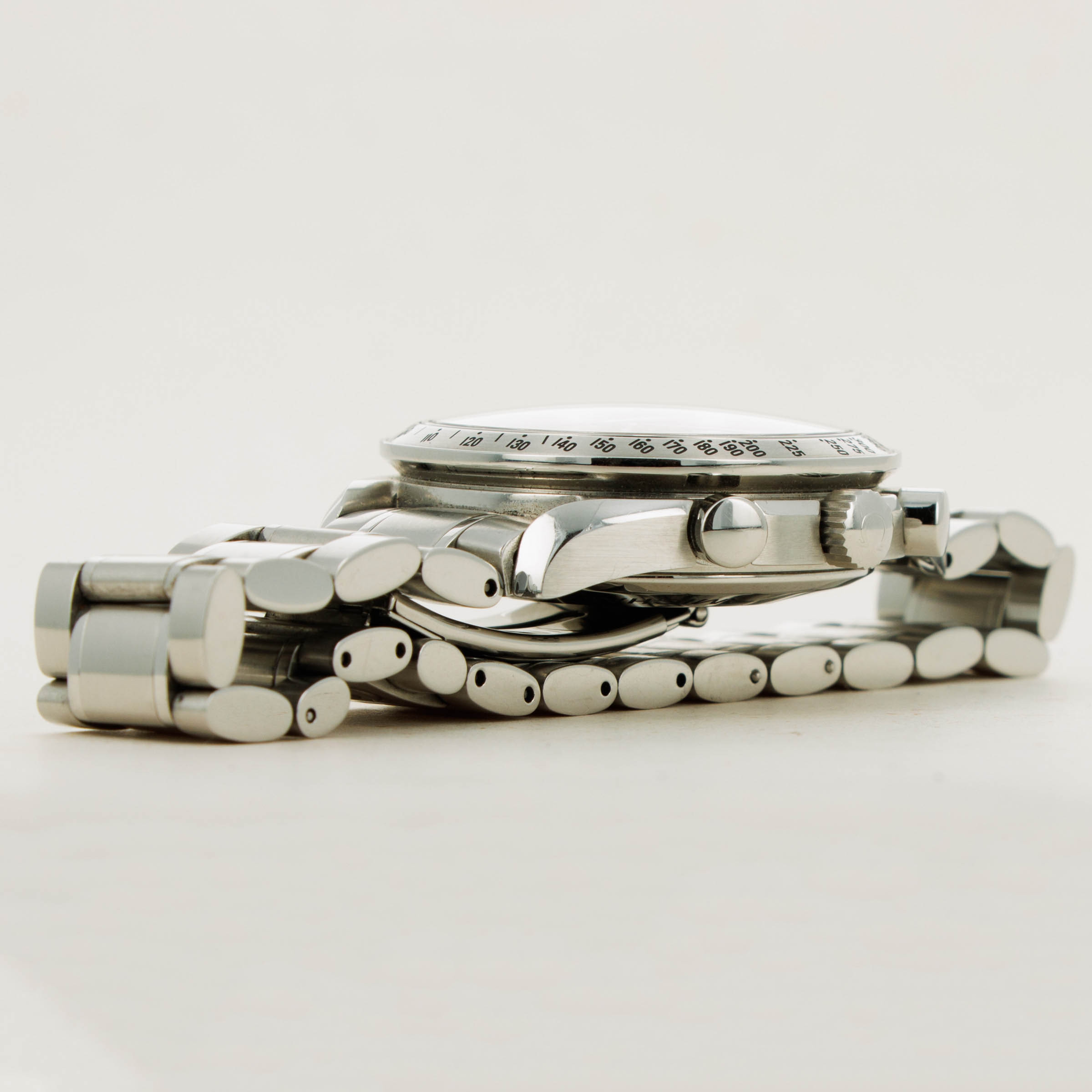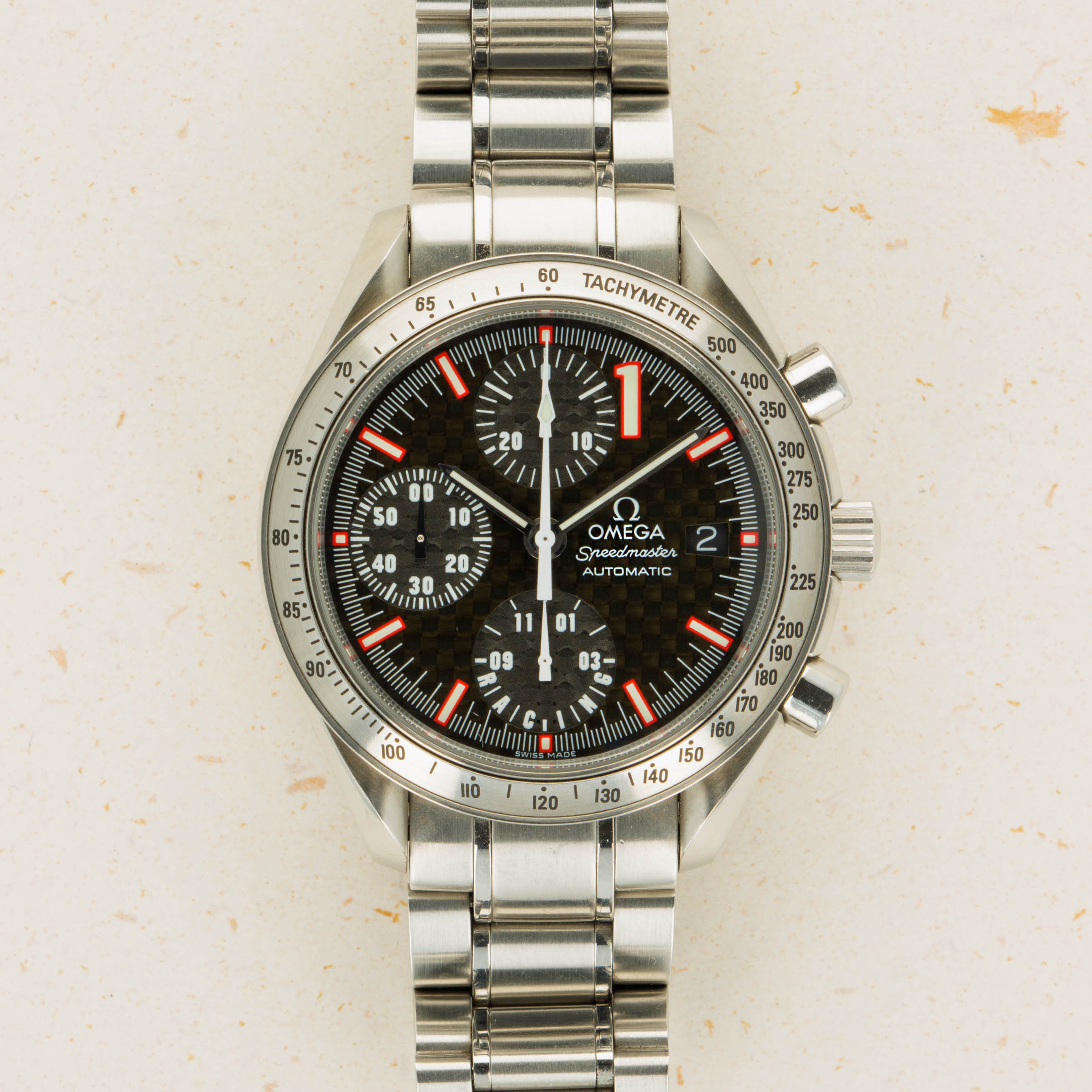 Released in 2002 to celebrate Formula 1 legend Michael Schumacher’s fourth World Driver’s Championship (his second for Ferrari), which he won the year prior in 2001, this Omega Speedmaster Racing is a unique watch with a tangible link to automotive greatness. Featuring the Speedmaster Racing’s case and movement, this timepiece is delineated from the rest thanks to its stunning racing dial and unique caseback featuring several references to Michael and his status as the F1 World Champion with his signature proudly sitting at the center of the caseback. Building onto its racing DNA, the timepiece’s black dial also features a subtle chequered pattern throughout, which complements its red and white luminous hour markers and the large "1" found at the one o'clock position highlighting Schumacher's overall position as the Drivers' Champion. Limited to 11111 units, this rare yet familiar design is a brilliant example of Omega’s love of tasteful and carefully executed limited editions, a balance they struck wonderfully with this timepiece.