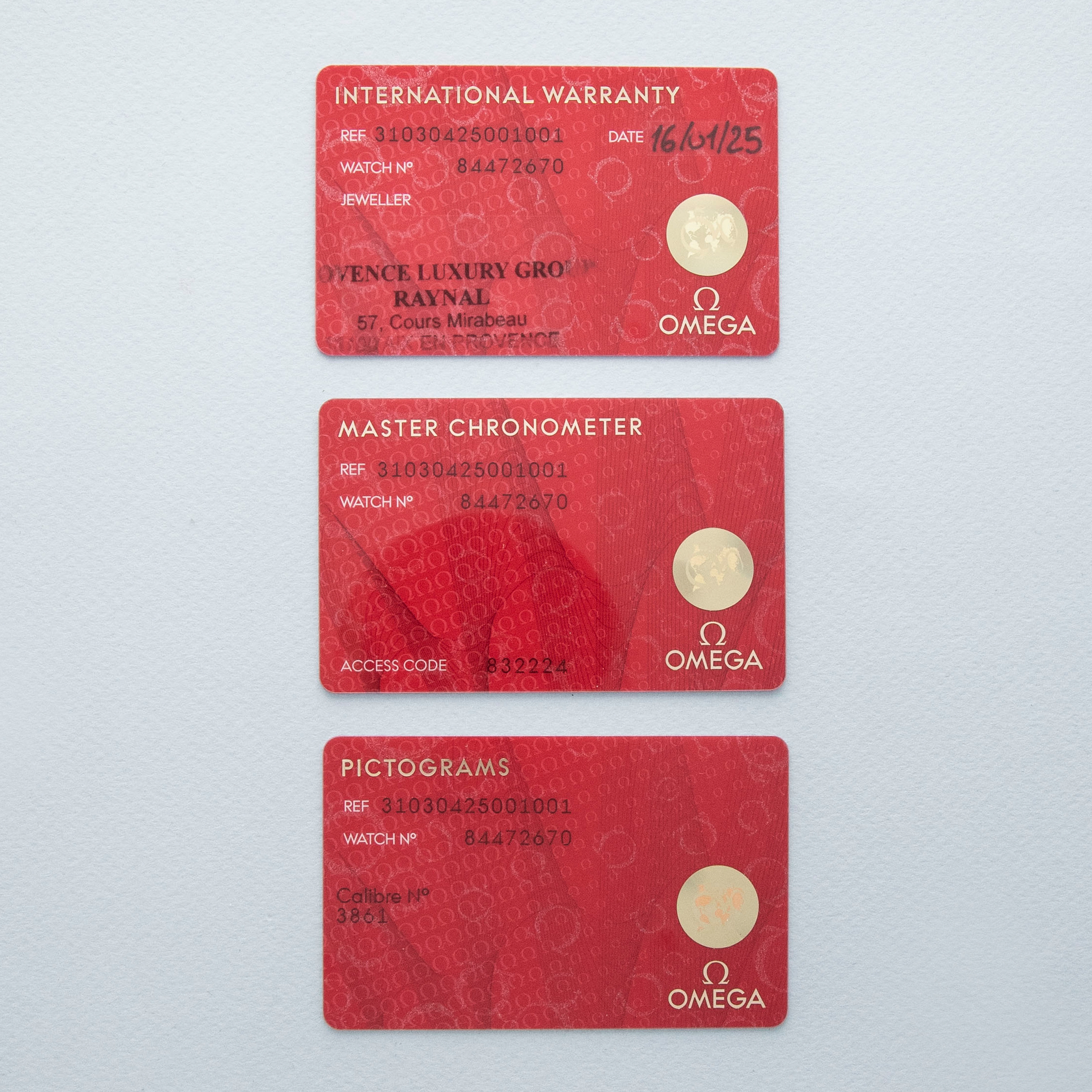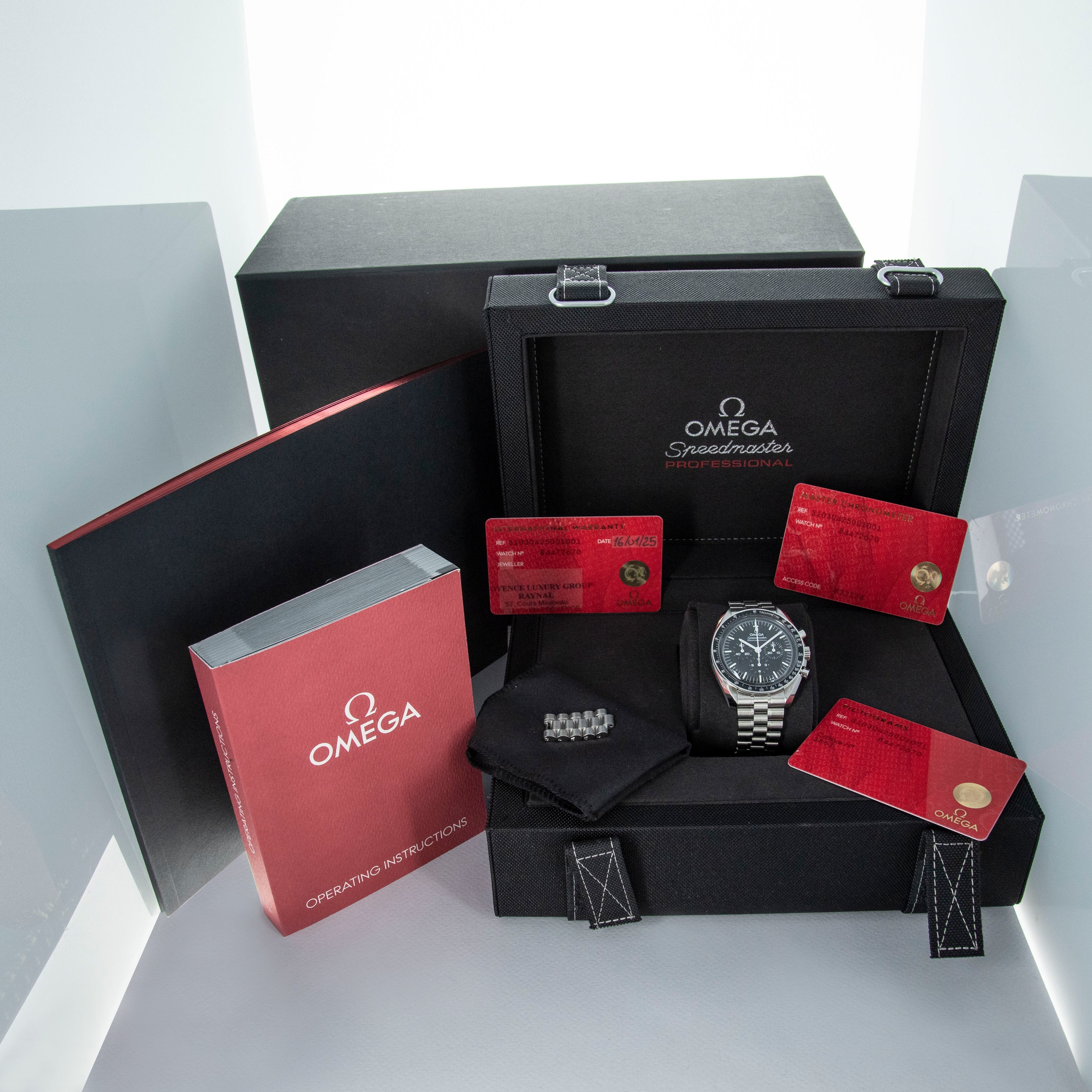 Watch, box, papers, and accessories