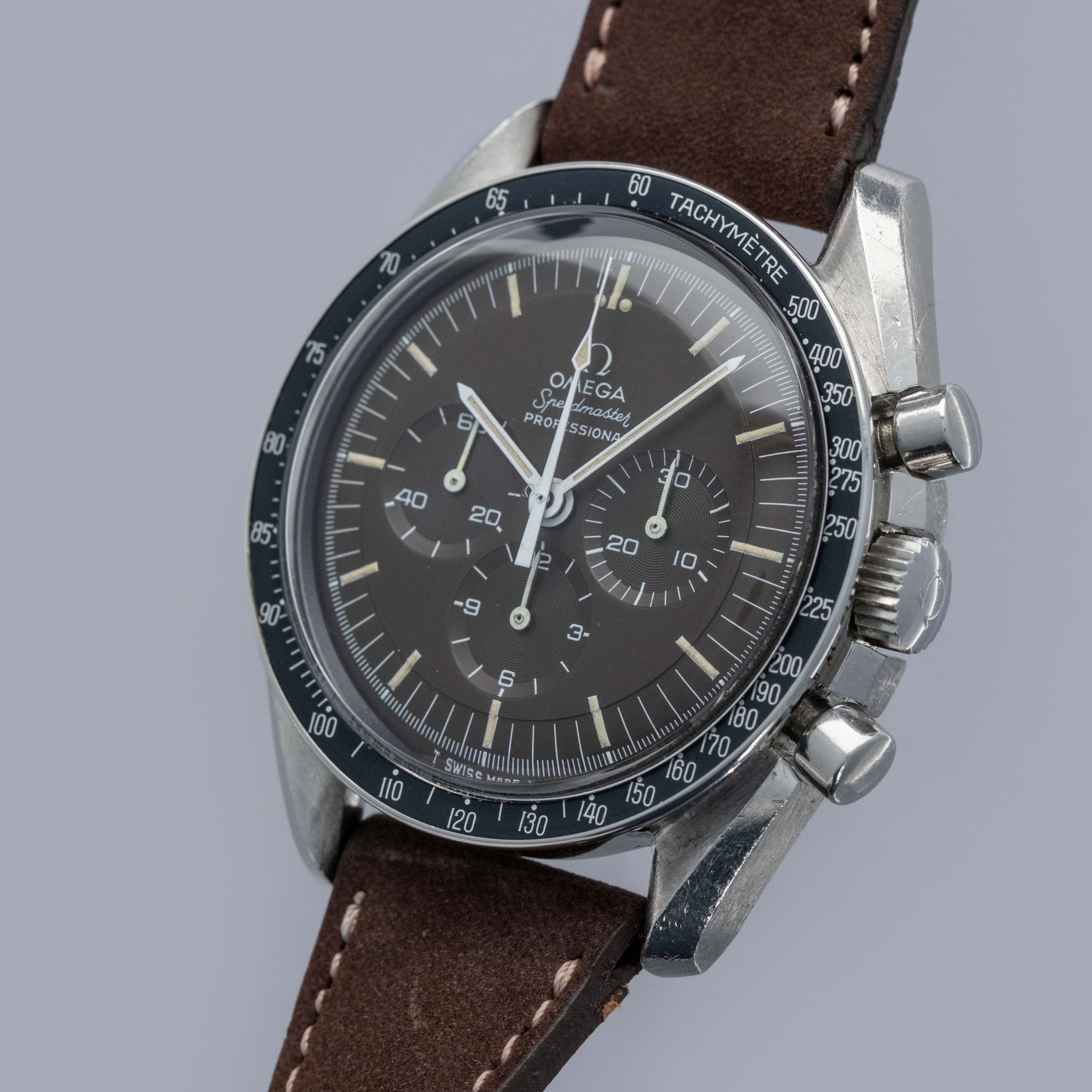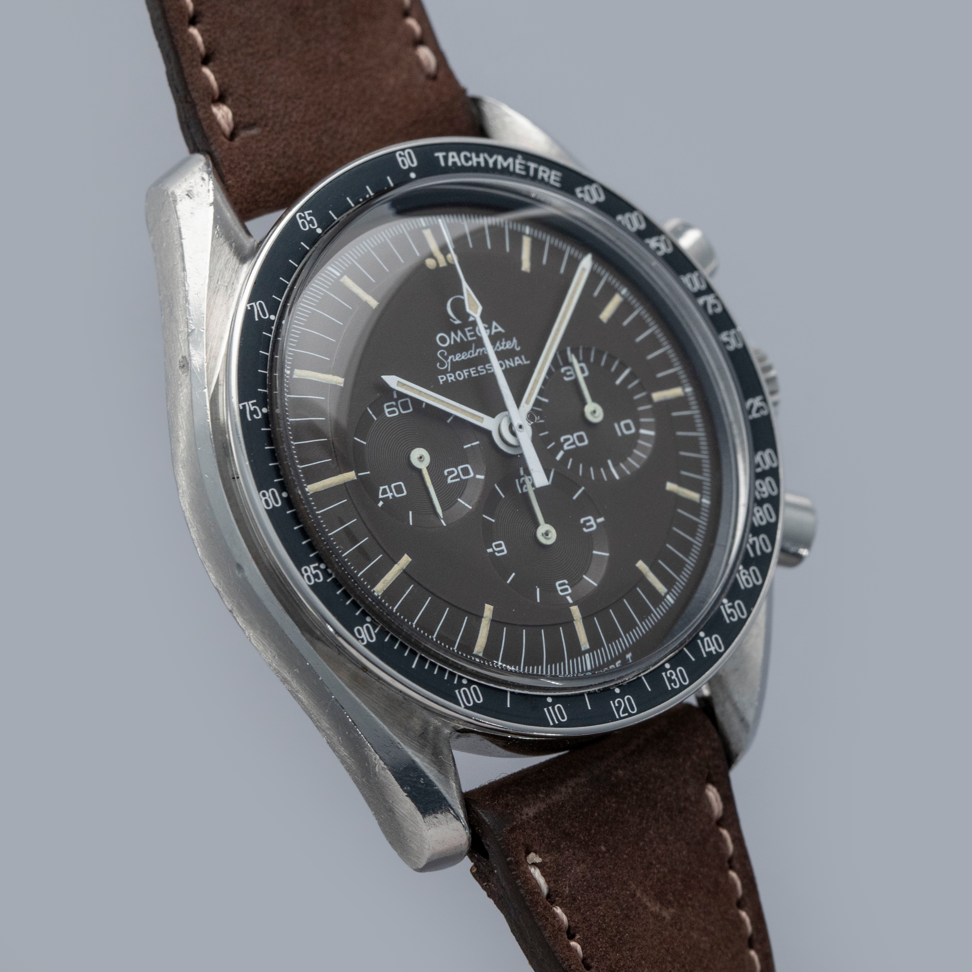Famed as perhaps one of watchmaking's most universally well-known watches, the Omega Speedmaster became the first timepiece ever to be worn on the moon following Omega's successful bid for the Speedmaster to become NASA's choice timepiece for their standard astronaut kit. After its successful inclusion in the 1965 Gemini program, the Speedmaster also adorned the wrists of the astronauts during the Apollo moon landing missions, and so, in 1969, following Buzz Aldrin's historic steps on the moon (Neil Armstrong left his watch on the lunar module) it became the Moonwatch that we all know and love. After the successful 1969 touchdown on the lunar surface, Omega launched the ref. 145.022-69 from within the previously created 145.022 collection as a means to commemorate one of the most legendary moments in human history. As part of the 145.022 collection, Omega created several variants across the years that feature small changes from one reference to another such as different dials, bezels, casebacks and other small details. This ref. 145.022-69 example boasts a "Dot Next to 90" bezel, a pre-moon landing caseback that came on the Speedmaster before the 1969 Moon landings were referenced in later variants, and a stunning and equally rare tropical dial that has developed a chocolate color over the years, marking a large departure from the jet-black color that it would have once had.
