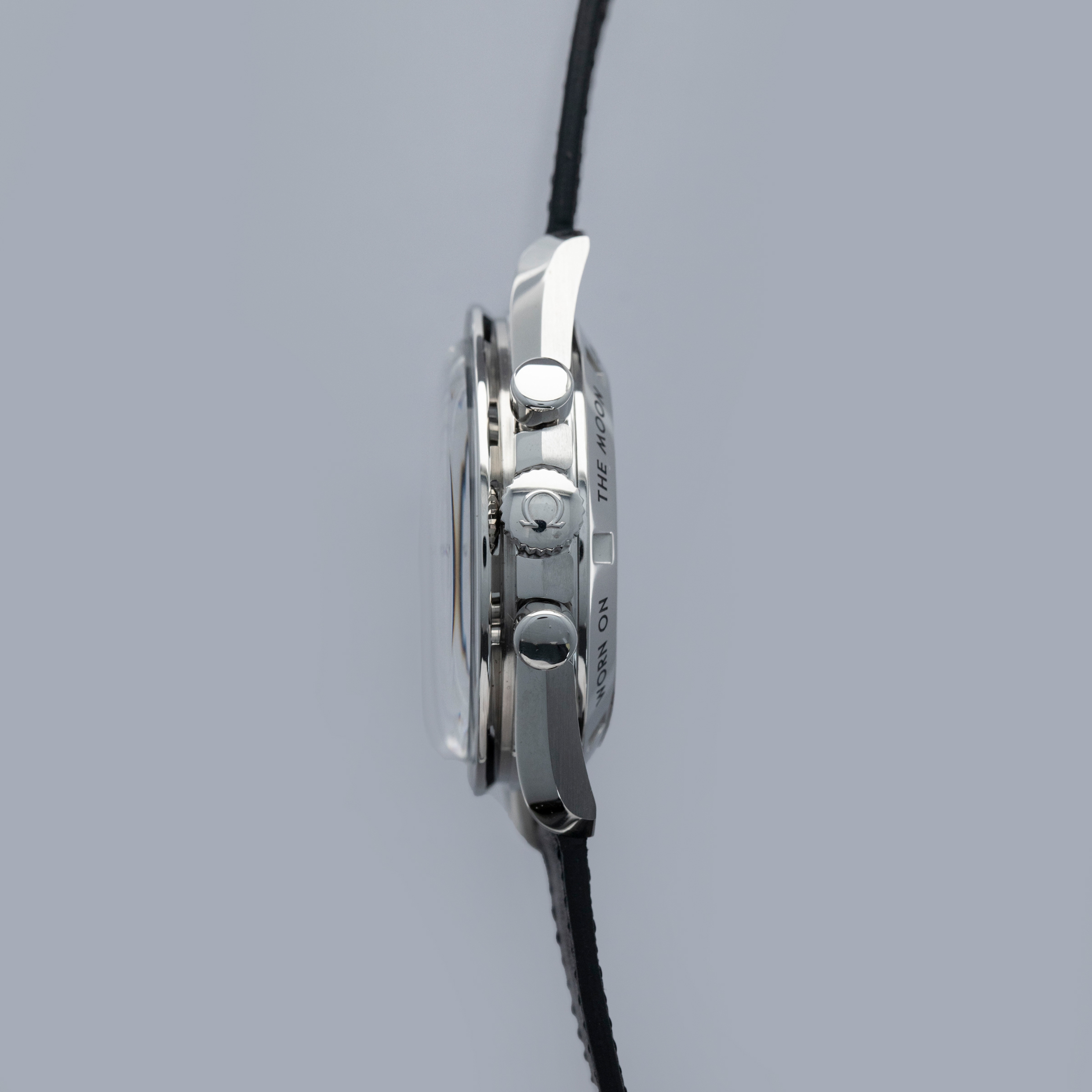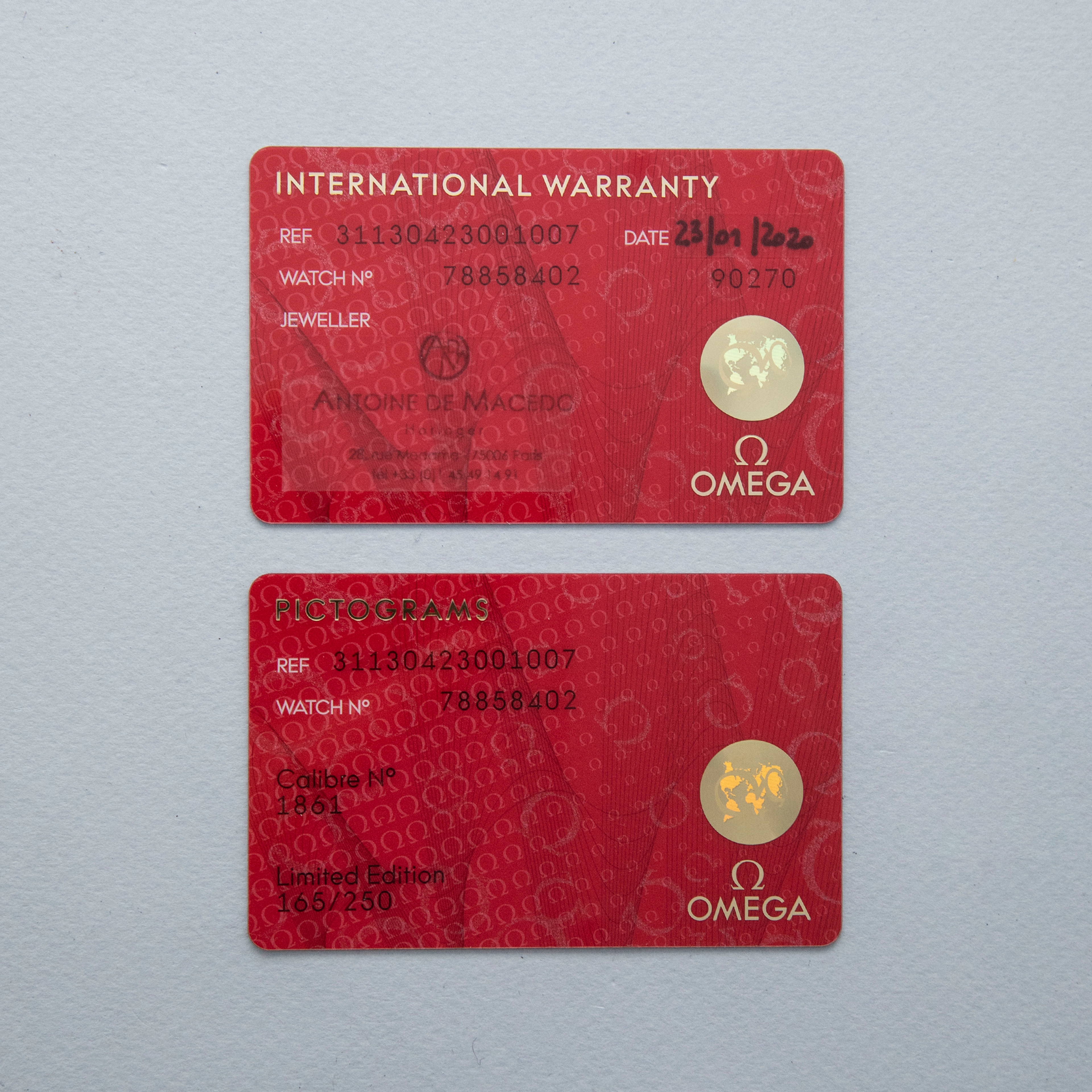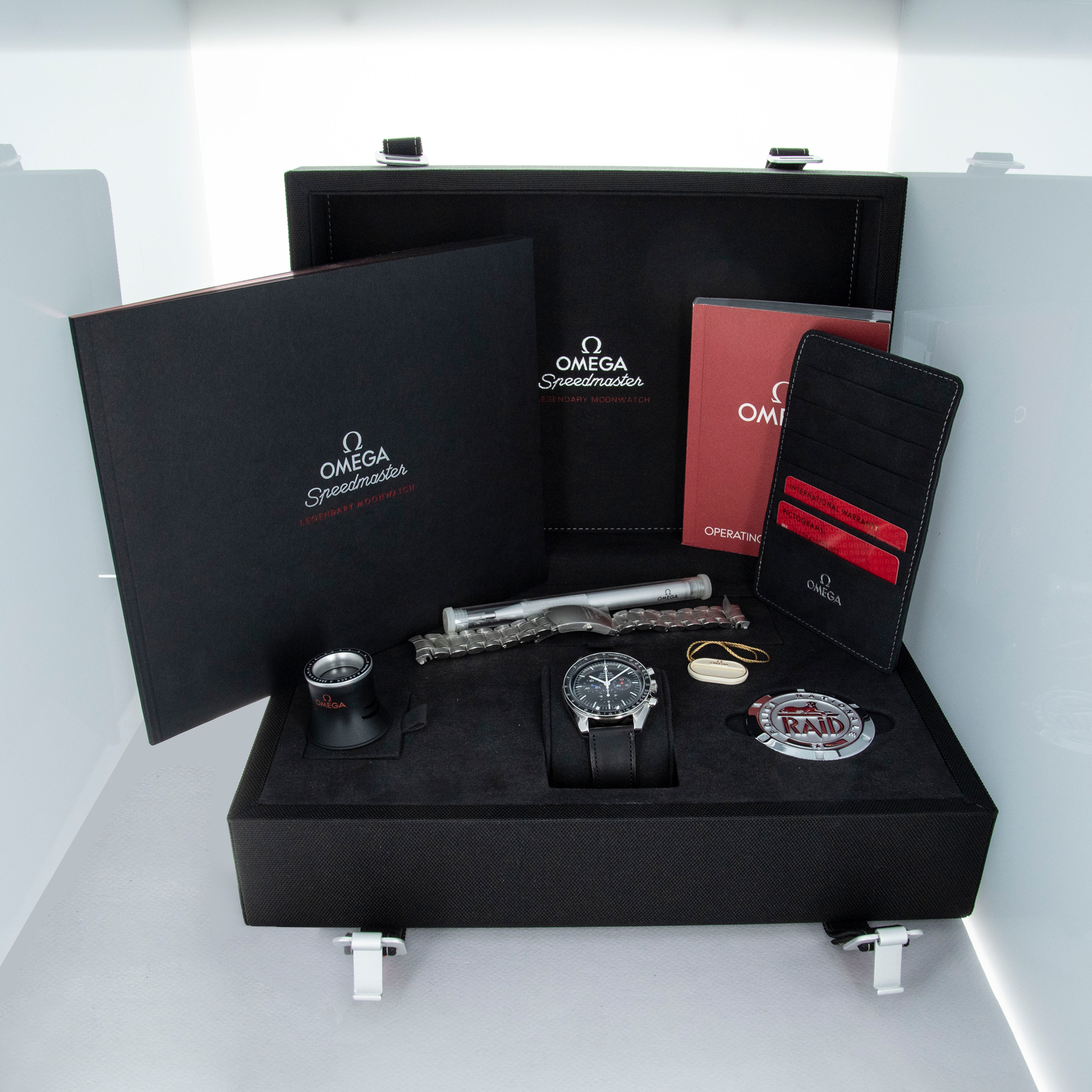 The watch is in new condition. It comes as a full set, including an unworn full-link bracelet, two spare straps, an Omega loupe, an additional special RAID case back, and all guarantees and paperwork.