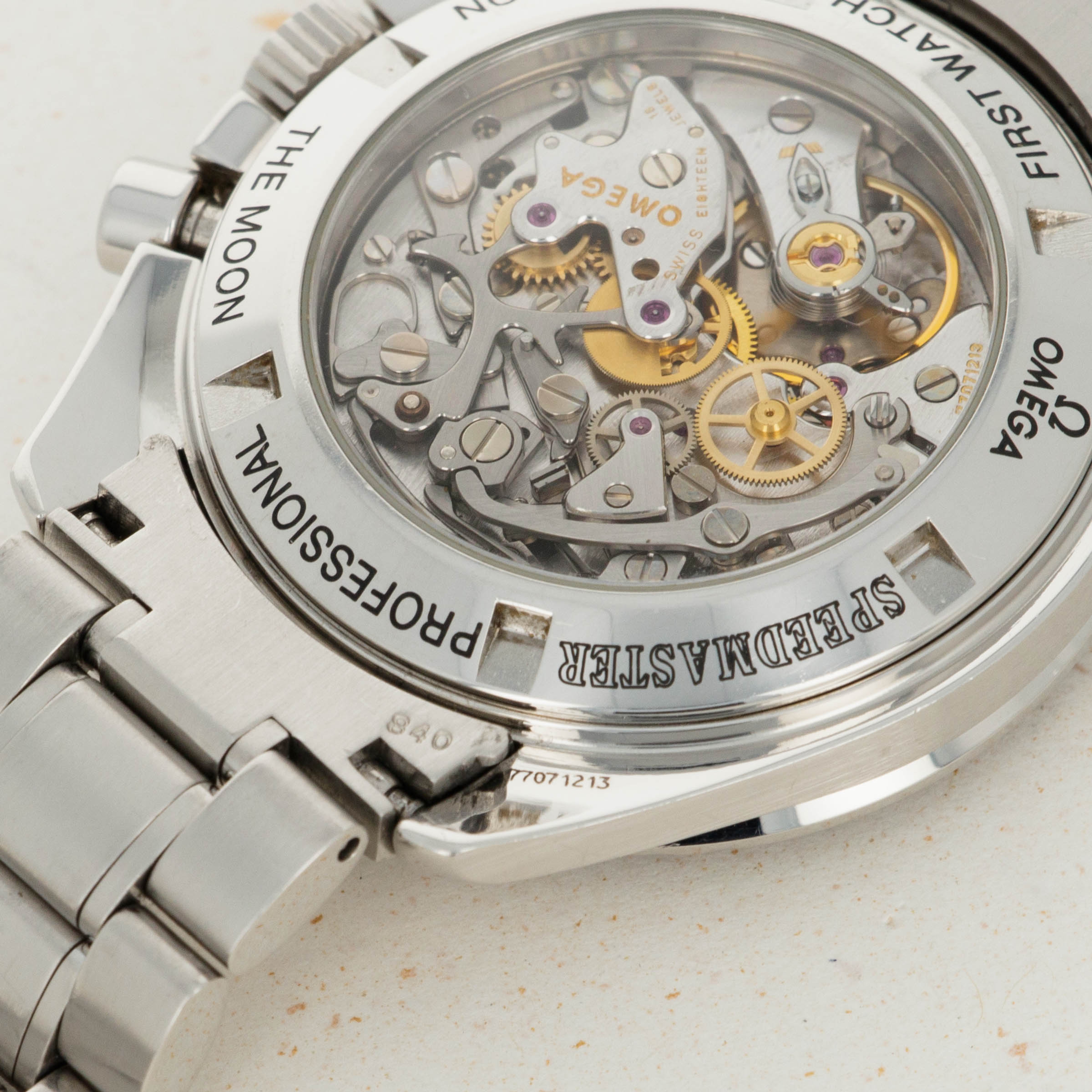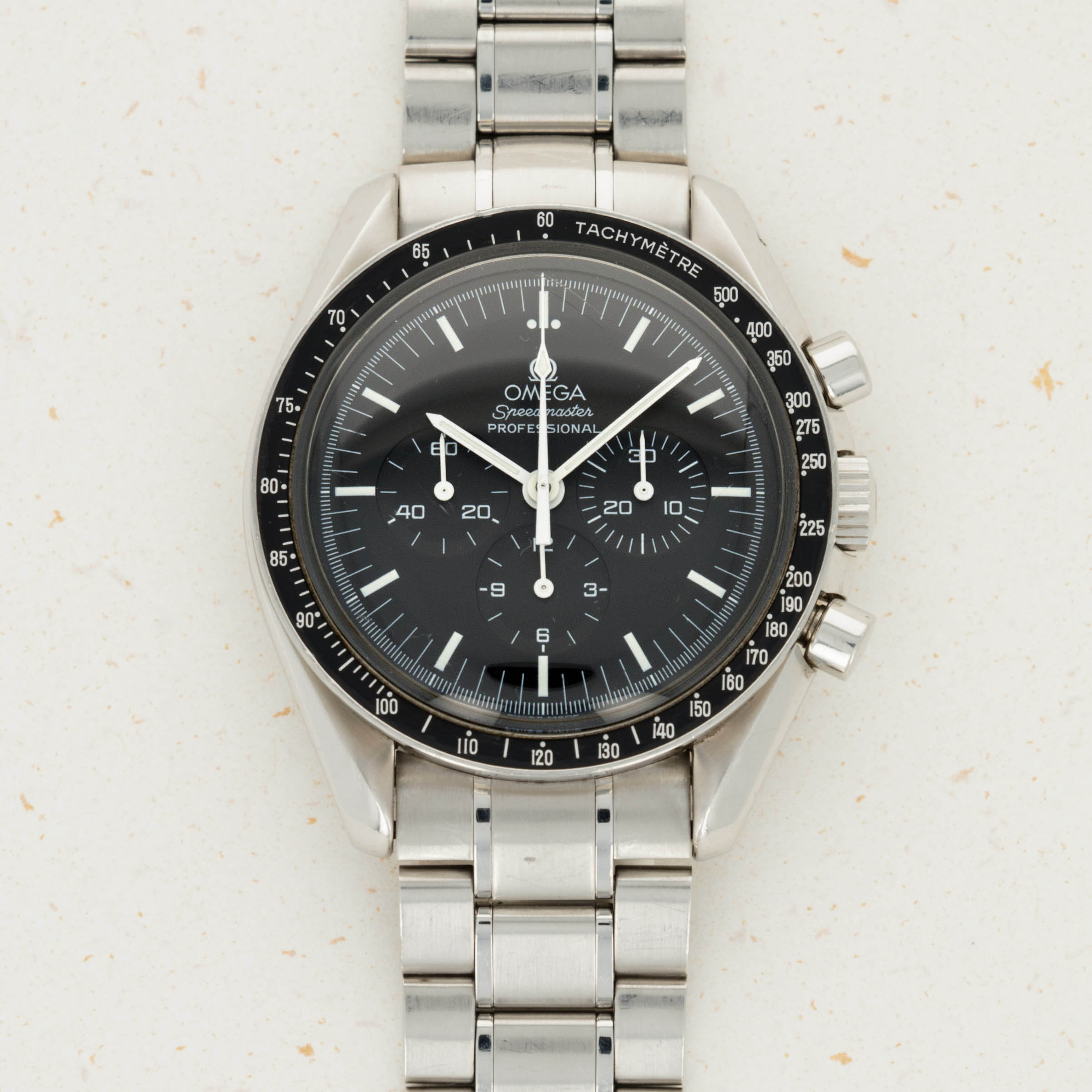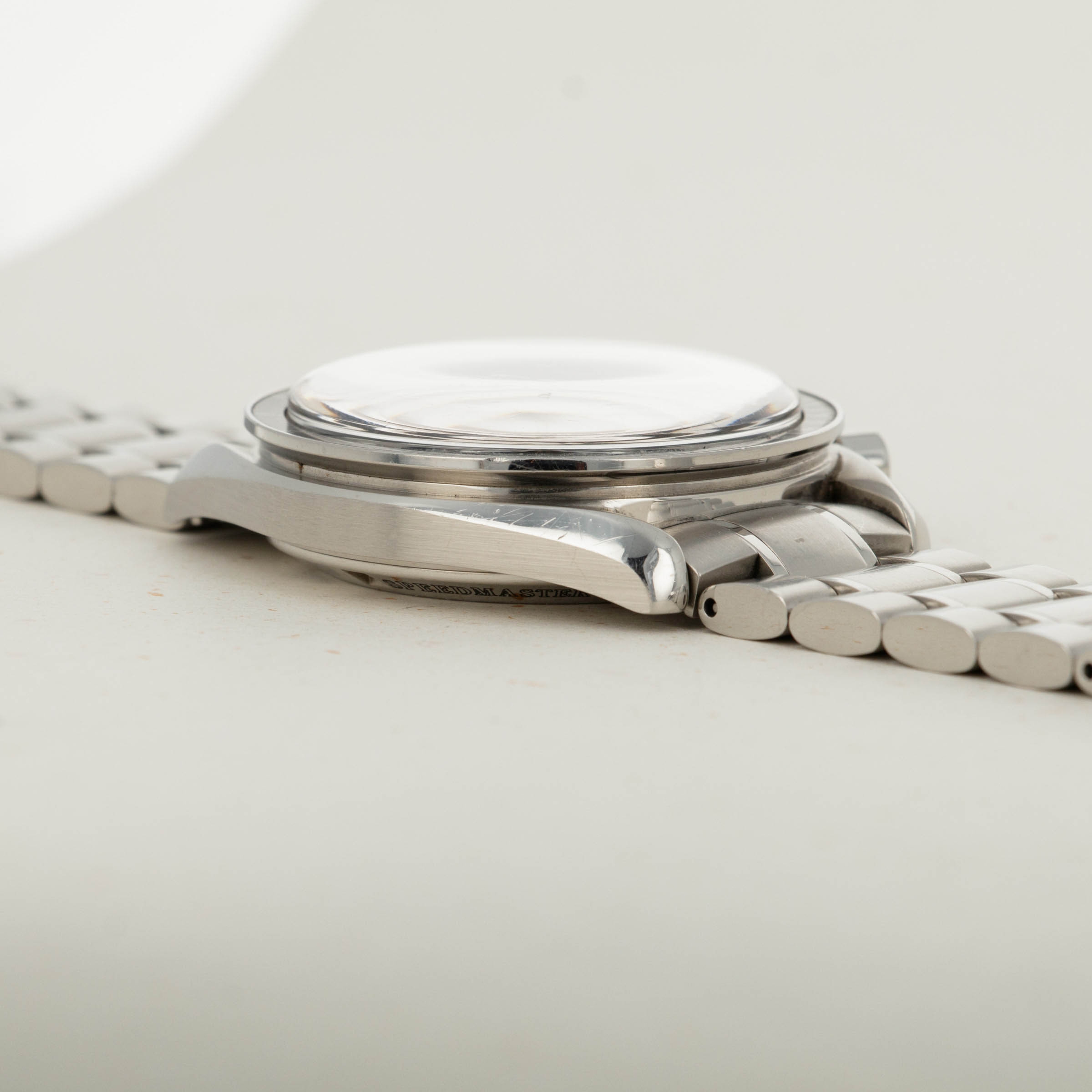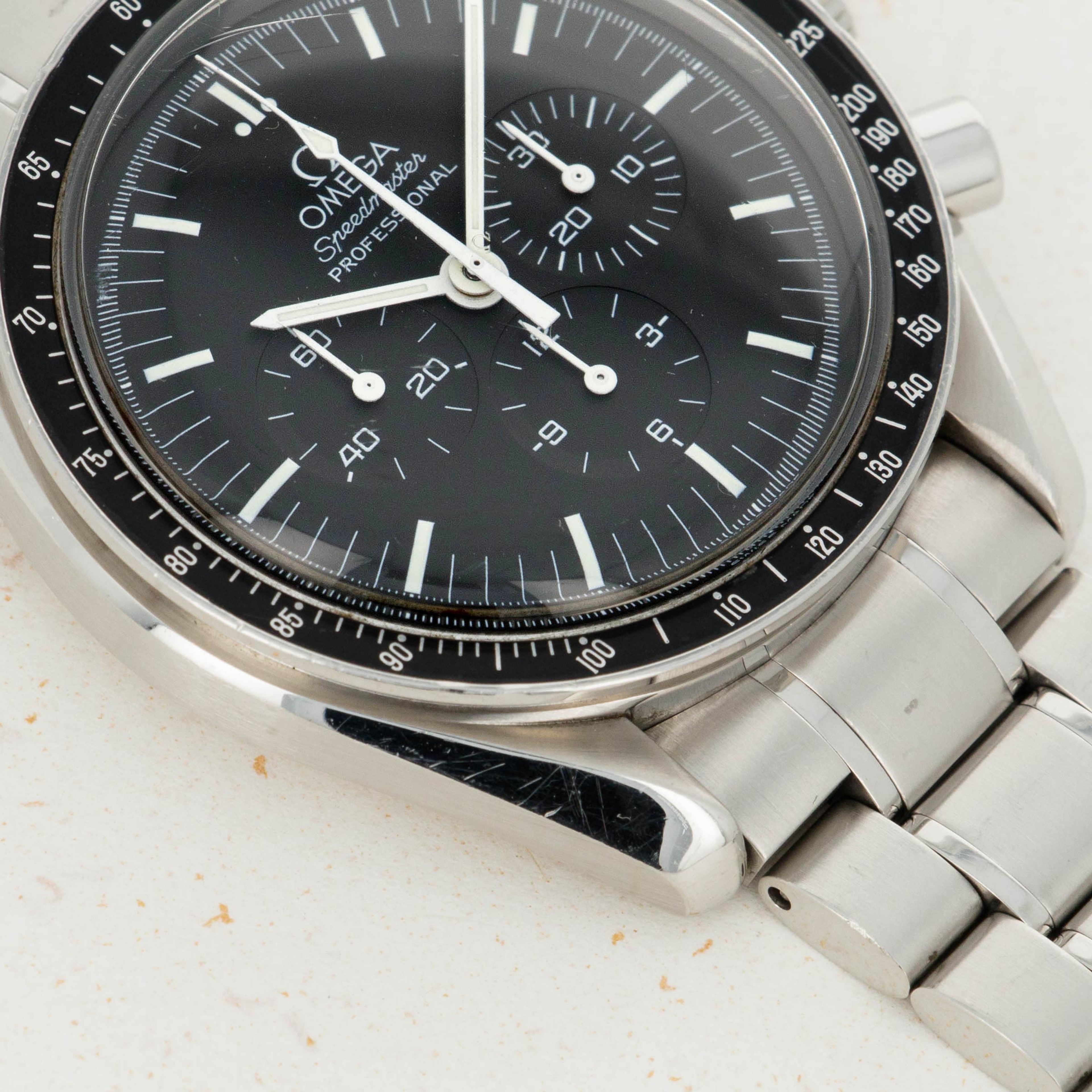 Released in 1957 and based on their earlier chronographs from the 1920s and '30s, the Omega Speedmaster is one of the most iconic chronographs ever. Named after the purpose of the tachymeter along its bezel, the Speedmaster was designed for race car drivers and pilots to time events and make rapid calculations. While these adrenaline-fueled activities might not be for the faint-hearted, they weren't what made the Speedmaster so iconic - that was its use in space and on the Moon. Following a gruelling series of tests with several competing brands, the Speedmaster debuted in space as a piece of NASA standard-issue equipment during the Gemini program of 1965. Today the Speedmaster has many forms, but the Moonwatch is by far the most iconic, with its design standing as the prototypical look of the Speedmaster. Of course, like many other areas of collecting, there are many idiosyncrasies within watch collecting, namely the desirability of visually similar traits, a perfect example of one being the Speedmaster’s hesalite crystal. More authentic to the original Moonwatches that the Apollo astronauts wore, the hesalite crystal versions of the Speedmaster carry that heritage rich look and feel, but with their solid casebacks they refrain the owner from viewing their movement, until the ref. 3572.50 that we have here. Launched in the 1990s, the ref. 3572.50 merged the Moonwatch’s signature hesalite crystal with a sapphire crystal exhibition caseback that provides the best of both worlds for the Speedmaster’s fans, with an unencumbered view of the Speedmaster’s manual-wind cal. 1863 movement, and the vintage look and feel that collector’s love through the hesalite crystal sitting atop its black dial.