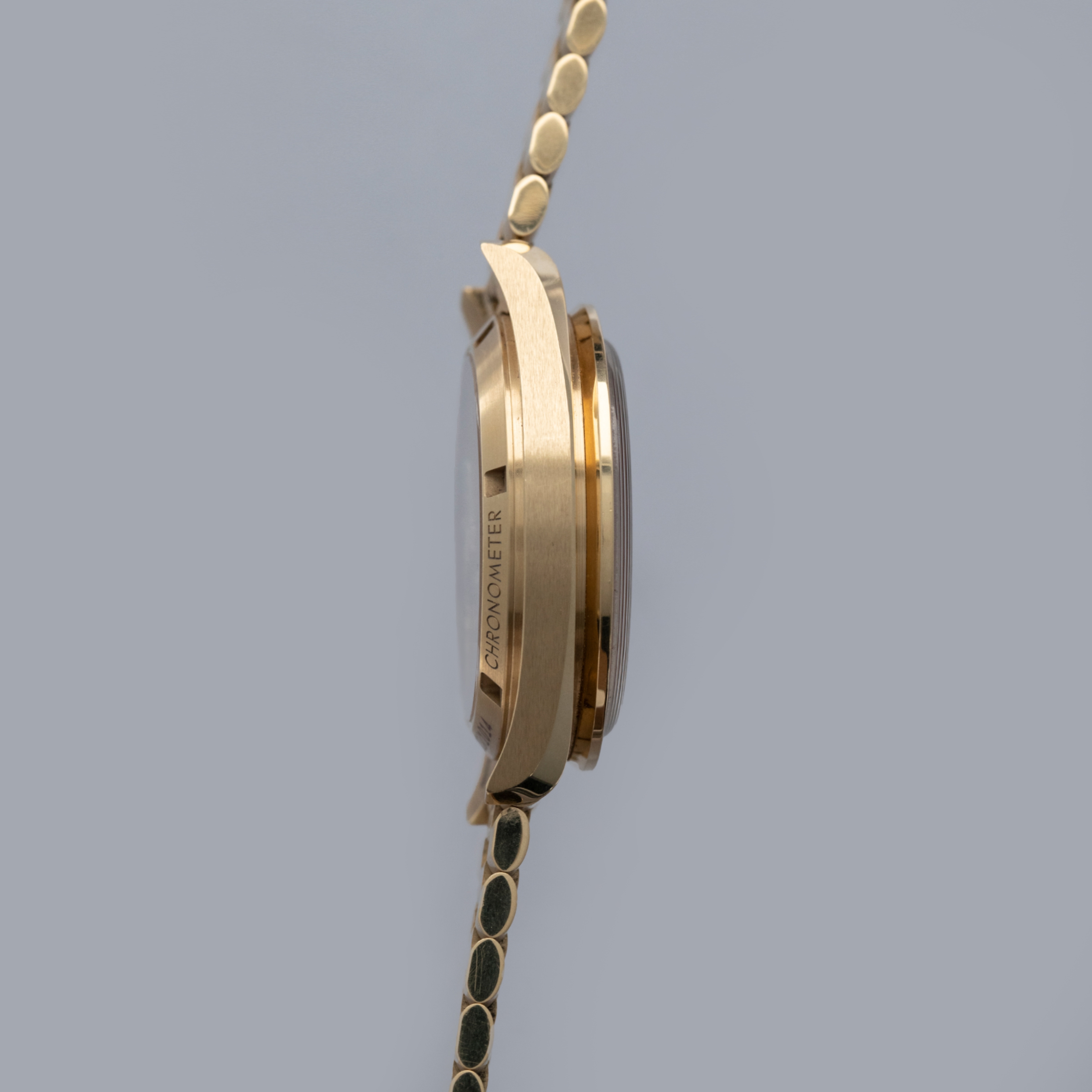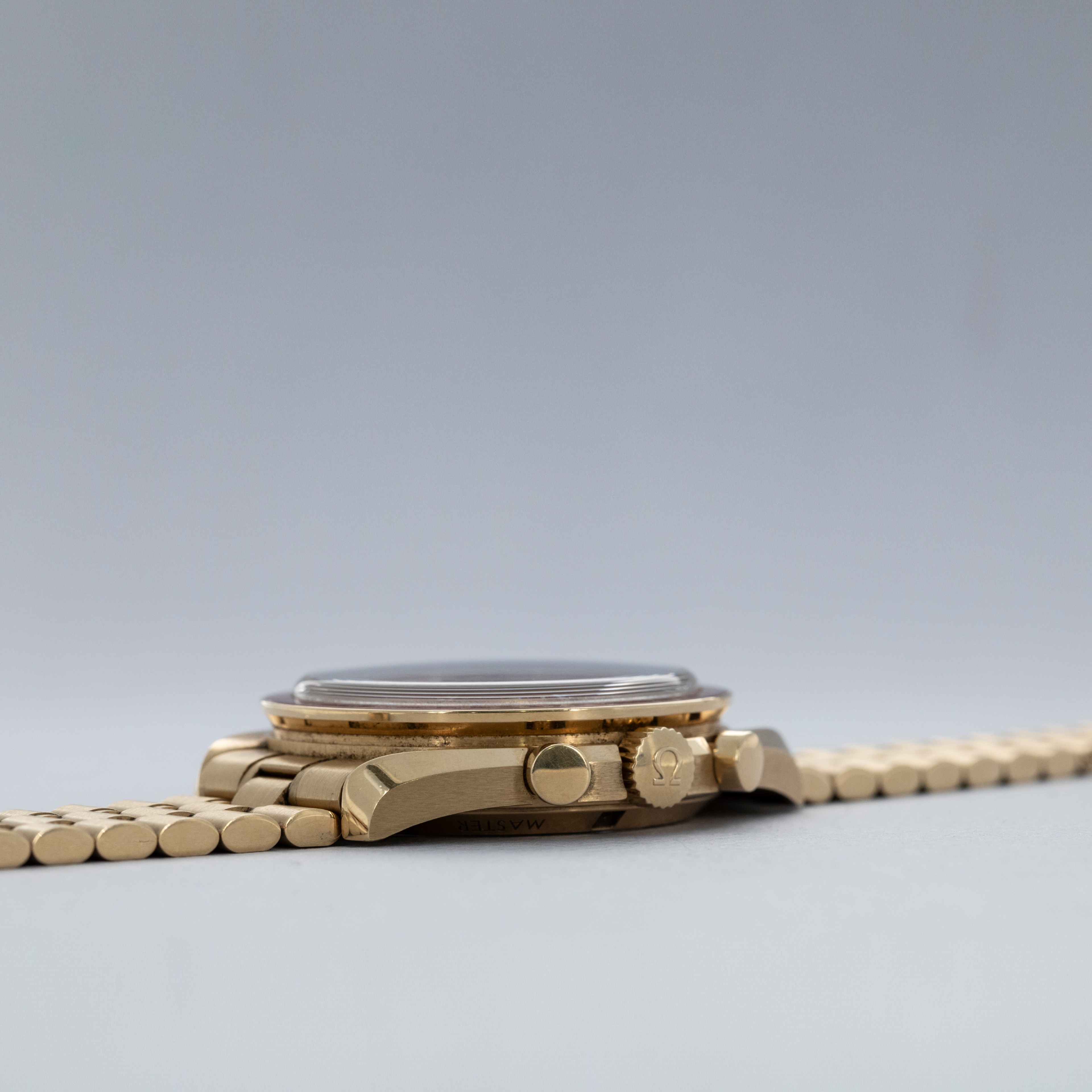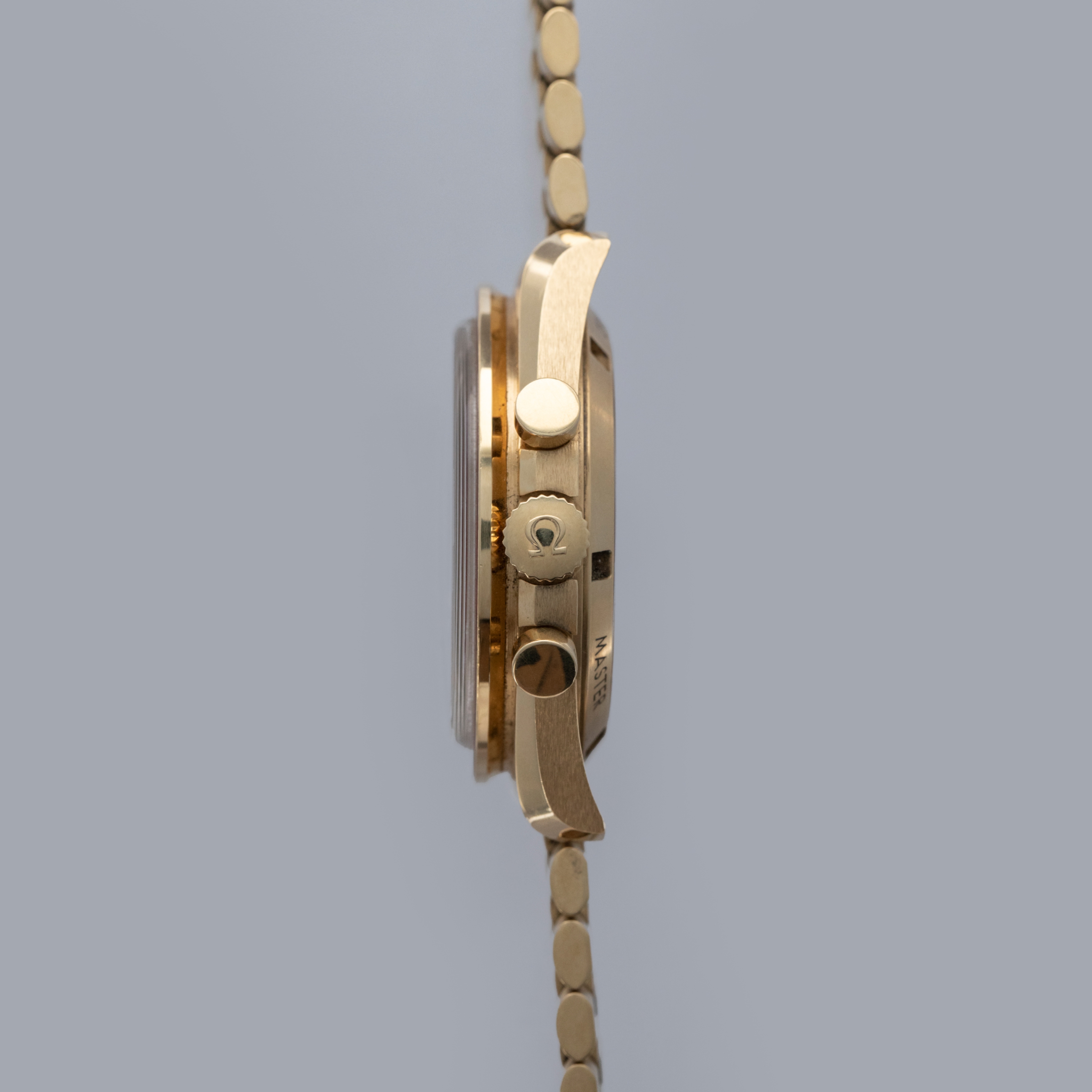 Offering a faithful modern interpretation of the ref. 145.022's construction, this Speedmaster's 42mm case and stunning bracelet are all made of 18kt yellow gold, but its burgundy aluminum bezel insert is swapped for a modern ceramic one.
