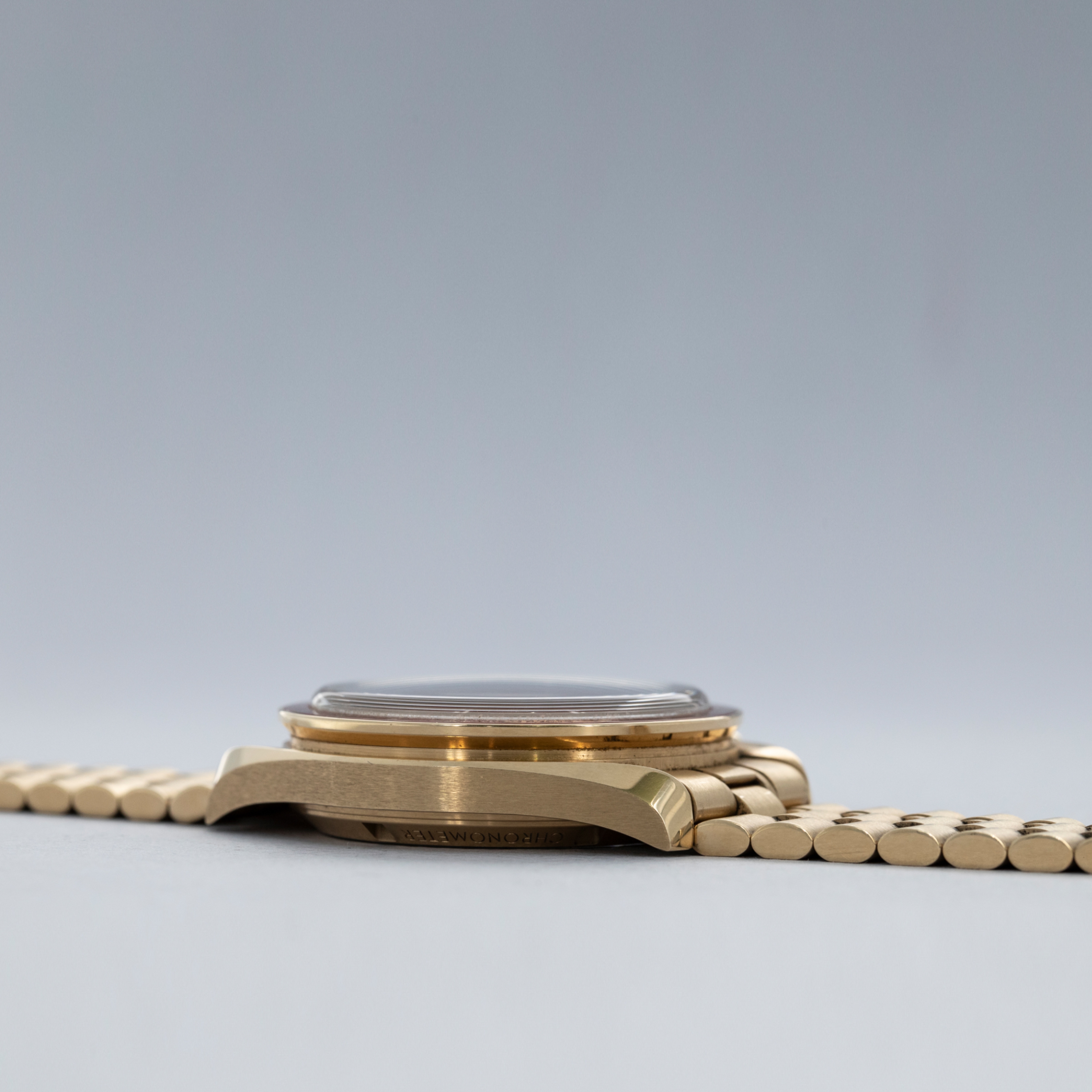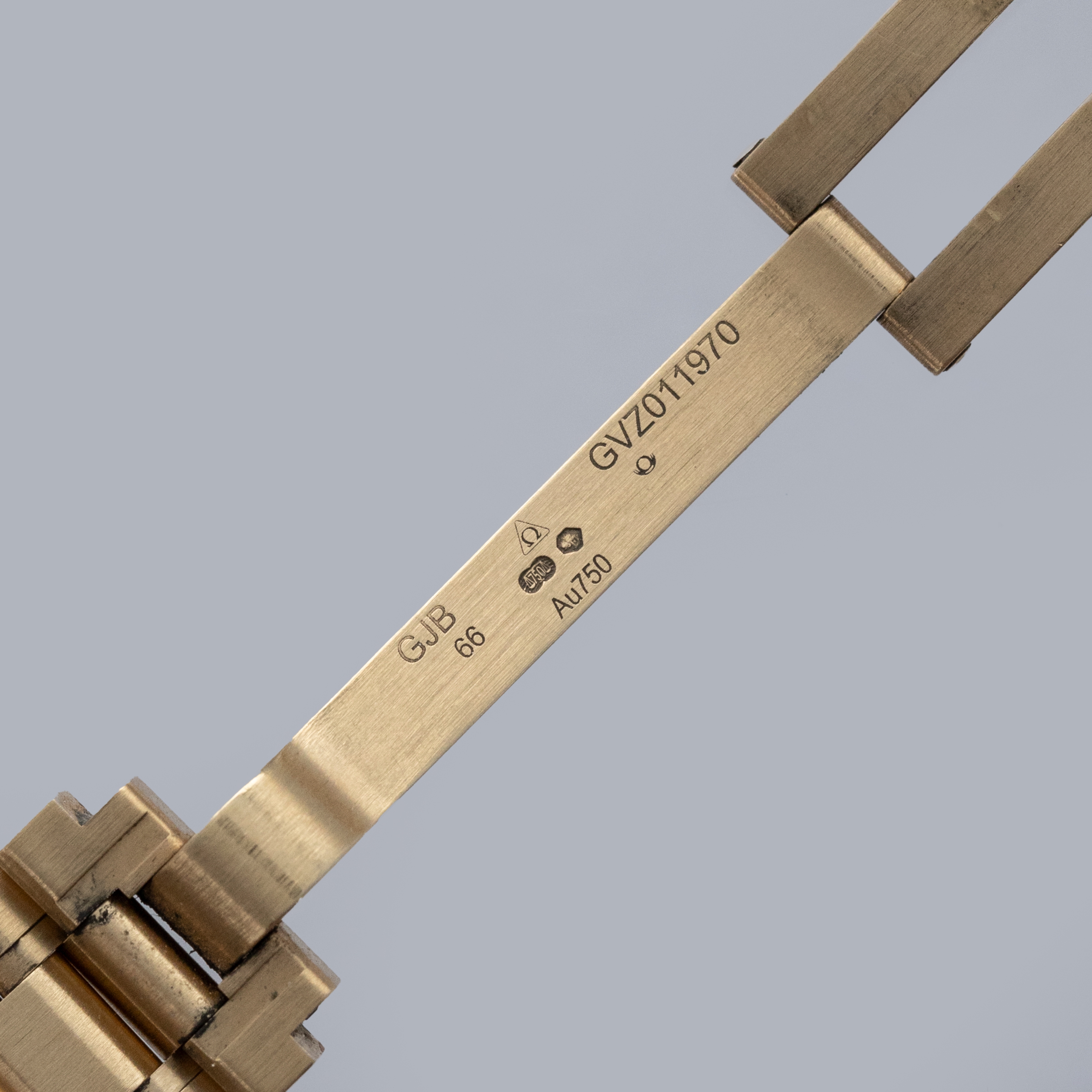 The watch is in overall near-mint condition. The yellow gold case has some light marks from wear but remains very sharp. The display case back is very clean. The dial is pristine. The bracelet has some very light surface scratches on the clasp and some marks between the links, which have negligible play. The bracelet currently fits an 8 1/4” wrist and has 24 links, 10 of which are removable. Comes complete with boxes, papers, and warranty cards.