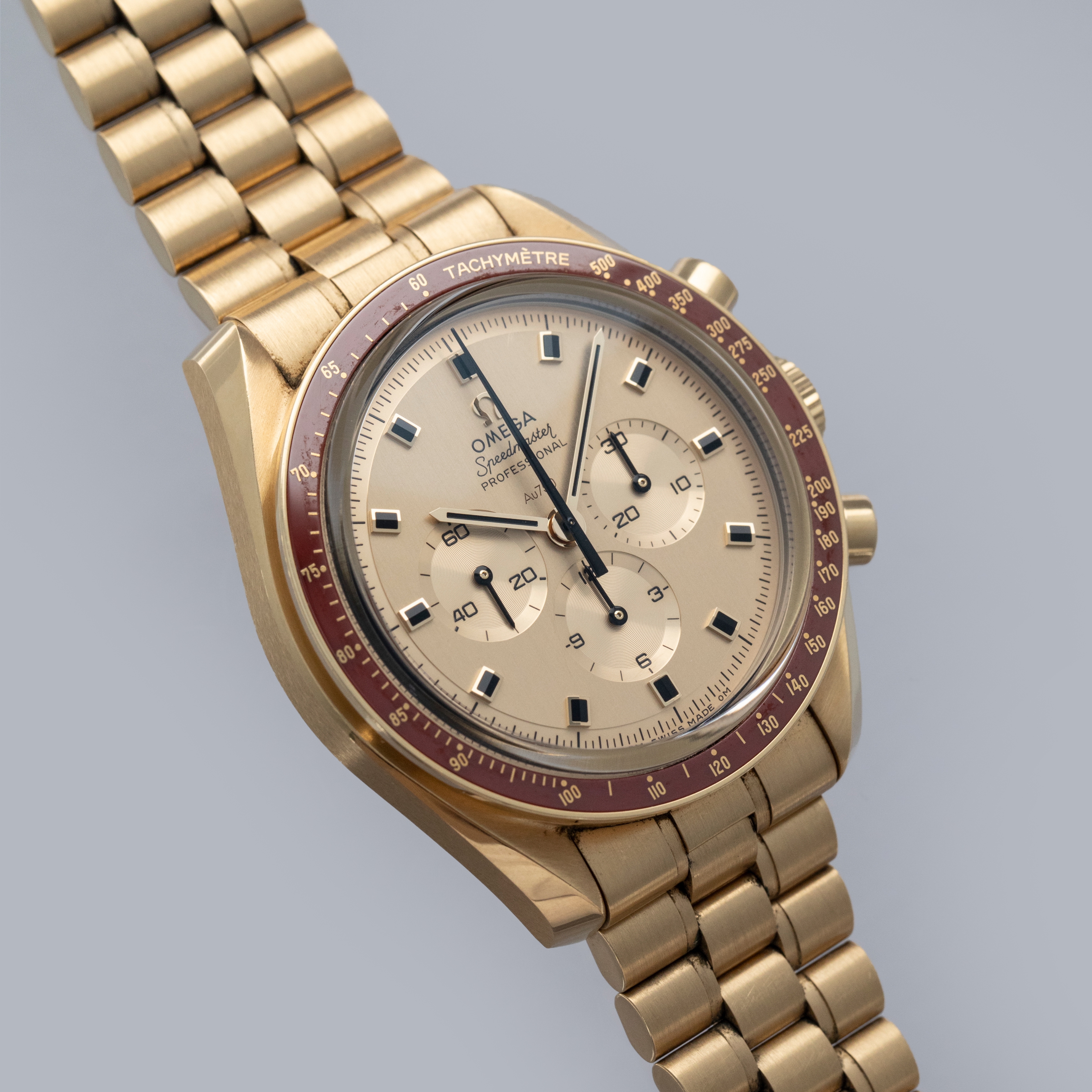 Famed as perhaps one of watchmaking's most universally well-known watches, the Omega Speedmaster became the first timepiece ever to be worn on the moon following Omega's successful bid for the Speedmaster to become NASA's choice timepiece for their standard astronaut kit. After its successful inclusion in the 1965 Gemini program, the Speedmaster also adorned the wrists of the astronauts during the Apollo moon landing missions, and so, in 1969, following Buzz Aldrin's historic steps on the moon (Neil Armstrong left his watch on the lunar module) it became the Moonwatch that we all know and love. After the successful 1969 touchdown on the lunar surface, Omega launched the ref. 145.022-69 as a means to commemorate one of the most legendary moments in human history. Limited to just 1014 pieces, the ref. 145.022-69 swapped the Speedmaster's usual stainless steel construction for one of luxurious 18k yellow gold, with a suitably golden dial and brownish-red tachymetre bezel insert. Launched to commemorate the 50th anniversary of that very watch, Omega debuted the Speedmaster ref. 310.60.42.50.99.001 that we have here in 2019, also made to 1014 pieces. Boasting an entirely faithful design to the original, the ref. 310.60.42.50.99.001 features a 42mm Moonshine gold case - Omega’s proprietary 18kt yellow gold alloy – and the same suitably golden dial and brownish-red tachymetre bezel insert, except now made of ceramic. A stunning celebration of Omega’s history, this is the ultimate Speedmaster.