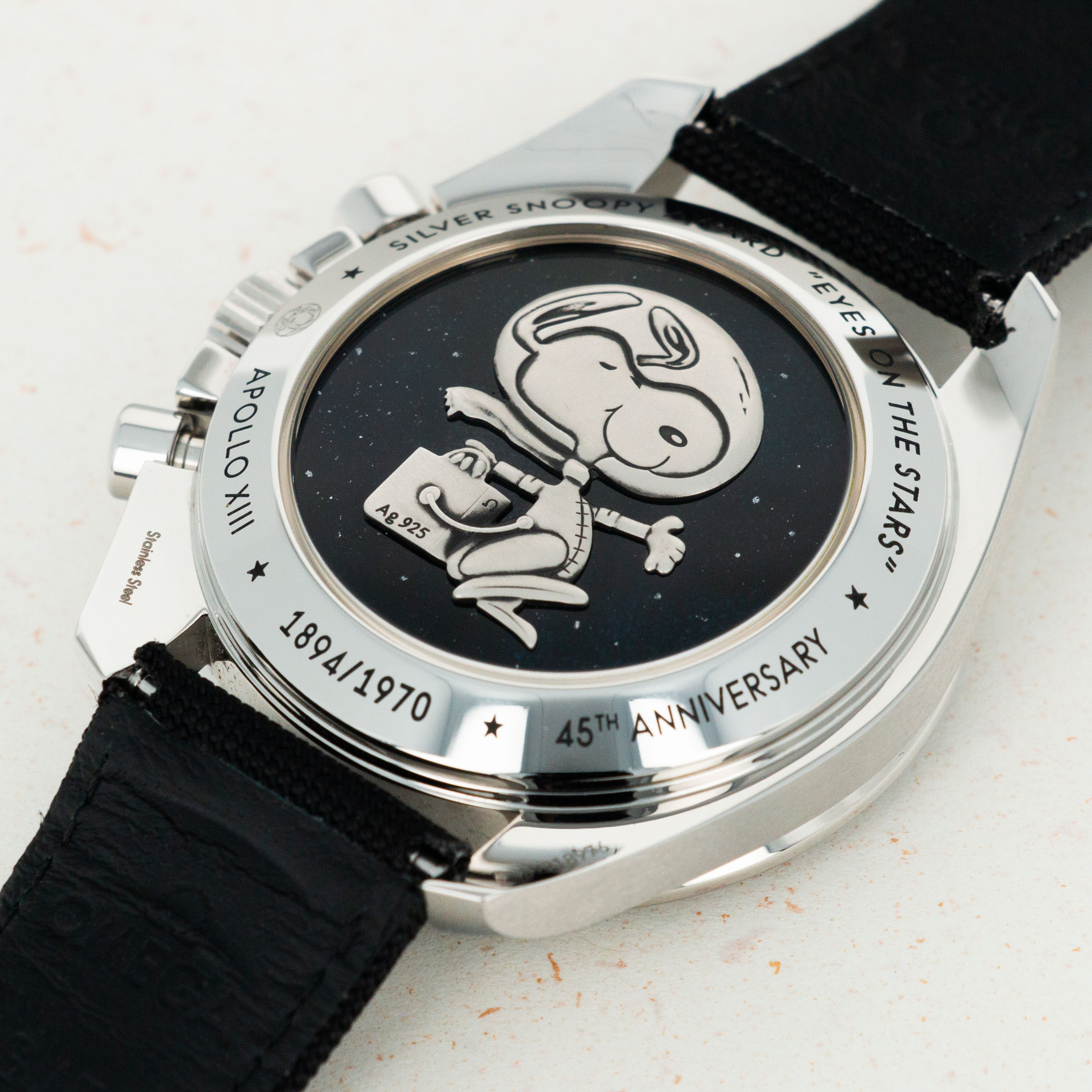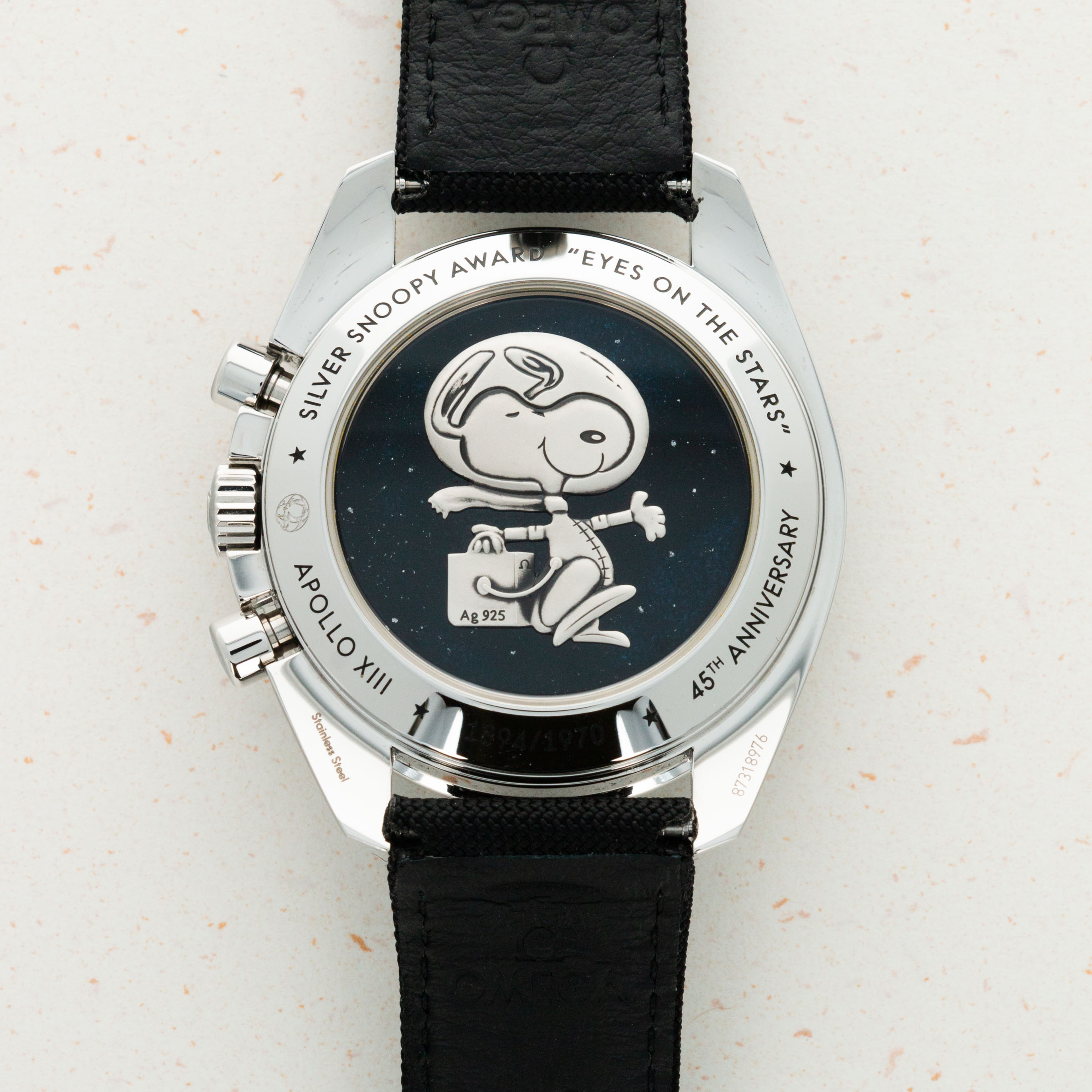 The caseback is embedded with a .925 sterling silver Snoopy pin, which is affixed upon a blue enamel background with silver flecks. This is not original to the Silver Snoopy Awards, which were given to Apollo 13 astronauts.