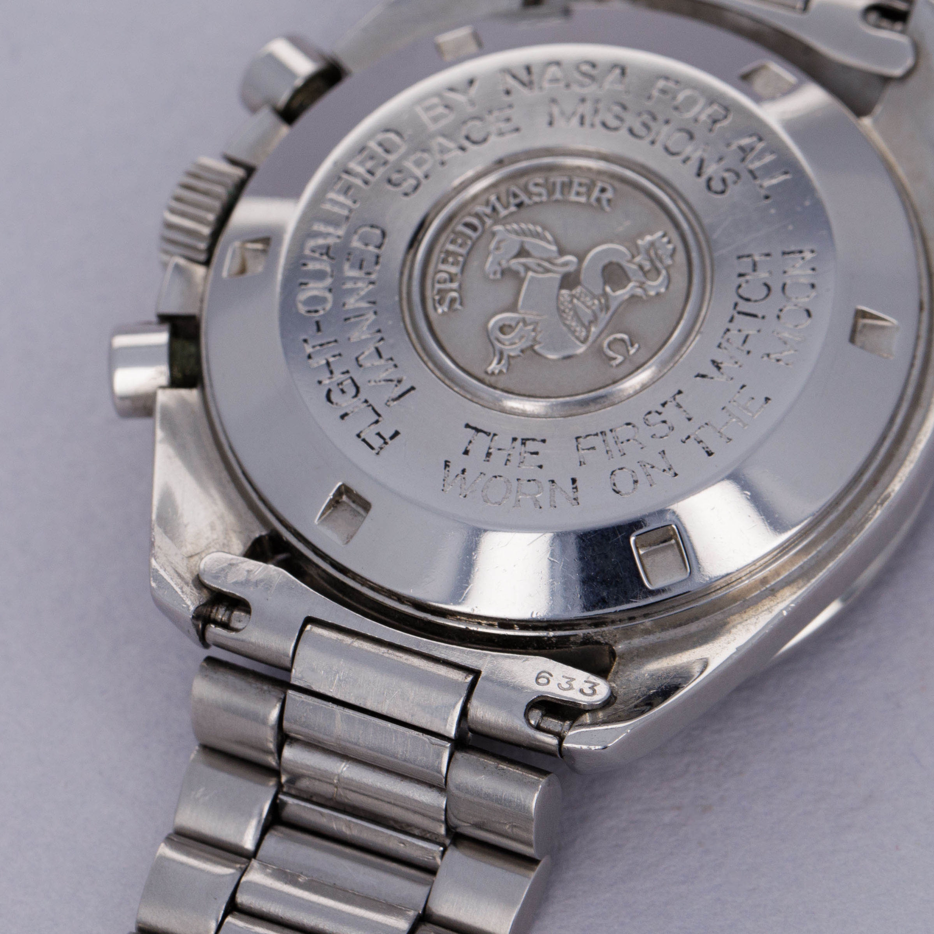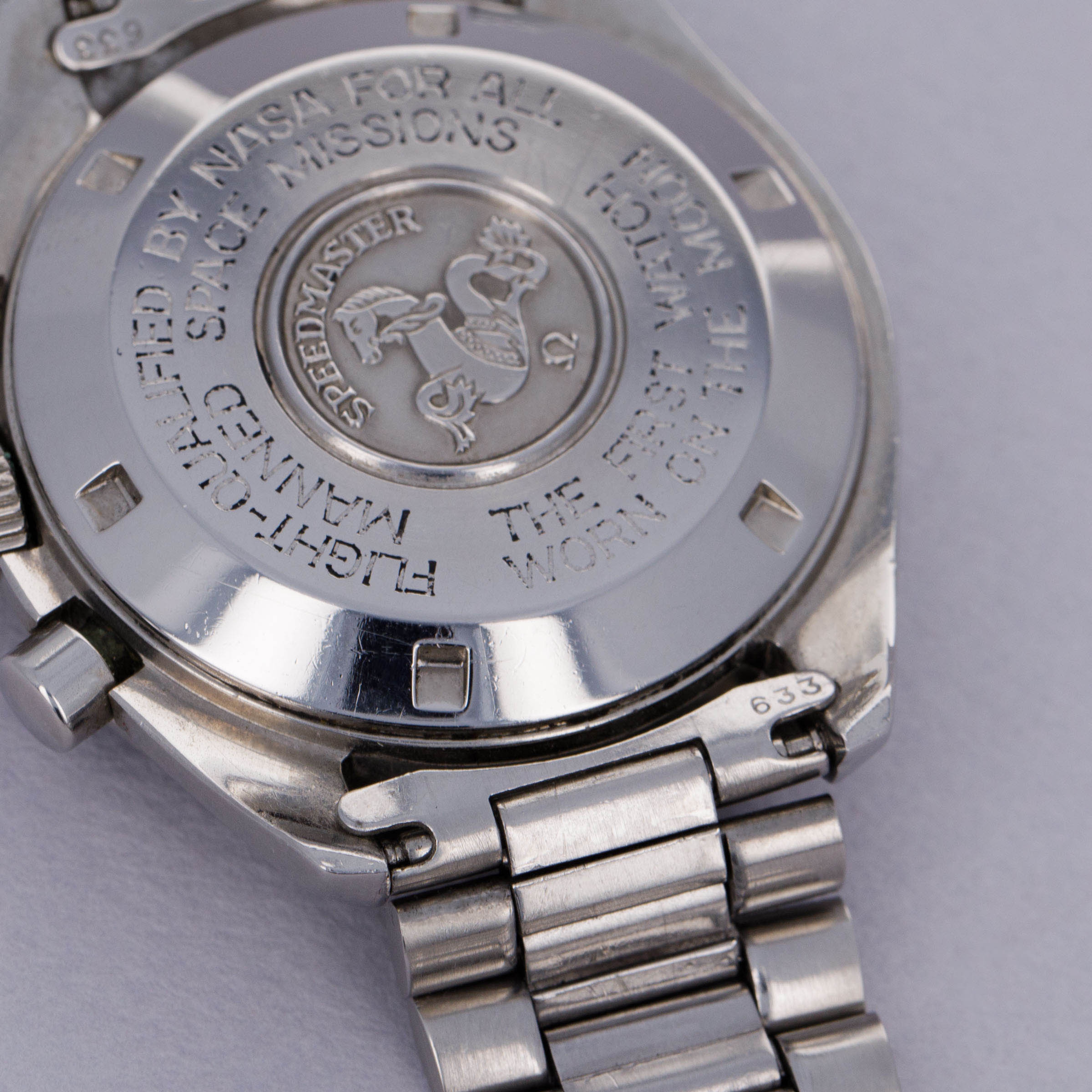Identifying it as a ref. 145.022-76, this example's caseback commemorates the Speedmaster's NASA certification and its subsequent use during the Apollo Moon landings.