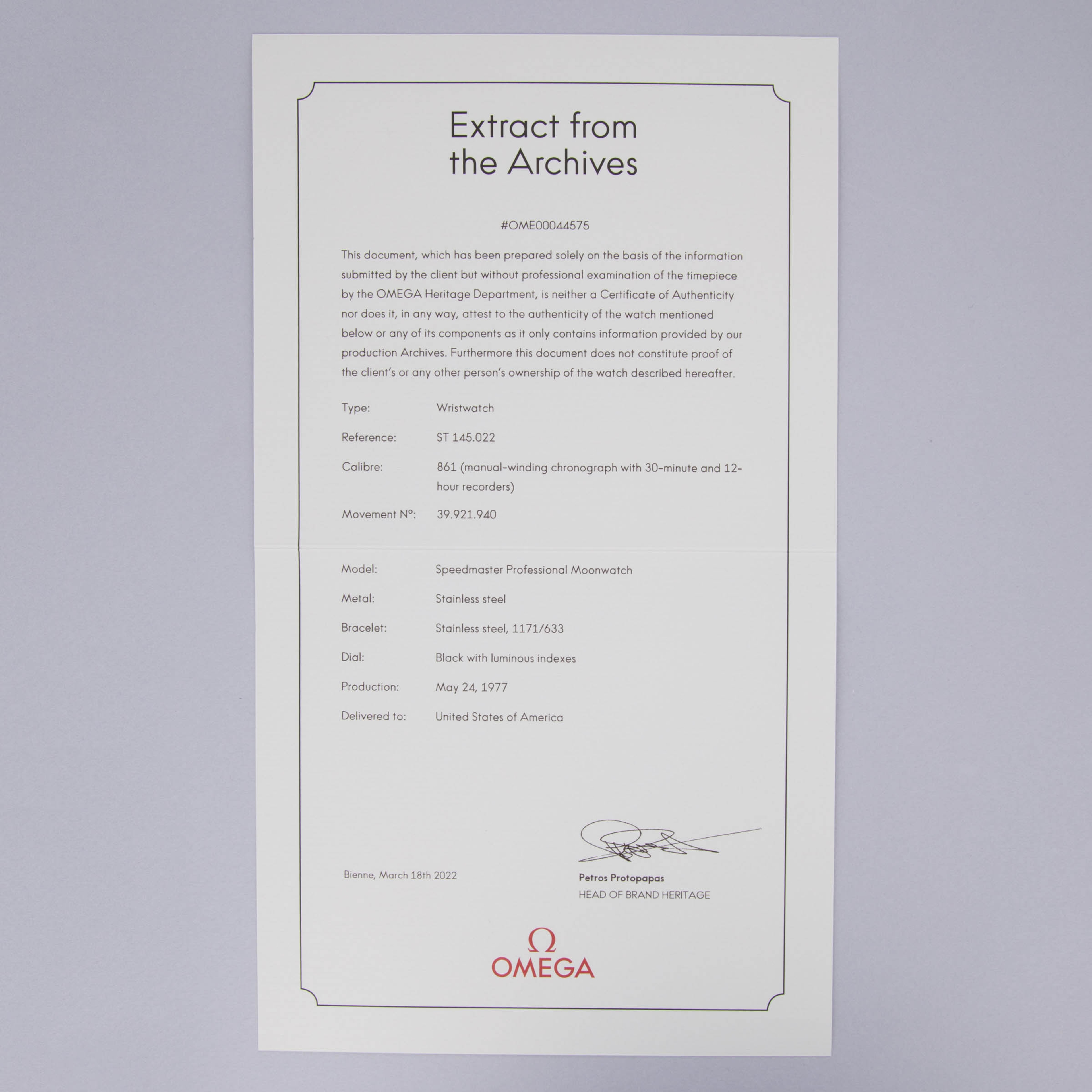 Omega Speedmaster Professional ST 145.022 Original Box and Extract of the Archives