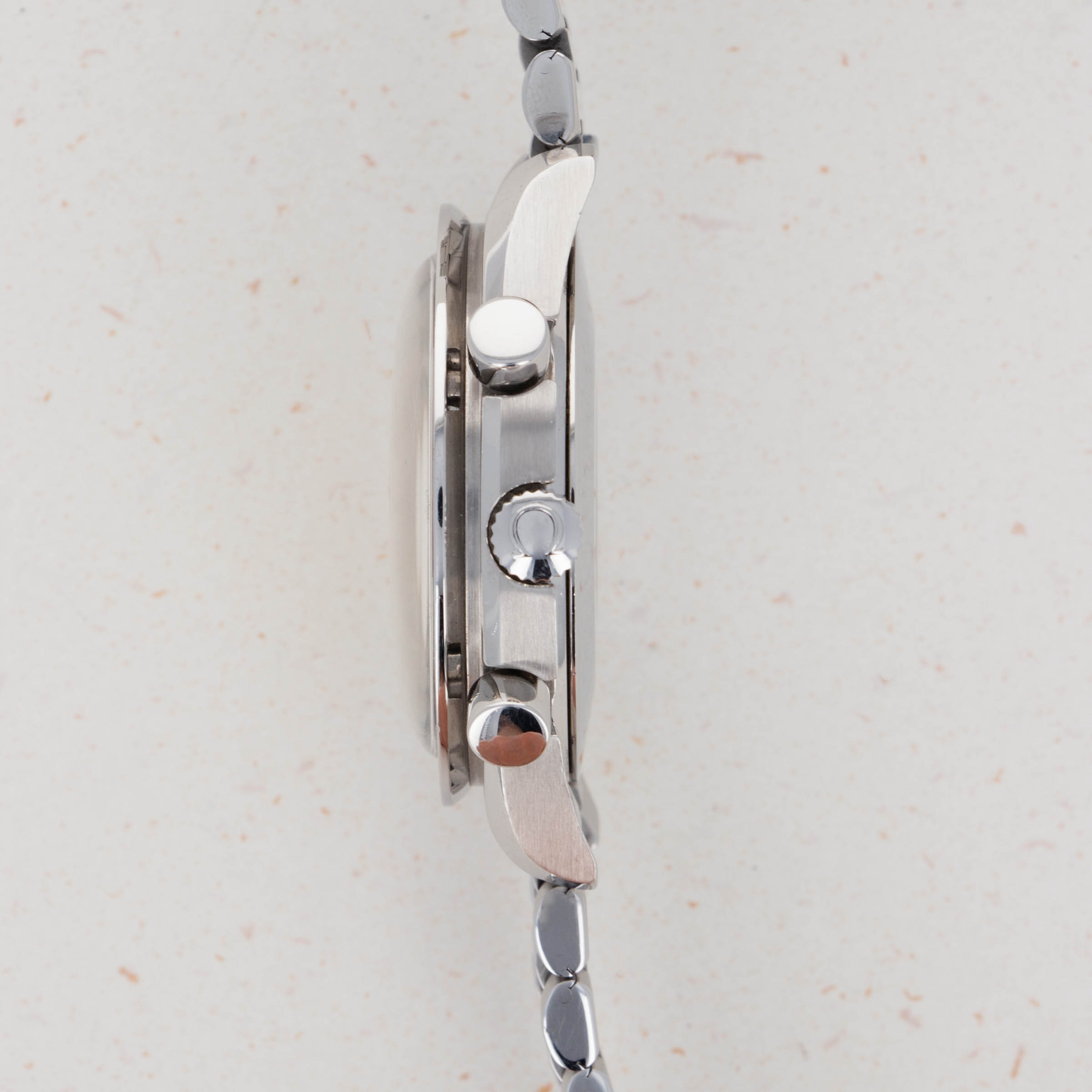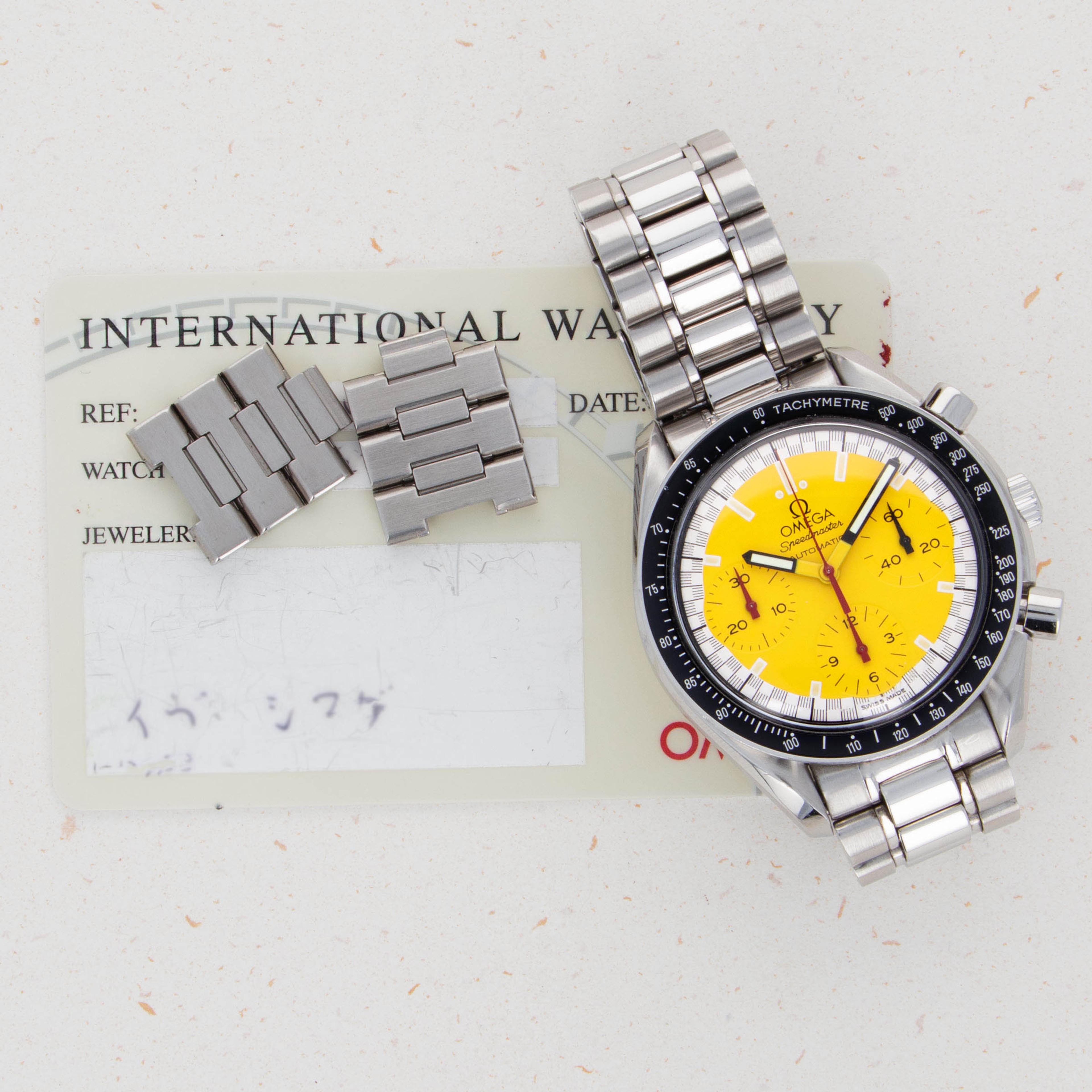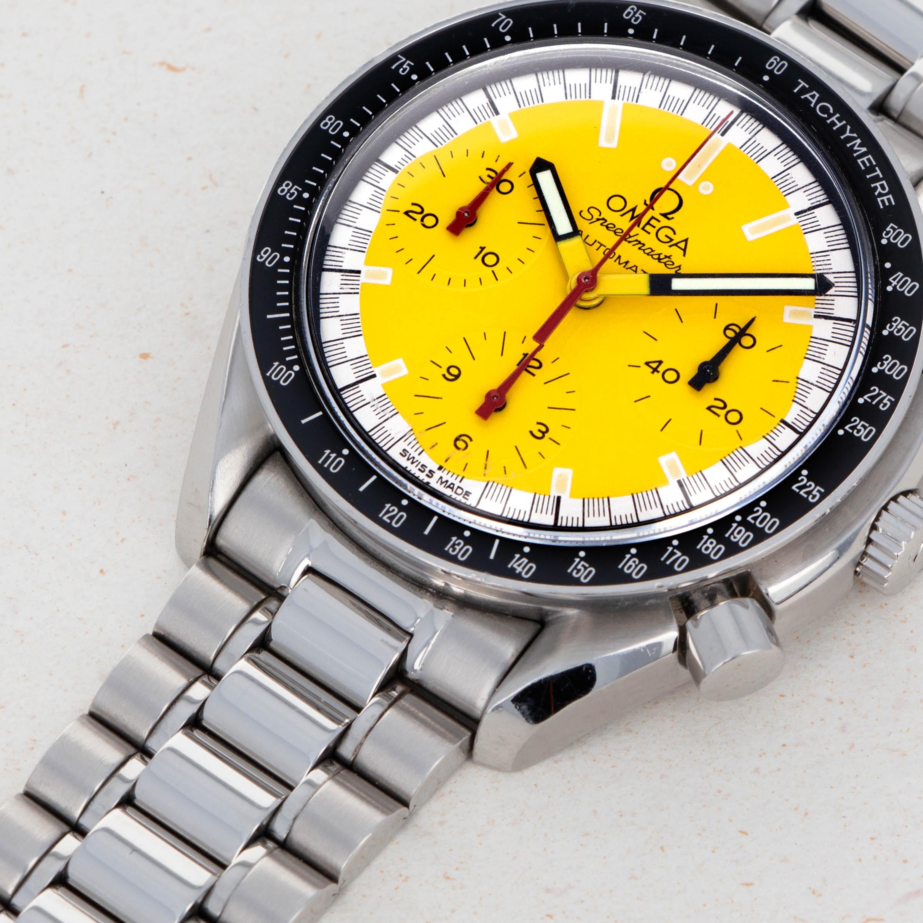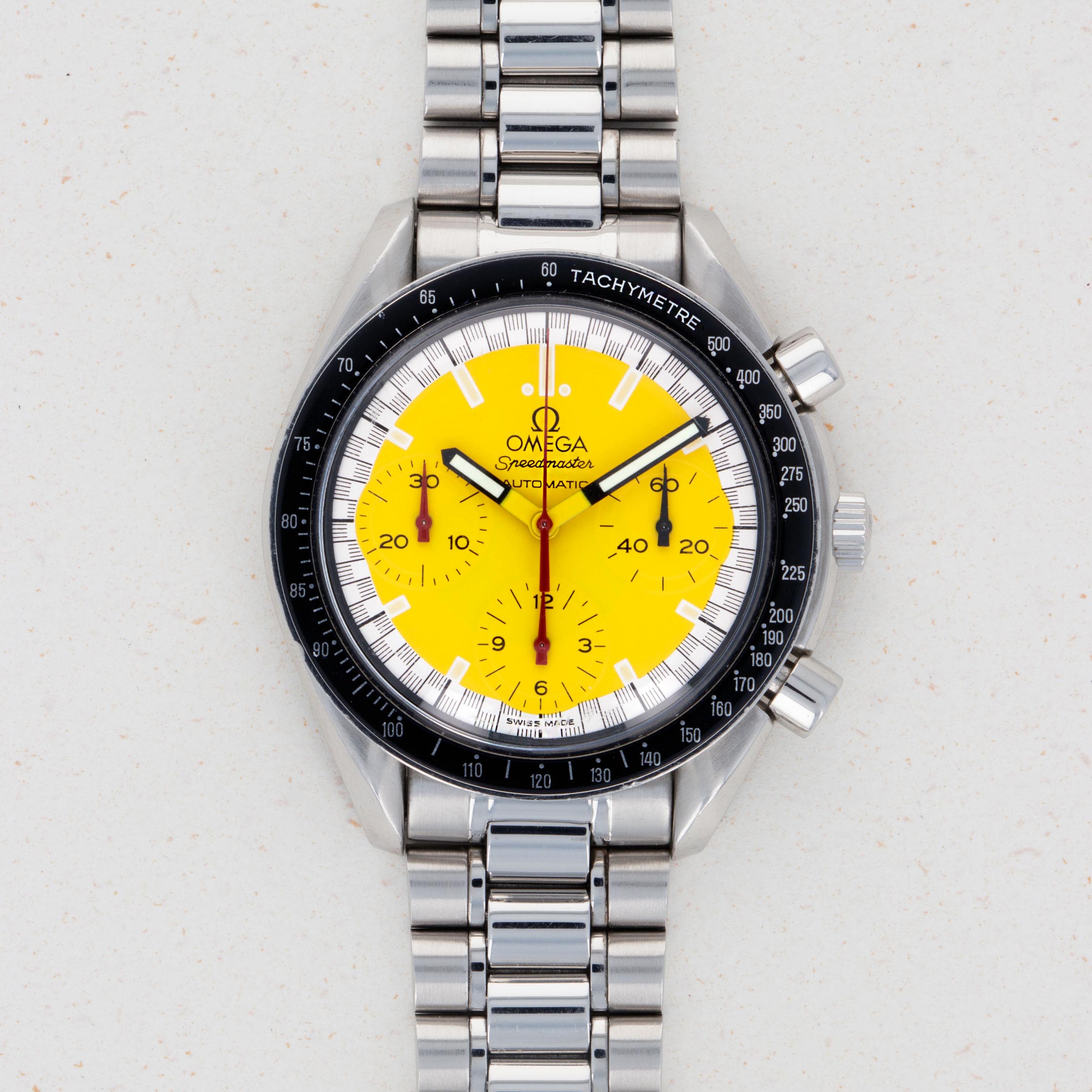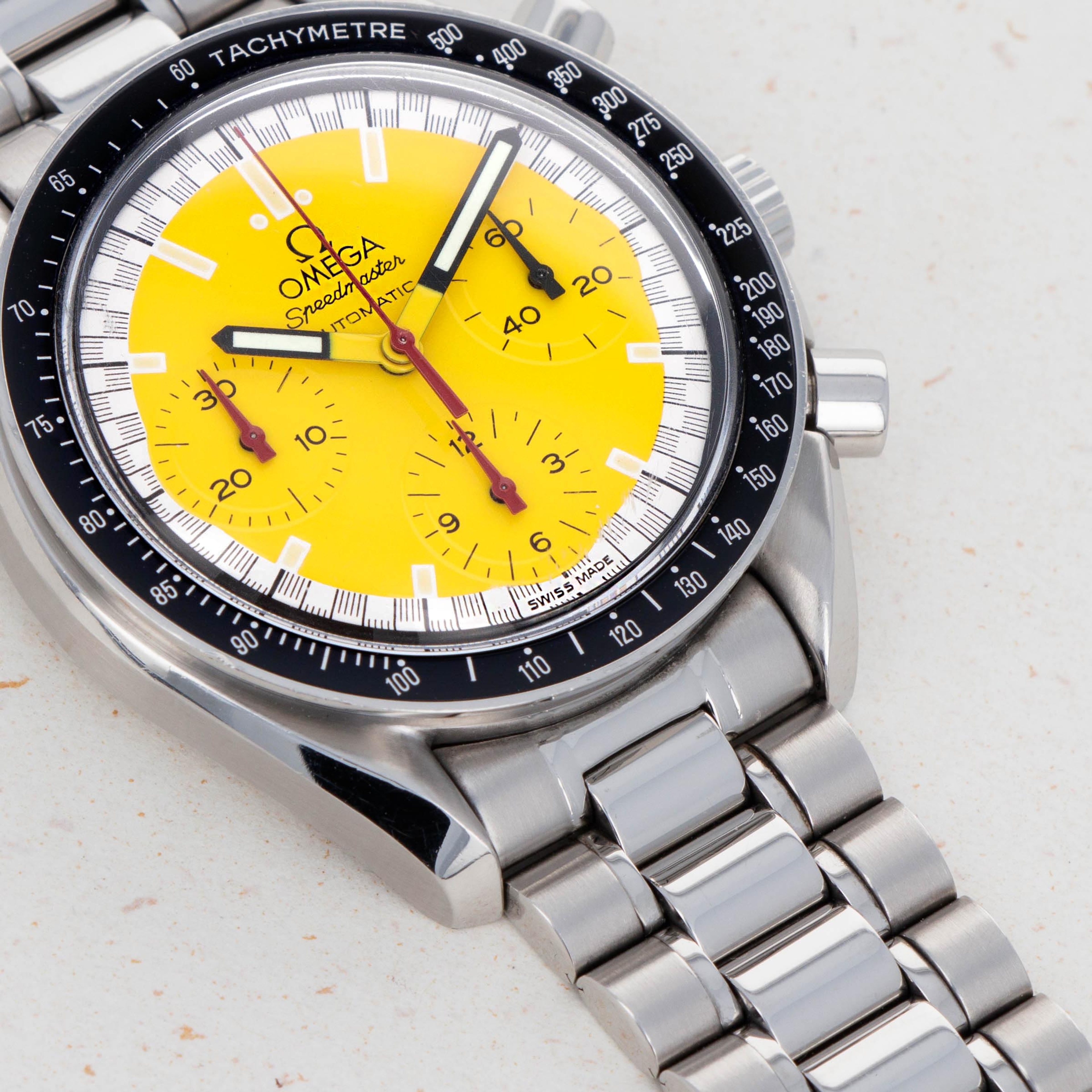 Linked to iconic F1 world champion, Michael Schumacher, the Omega Speedmaster Reduced ref. 3810.12.140 features the Speedmaster Reduced’s usual 39mm stainless steel case and movement in collaboration with a unique yellow dial design that pays homage to Michael and his time with Jordan Grand Prix. With its yellow center, thick white chapter ring, and large white indices, the ref. 3810.12.140 is a wonderfully legible timepiece that is immediately recognizable on the wrist. Featuring ‘ghost’ hands that float above the dial as their stem blends into the dial, the ref. 3810.12.140 is an interesting timepiece to enjoy as its dial design is that little bit more unusual. With black chronograph hands enhancing legibility and toning down the Speedmaster’s tool watch design that little bit more, the ref. 3810.12.140 is a colorful timepiece that celebrates the early days of Schumacher's iconic career.
