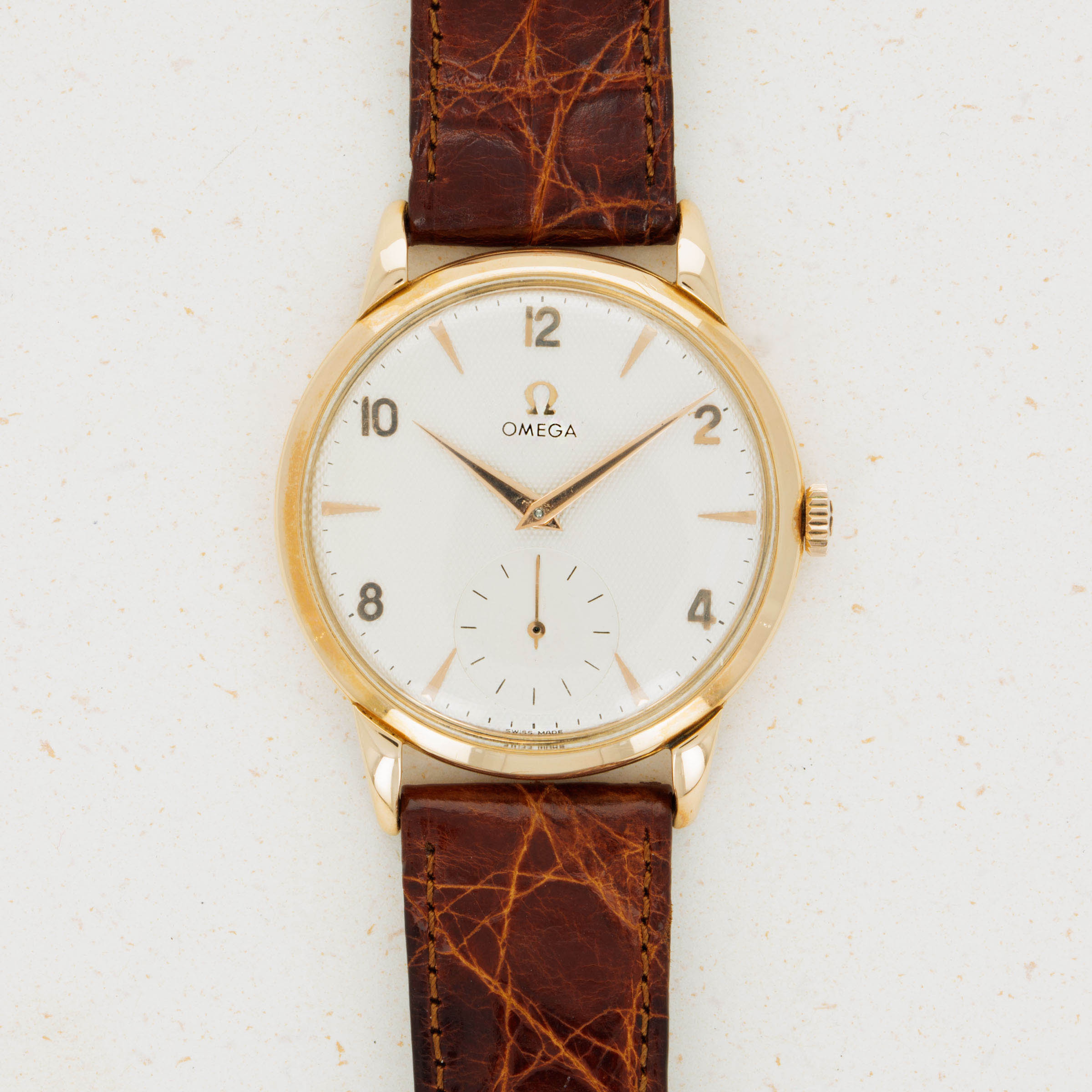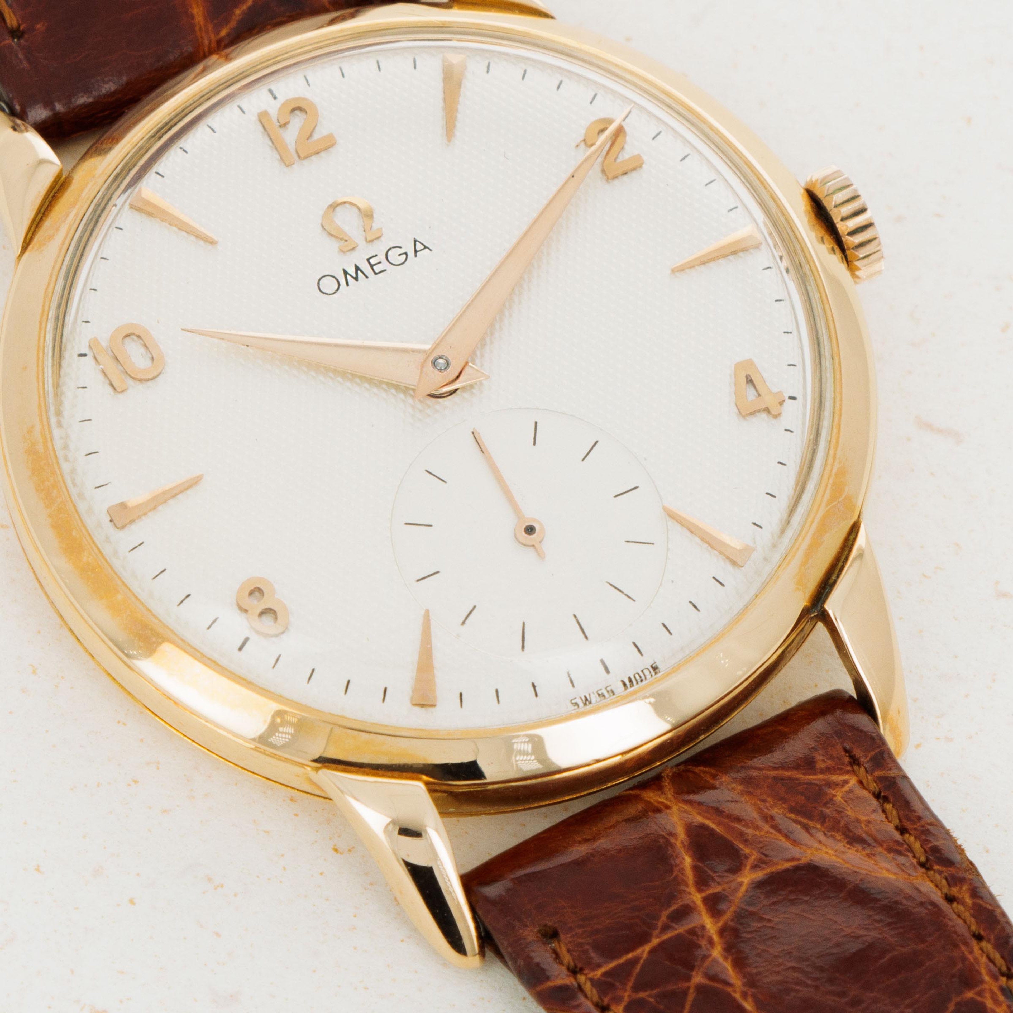 Watch is in overall very good condition. The case has full lugs with soft edges that show moderate wear over time. The dial has been refinished/restored, and has a textured finish to it. The watch comes with a plated Omega signed buckle.