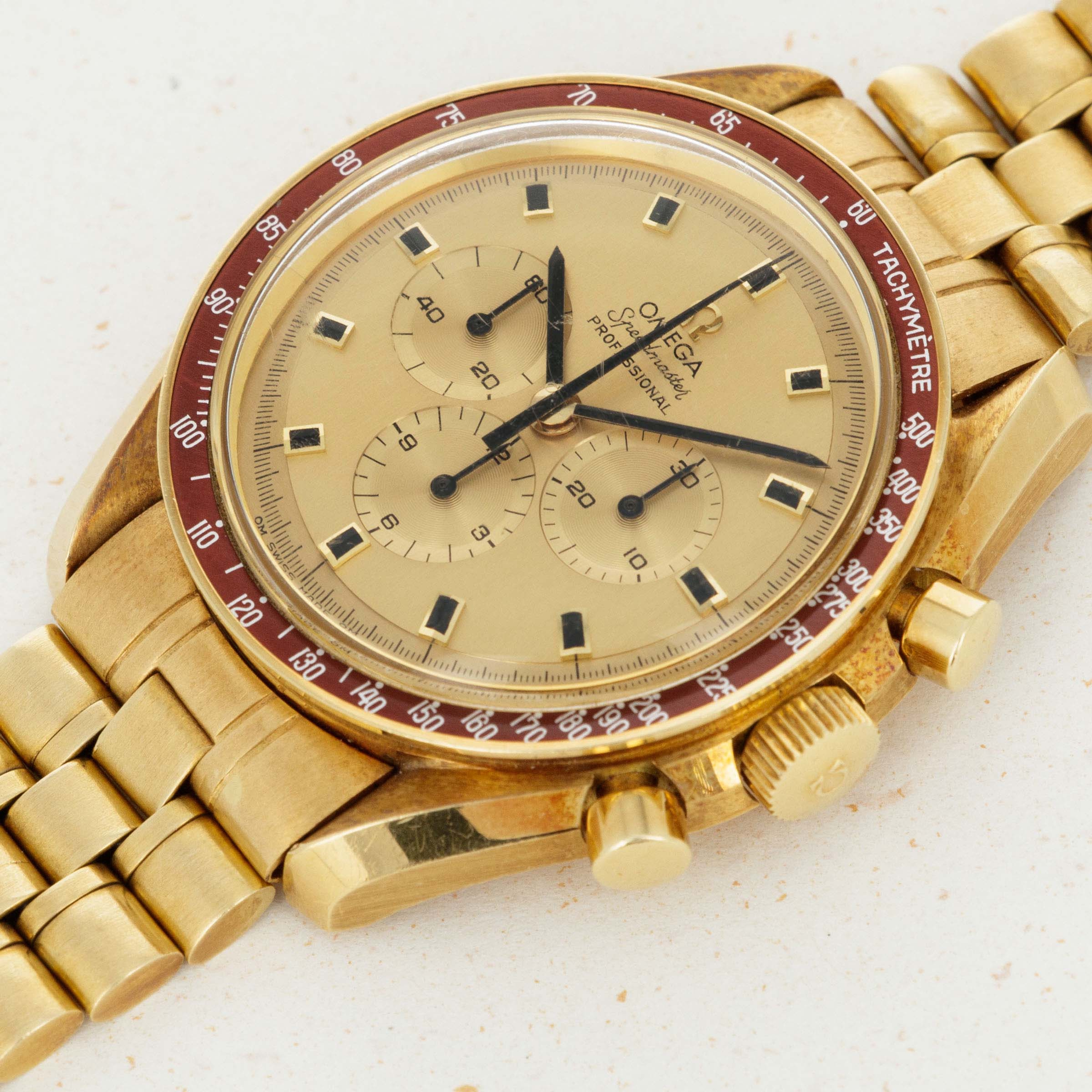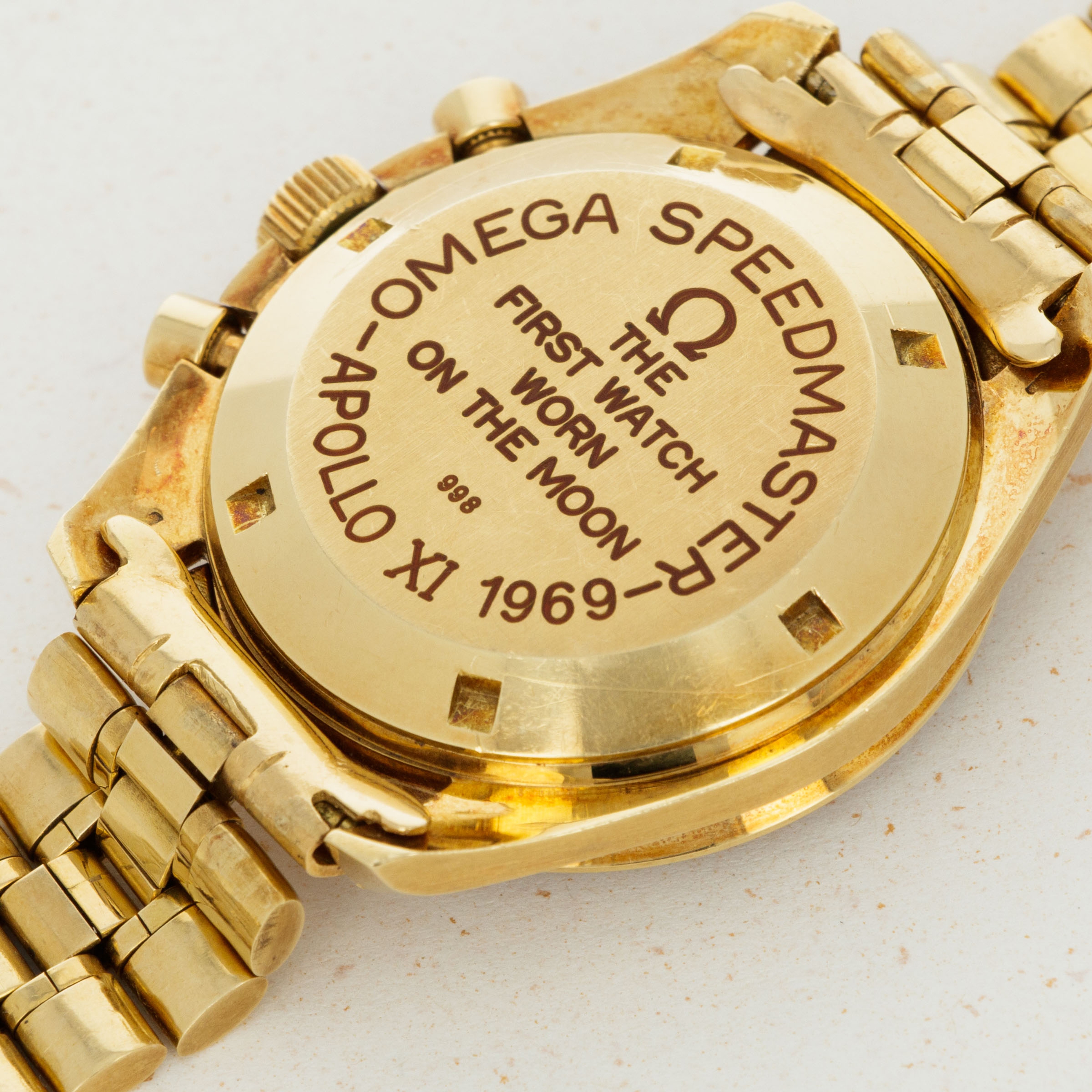 Famed as perhaps one of watchmaking's most universally well-known watches, the Omega Speedmaster became the first timepiece ever to be worn on the moon following Omega's successful bid for the Speedmaster to become NASA's choice timepiece for their standard astronaut kit. After its successful inclusion in the 1965 Gemini program, the Speedmaster also adorned the wrists of the astronauts during the Apollo moon landing missions, and so, in 1969, following Buzz Aldrin's historic steps on the moon (Neil Armstrong left his watch on the lunar module) it became the Moonwatch that we all know and love. After the successful 1969 touchdown on the lunar surface, Omega launched the ref. 145.022-69, that we have here, as a means to commemorate one of the most legendary moments in human history. Limited to just 1014 pieces, the ref. 145.022-69 swaps the Speedmaster's usual stainless steel construction for one of luxurious 18k yellow gold, with a suitably golden dial and brownish-red tachymetre bezel insert. As the legend goes, the first watch was presented to Richard Nixon, but he felt obliged to return it due to the timepiece's value. Individually numbered '998' on its commemorative caseback, this example was one of the last examples to be sold to the public, and so offers a beautiful opportunity to own a piece of authentic watchmaking history that also ties in with perhaps one of humanity's most historic moments.