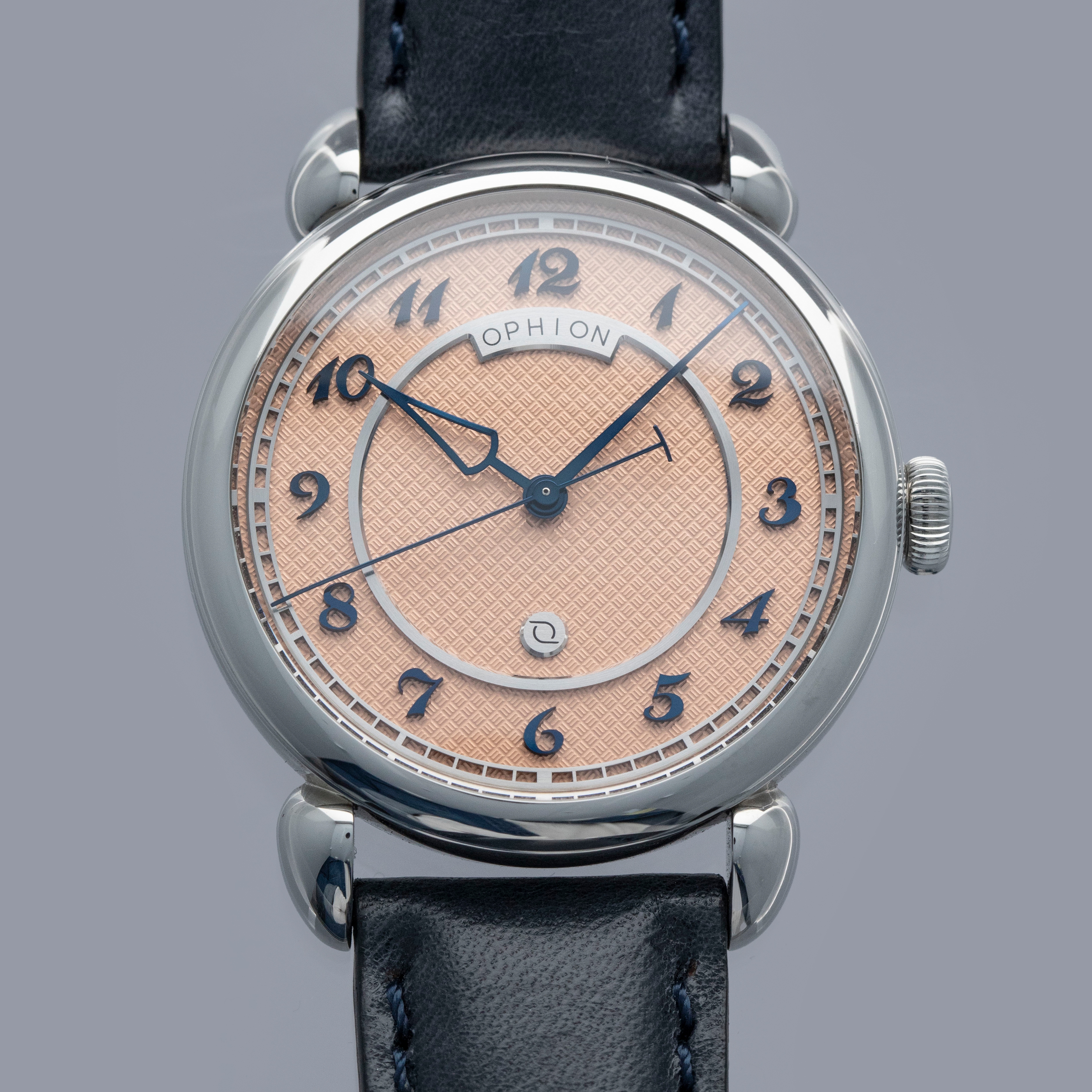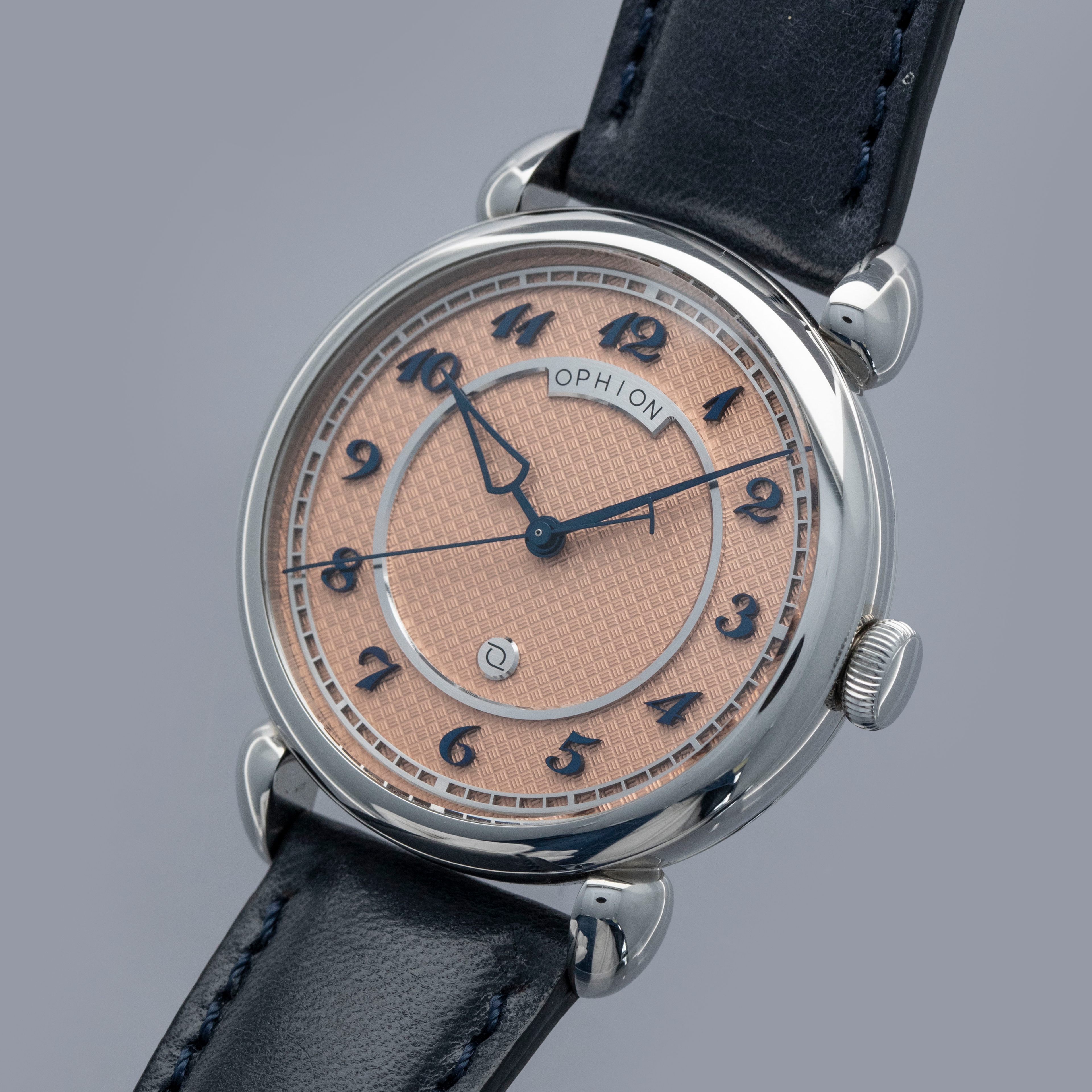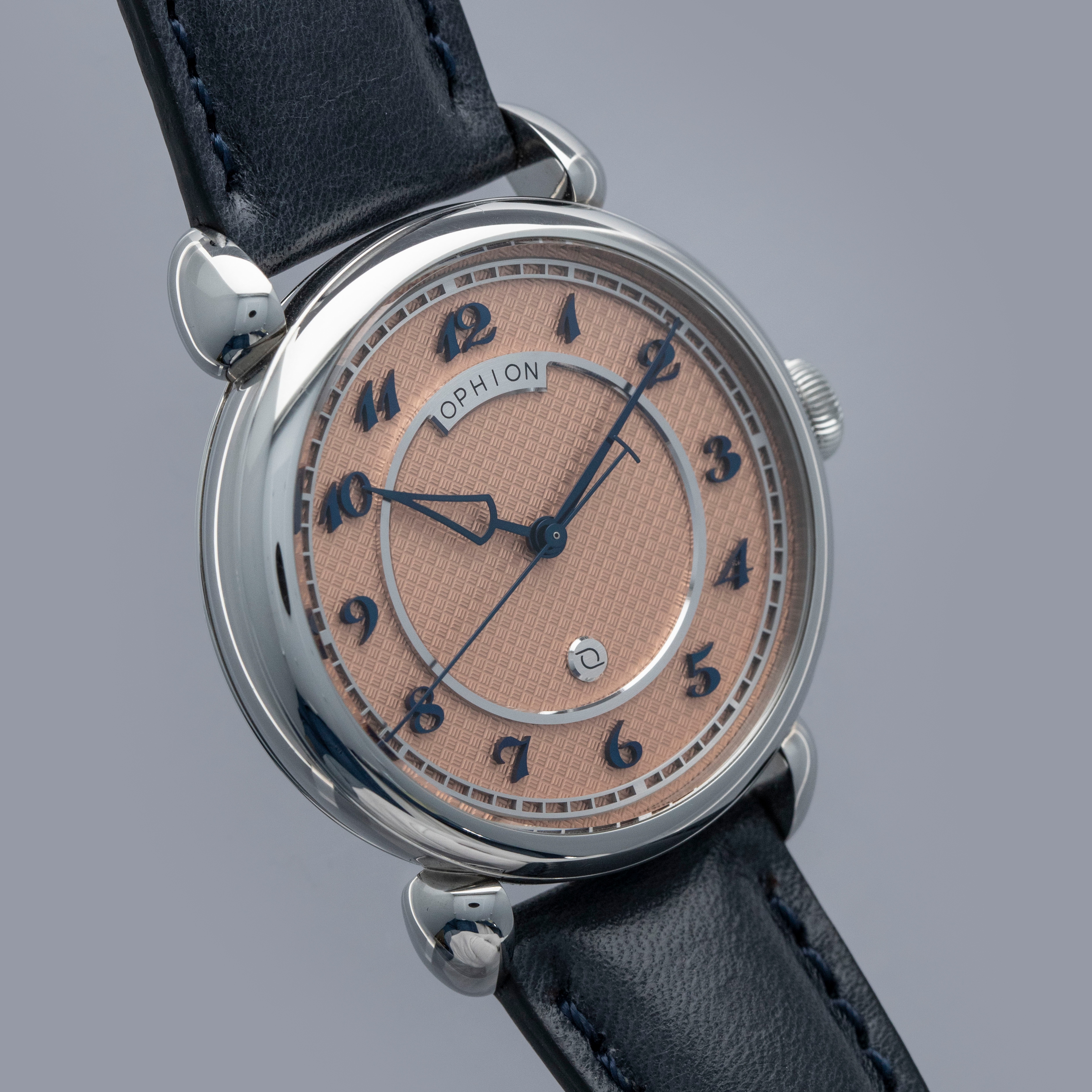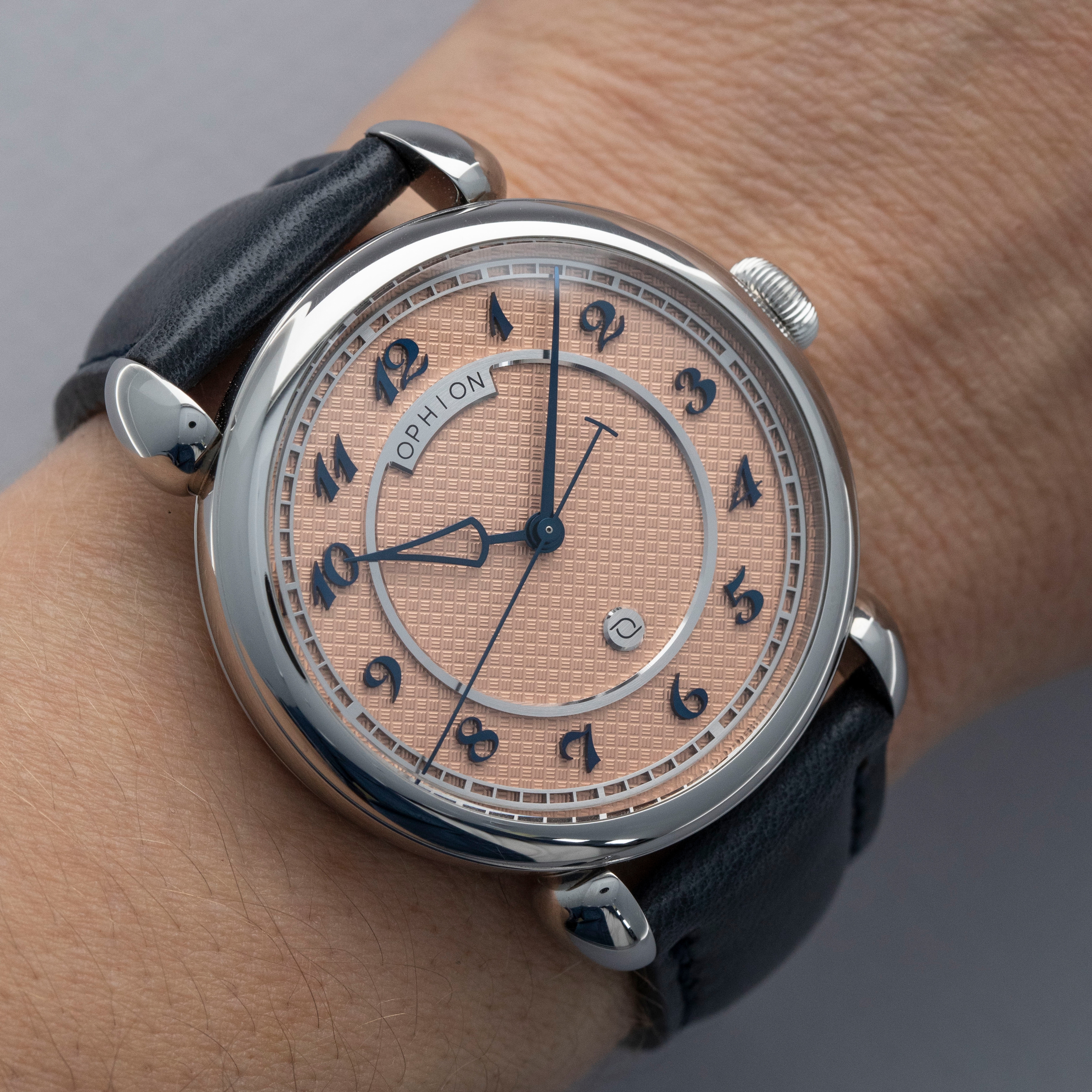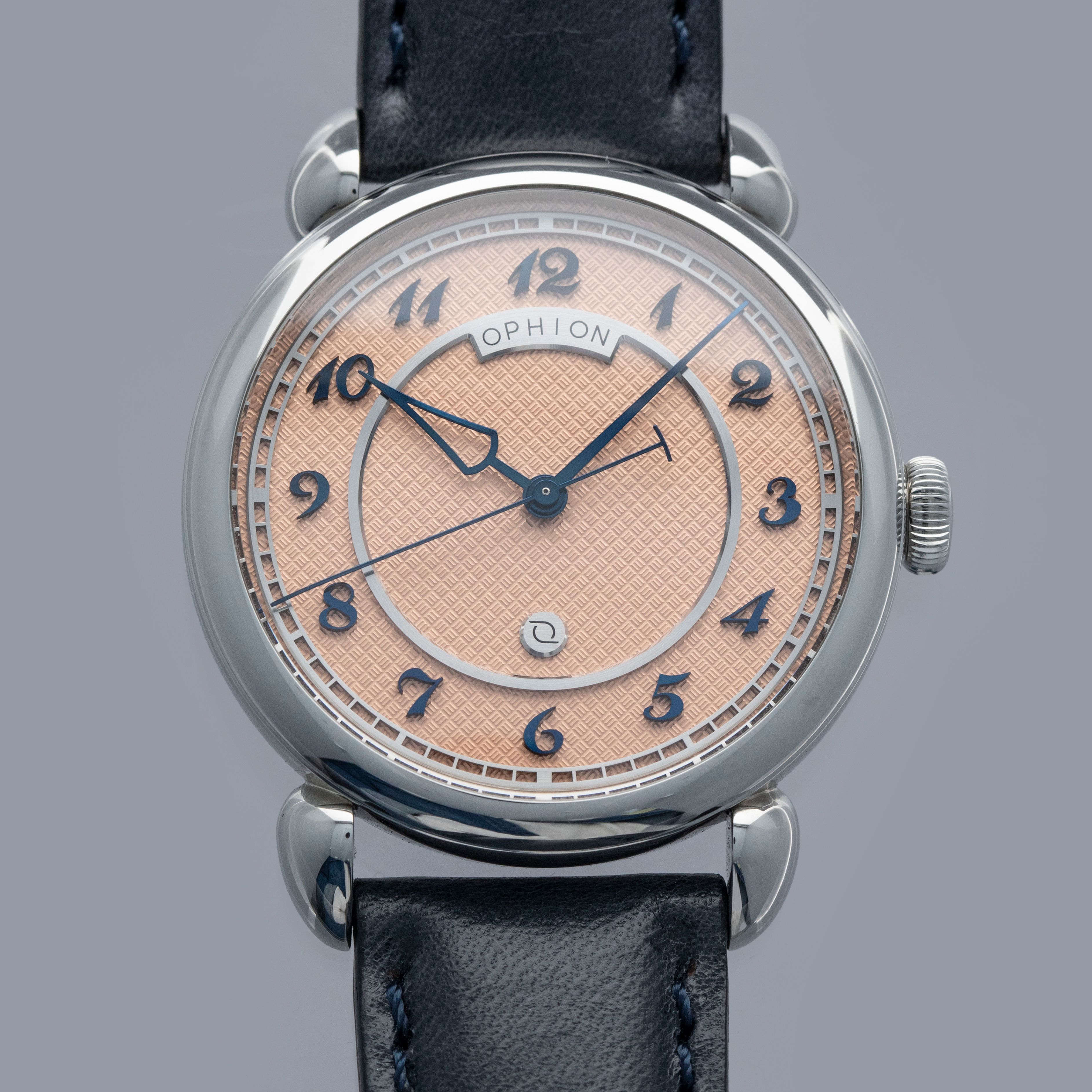 Boasting a stunning salmon dial with silver accents and blued steel applied Breguet numerals and hands, the Velos is an impressive display of Ophion's talents as a young independent watchmaker.