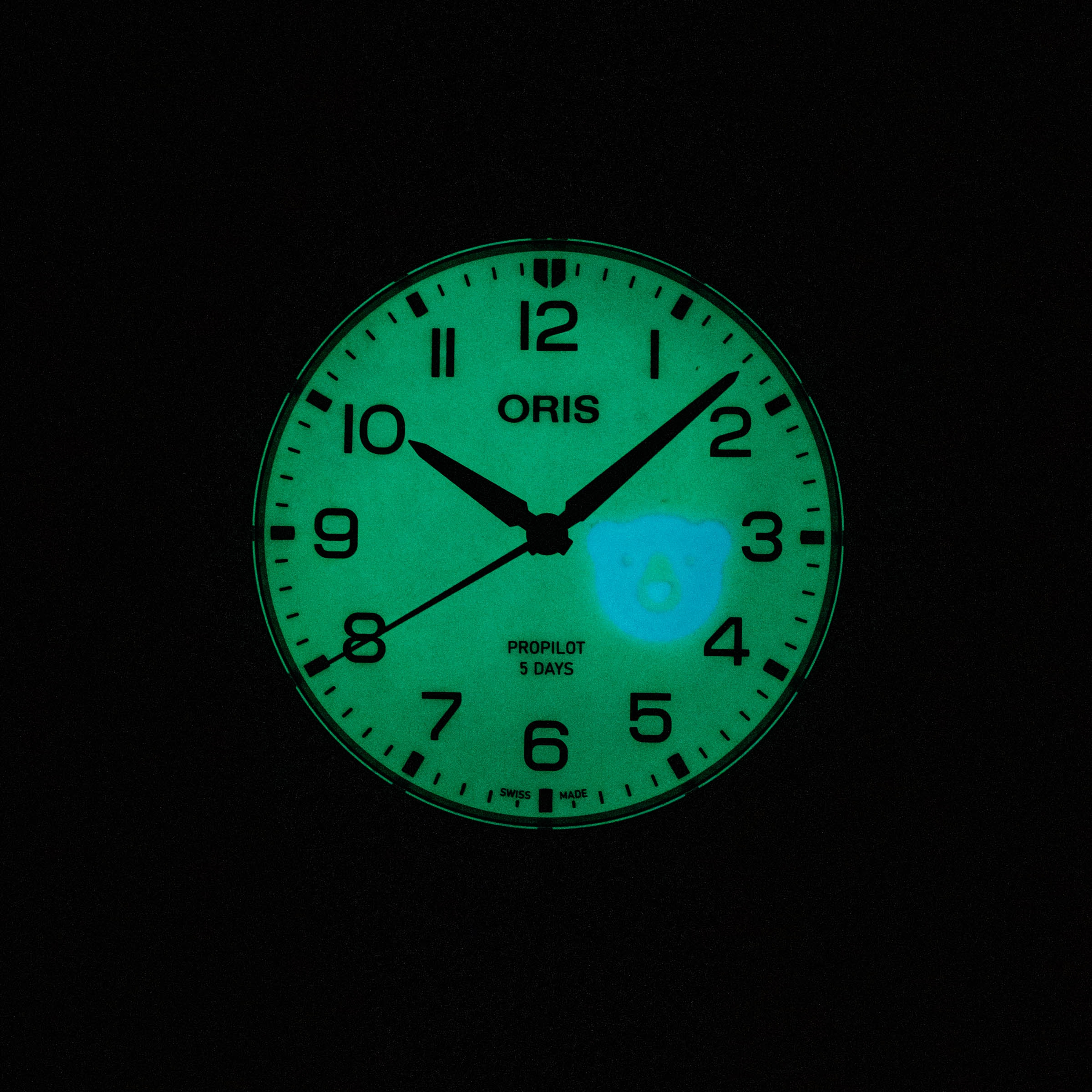 While its dial is white under normal lighting conditions, the ProPilot Holstein's display lights up completely when in the dark thanks to its full-lume coverage, with the Oris Bear's silhouette only then revealing itself at 3 o'clock.