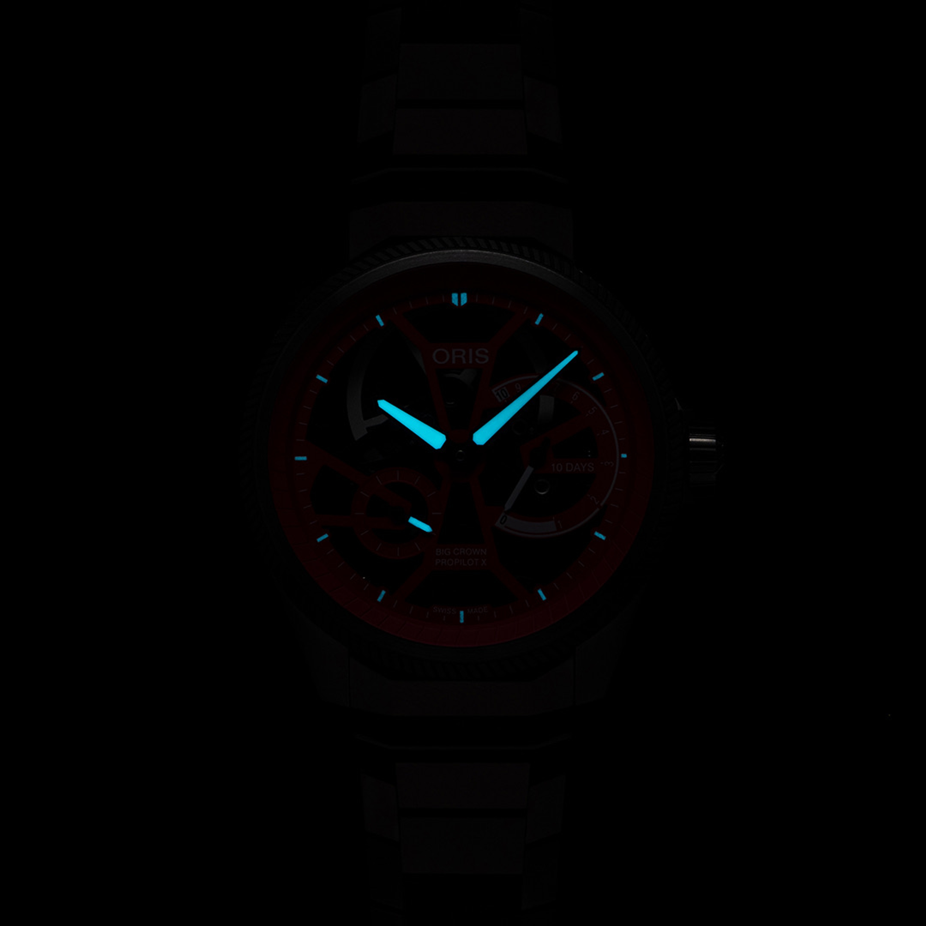 The Oris Big Crown ProPilot X Caliber 115 is powered by a skeletonised, in-house developed caliber with a 10-day power reserve and an Oris-patented non-linear power reserve indicator that shows the power remaining with greater accuracy as the time to rewind the watch approaches.