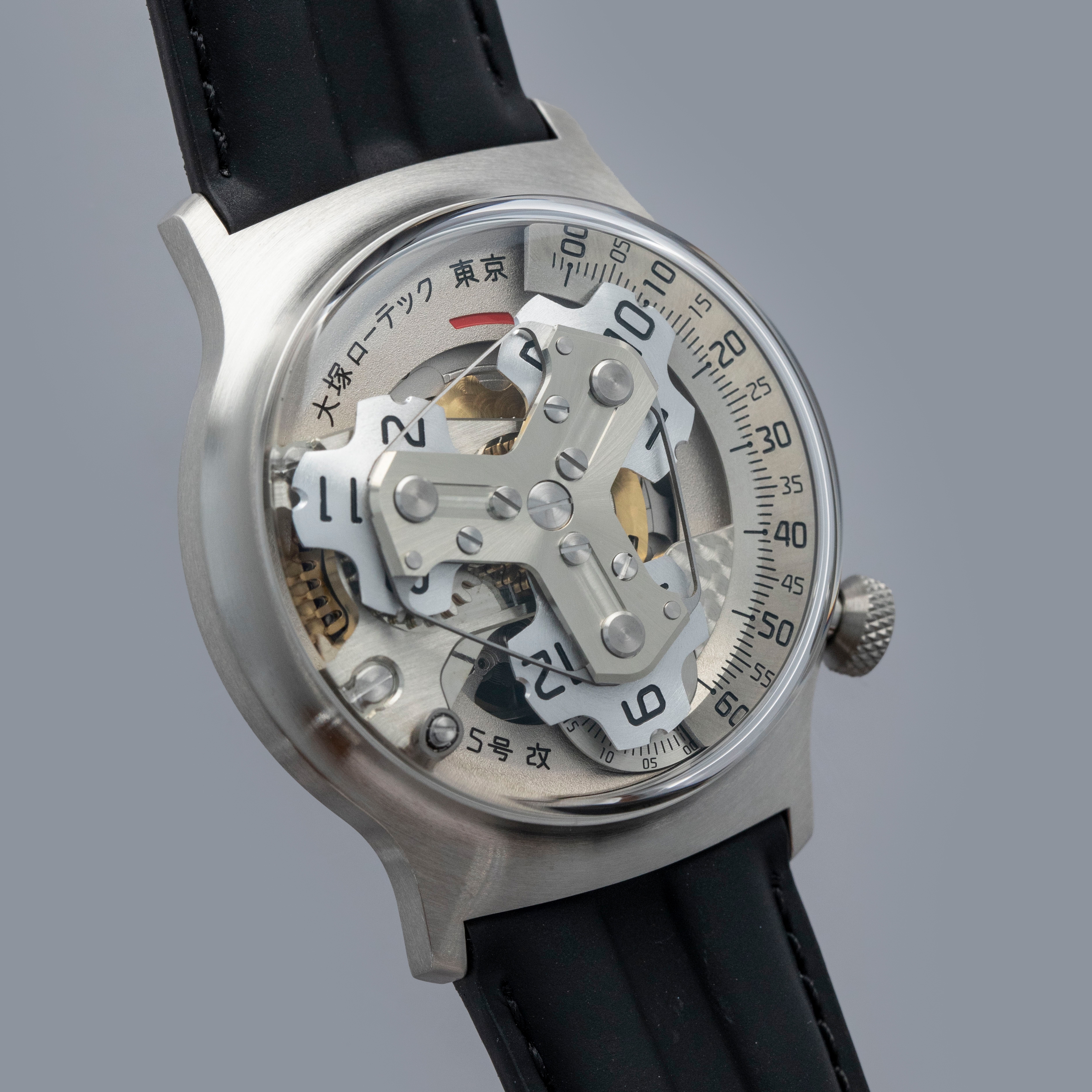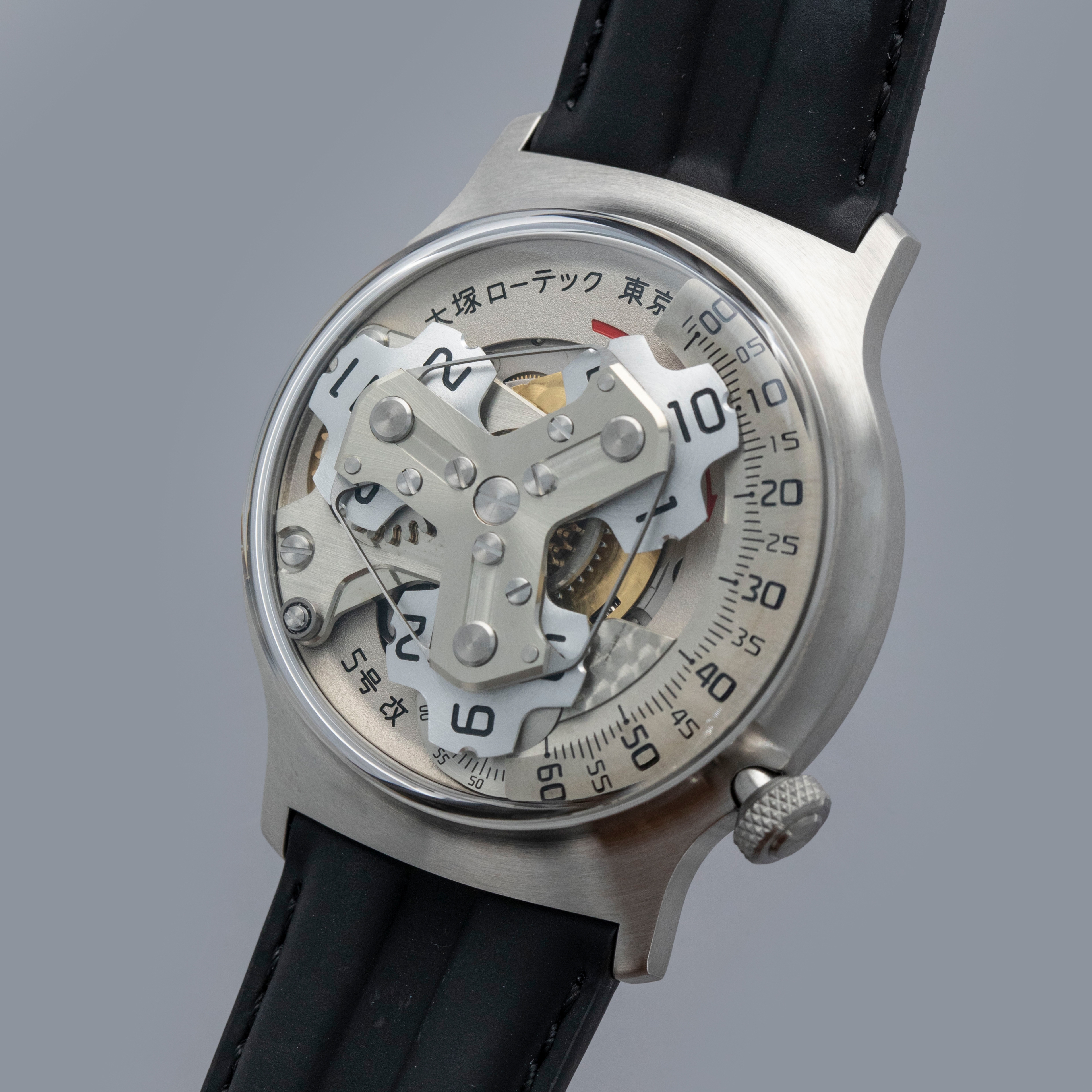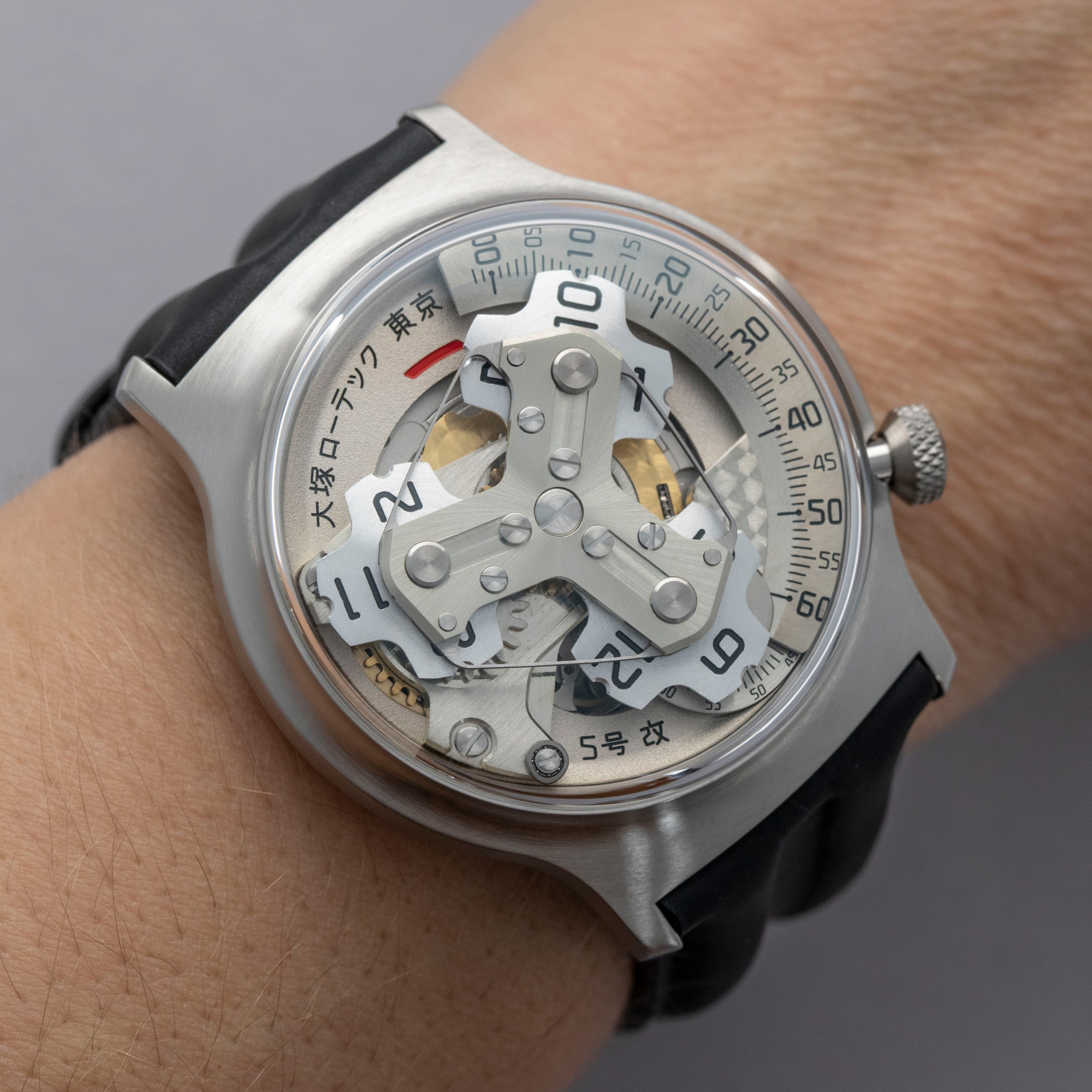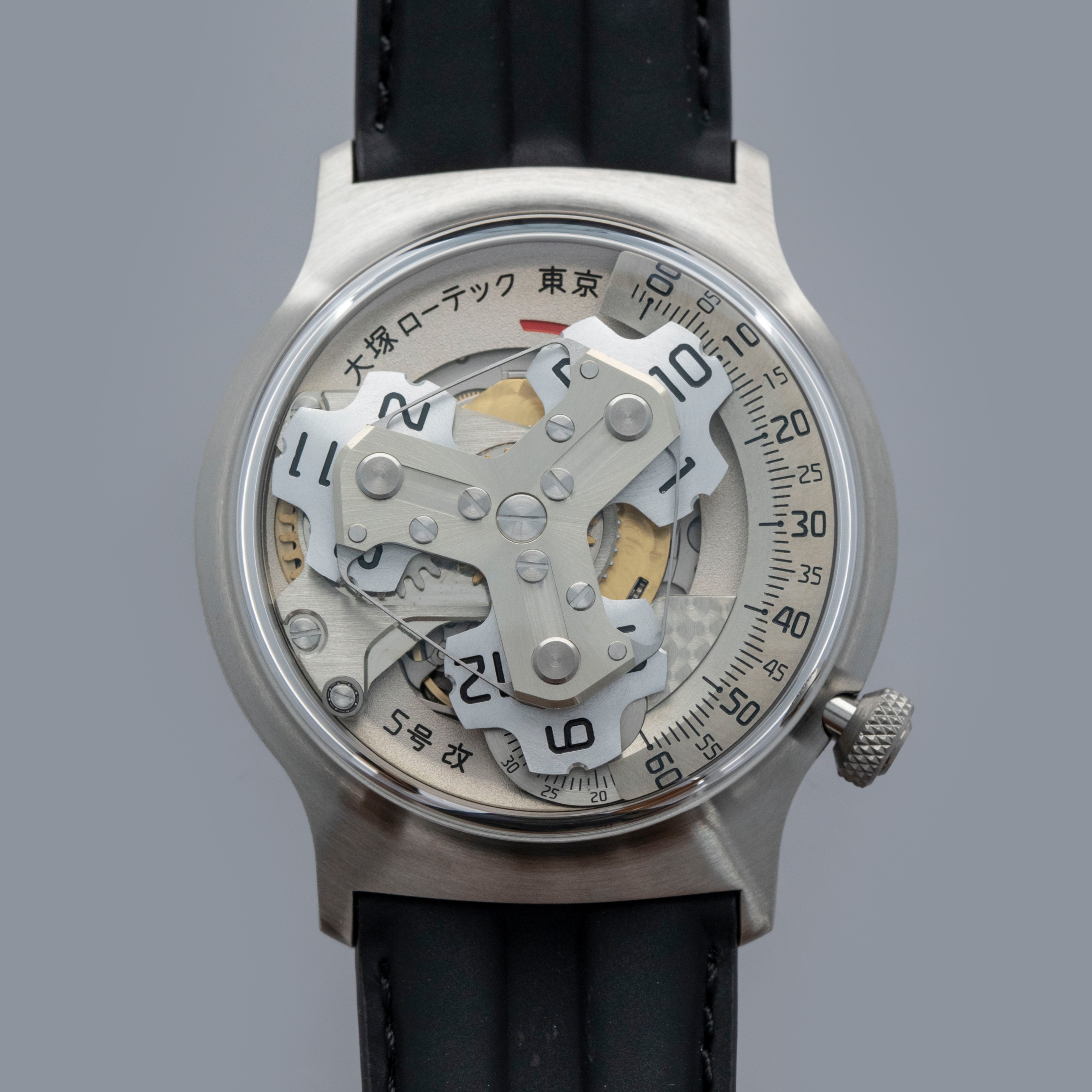 Conforming to Otsuka Lotec's decidedly nonconformist aesthetic, the Kai's satellite hour display (powered by their in-house movement module), dominates the timepiece thanks to the thin bezel that surrounds it and large sapphire box crystal that stands above it.