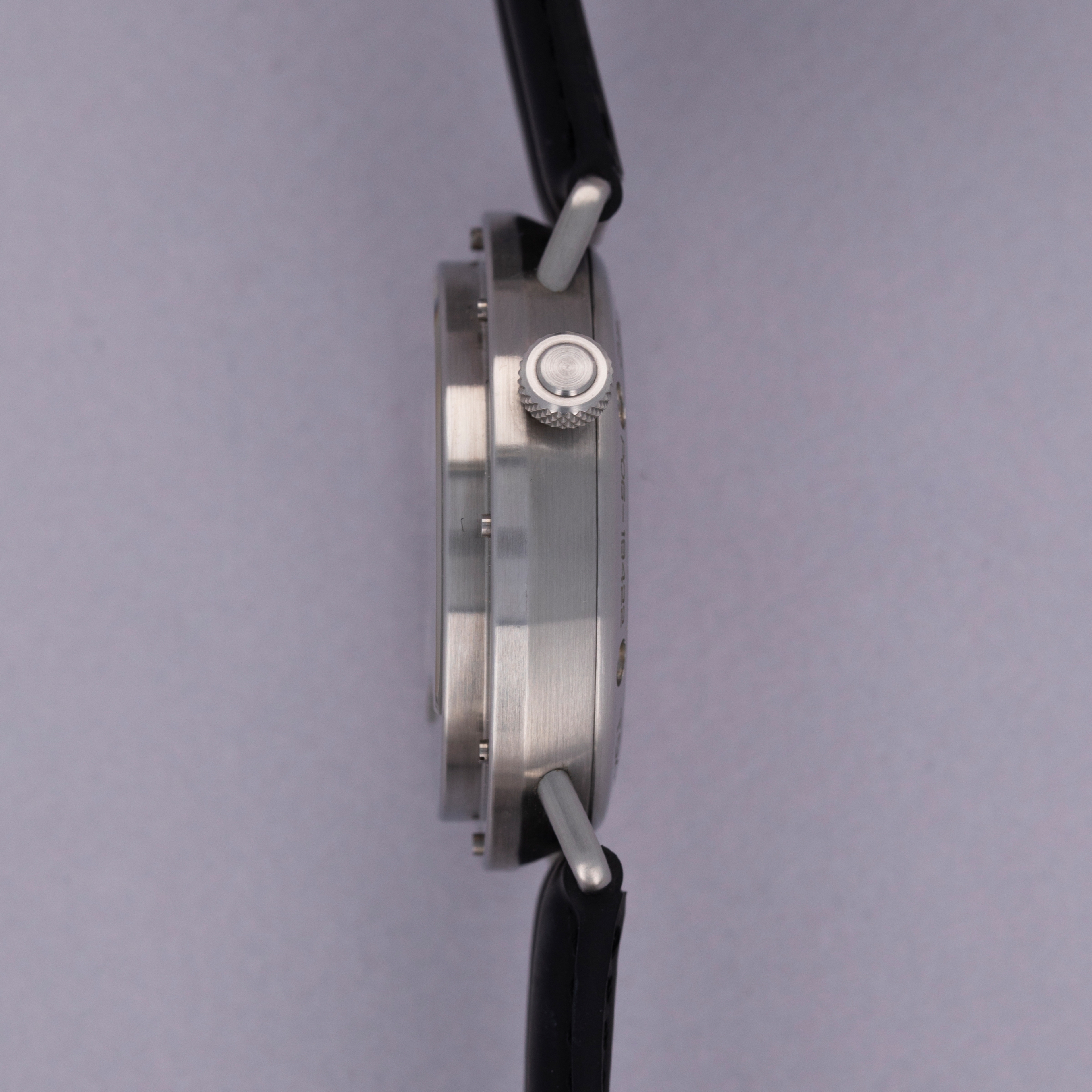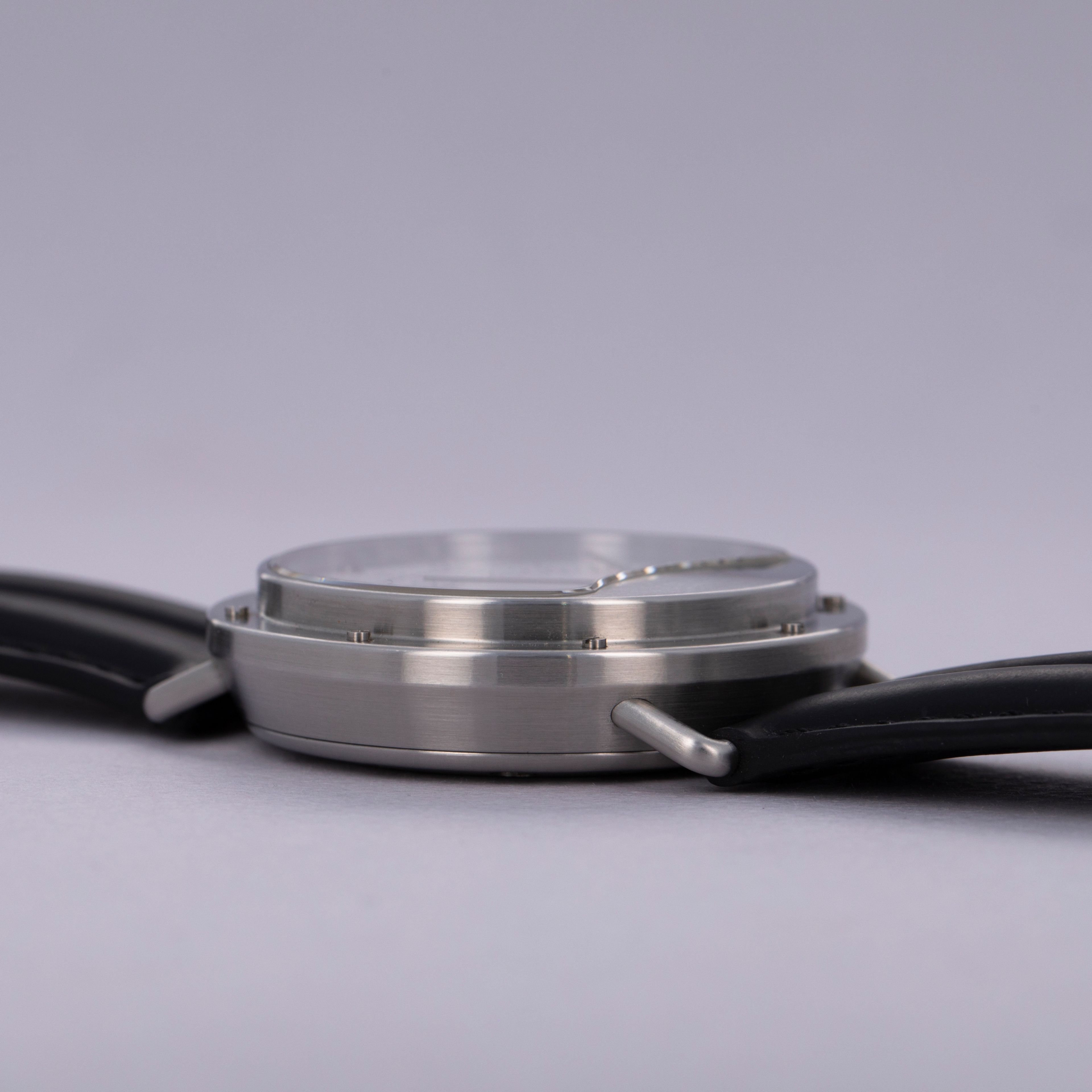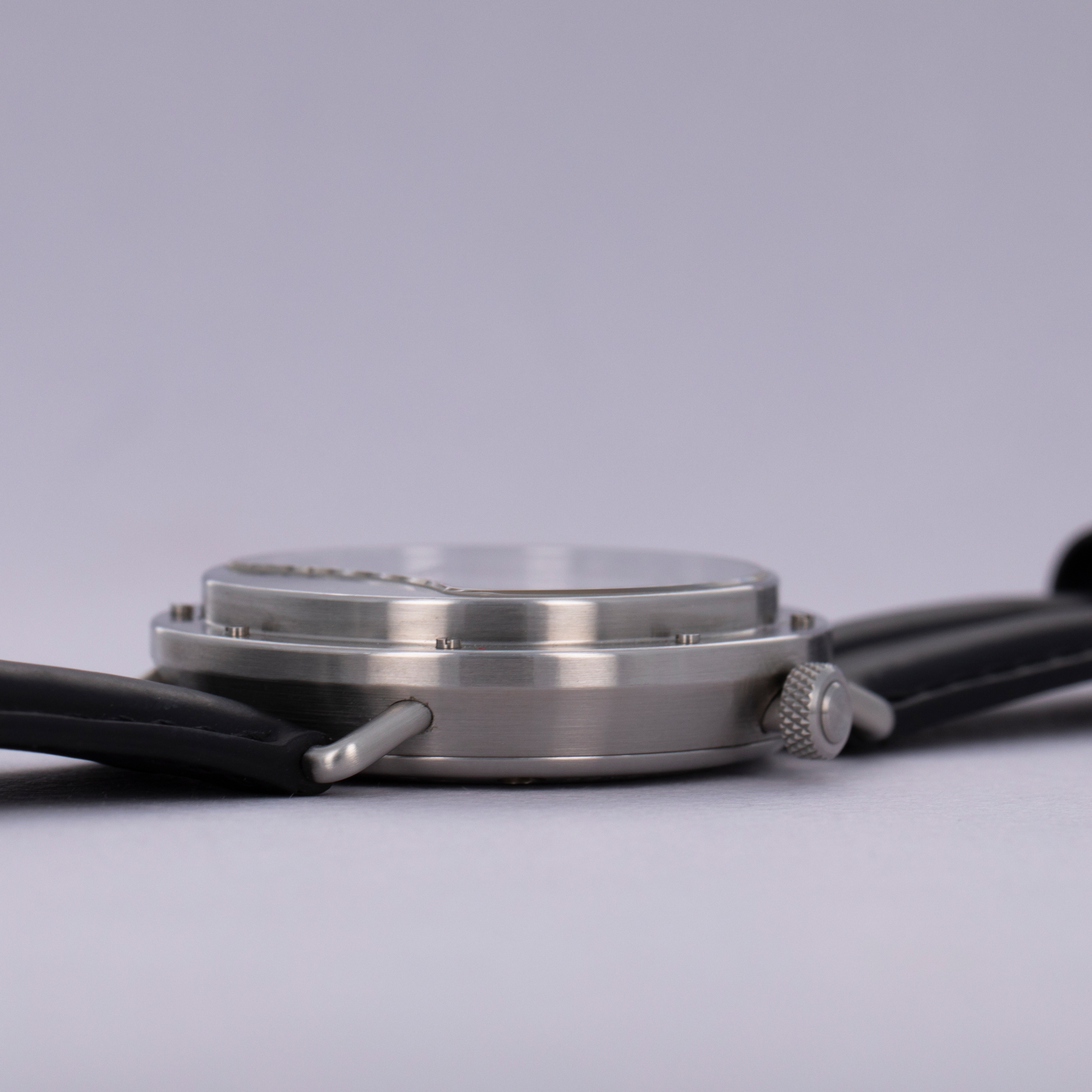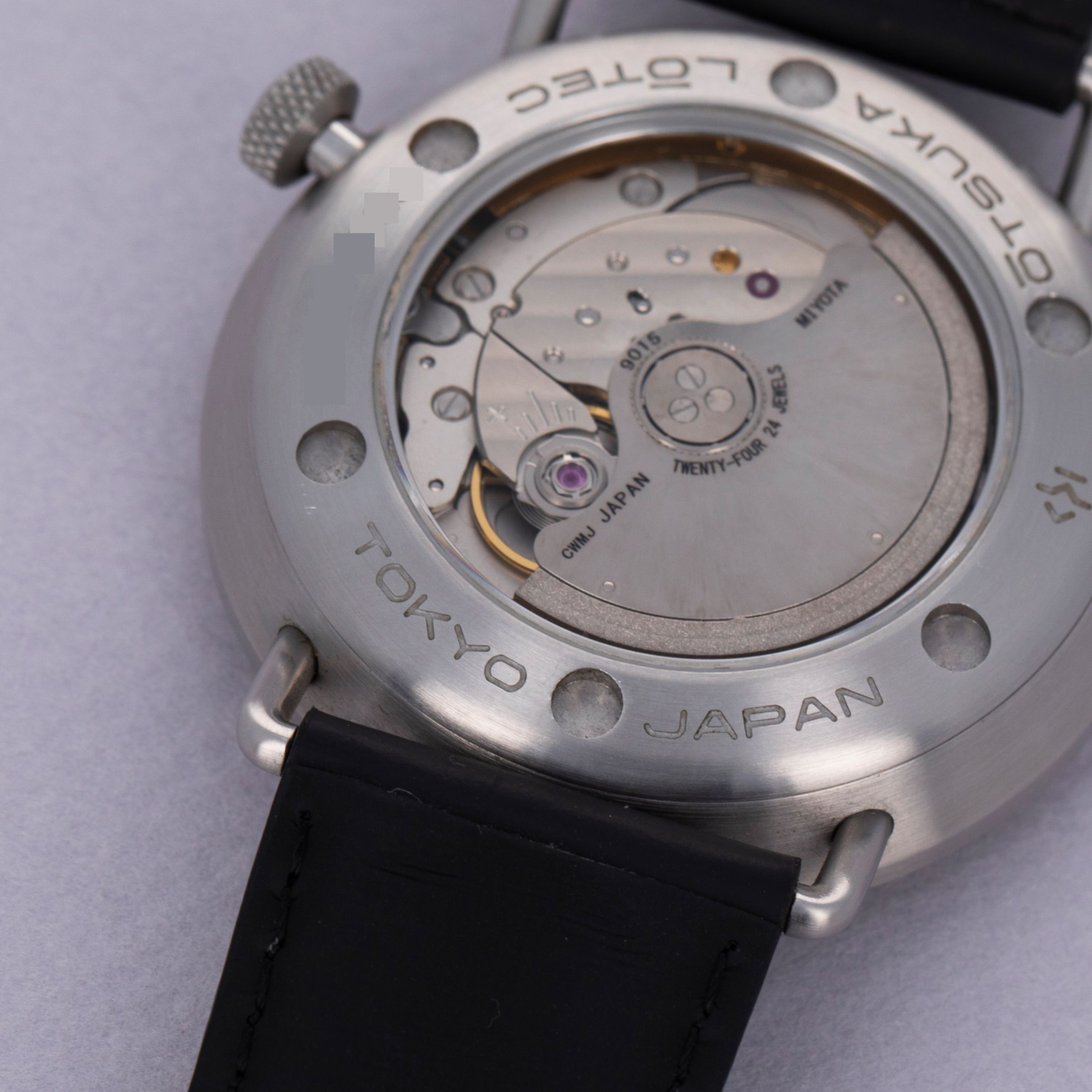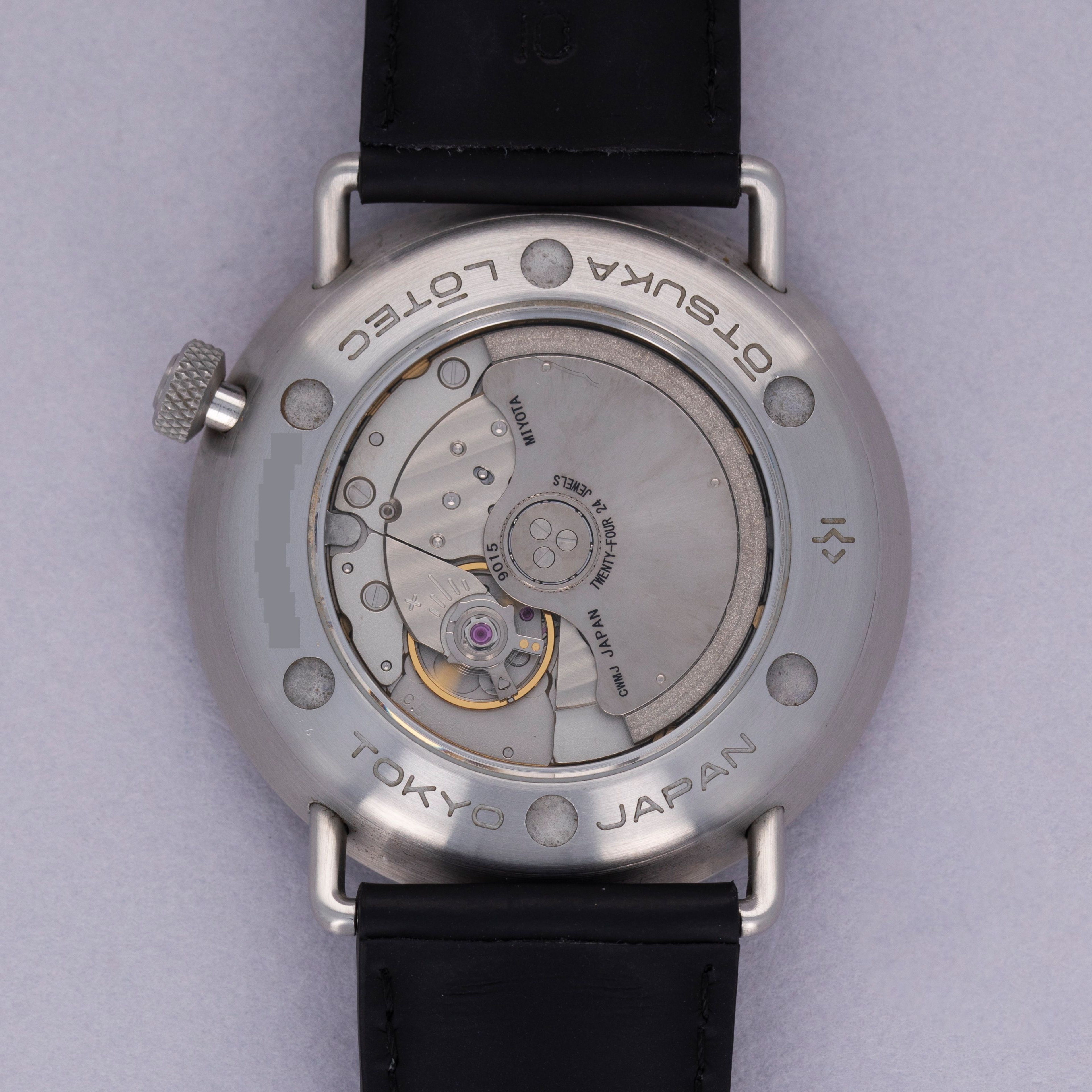 Decidedly unique and industrial, the No. 6's 42.6mm case features all brushed surfaces and exposed screws atop its bezel and on its dial that reveal Otsuka Lotec's function over form design thesis.