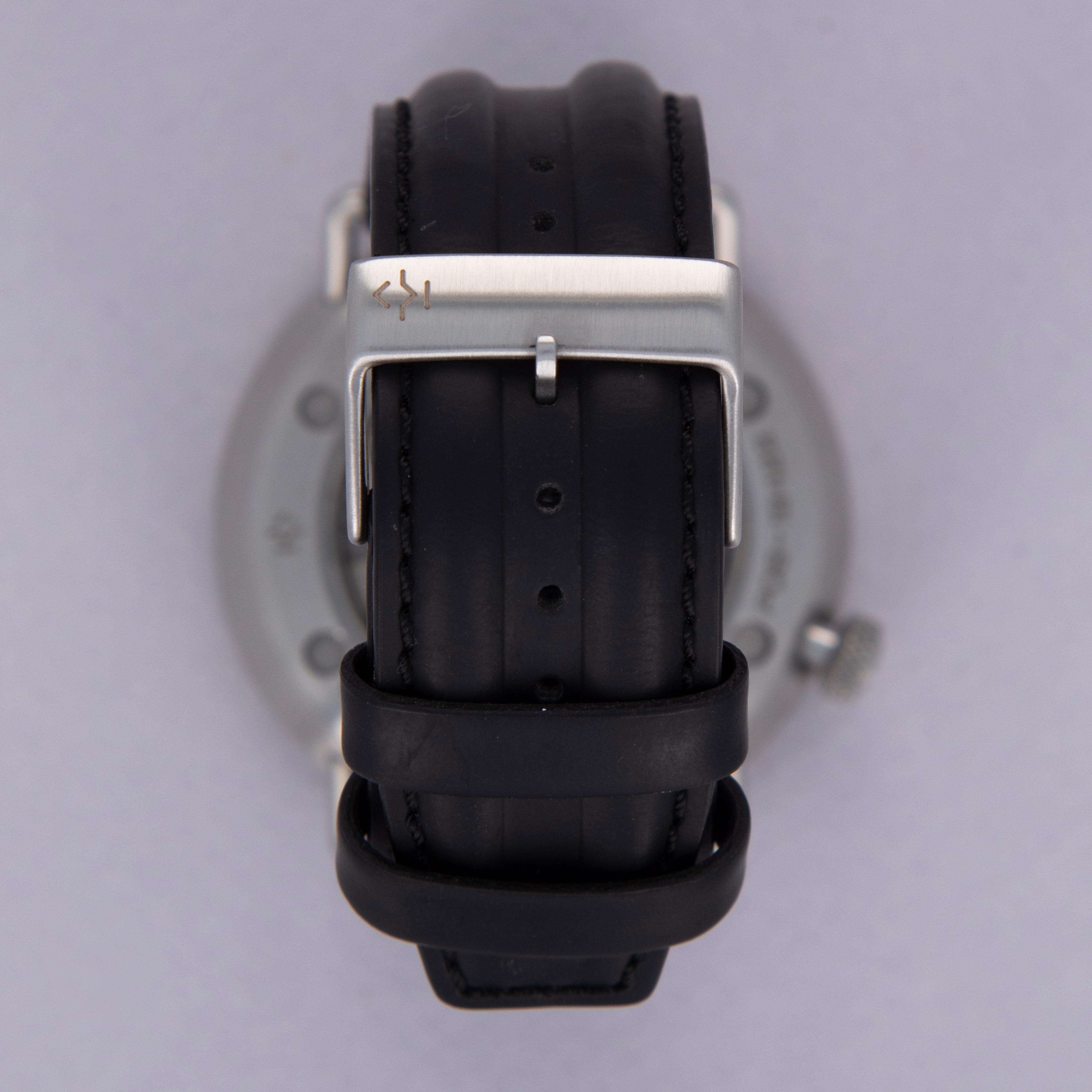 Designed to emulate the gauges that adorn the dashboards of cars and industrial equipment, the No. 6's monochromatic silver dial features a retrograde minute and hour hand along with exposed screws that further feed into its steampunk aesthetic.
