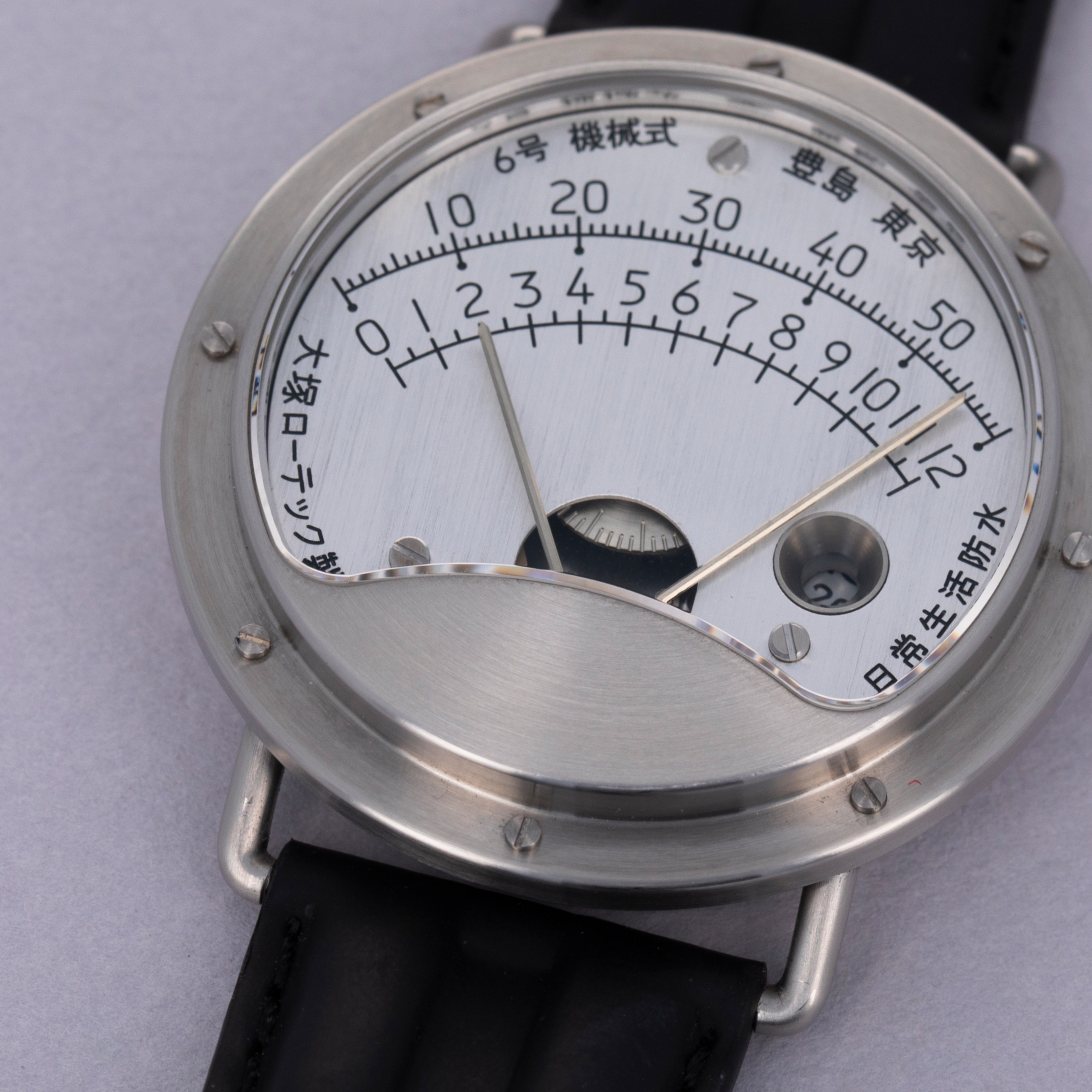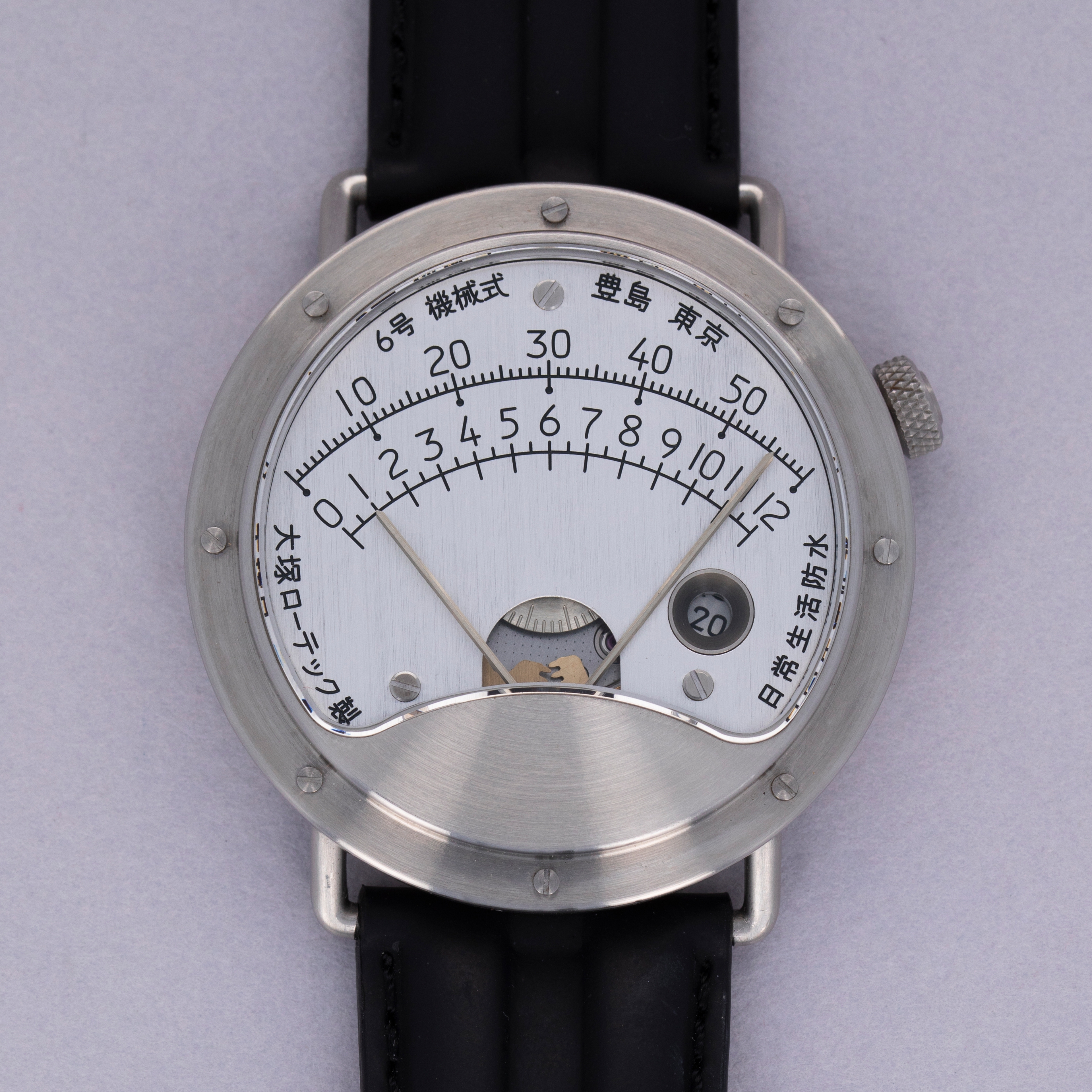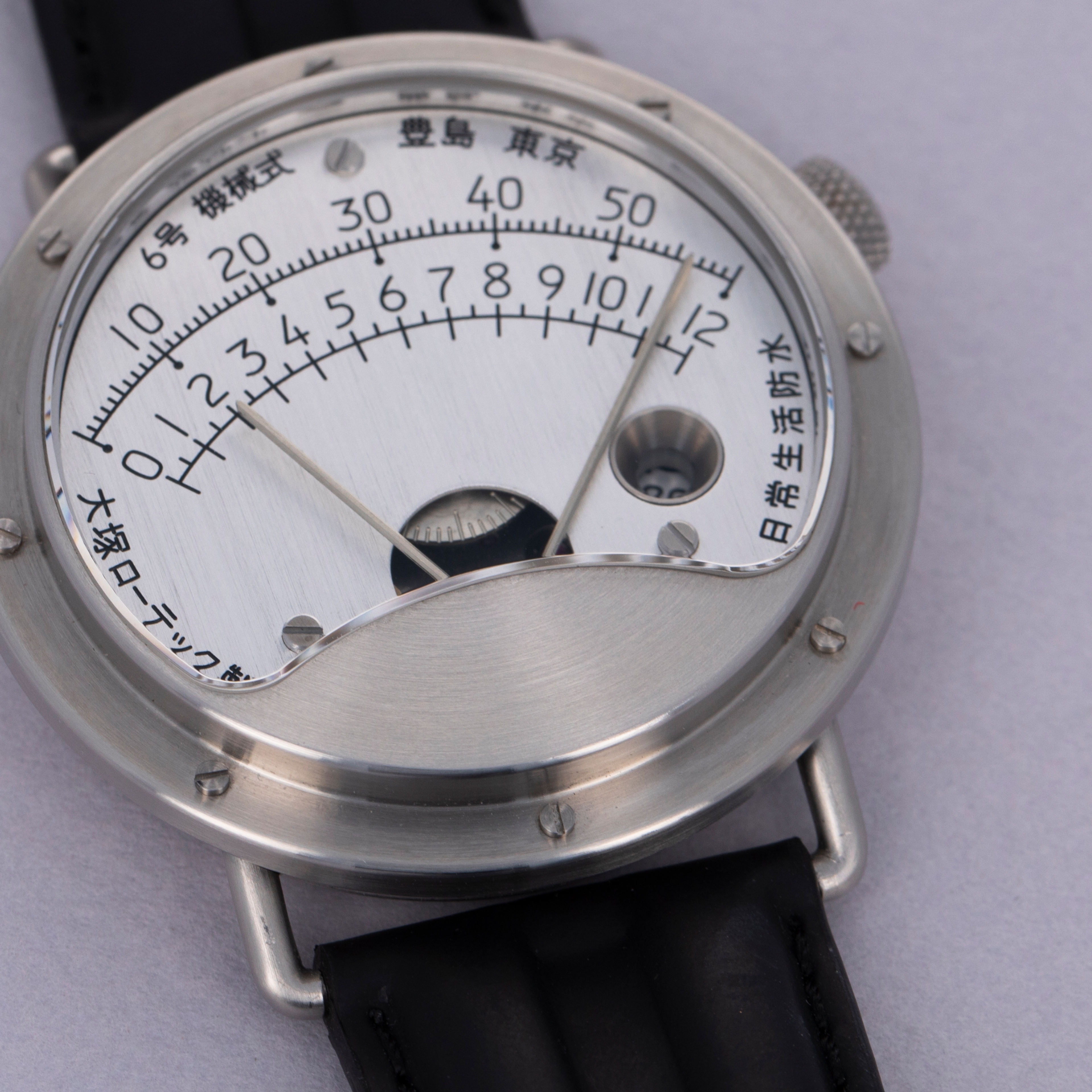 Originally moving into watchmaking in 2008 after studying automotive design, Jiro Katayama, a Tokyo-based watchmaker and designer, draws his inspiration from the realm of industrial world where his career originally started. Incorporating automotive design details and an industrialized steampunk aesthetic, Katayama’s timepieces, offered in limited runs only in Japan through his brand Otsuka Lotec, are some of the most visually distinctive and unique watches within the modern realm of indie watchmaking. Winning the recent Challenge Watch Prize in 2024’s GPHG awards, the No. 6 has quickly become Otsuka Lotec’s most revered watch. Boasting a brushed stainless steel design with exposed screws, a stepped bezel, wire lugs, and a large monochromatic retrograde time display, the resulting timepiece is reminiscent of the pressure gauge on a car or a hygrometer.