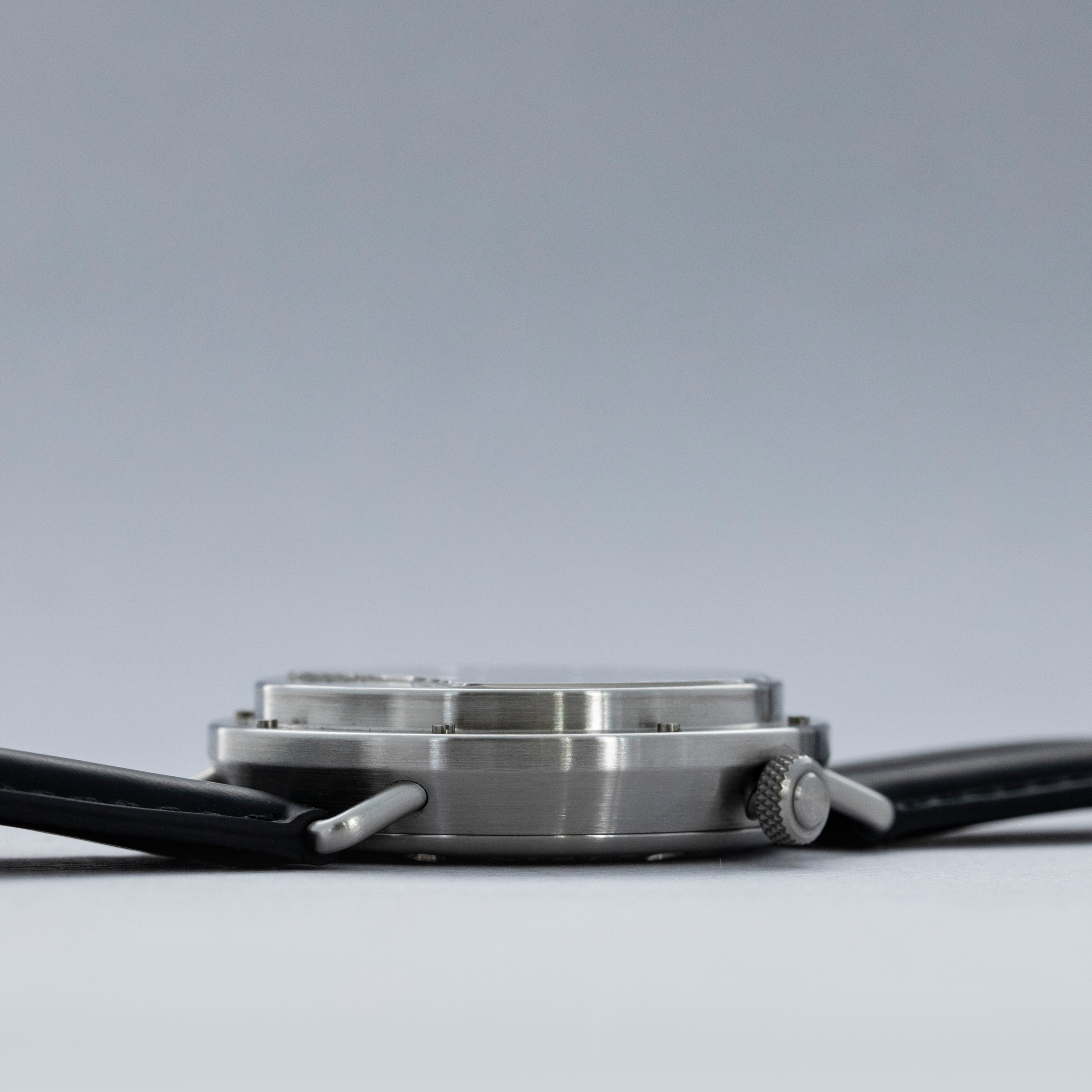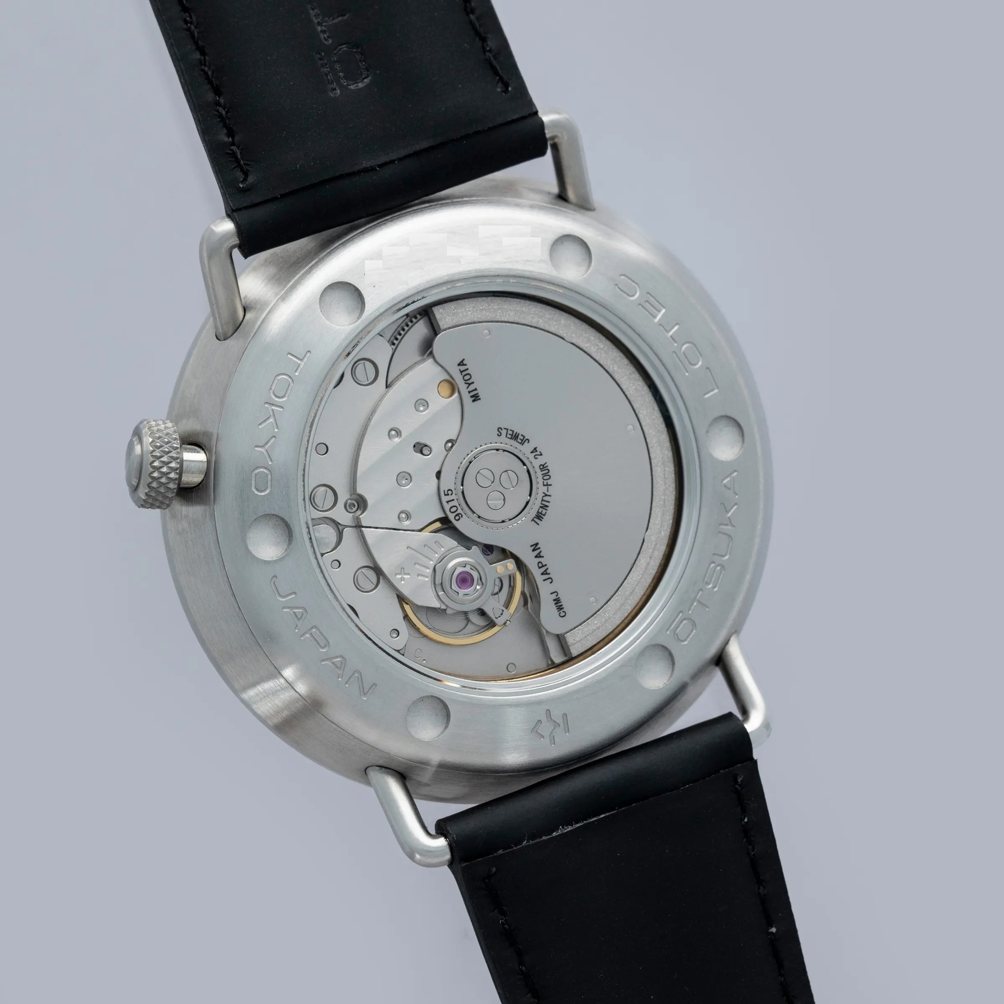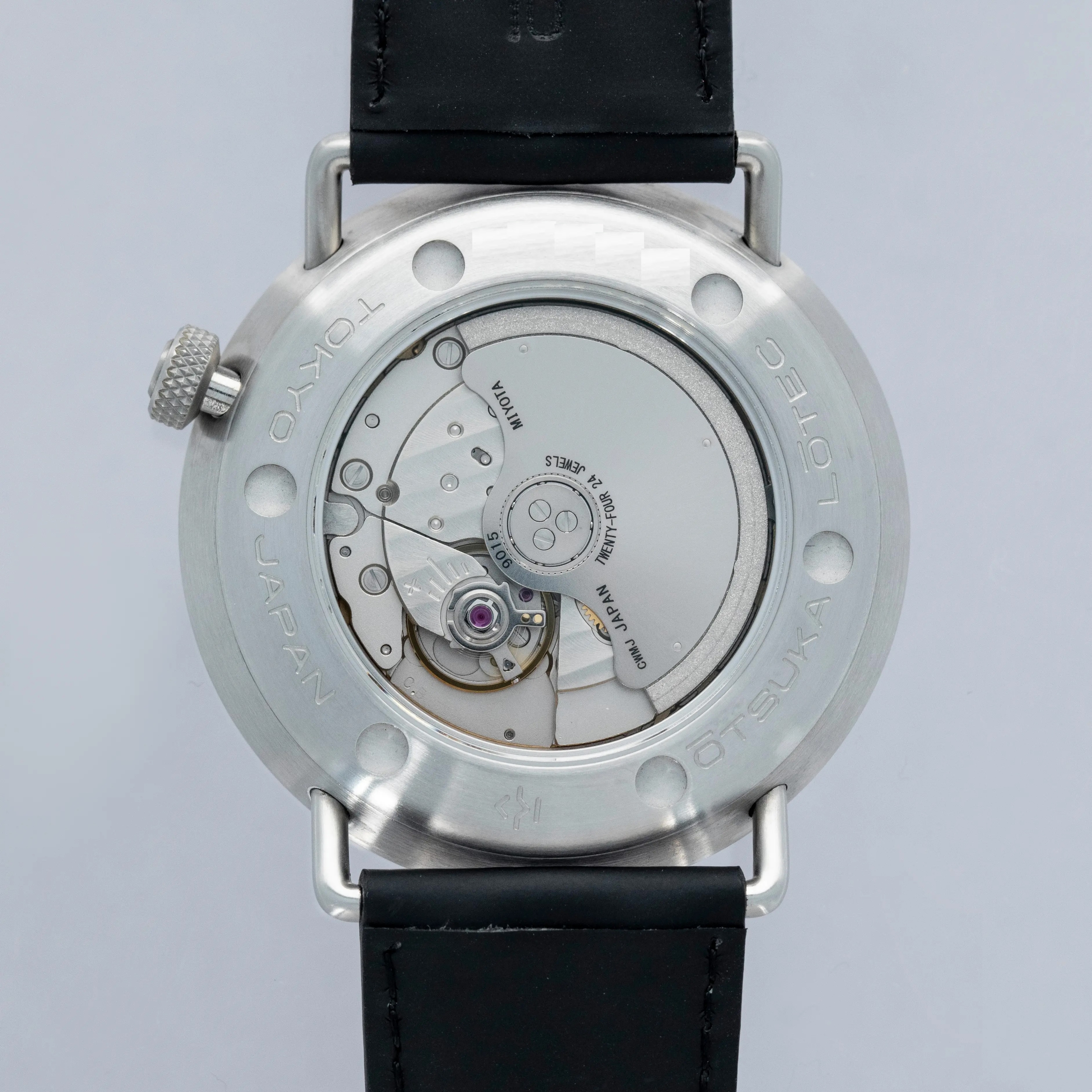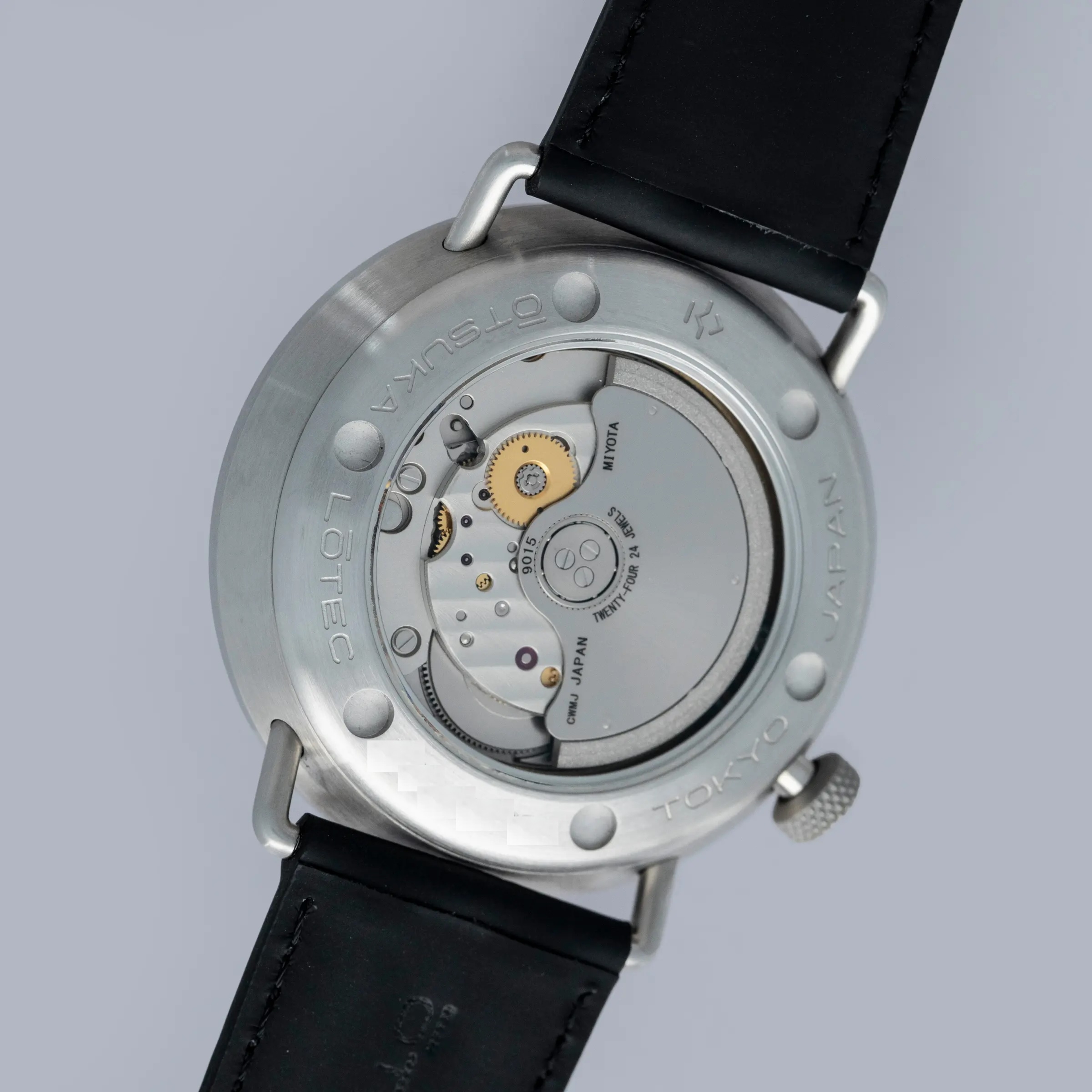 Decidedly unique and industrial, the No. 6's 42.6mm case features all brushed surfaces and exposed screws atop its bezel and on its dial that reveal Otsuka Lotec's function over form design thesis.
